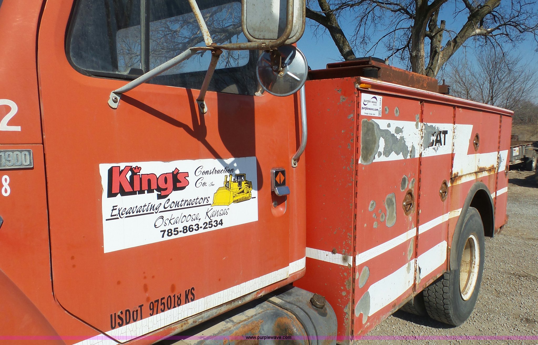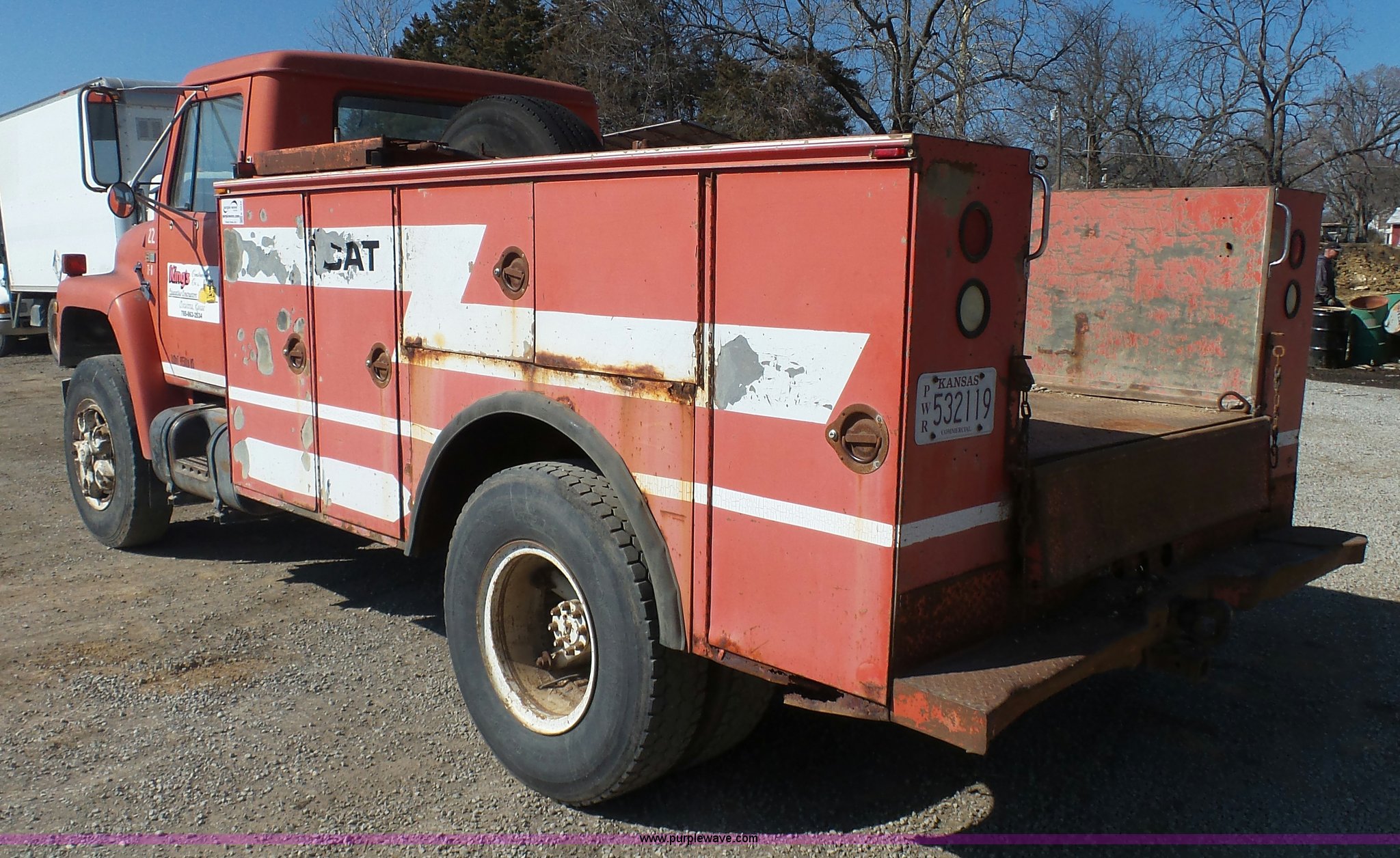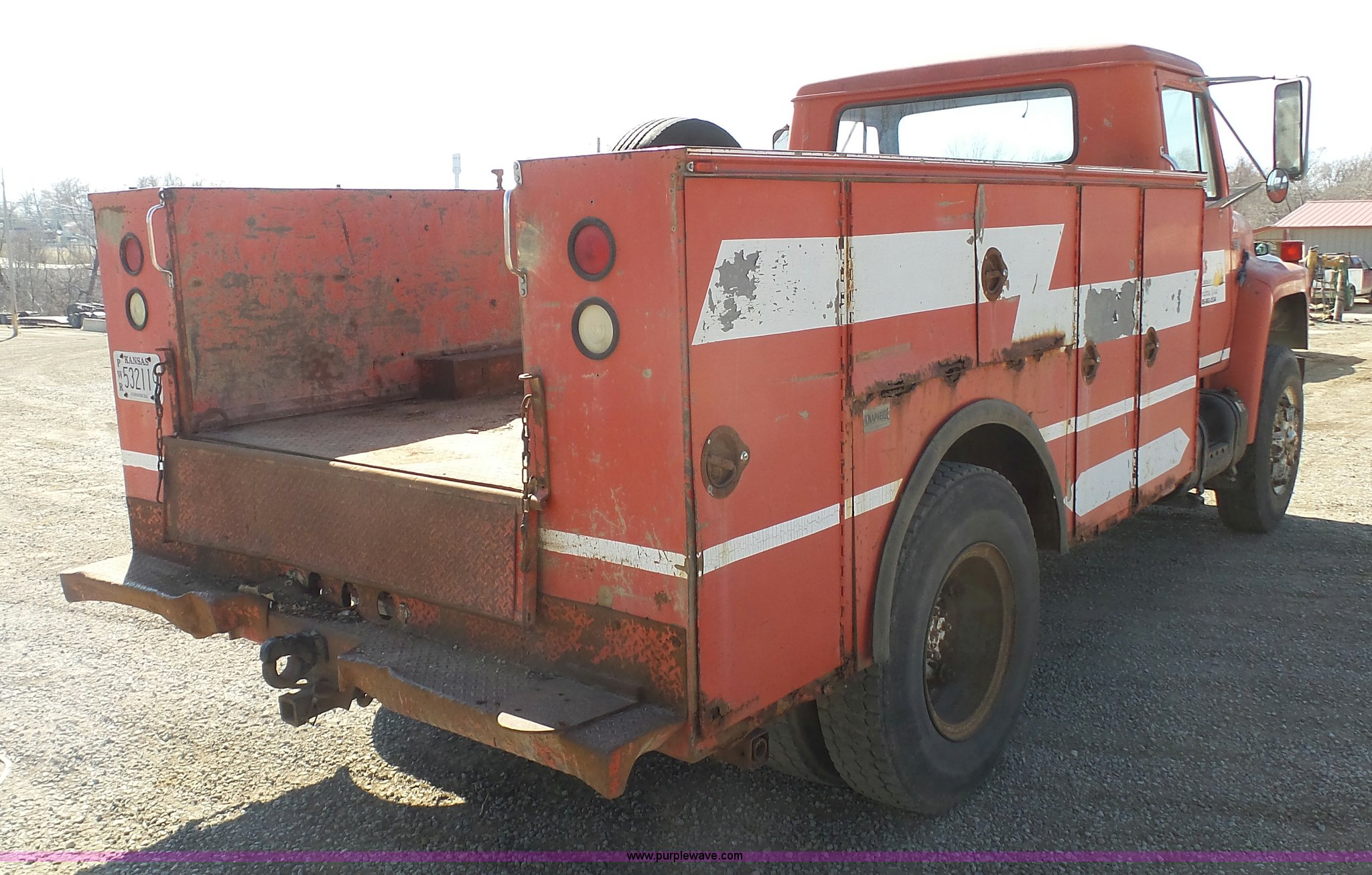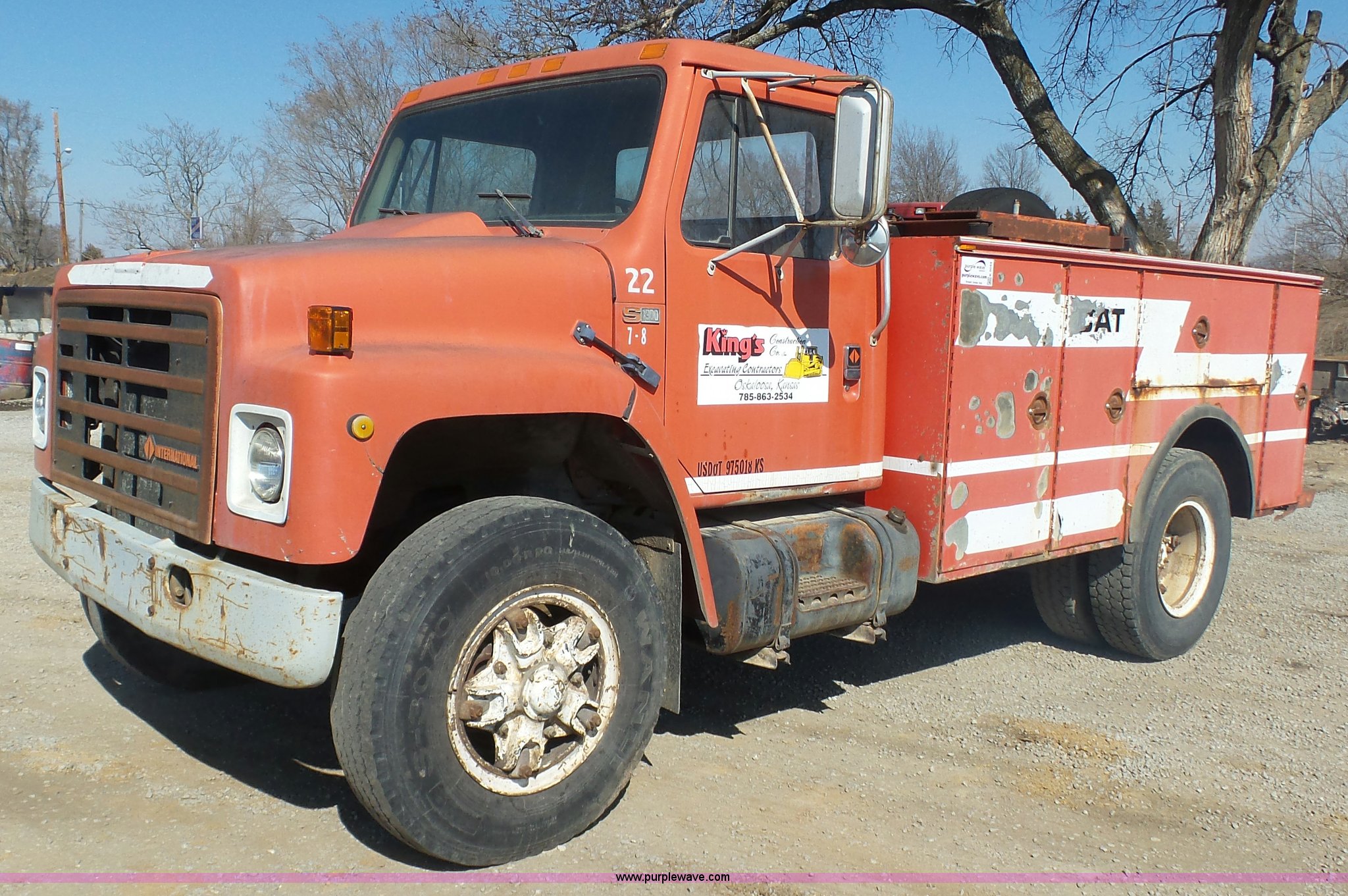 Purple Wave is selling a used Service Truck in Kansas. This item is a 1987 International S1900 service truck with the following: 340,491 miles on odometer, International DT466 7.6L L6 diesel engine, Five speed manual transmission, Two speed rear end, Heat, AM/FM/CD, Suspension seat, Knapheide service bed, 11'L x 95"W, Shelving, Pintle hitch, Receiver hitch, Spring suspension, Hydraulic brakes, 10.00R20 tires, Rust