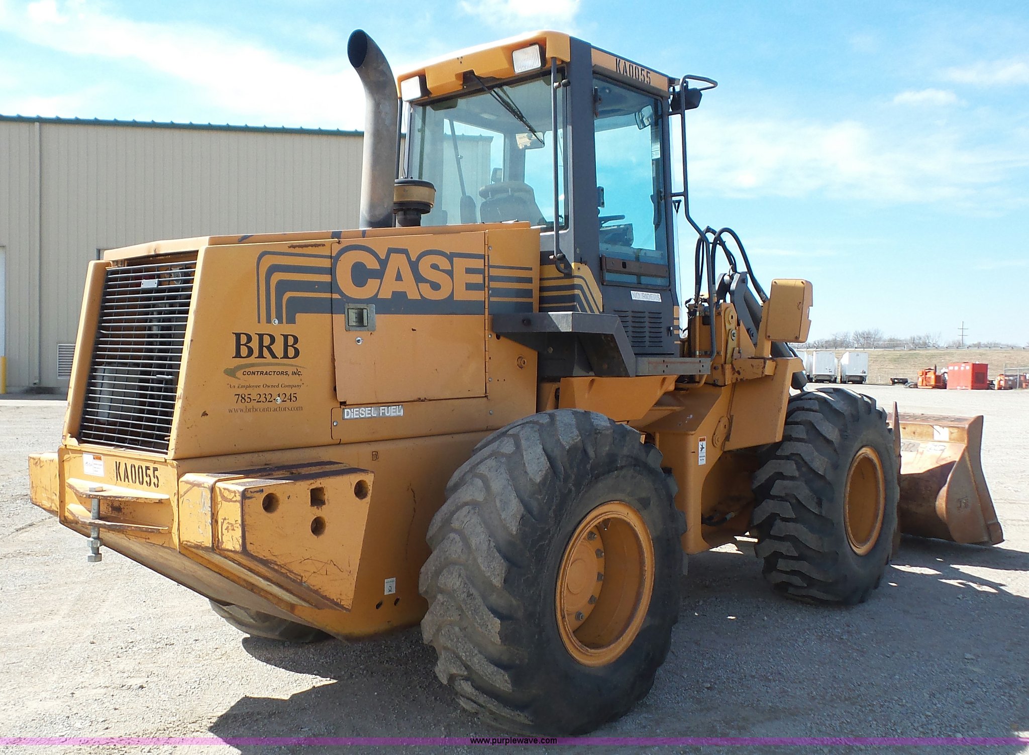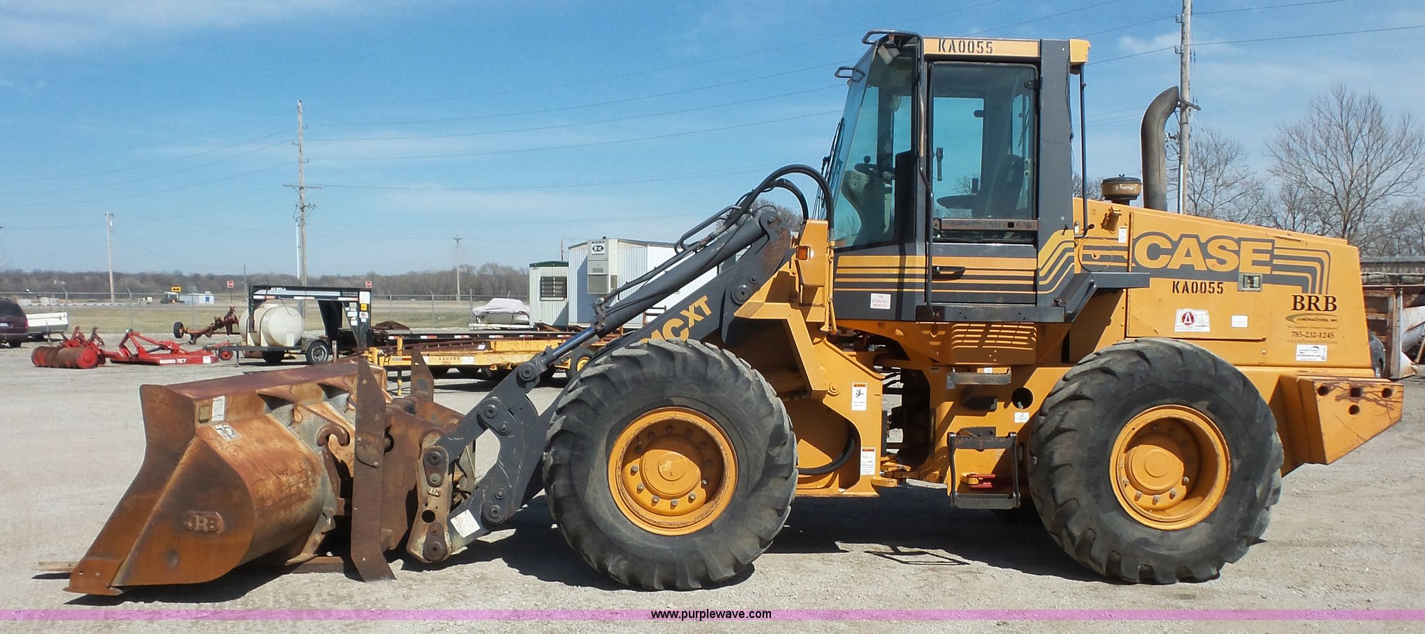 2000 Case 621C wheel loader. 8,800 hours on meter, Case 359/5.9 six cylinder diesel engine 130 HP, Powershift transmission 4F-3R gears, EROPS Serial JFF0129008, AC and heat, Tilt steering wheel, Suspension seat, Joystick bucket controls, Wipers, Front and rear work lights, General purpose bucket, JRB hydraulic quick coupler, Counterweights, 20.5-25 tires, 26,714 lbs. base operating weight, Serial JEE0123683. BRB Contractors. 3805 NW 25th Street. Topeka, KS 66618