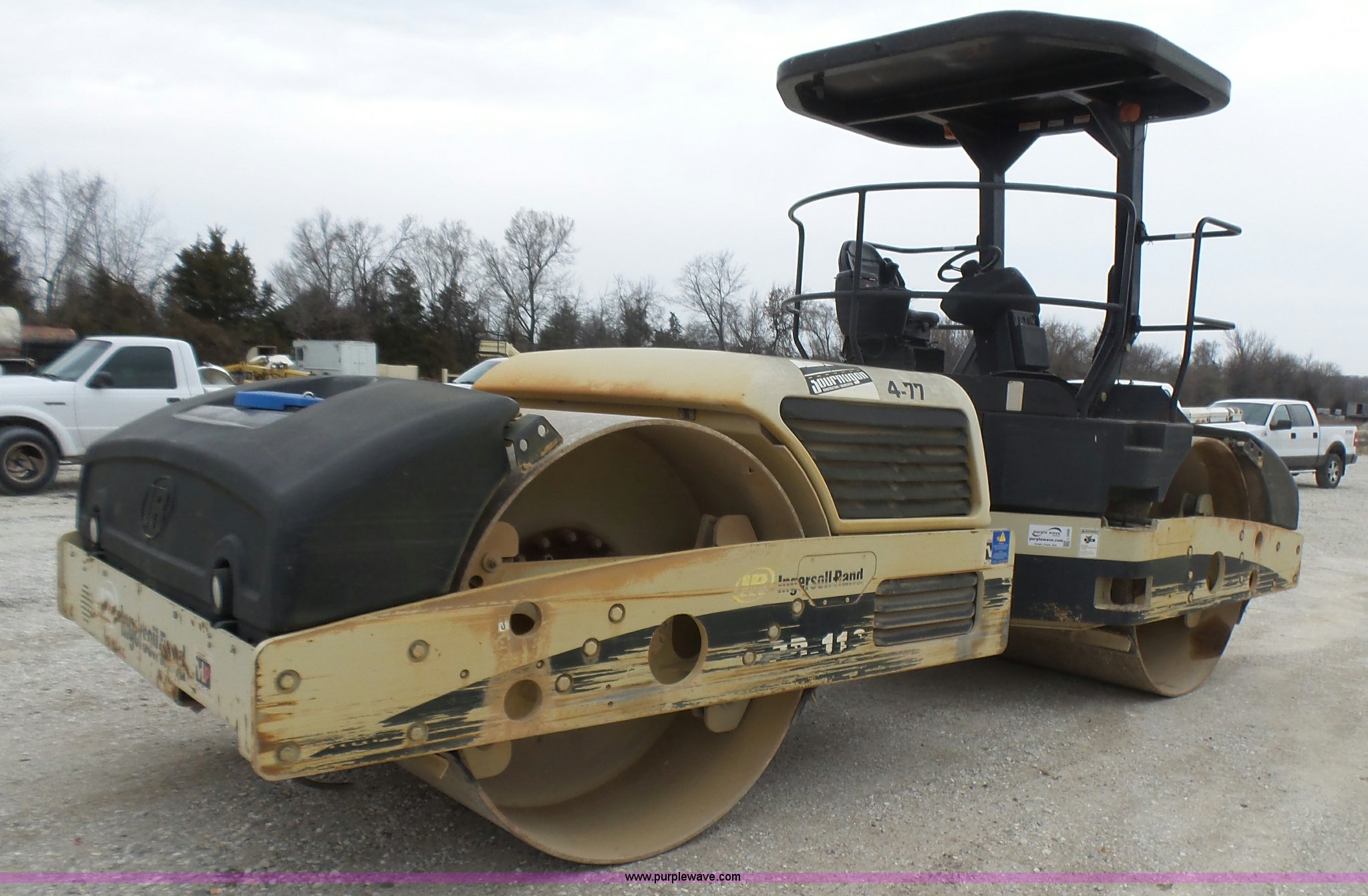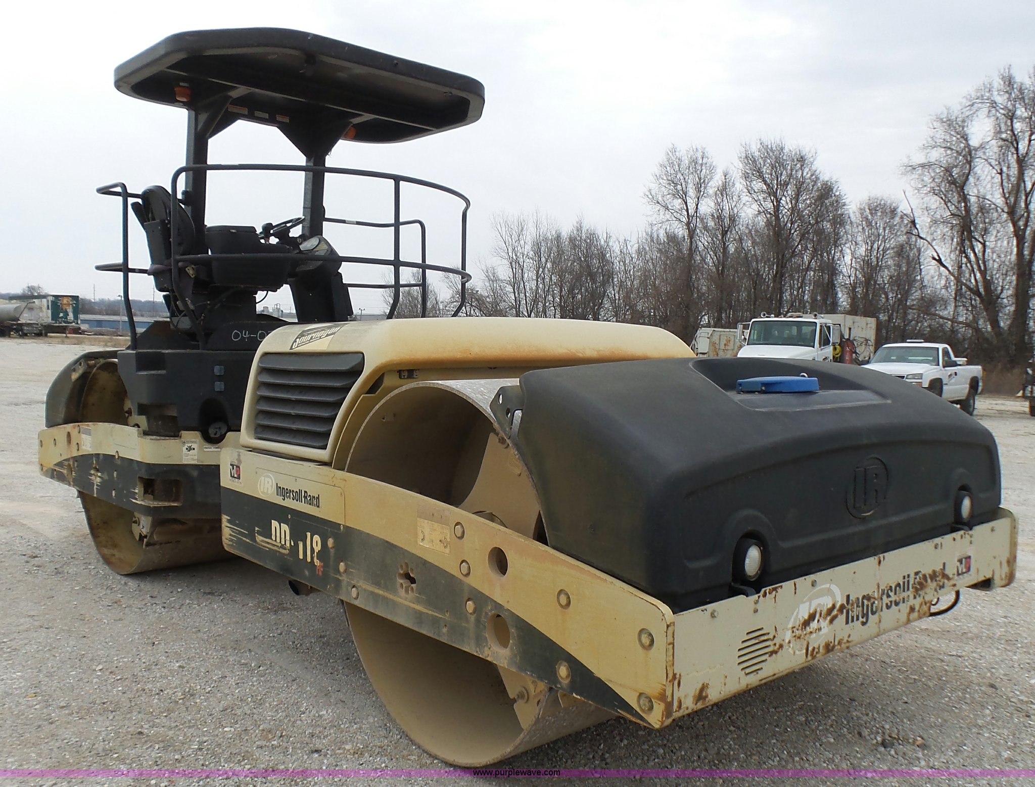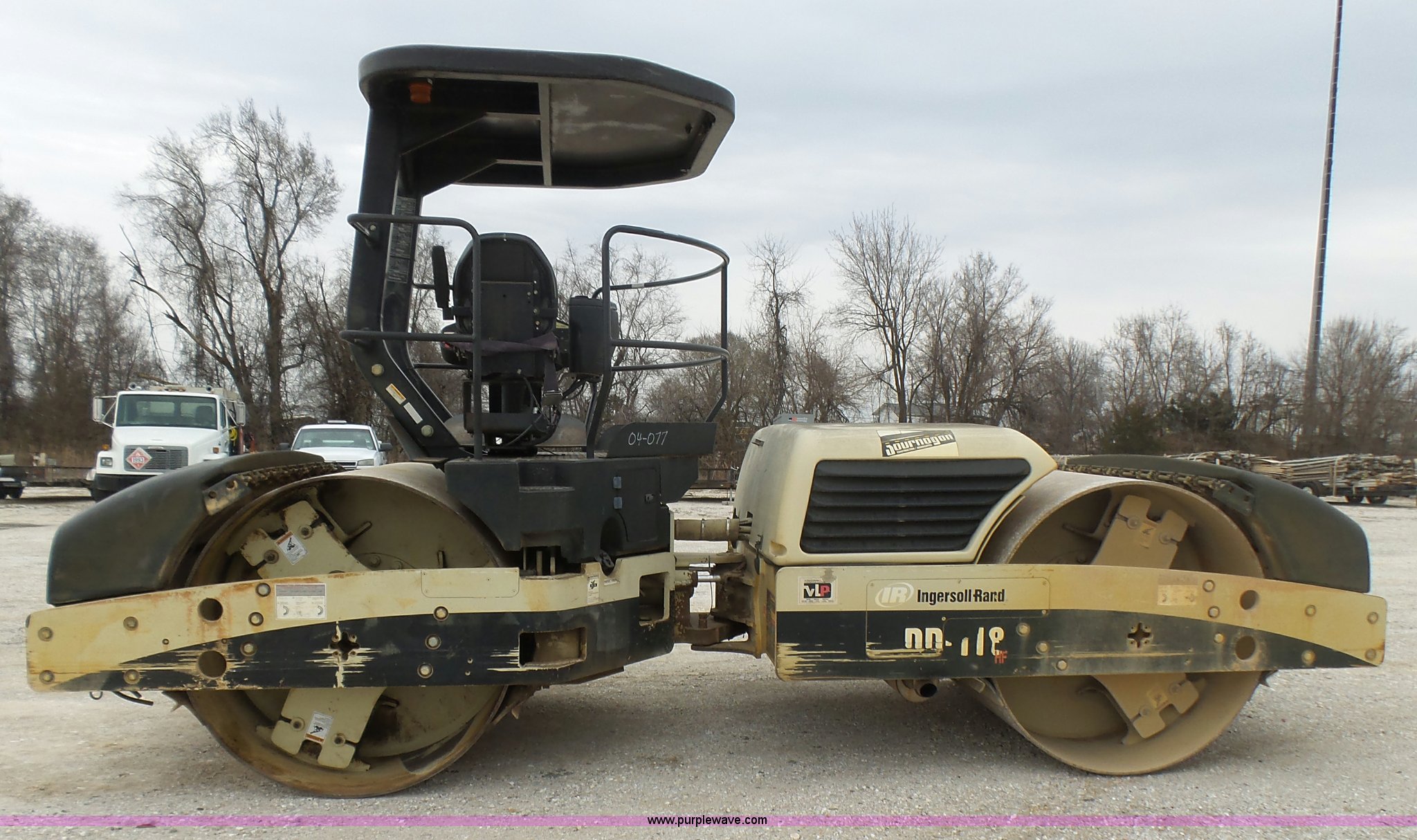 Purple Wave is selling a used Double Drum Roller Compactor in Missouri. This item is a 2005 Ingersoll Rand DD-118HF double drum vibratory compactor with the following: 3,688 hours on meter, Cummins 4BT 3.9L four cylinder diesel engine, 99 HP, Hydrostatic transmission, OROPS, Serial C60927, Suspension seat, Work lights, 78.5"W x 54" diameter drums, Front and rear drum scrapers, Front and rear water application, Two speed vibratory system, Independent drum controls, Serial 183424, Unit# 4-77