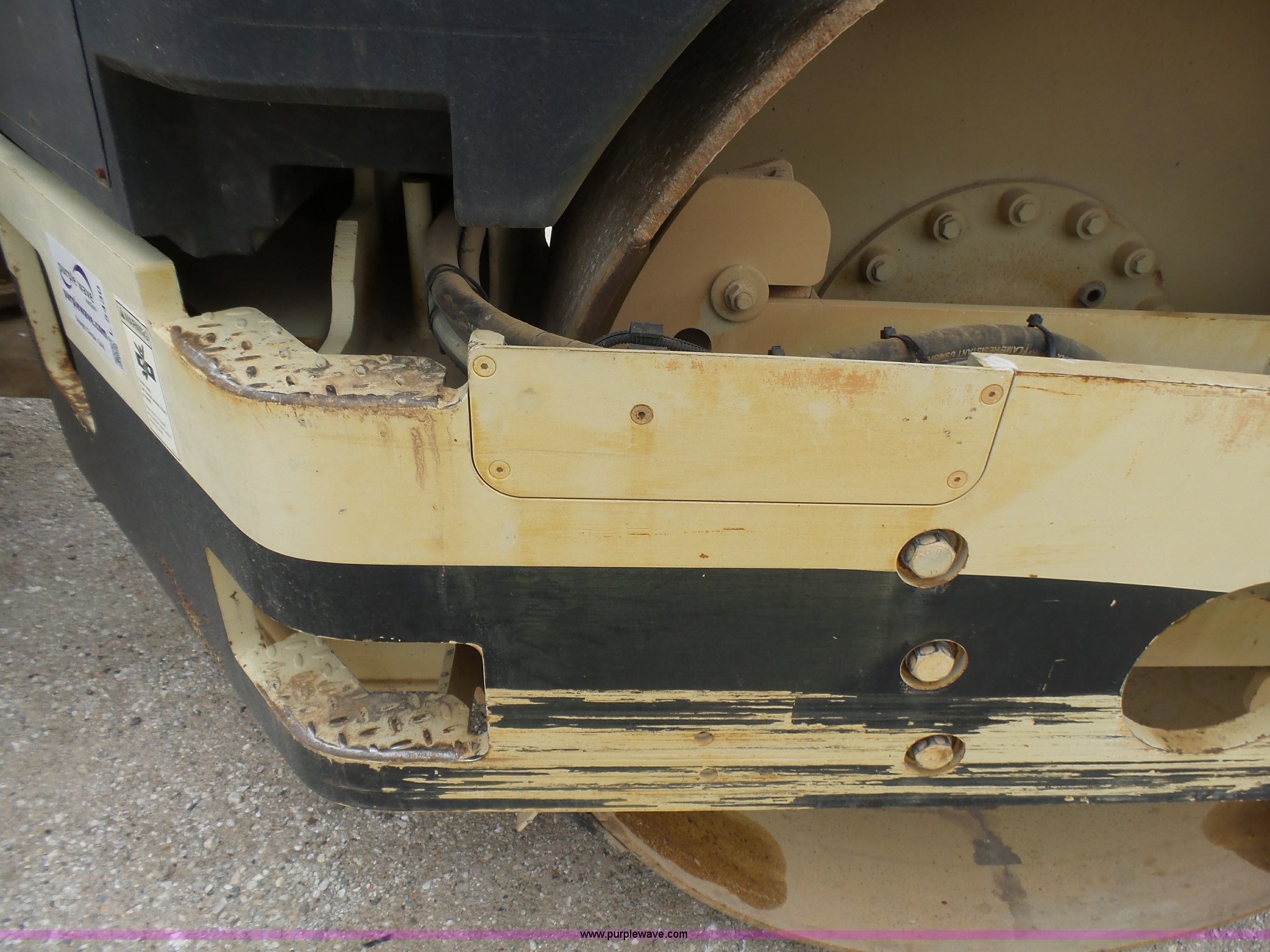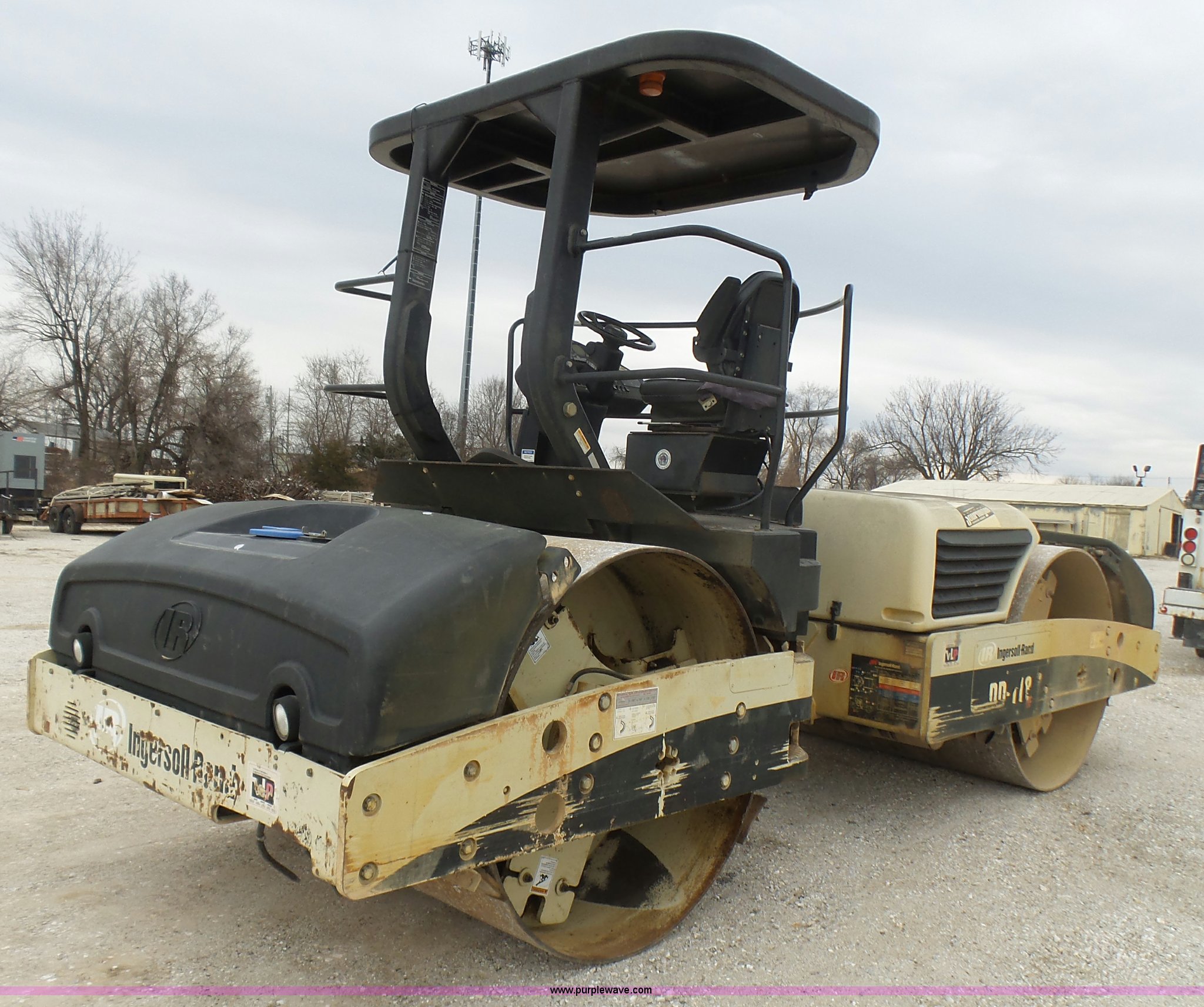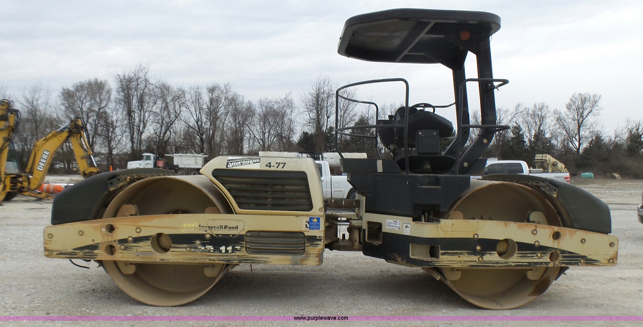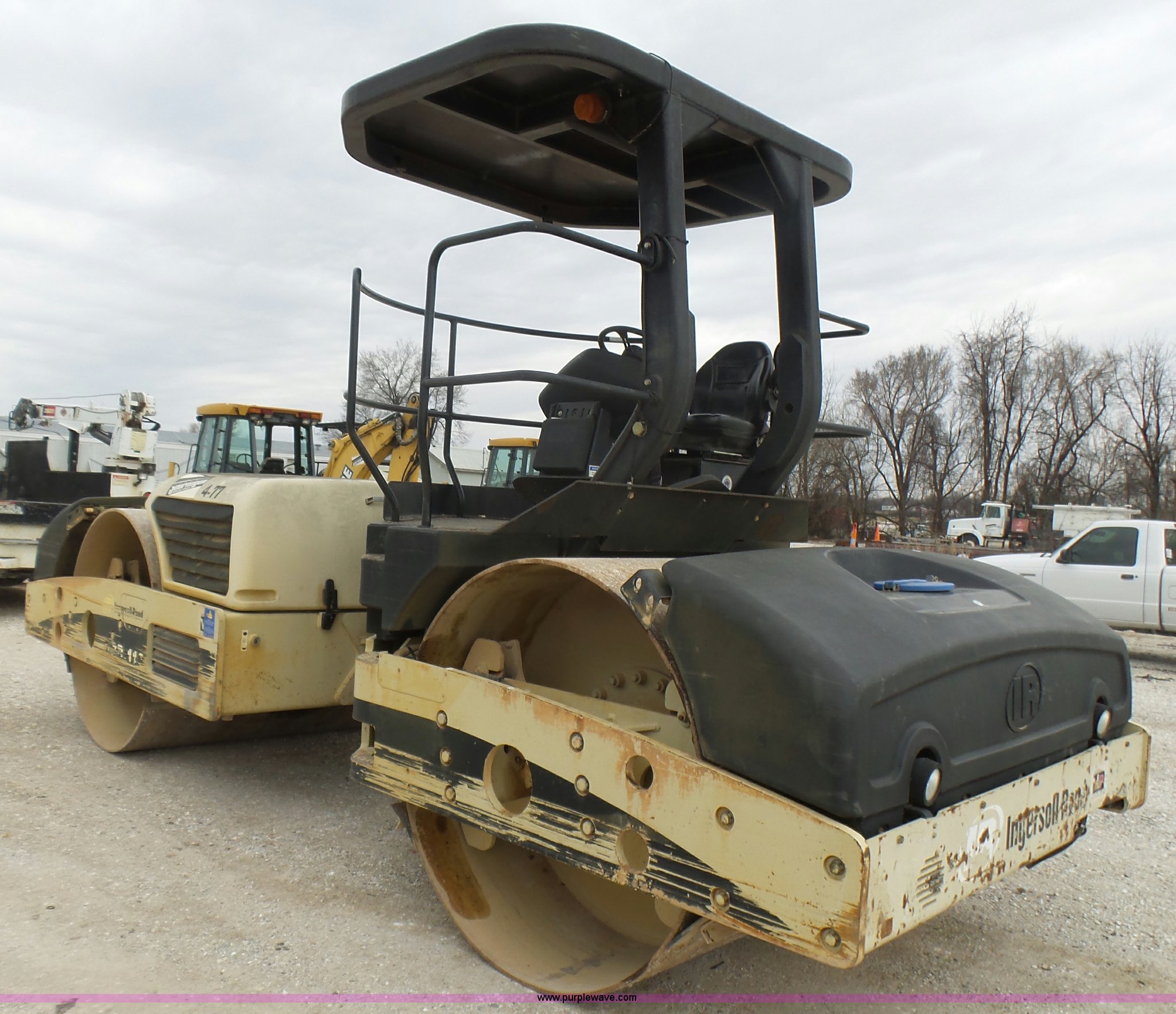 Purple Wave is selling a used Double Drum Roller Compactor in Missouri. This item is a 2005 Ingersoll Rand DD-118HF double drum vibratory compactor with the following: 3,688 hours on meter, Cummins 4BT 3.9L four cylinder diesel engine, 99 HP, Hydrostatic transmission, OROPS, Serial C60927, Suspension seat, Work lights, 78.5"W x 54" diameter drums, Front and rear drum scrapers, Front and rear water application, Two speed vibratory system, Independent drum controls, Serial 183424, Unit# 4-77