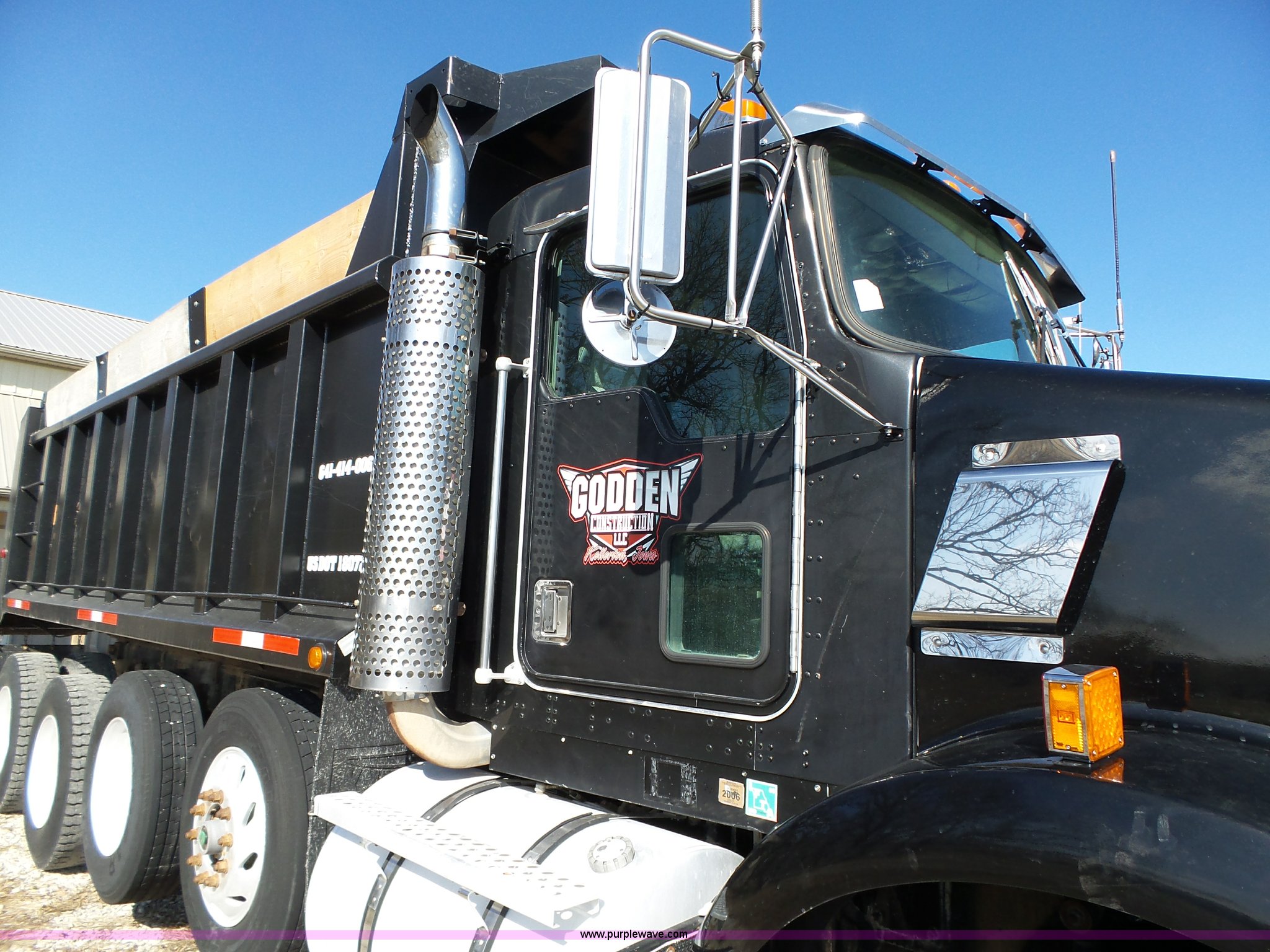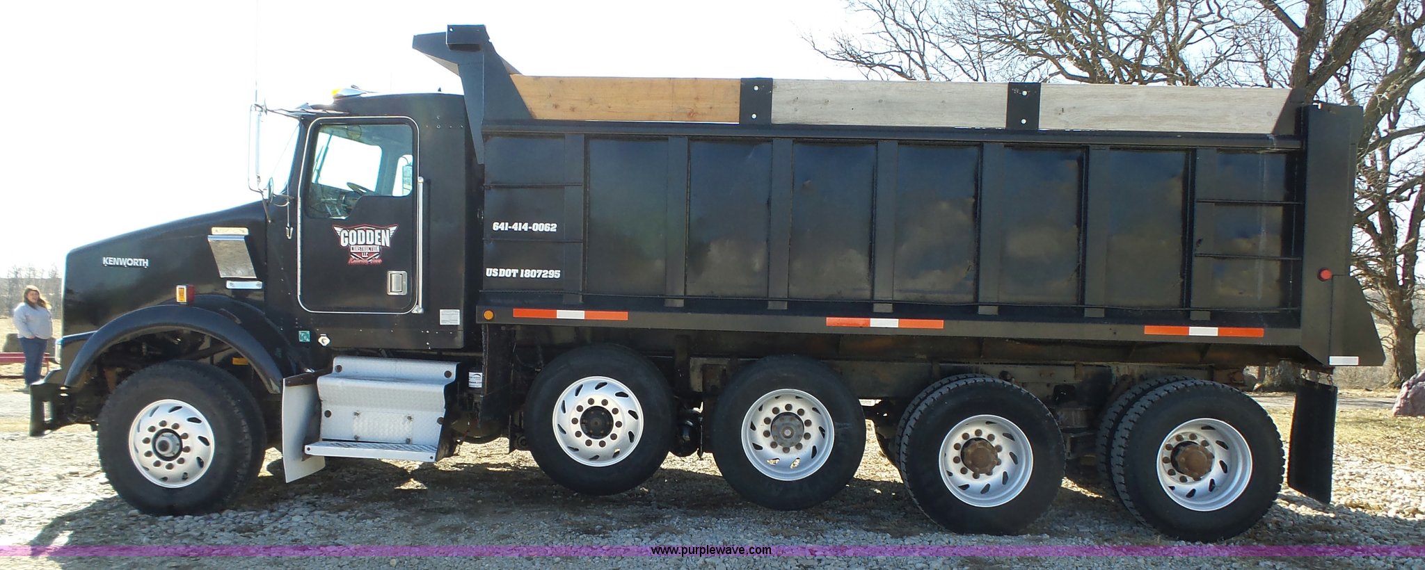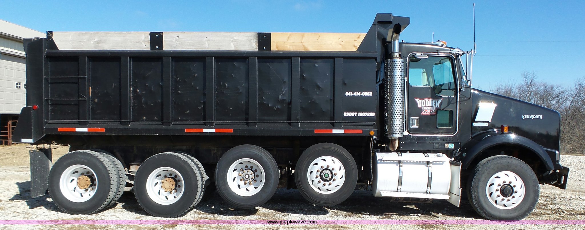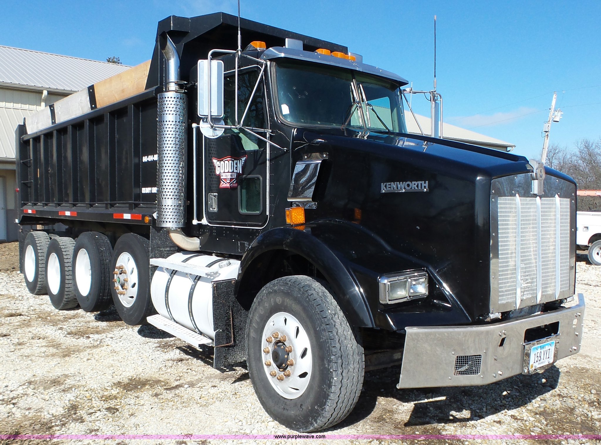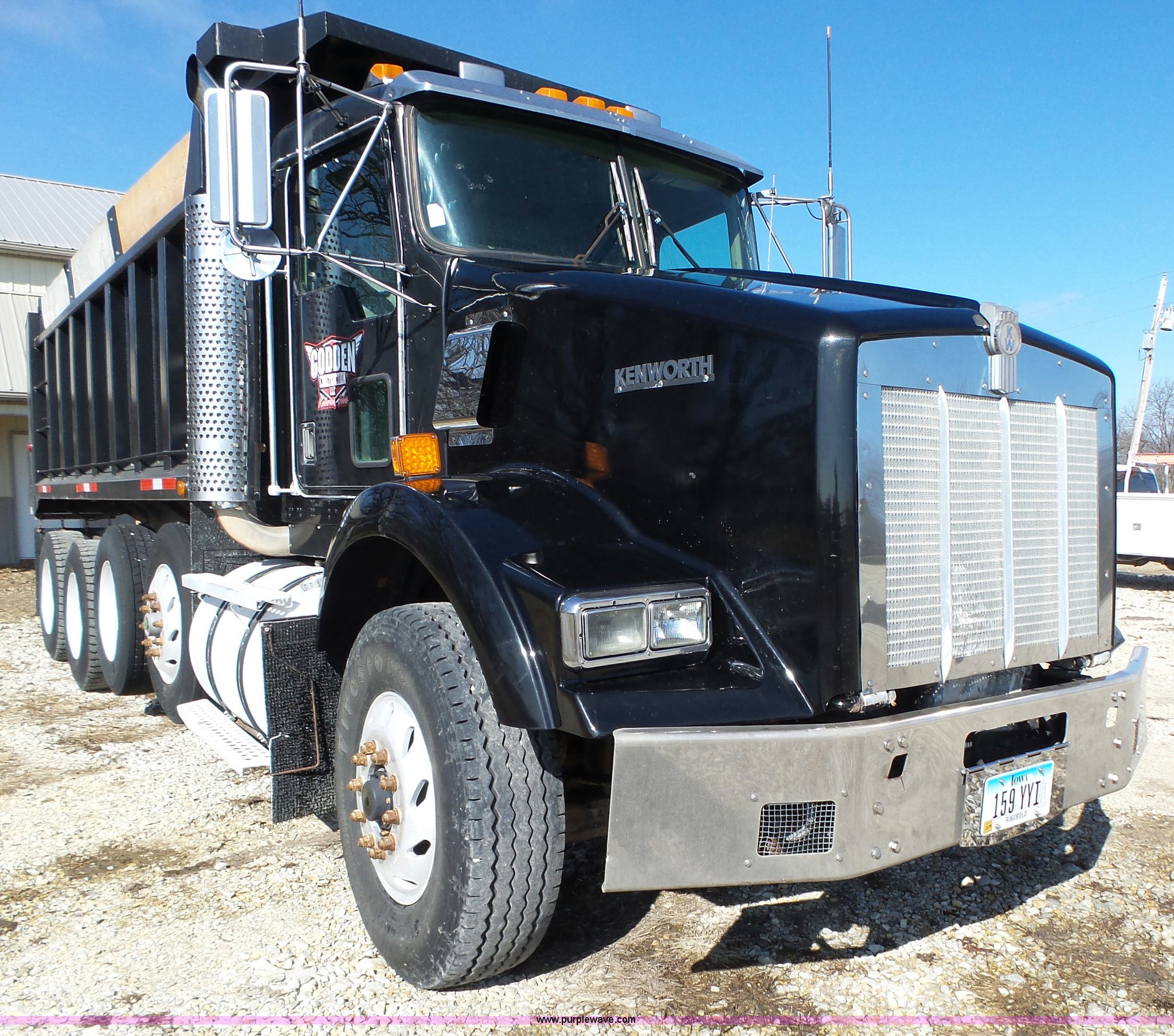 1998 Kenworth T800 dump truck. 414,845 miles on odometer, 19,092 hours on meter, Caterpillar 3406 14.6L L6 turbo diesel engine 475 HP, Block heater, Eaton Fuller 18 speed manual transmission, Quad axle, Inter-axle differential lock, AC and heat, Tilt, Cruise, AM/FM/CD, Heated mirrors, Exterior visor, PTO, Heil steel dump bed 18'L x 96"W, 18 cubic yard capacity, 44" side height, 12" side board height, Single ram hoist, Air operated end gate, Single fuel tank, Steerable pusher axle, Air to rear of frame, 240" wheelbase, Walking beam suspension, Air brakes, Engine brake, 315/85R22.5 front tires, 295/75R22.5 pusher axle tires, 11R22.5 rear tires, GVWR 89,000 lbs, FAWR 20,000 lbs, RAWR 20,000 lbs, GAWR 12,000 lbs pusher axle. 1NKDXBTX8WR757099. Godden Construction. 2401 Highway 69 South. Osceola, IA 50213