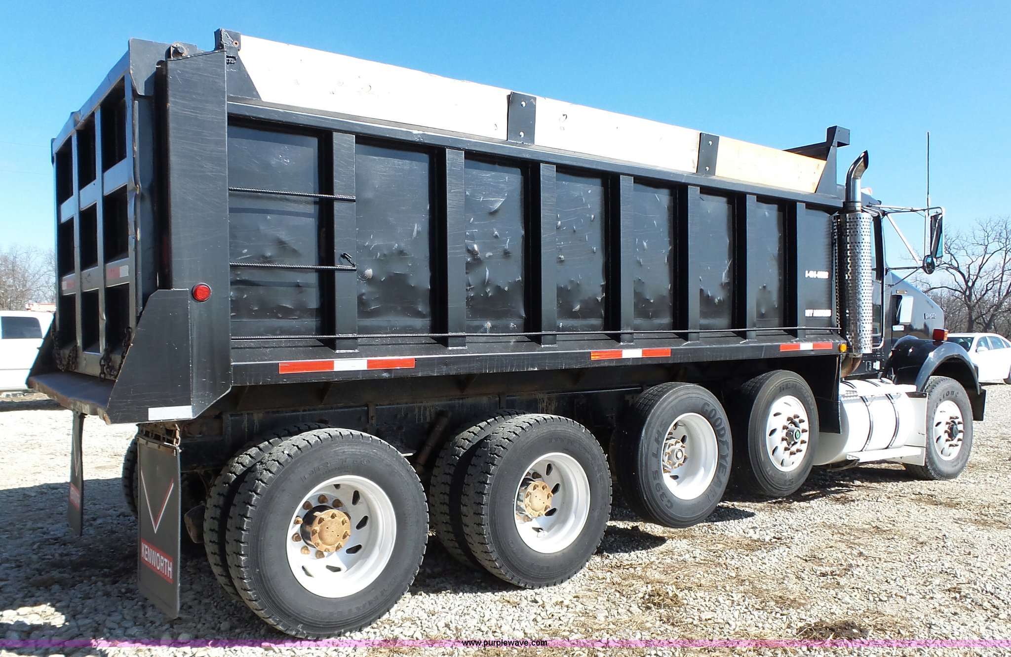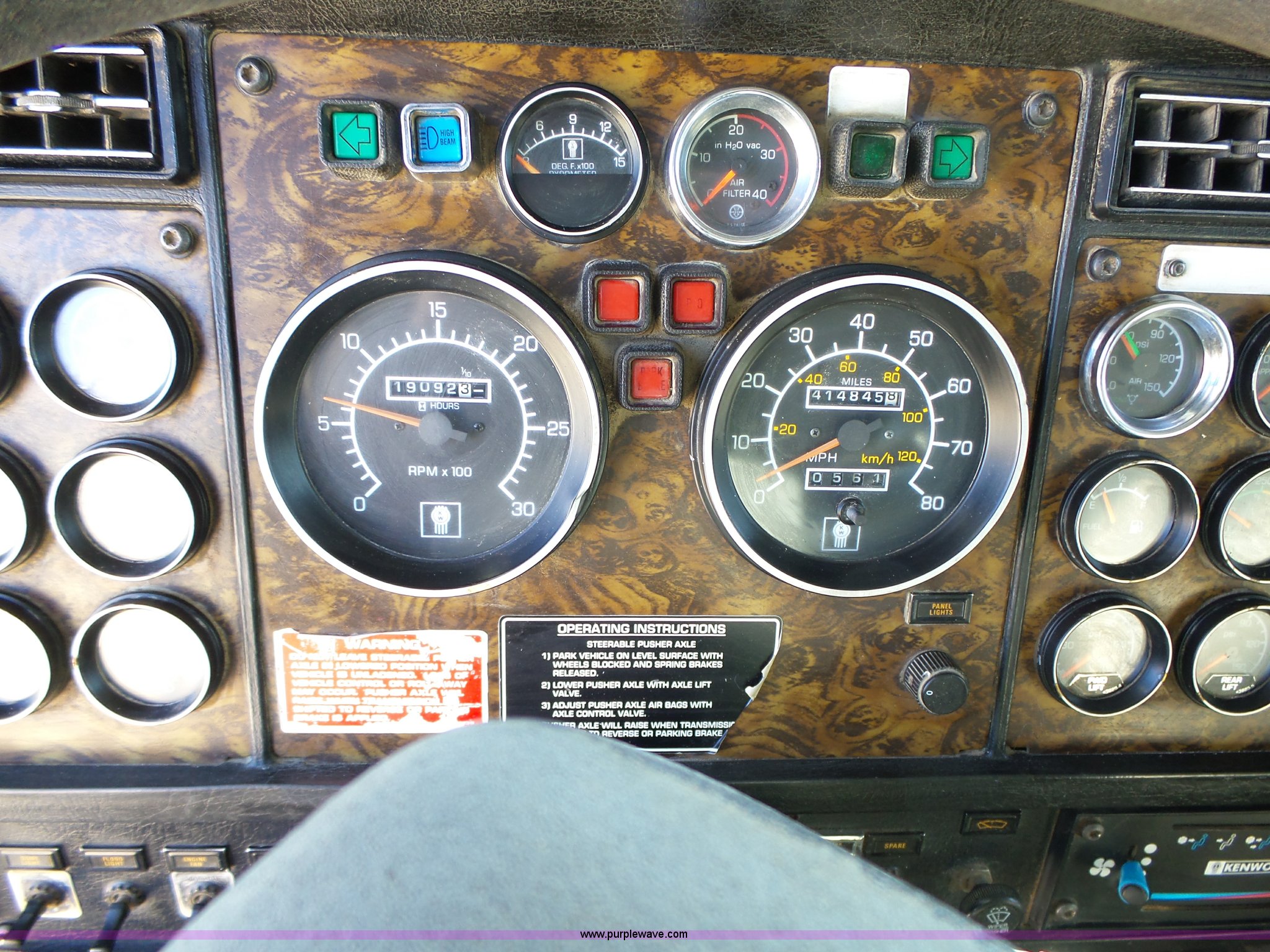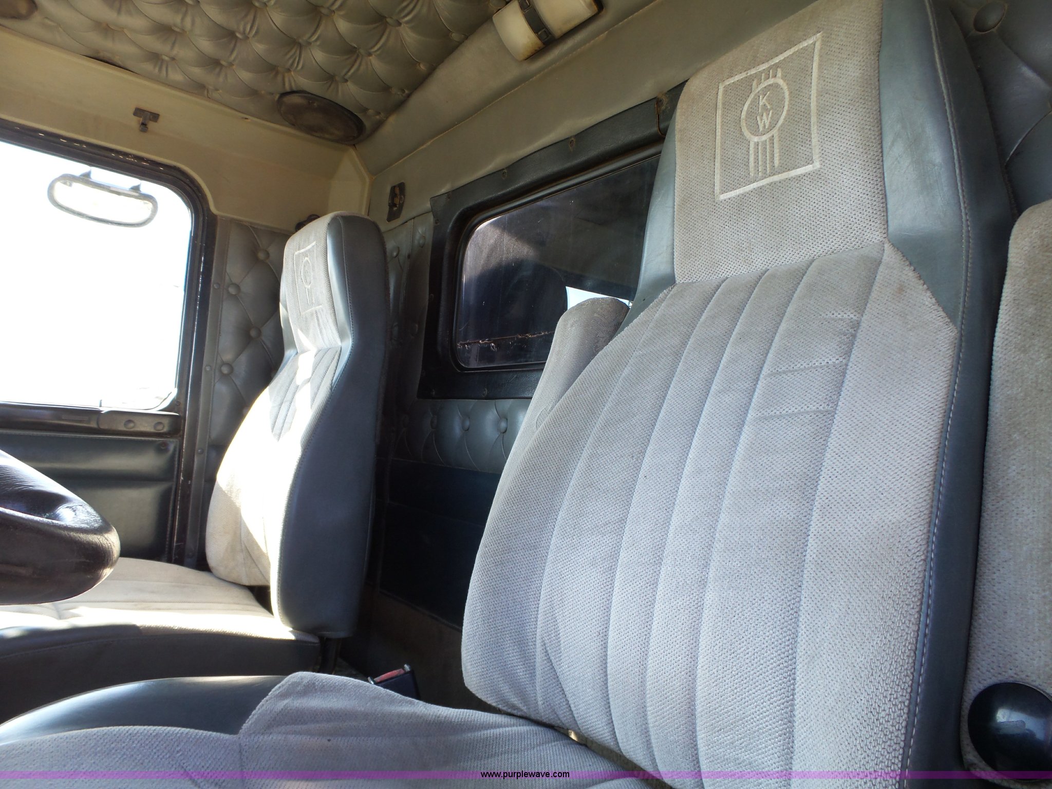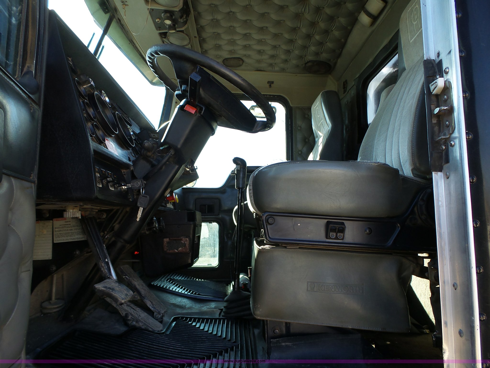 Purple Wave is selling a used Construction Dump Truck in Iowa. This item is a 1998 Kenworth T800 dump truck with the following: 414,845 miles on odometer, 19,092 hours on meter, Caterpillar 3406 14.6L L6 turbo diesel engine, 475 HP, Block heater, Eaton Fuller 18 speed manual transmission, Quad axle, Inter-axle differential lock, AC and heat, Tilt, Cruise, AM/FM/CD, Heated mirrors, Exterior visor, PTO, Heil steel dump bed, 18'L x 96"W, 18 cubic yard capacity, 44" side height, 12" side board height, Single ram hoist, Air operated end gate, Single fuel tank, Steerable pusher axle, Air to rear of frame, 240" wheelbase, Walking beam suspension, Air brakes, Engine brake, 315/85R22.5 front tires, 295/75R22.5 pusher axle tires, 11R22.5 rear tires, GVWR 89,000 lbs, FAWR 20,000 lbs, RAWR 20,000 lbs, GAWR 12,000 lbs pusher axle