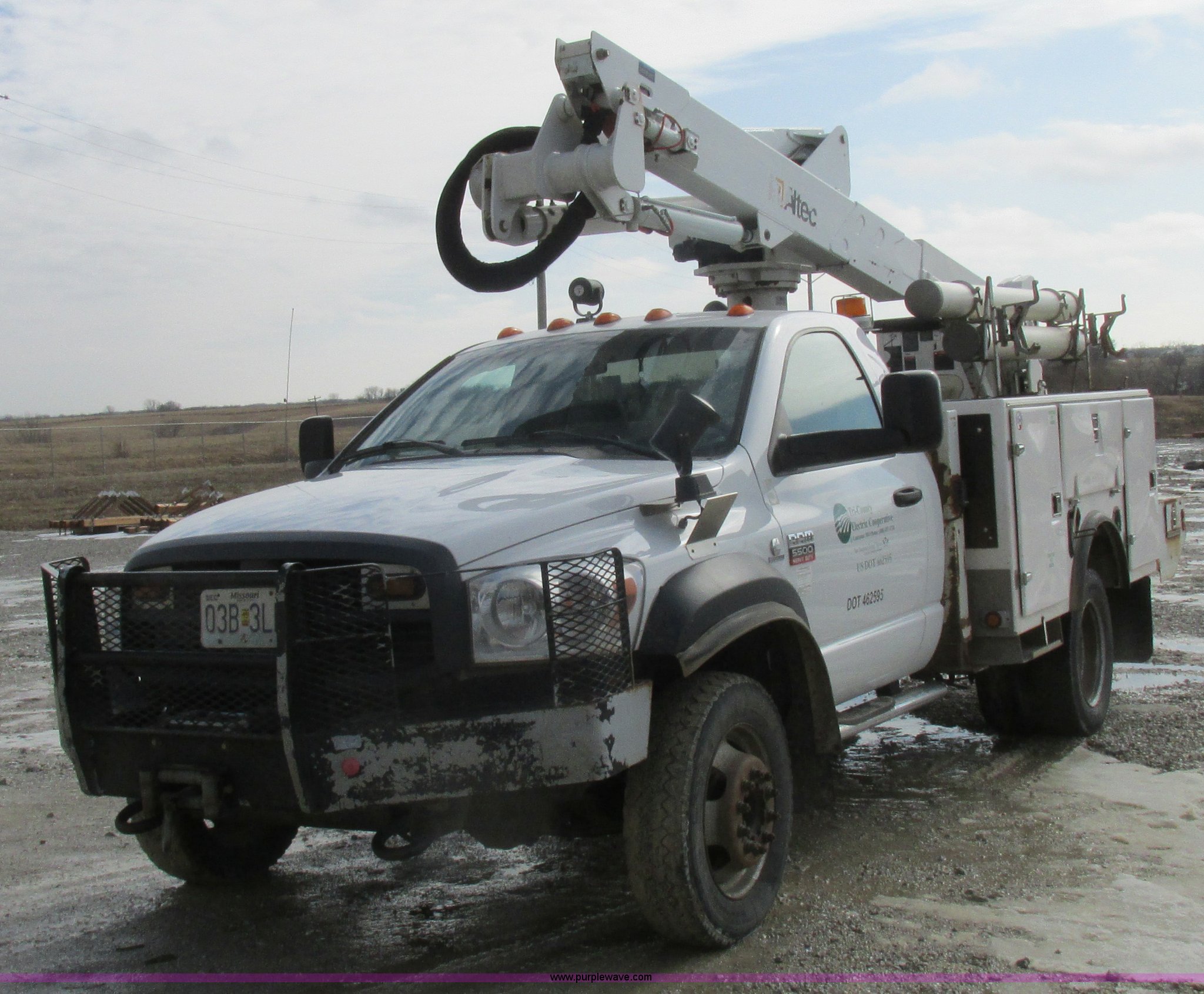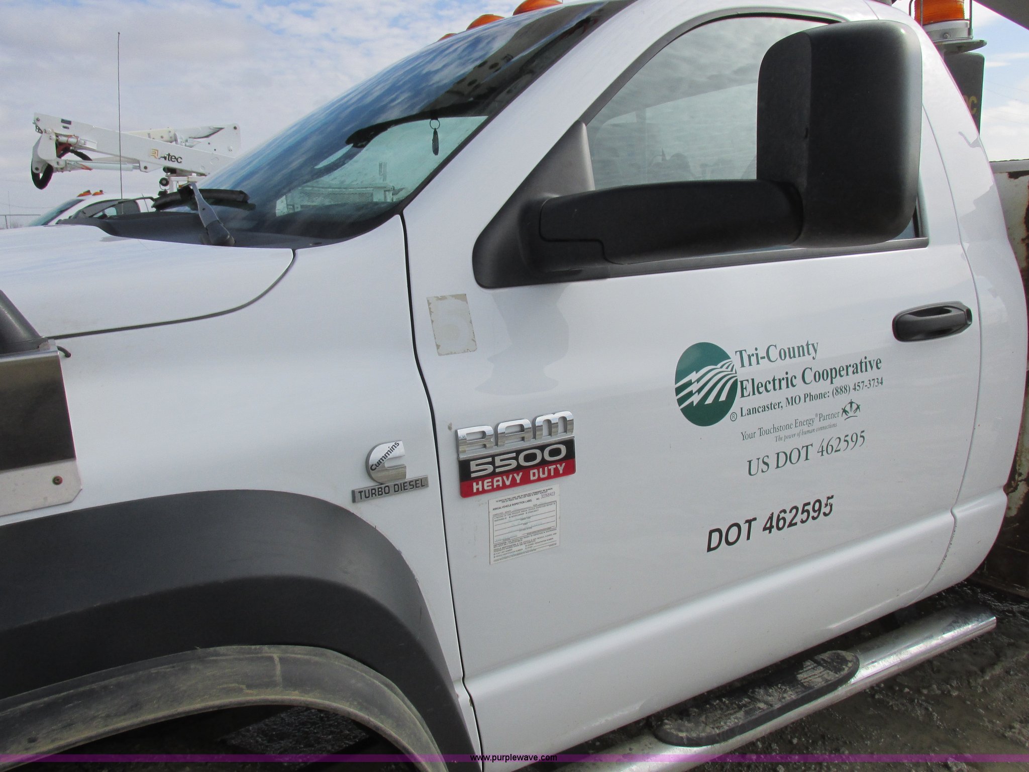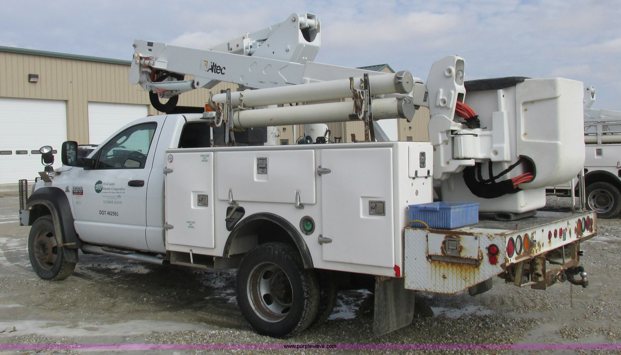 Purple Wave is selling a used Bucket Truck in Missouri. This item is a 2009 Dodge Ram 5500 bucket truck with the following: 180,112 miles on odometer, 10,783 hours on meter, Cummins 6.7L L6 turbo diesel engine, Automatic transmission, AC and heat, AM/FM, Spring suspension seat, Beacon light, Front tow hooks, PTO, Altec 11'L bed, Shelving, Slide out drawers, Serial 14598701, Pintle hitch, Trailer wiring, Altec AT37-G boom, Serial 0809DE11258, 400 lbs maximum lift capacity, 37' maximum lift height, Man basket, Ground and platform controls, Boom rotation, Articulating insulated telescopic boom, Outriggers, Warren winch, 15,000 lbs maximum capacity, My-te 30-12 hoist, 800 lbs maximum single line capacity, Serial E882189, Single fuel tank, Spring suspension, Hydraulic brakes, 225/70R19.5 tires, GVWR 18,750 lbs, View aerial device test report