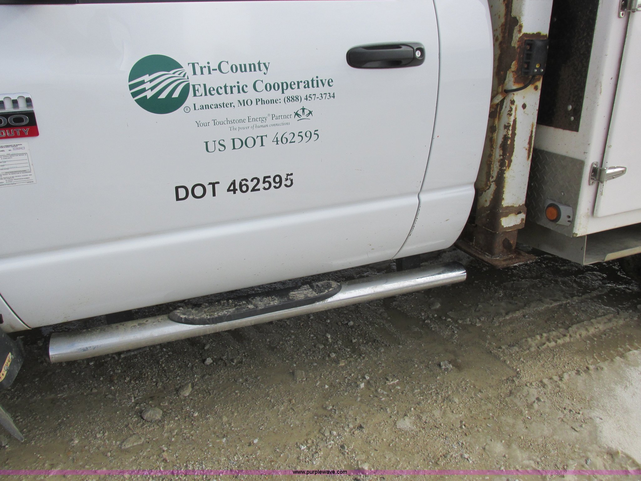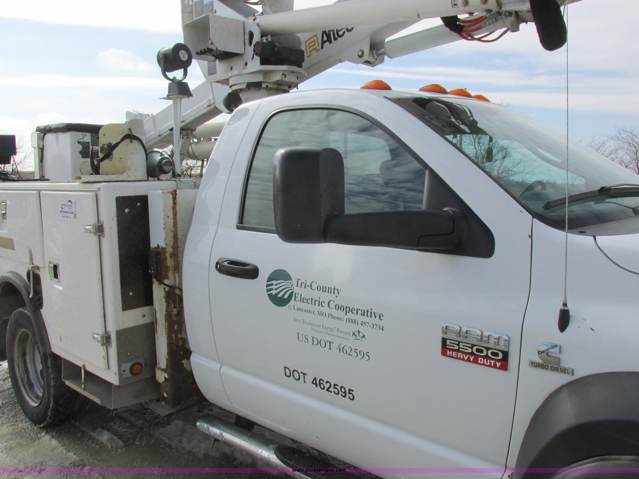 2009 Dodge Ram 5500 bucket truck. 180,112 miles on odometer, 10,783 hours on meter, Cummins 6.7L L6 turbo diesel engine, Automatic transmission, AC and heat, AM/FM, Spring suspension seat, Beacon light, Front tow hooks, PTO, Altec 11'L bed Shelving, Slide out drawers, Serial 14598701, Pintle hitch, Trailer wiring, Altec AT37-G boom Serial 0809DE11258, 400 lbs maximum lift capacity, 37' maximum lift height, Man basket, Ground and platform controls, Boom rotation, Articulating insulated telescopic boom, Outriggers, Warren winch 15,000 lbs maximum capacity, My-te 30-12 hoist 800 lbs maximum single line capacity, Serial E882189, Single fuel tank, Spring suspension, Hydraulic brakes, 225/70R19.5 tires, GVWR 18,750 lbs, View aerial device test report. 3D6WD76L79G559623. View equipment video. Tri County Electric. 16894 U.S. Highway 63. Lancaster, MO 63548