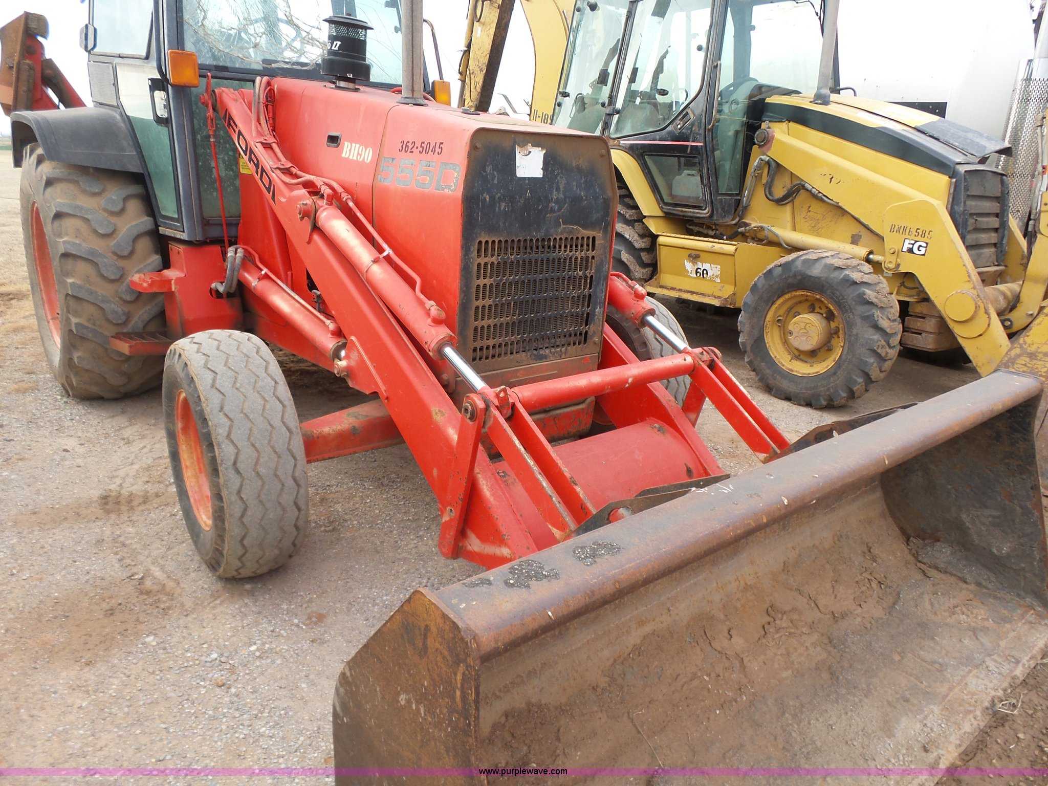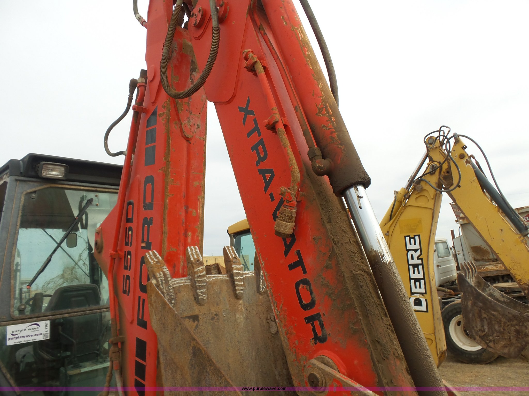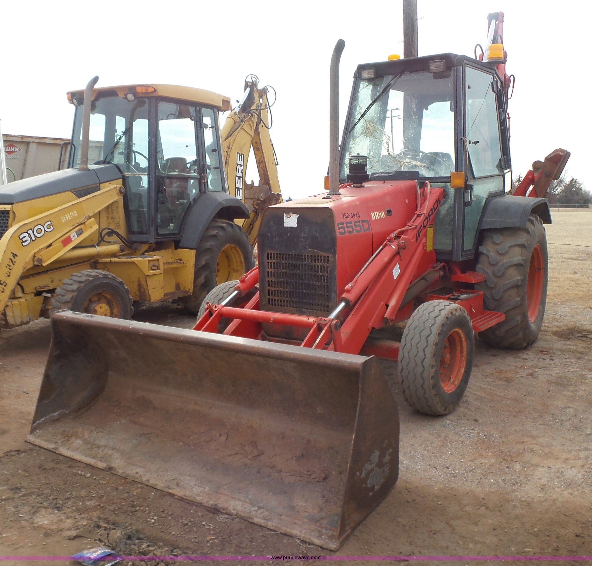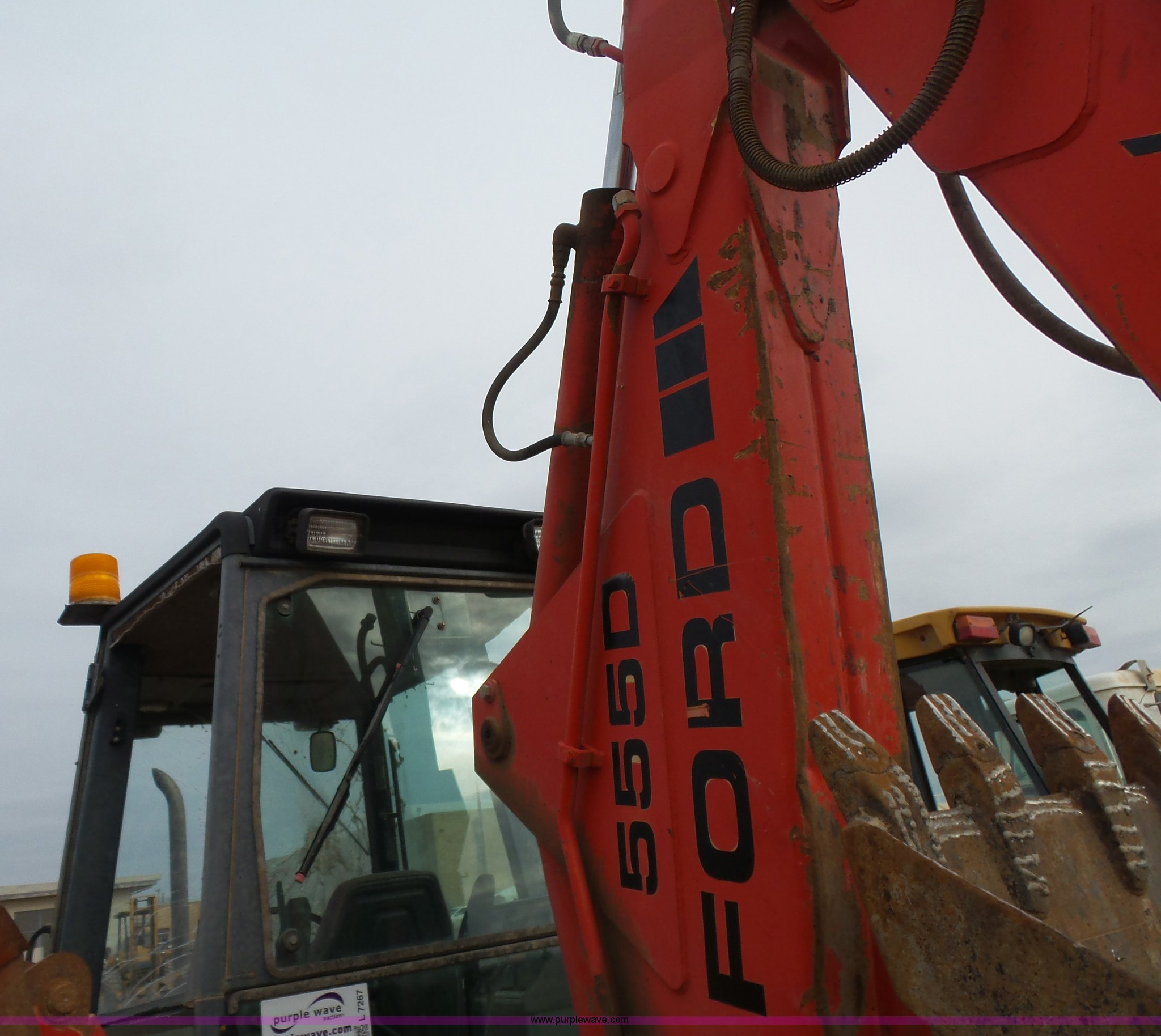 Purple Wave is selling a used Tractor Loader Backhoe in Oklahoma. This item is a Ford 555D backhoe with the following: 4,119 hours on meter, Diesel engine, Shuttle shift transmission, 4F-4R gears, EROPS, Wobble stick backhoe controls, Front and rear work lights, 88"W loader bucket, E-stick, 23"W backhoe bucket, (4) teeth, Auxiliary hydraulics, 11L-16SL front tires, 16.9-28 rear tires, Interior/exterior cosmetic damage, Serial A437046