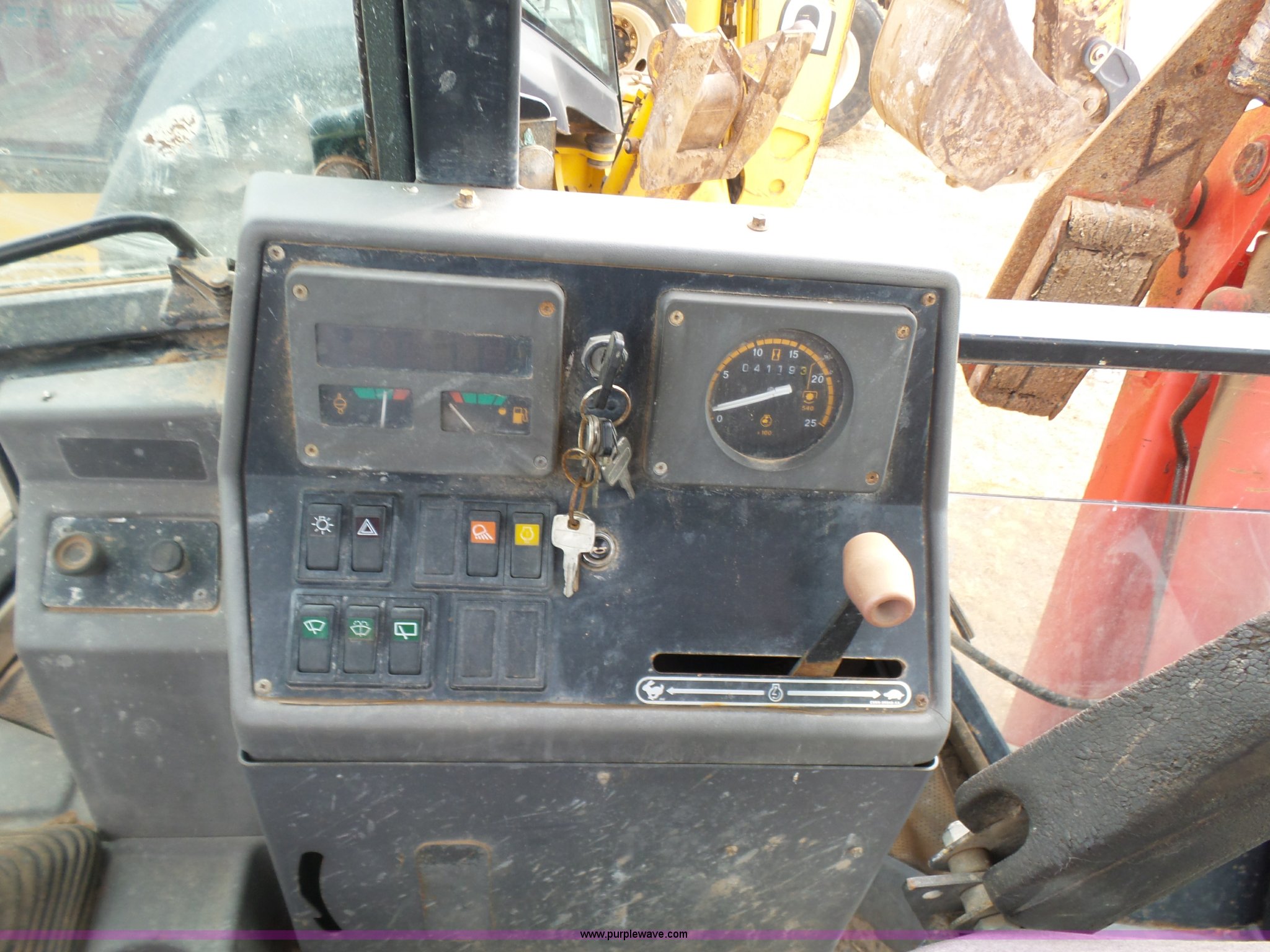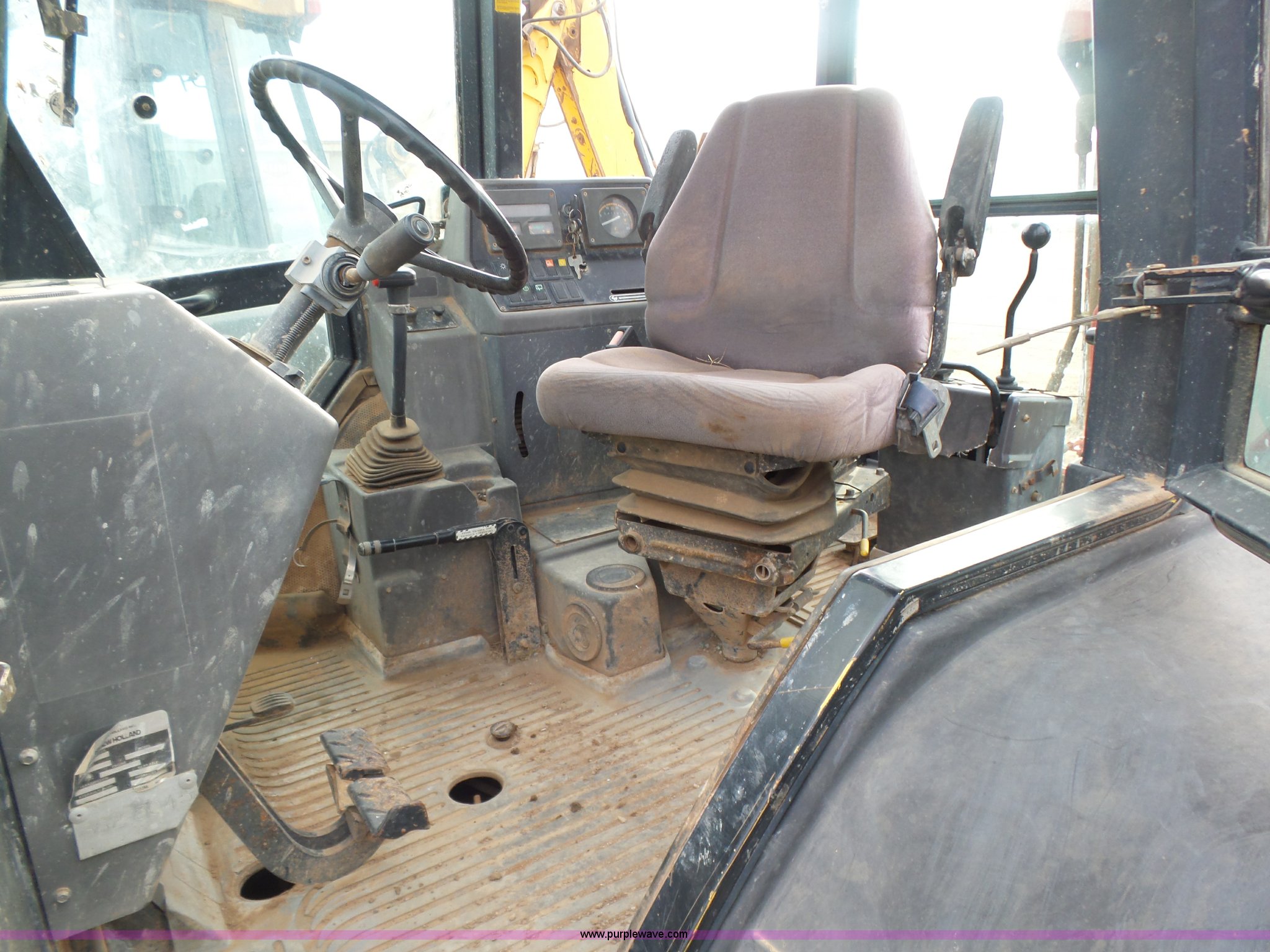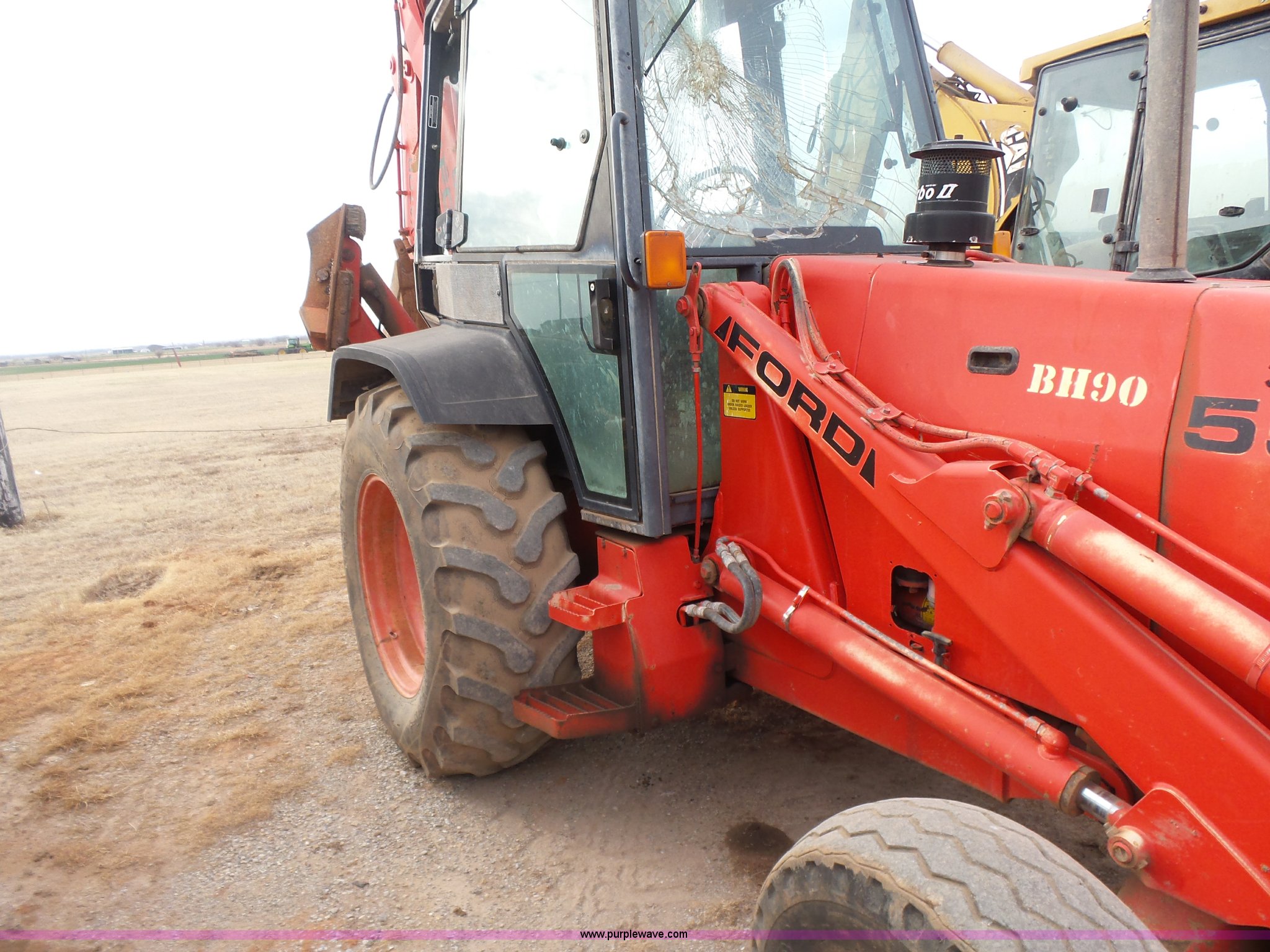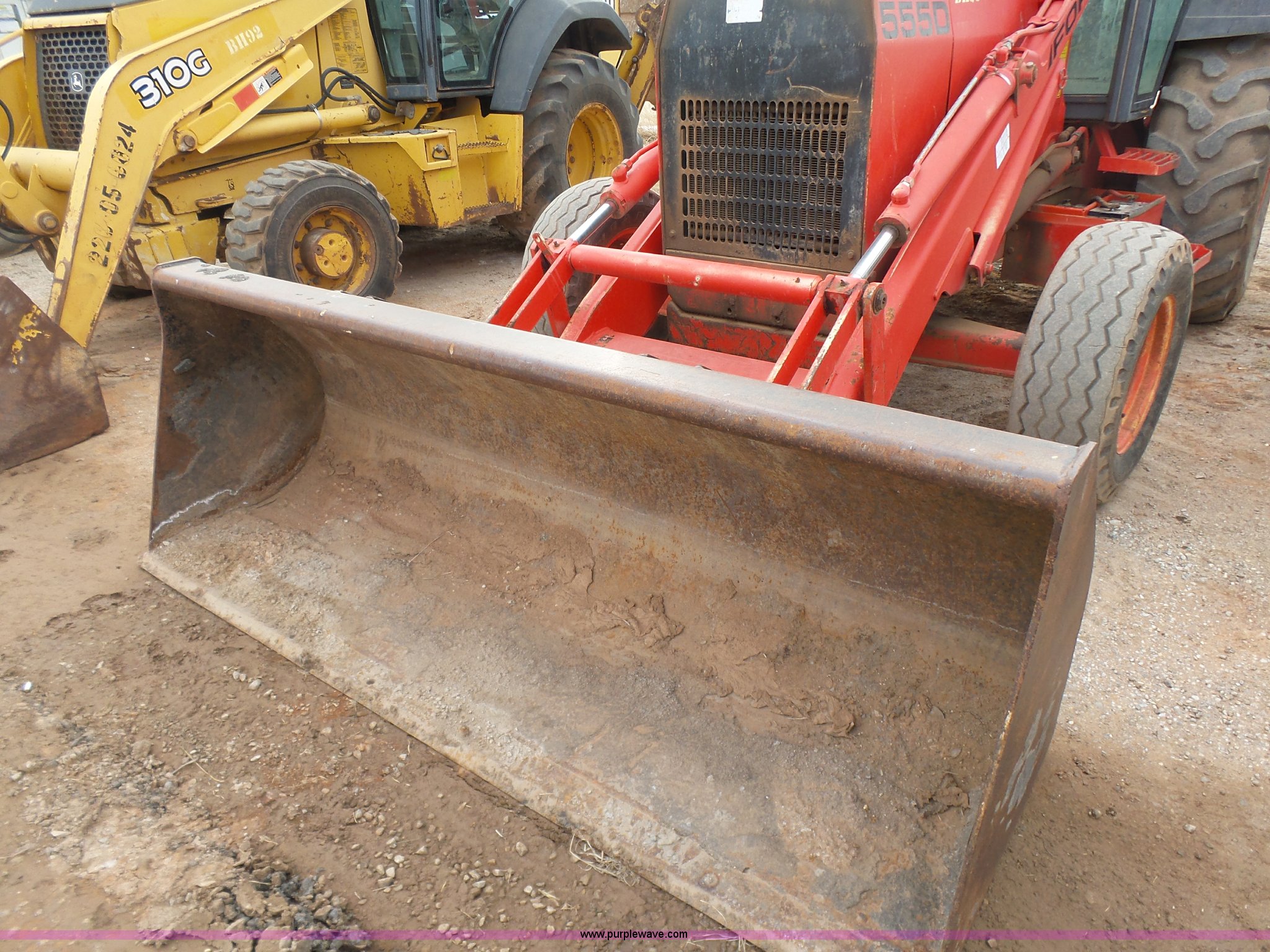 Purple Wave is selling a used Tractor Loader Backhoe in Oklahoma. This item is a Ford 555D backhoe with the following: 4,119 hours on meter, Diesel engine, Shuttle shift transmission, 4F-4R gears, EROPS, Wobble stick backhoe controls, Front and rear work lights, 88"W loader bucket, E-stick, 23"W backhoe bucket, (4) teeth, Auxiliary hydraulics, 11L-16SL front tires, 16.9-28 rear tires, Interior/exterior cosmetic damage, Serial A437046