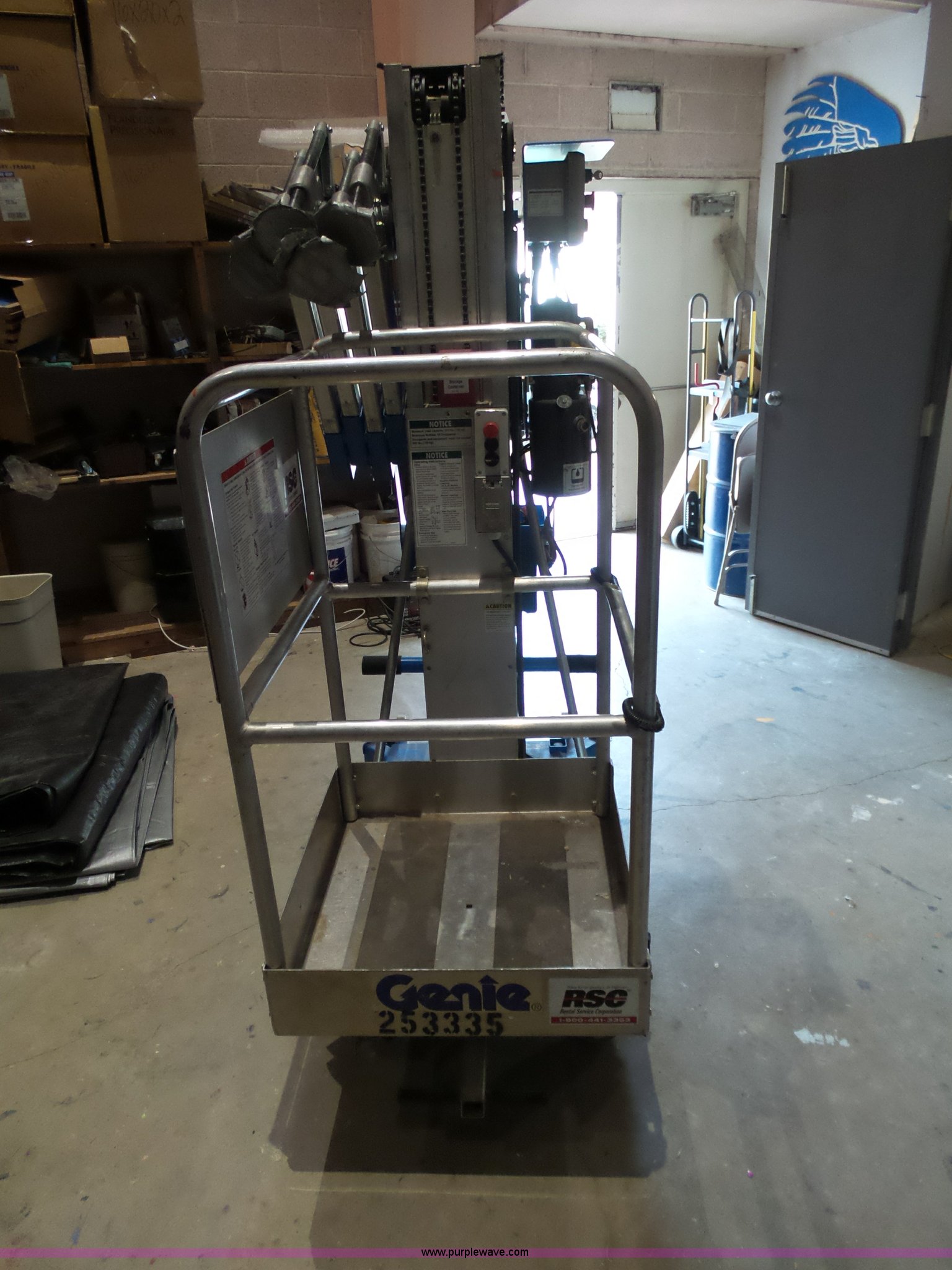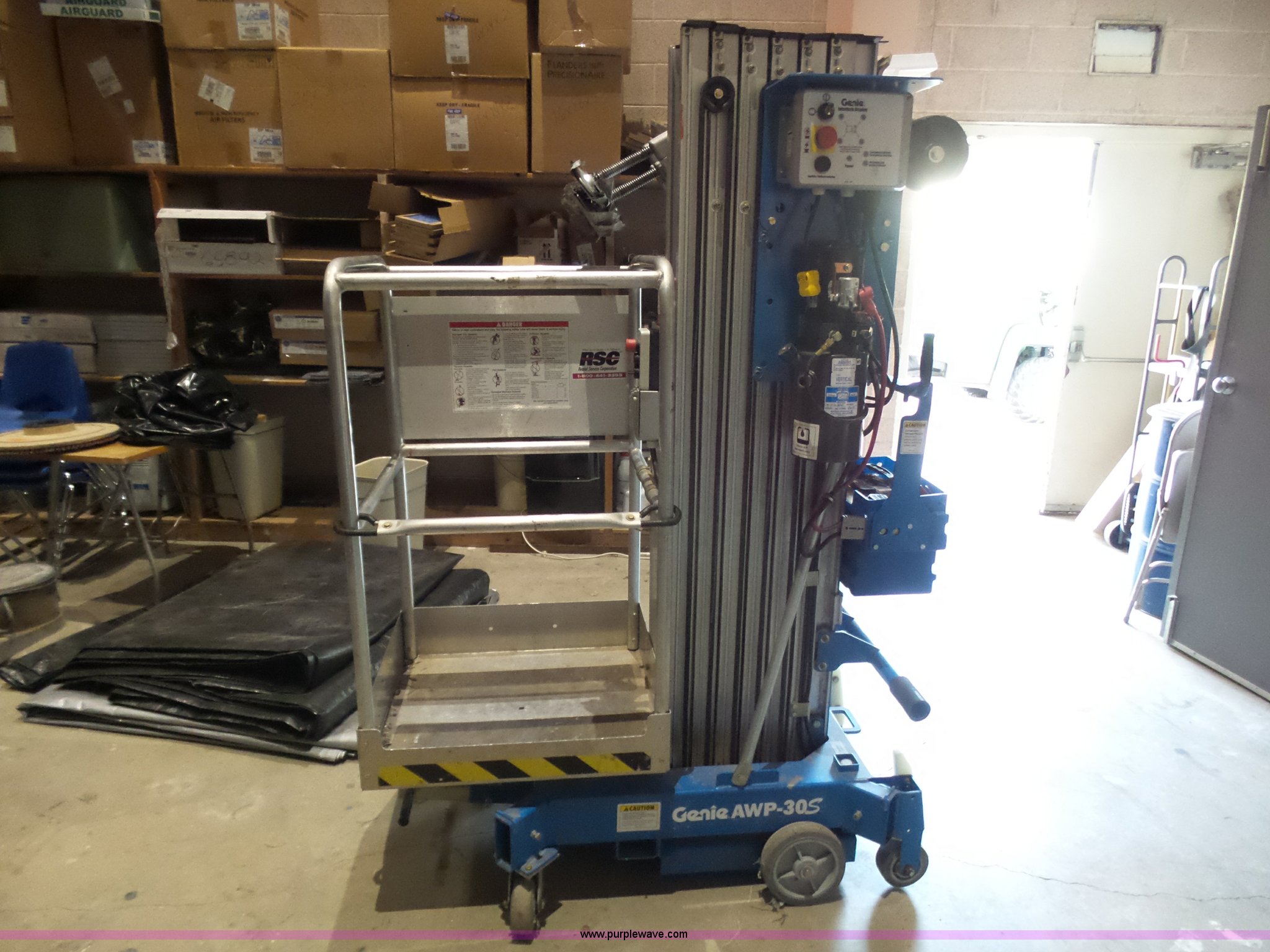 Purple Wave is selling a used Scissor or Vertical Lift in Kansas. This item is a 1998 Genie AWP-305 vertical lift with the following: 350 lbs capacity, 30' max lift height, Ground and platform controls, Manual outirggers, 26" x 26" x 44"h platform, Seven stages, 120V platform outlet, Weak battery, Serial 3898-9285