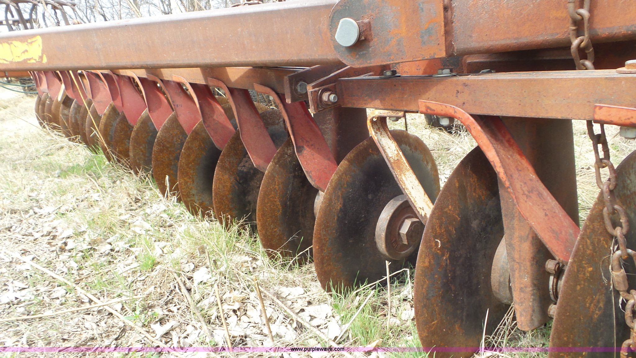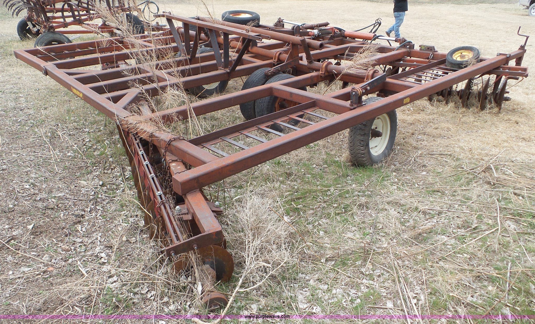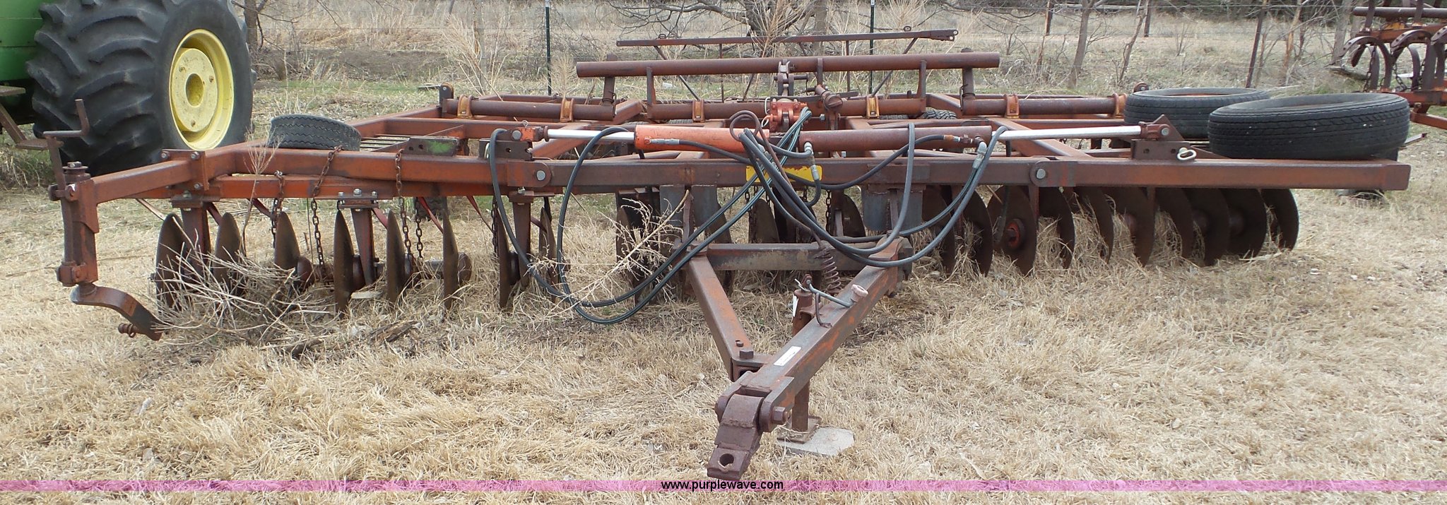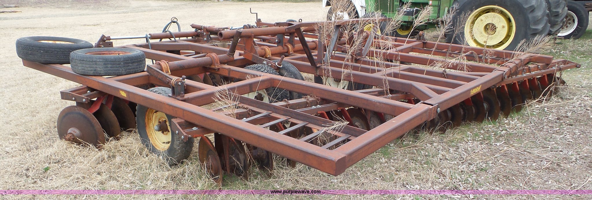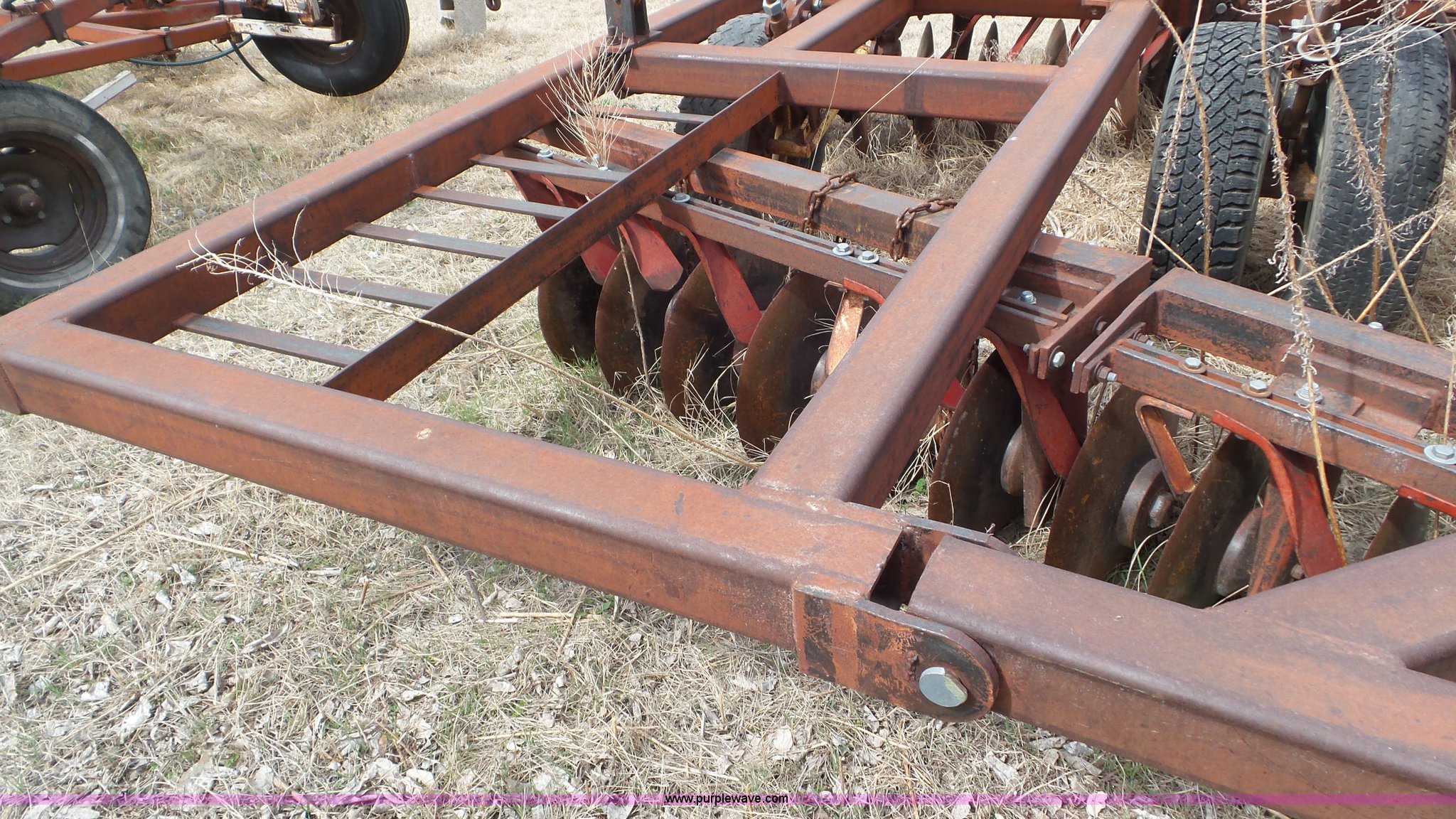 Purple Wave is selling a used Disk in Kansas. This item is a Sunflower disk with the following: 20'W, 21" diameter front disks, 18" diameter rear disks, Disk cleaners, Hydraulic fold, Pin hitch, 15" tires