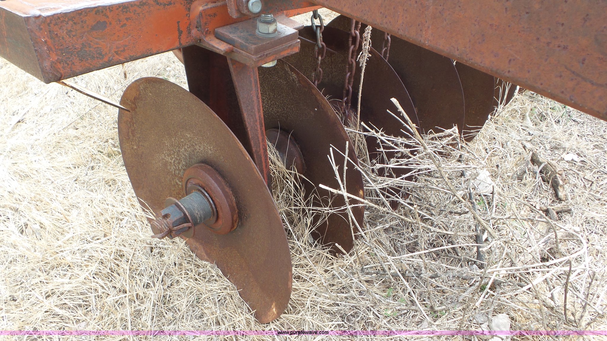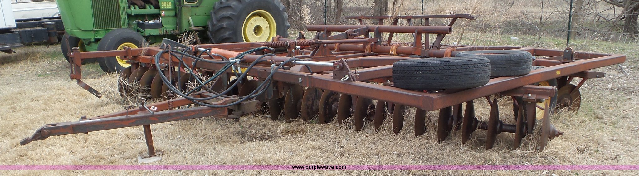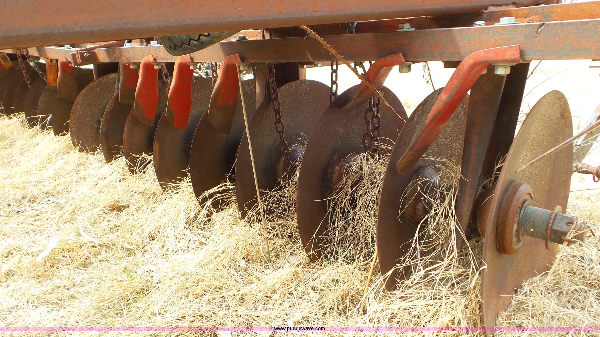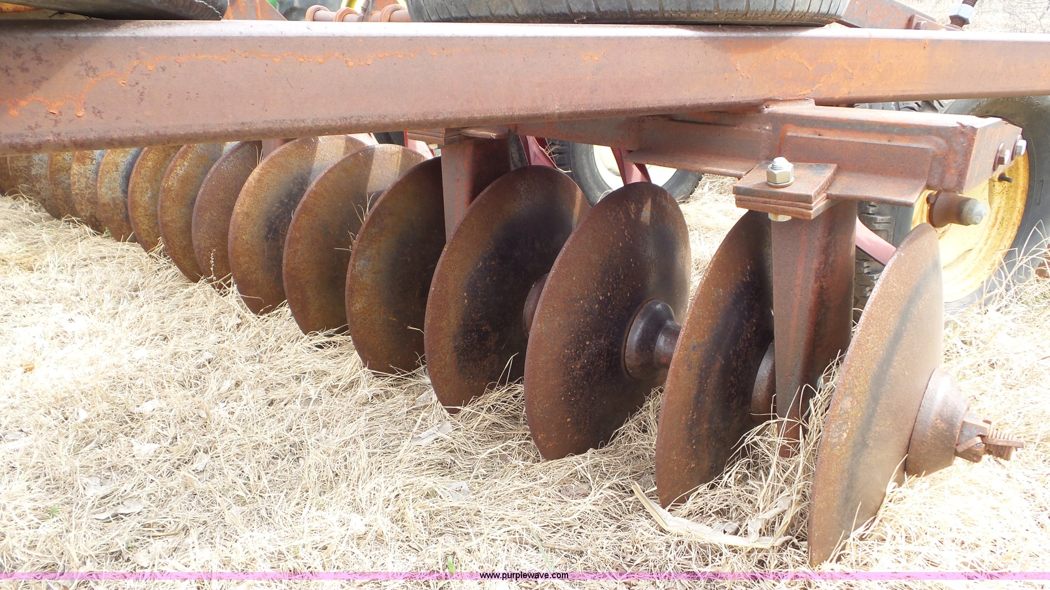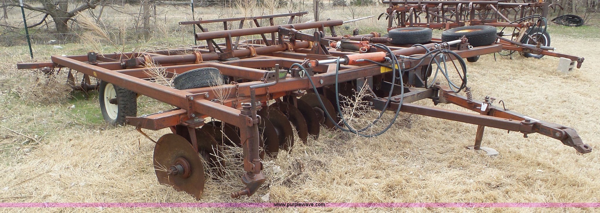 Purple Wave is selling a used Disk in Kansas. This item is a Sunflower disk with the following: 20'W, 21" diameter front disks, 18" diameter rear disks, Disk cleaners, Hydraulic fold, Pin hitch, 15" tires
