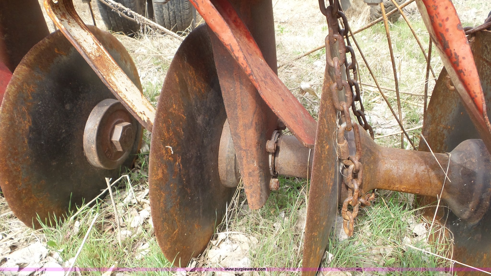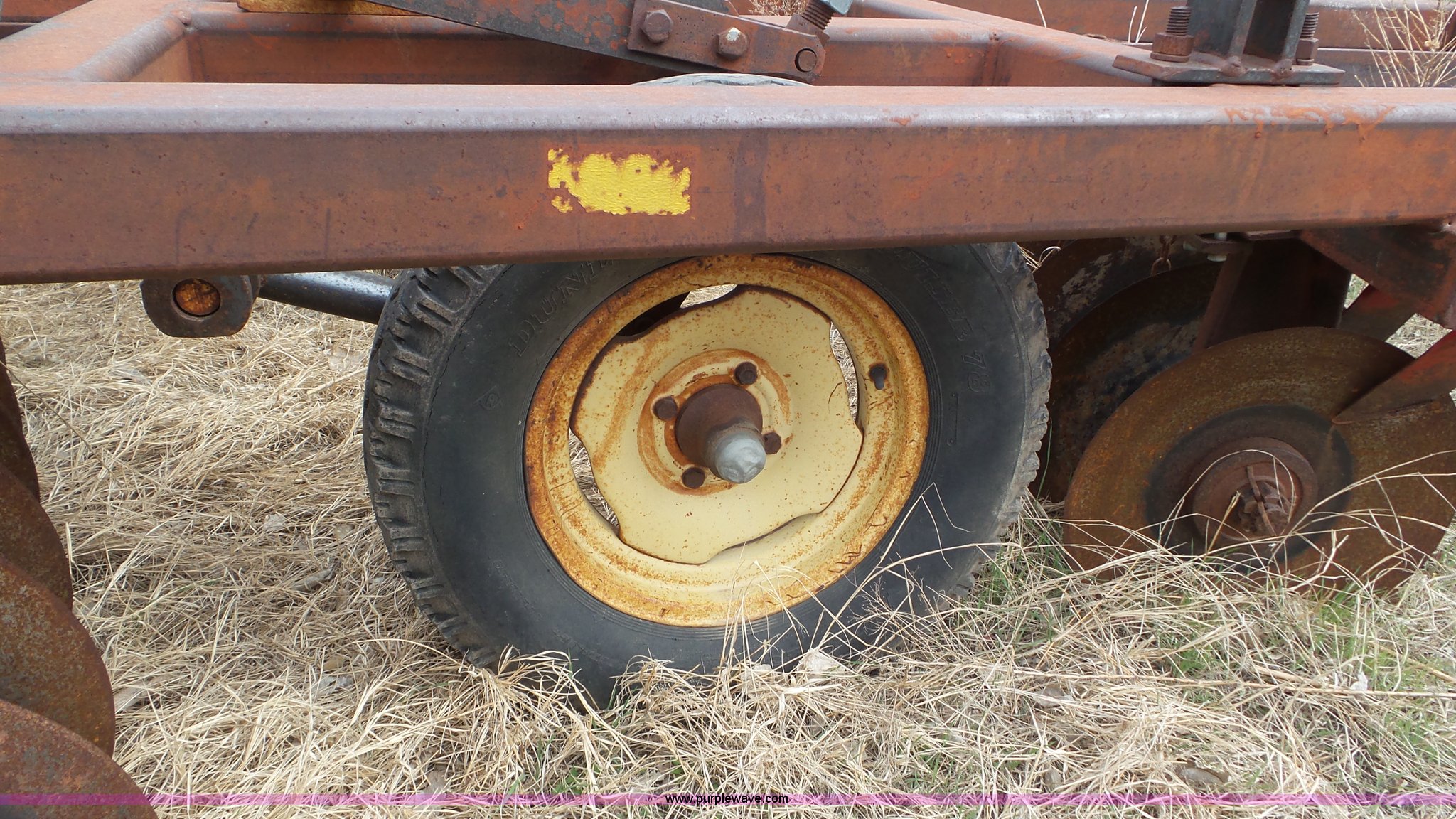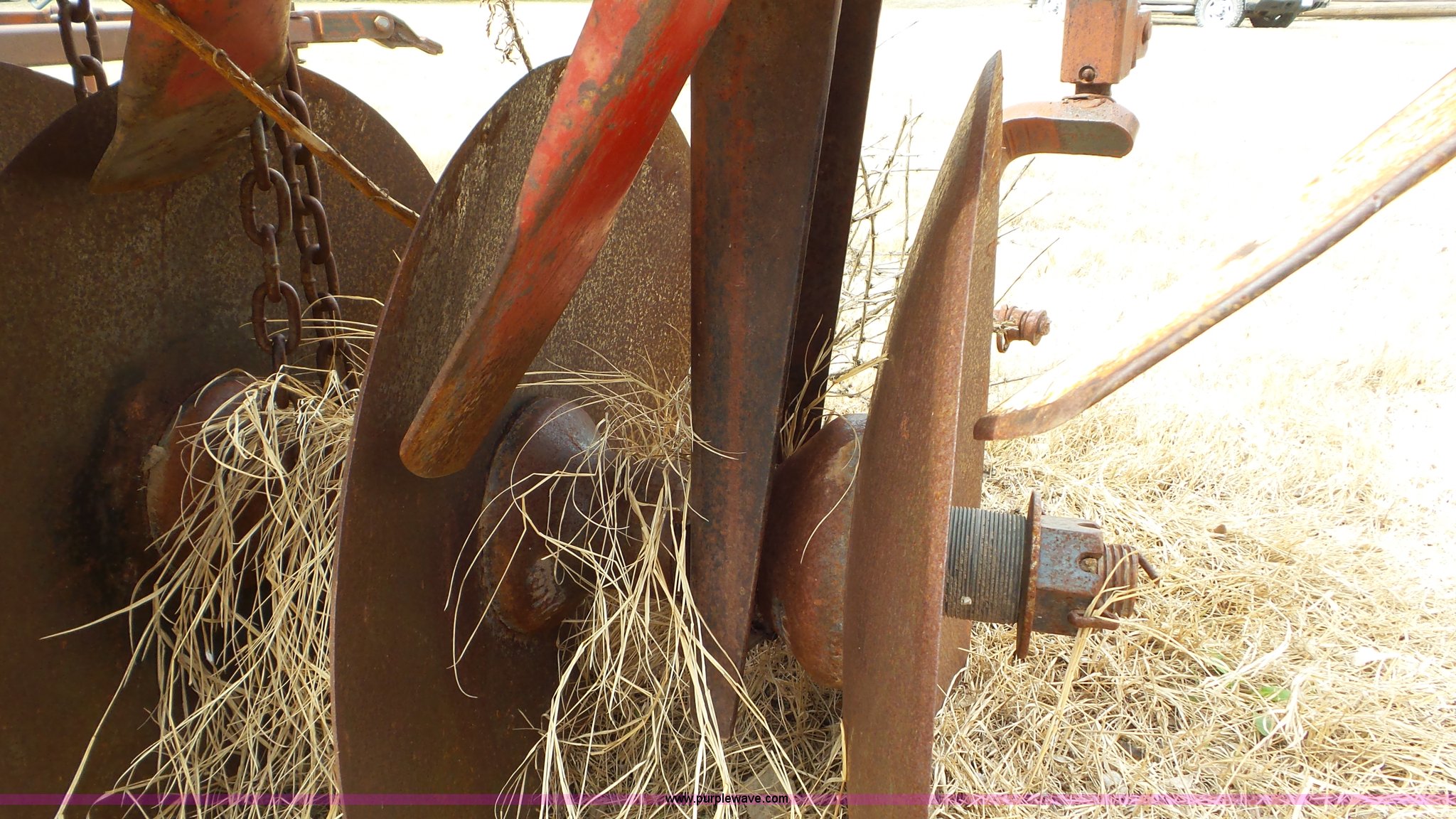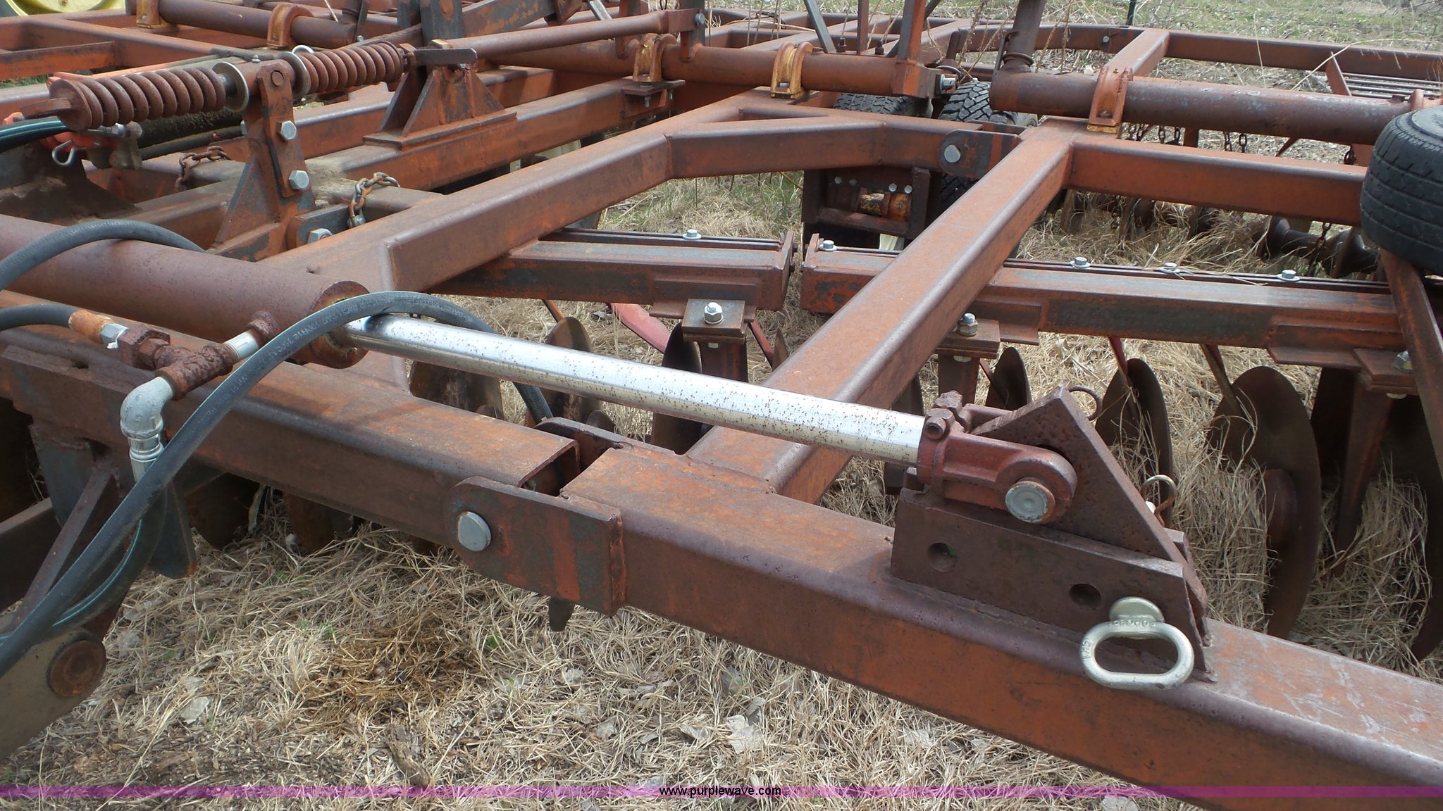 Purple Wave is selling a used Disk in Kansas. This item is a Sunflower disk with the following: 20'W, 21" diameter front disks, 18" diameter rear disks, Disk cleaners, Hydraulic fold, Pin hitch, 15" tires