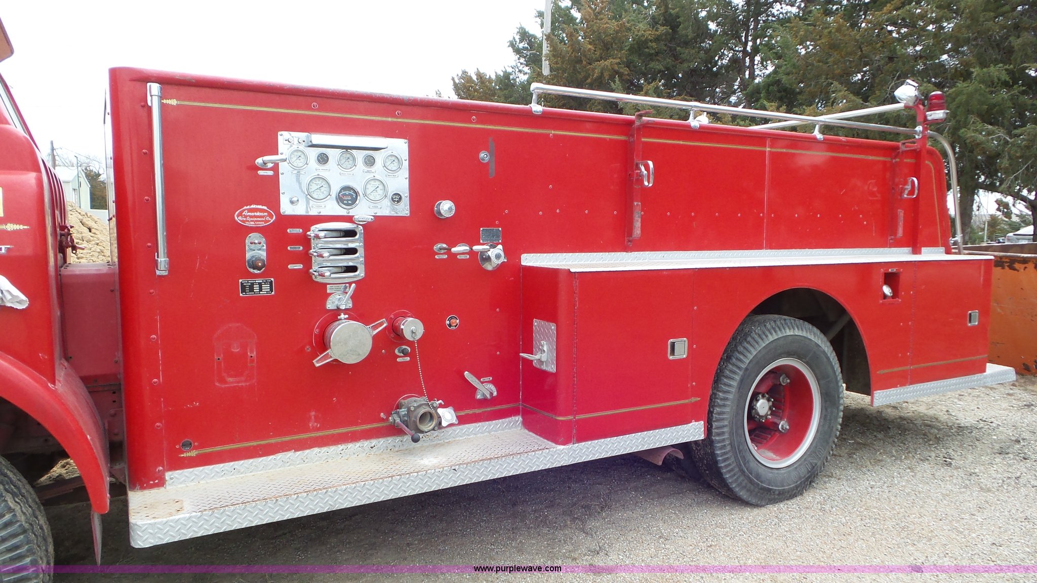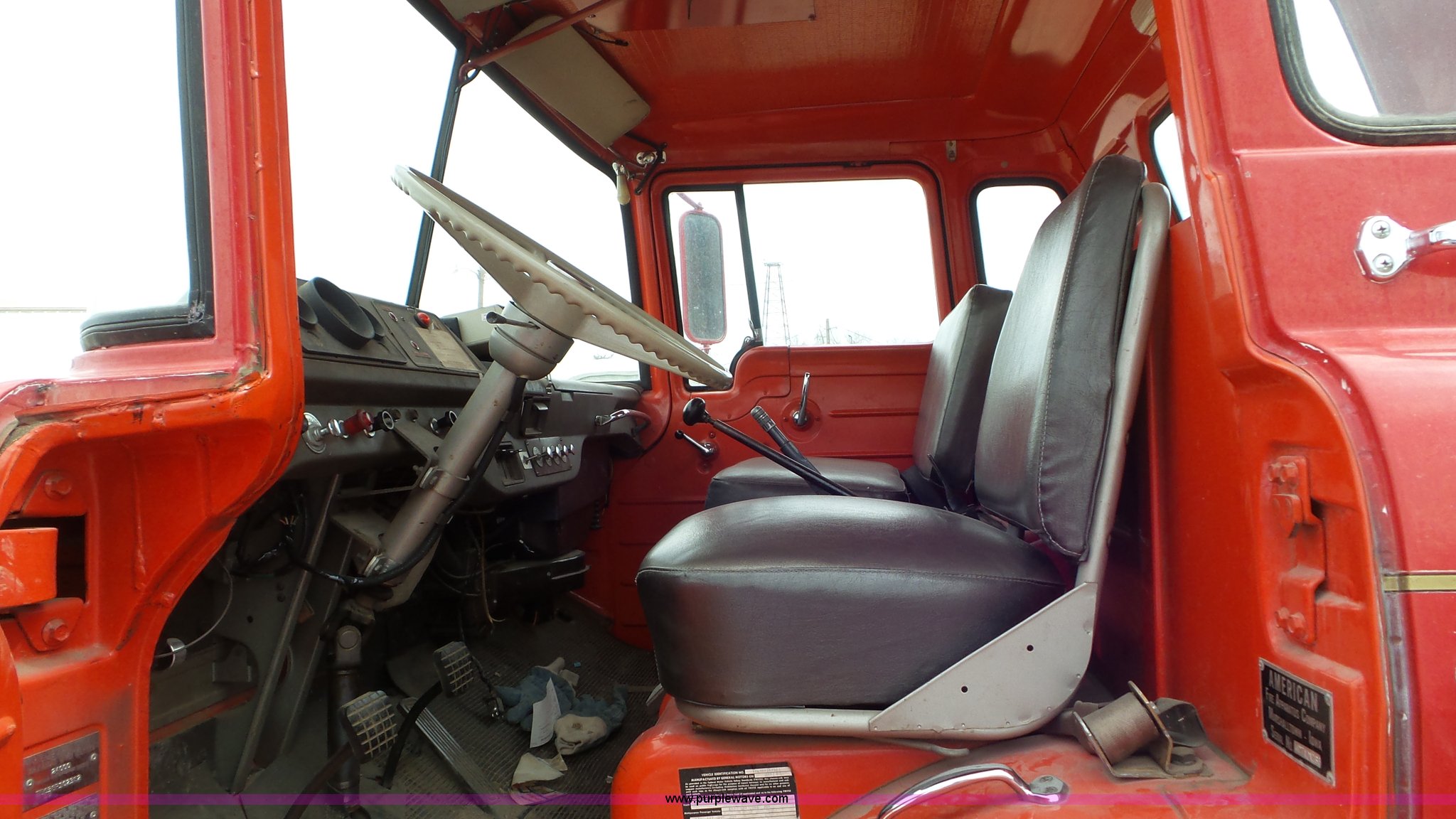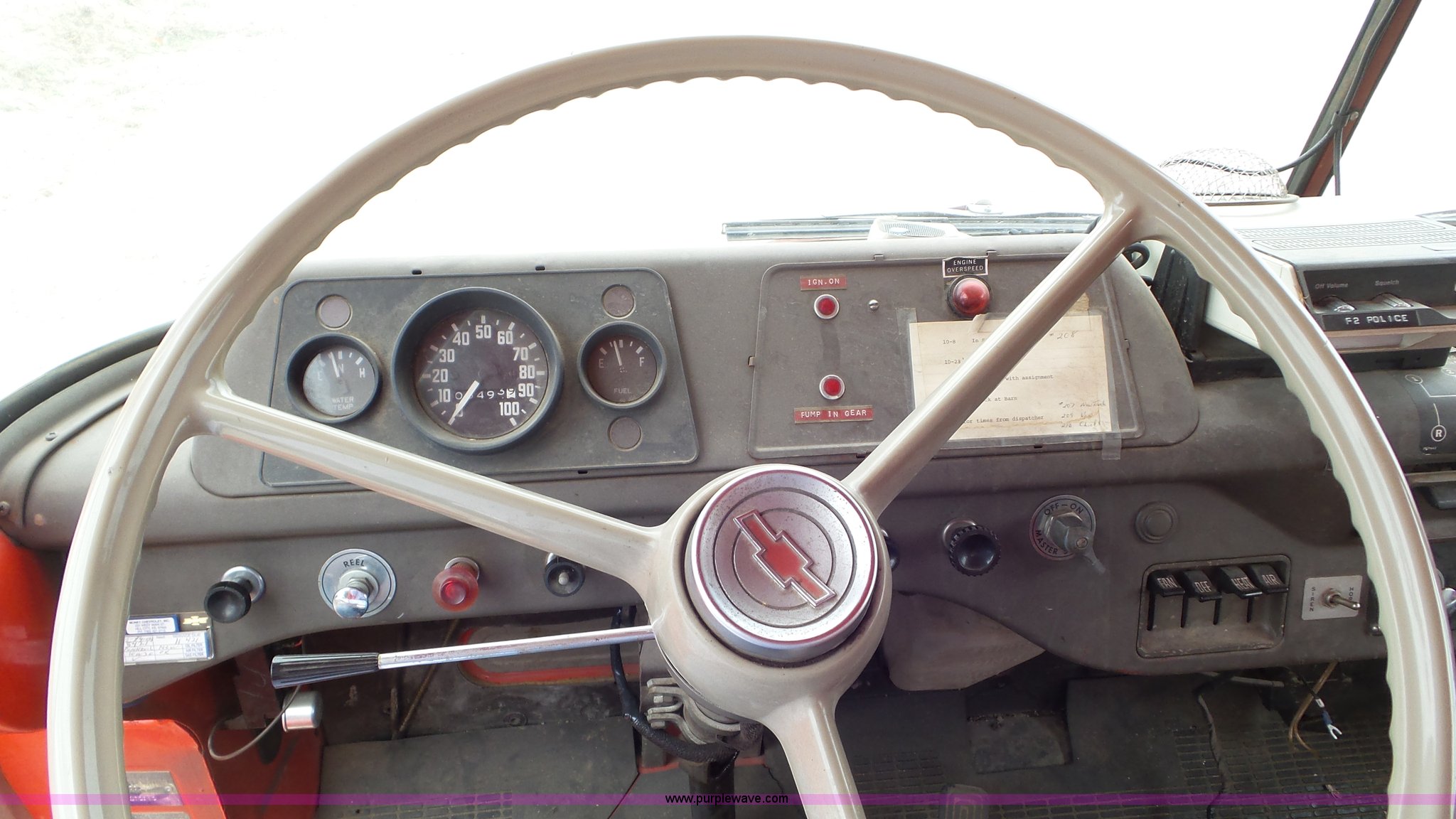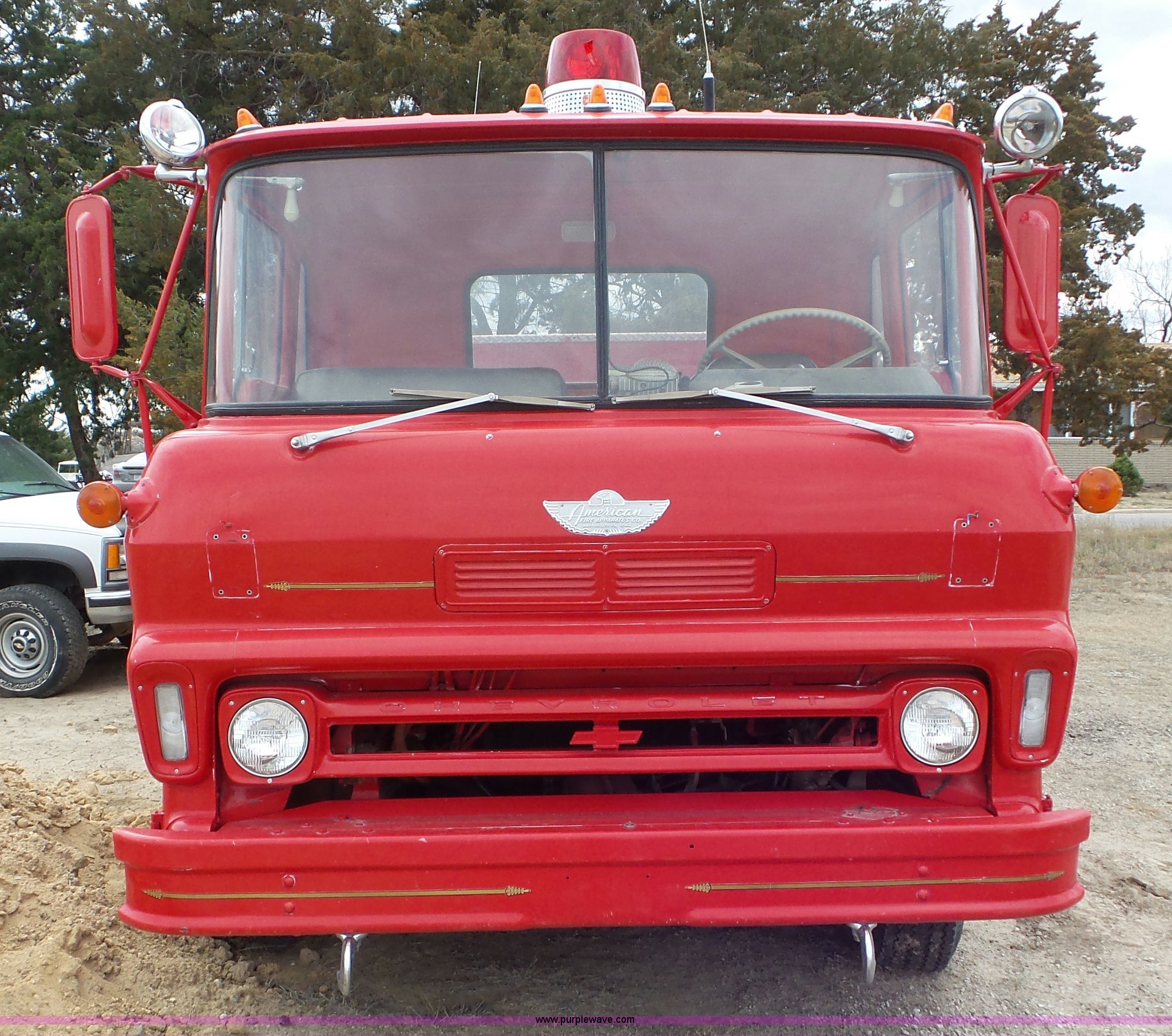 Purple Wave is selling a used Fire Truck or Emergency Vehicle in Kansas. This item is a 1968 Chevrolet fire truck with the following: 8,493 miles on odometer, 366 C.I.D. eight cylinder gas engine, Five speed manual transmission, Single axle, Heat, Suspension seat, 750 gpm pump, Hose, PTO, 9.00-20 tires, Needs brakes and battery