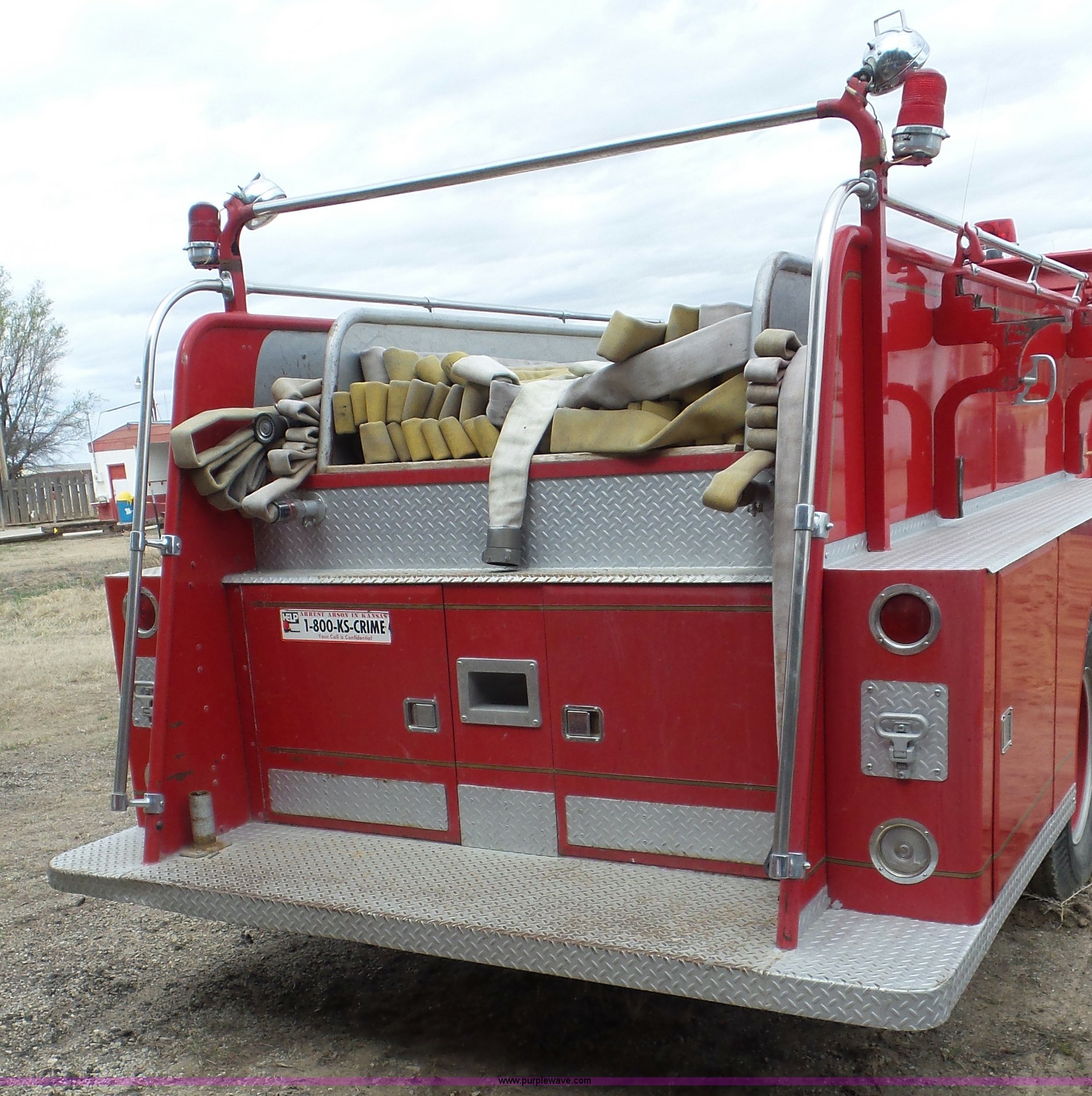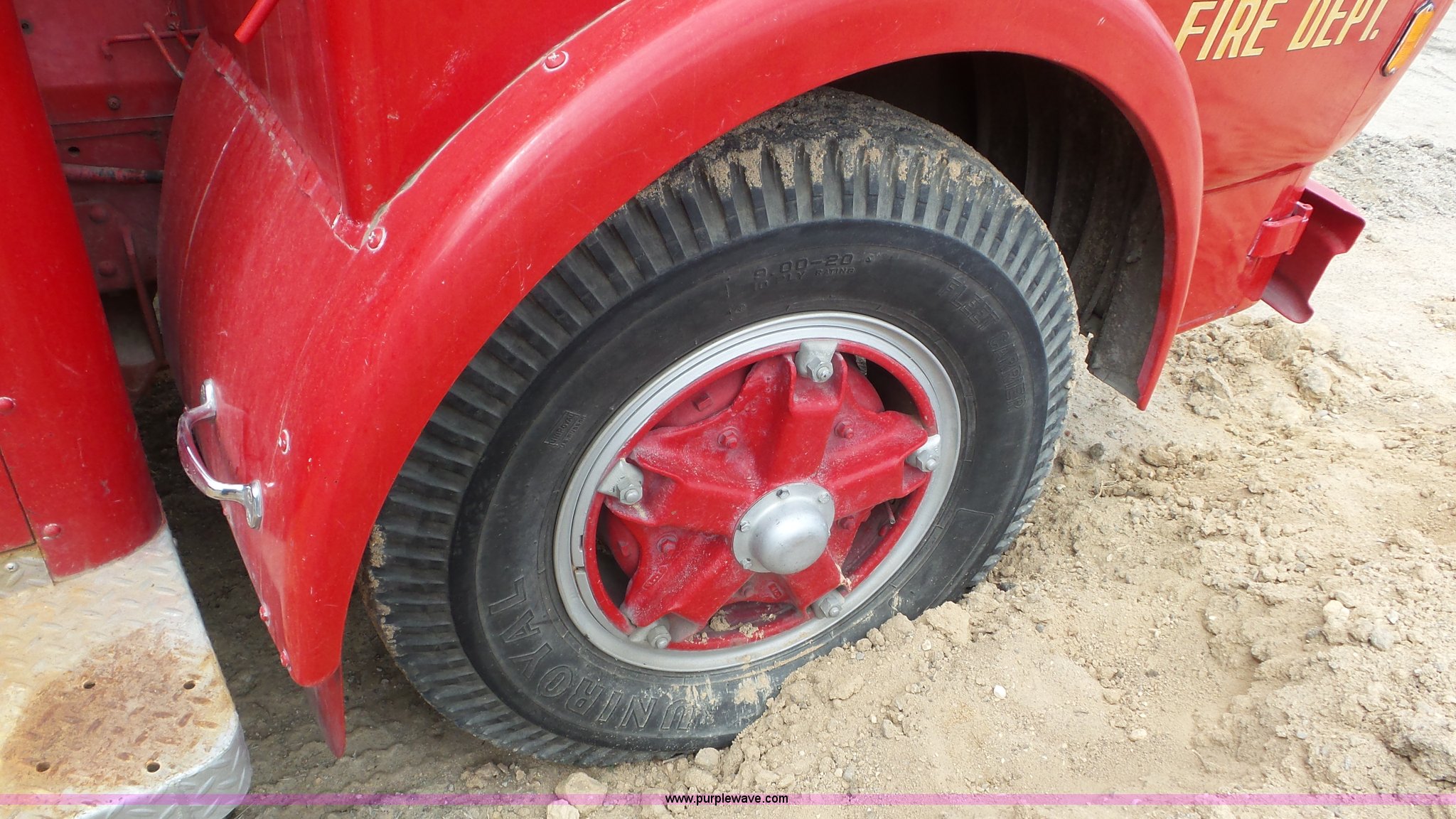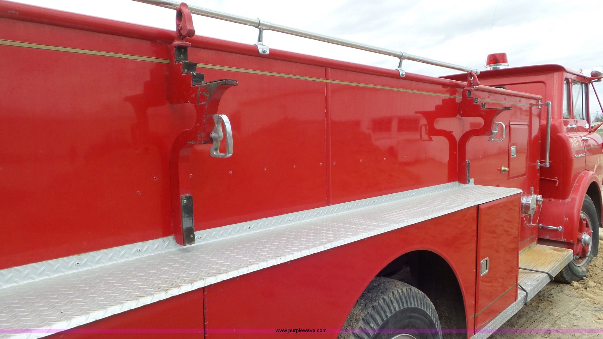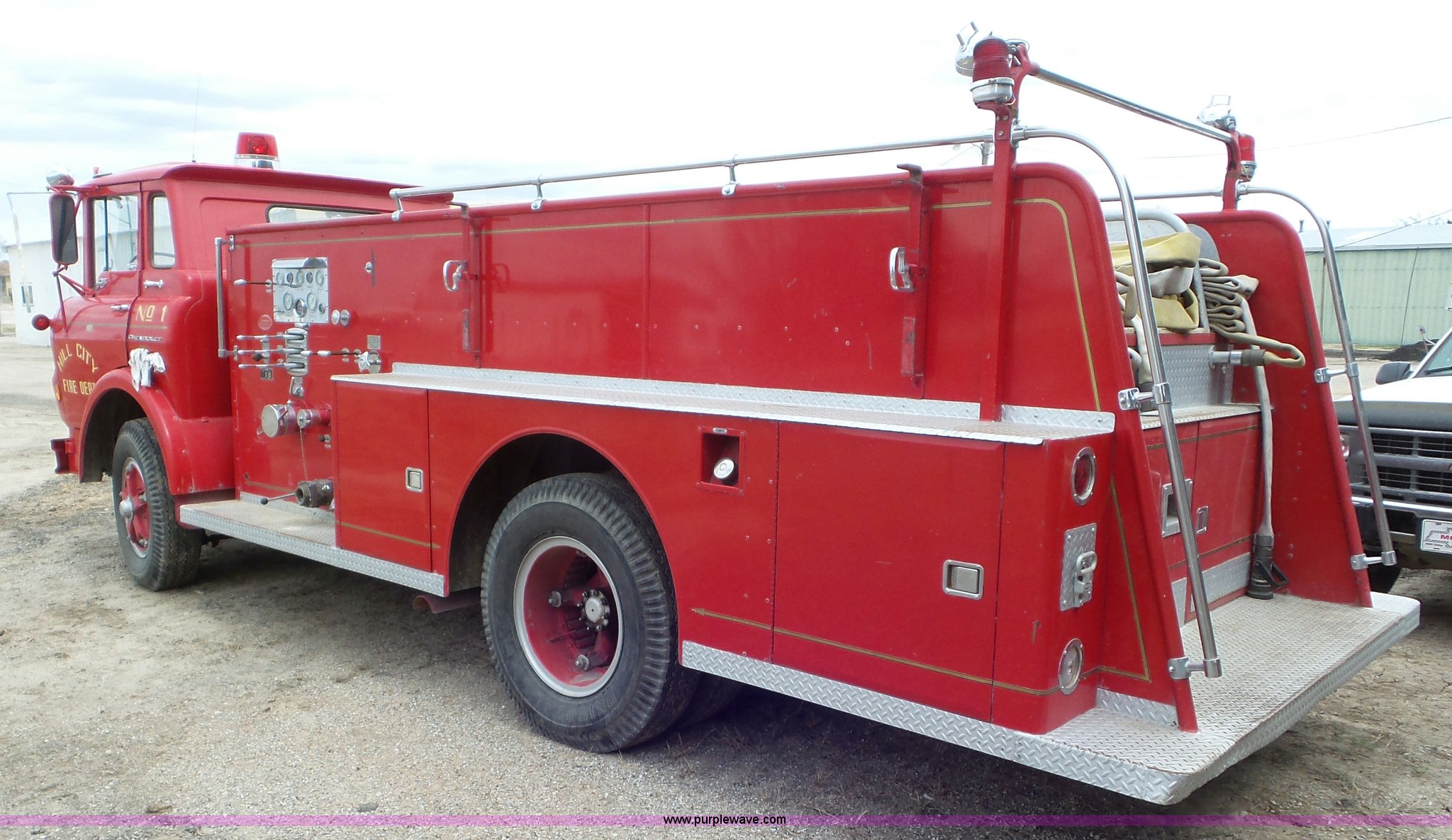 Purple Wave is selling a used Fire Truck or Emergency Vehicle in Kansas. This item is a 1968 Chevrolet fire truck with the following: 8,493 miles on odometer, 366 C.I.D. eight cylinder gas engine, Five speed manual transmission, Single axle, Heat, Suspension seat, 750 gpm pump, Hose, PTO, 9.00-20 tires, Needs brakes and battery
