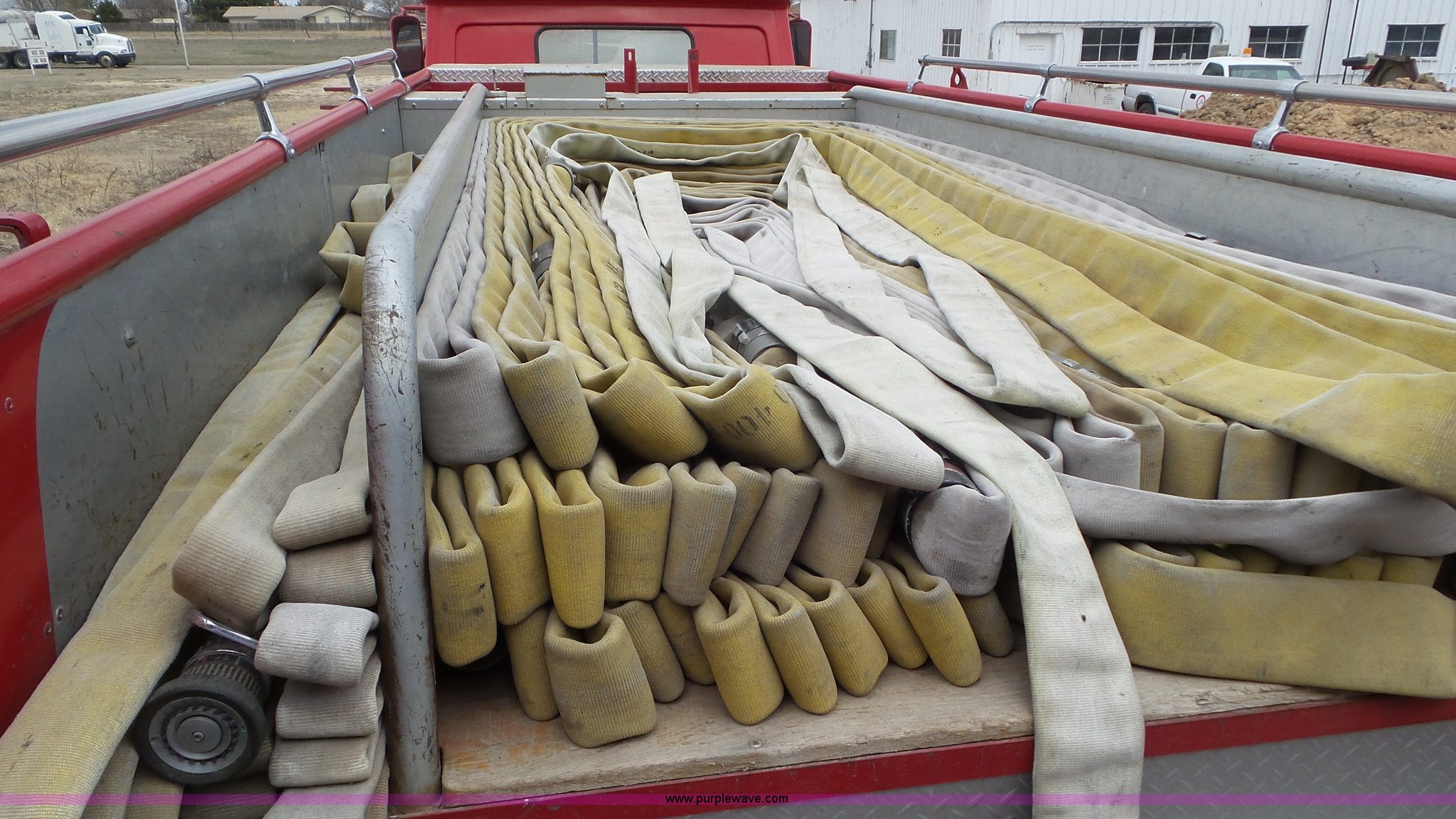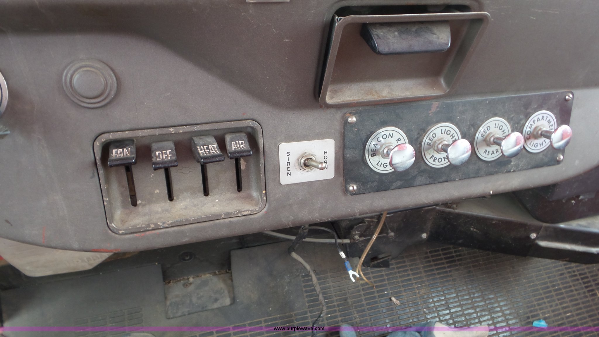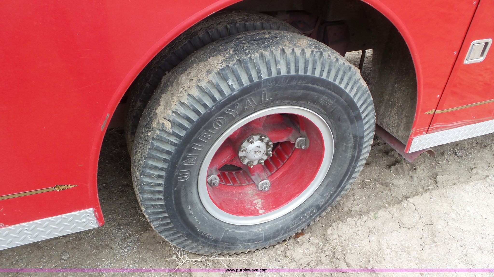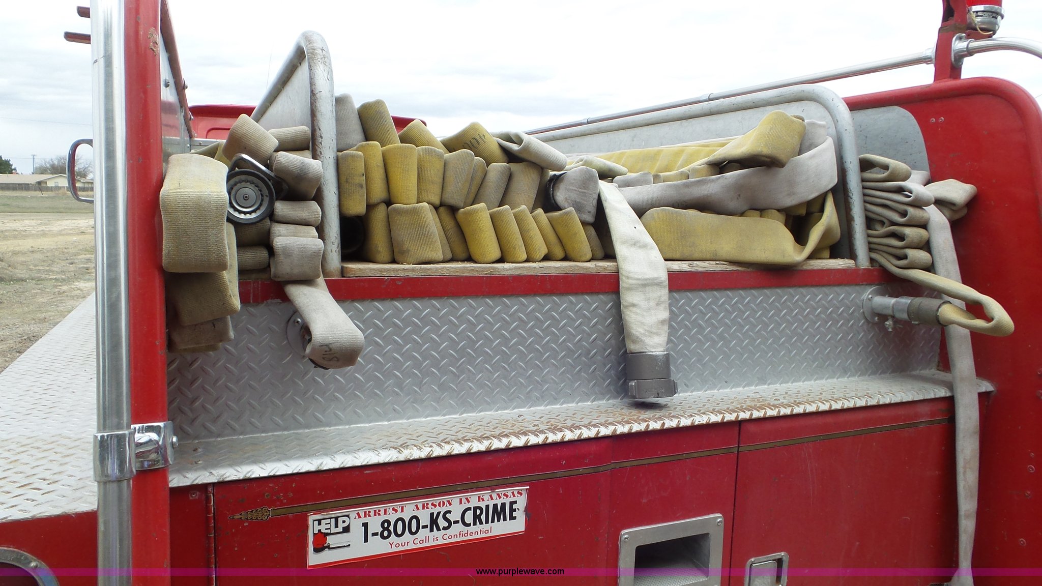 Purple Wave is selling a used Fire Truck or Emergency Vehicle in Kansas. This item is a 1968 Chevrolet fire truck with the following: 8,493 miles on odometer, 366 C.I.D. eight cylinder gas engine, Five speed manual transmission, Single axle, Heat, Suspension seat, 750 gpm pump, Hose, PTO, 9.00-20 tires, Needs brakes and battery