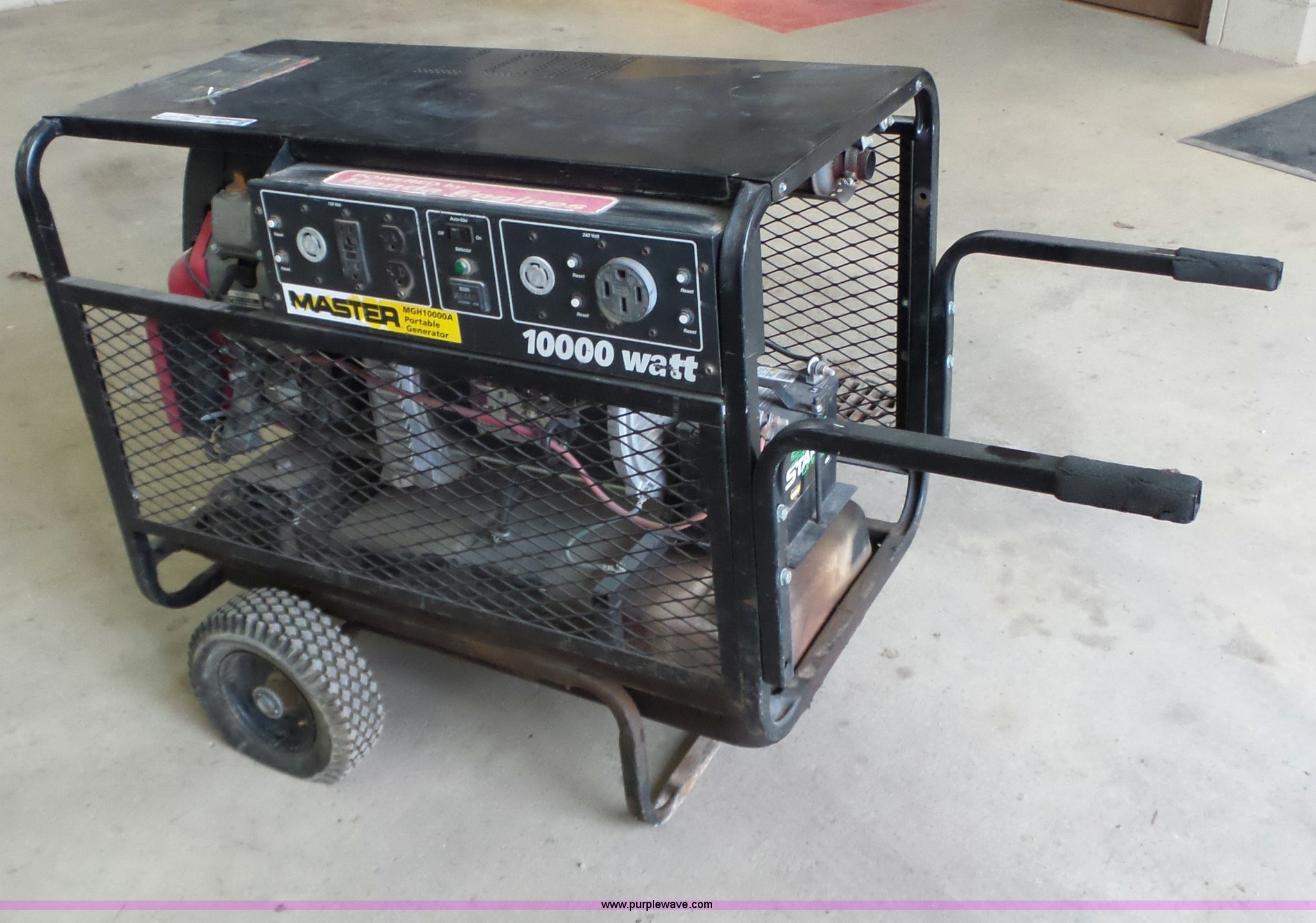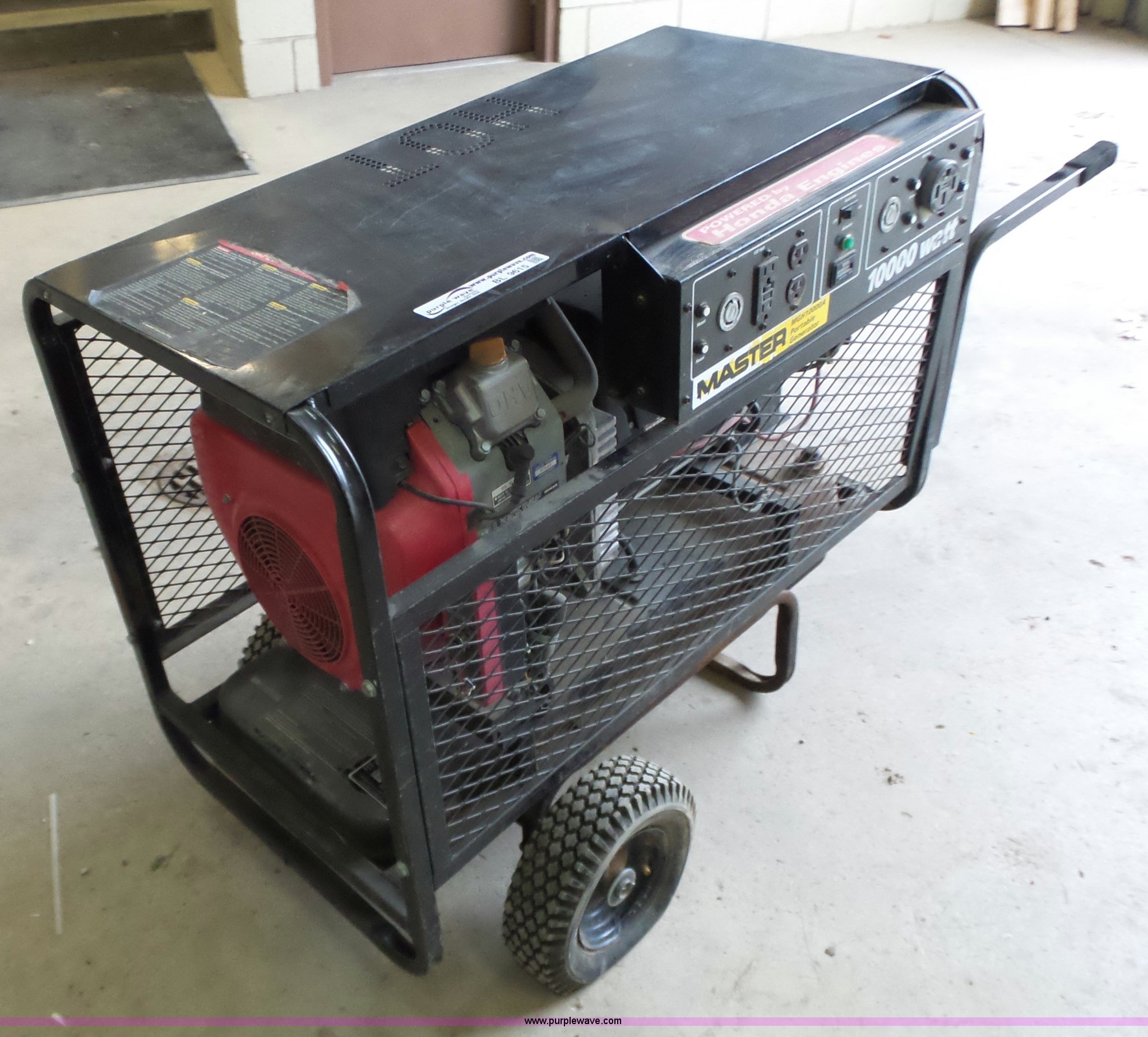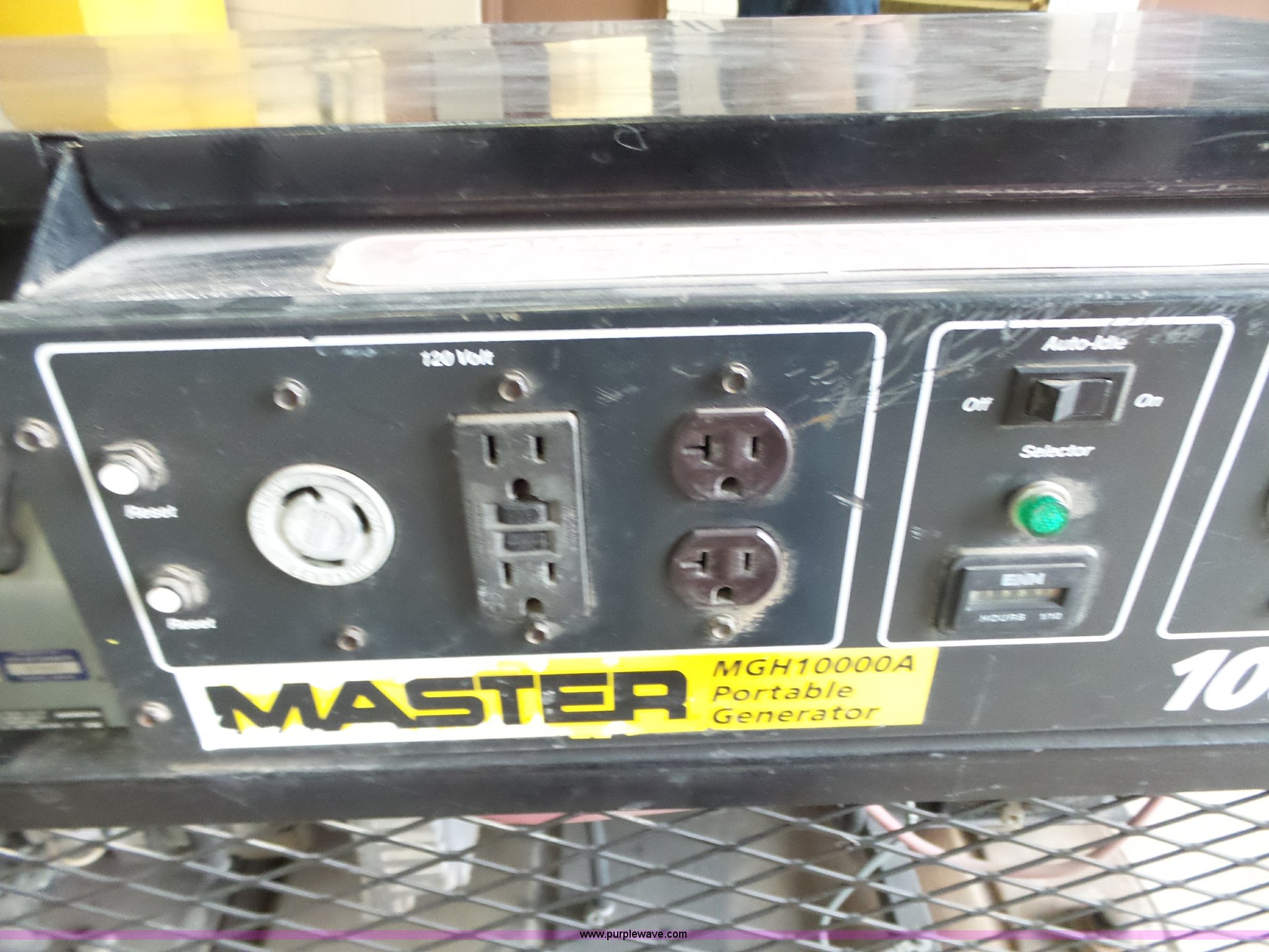 Purple Wave is selling a used Generator Set in Kansas. This item is a 1999 Master 10000A generator with the following: 1,689 hours on meter, Honda two cylinder gas engine, 20 HP, Single phase, 10,000 watt, Fuel tank, Low voltage issues, Carburetor needs serviced