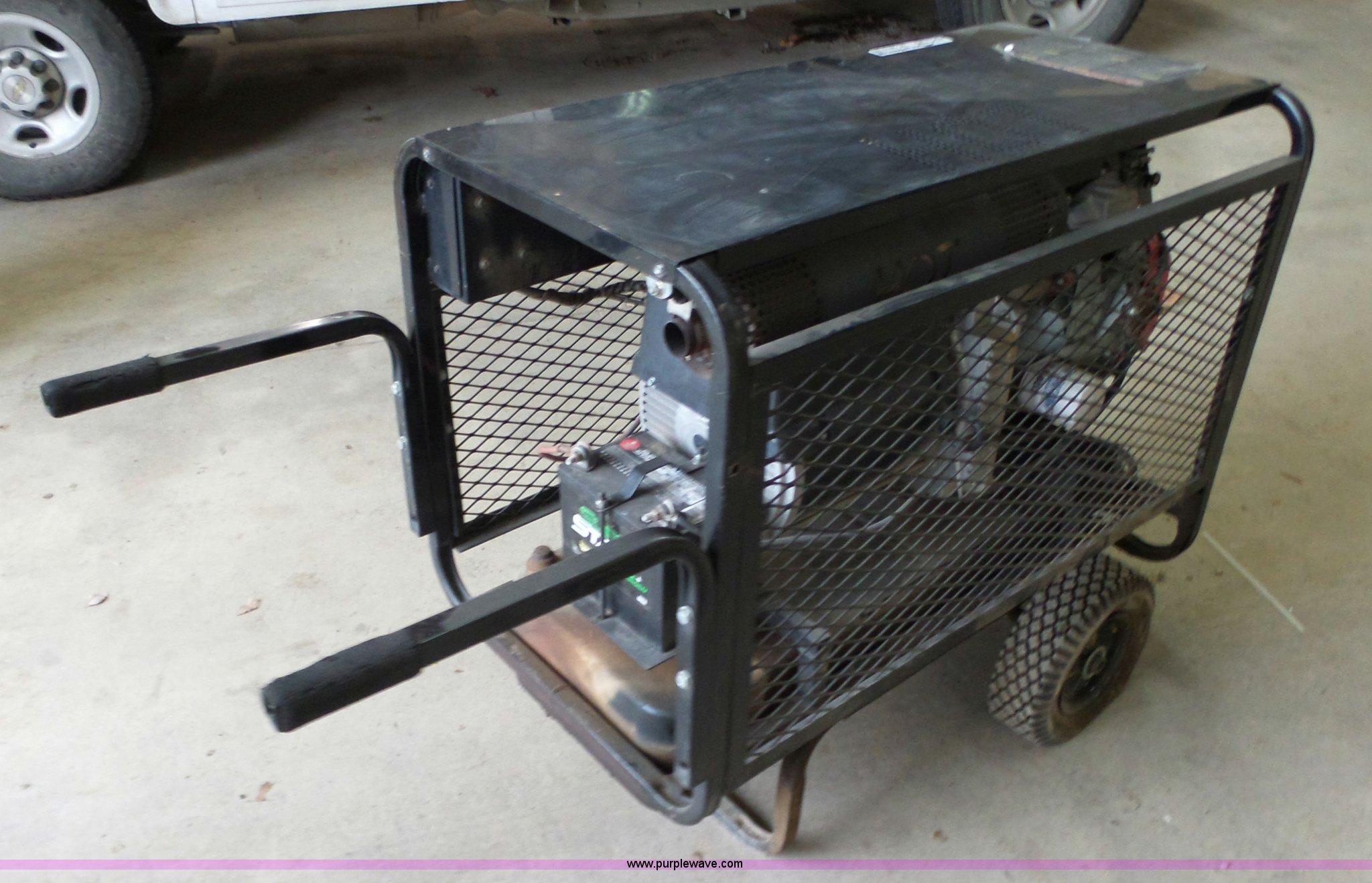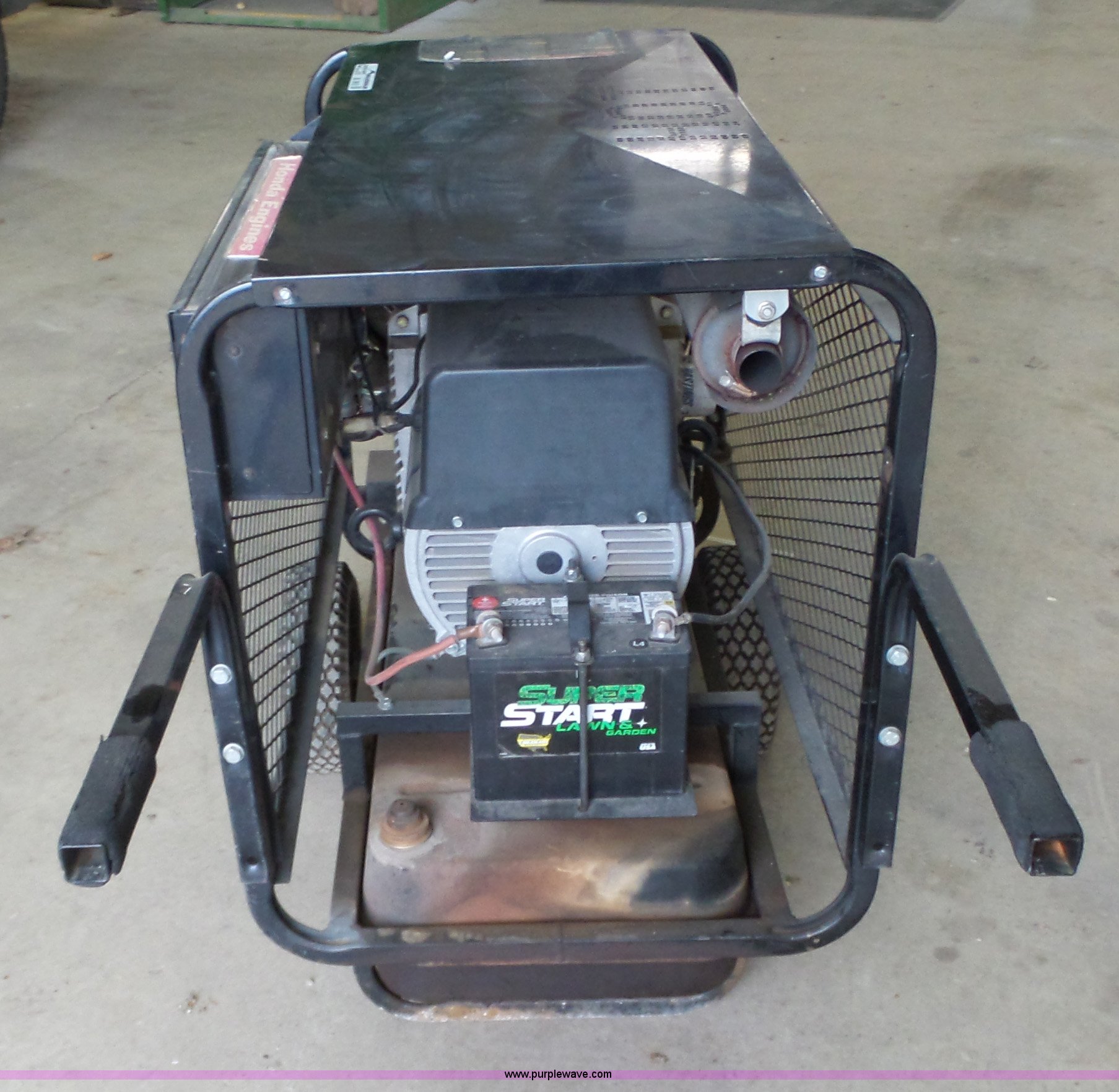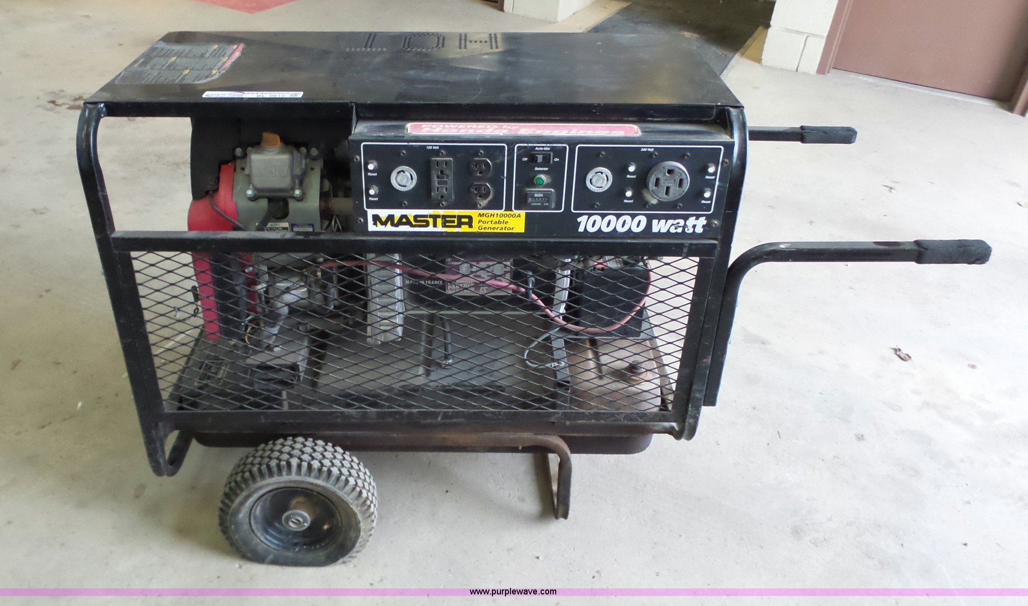 Purple Wave is selling a used Generator Set in Kansas. This item is a 1999 Master 10000A generator with the following: 1,689 hours on meter, Honda two cylinder gas engine, 20 HP, Single phase, 10,000 watt, Fuel tank, Low voltage issues, Carburetor needs serviced