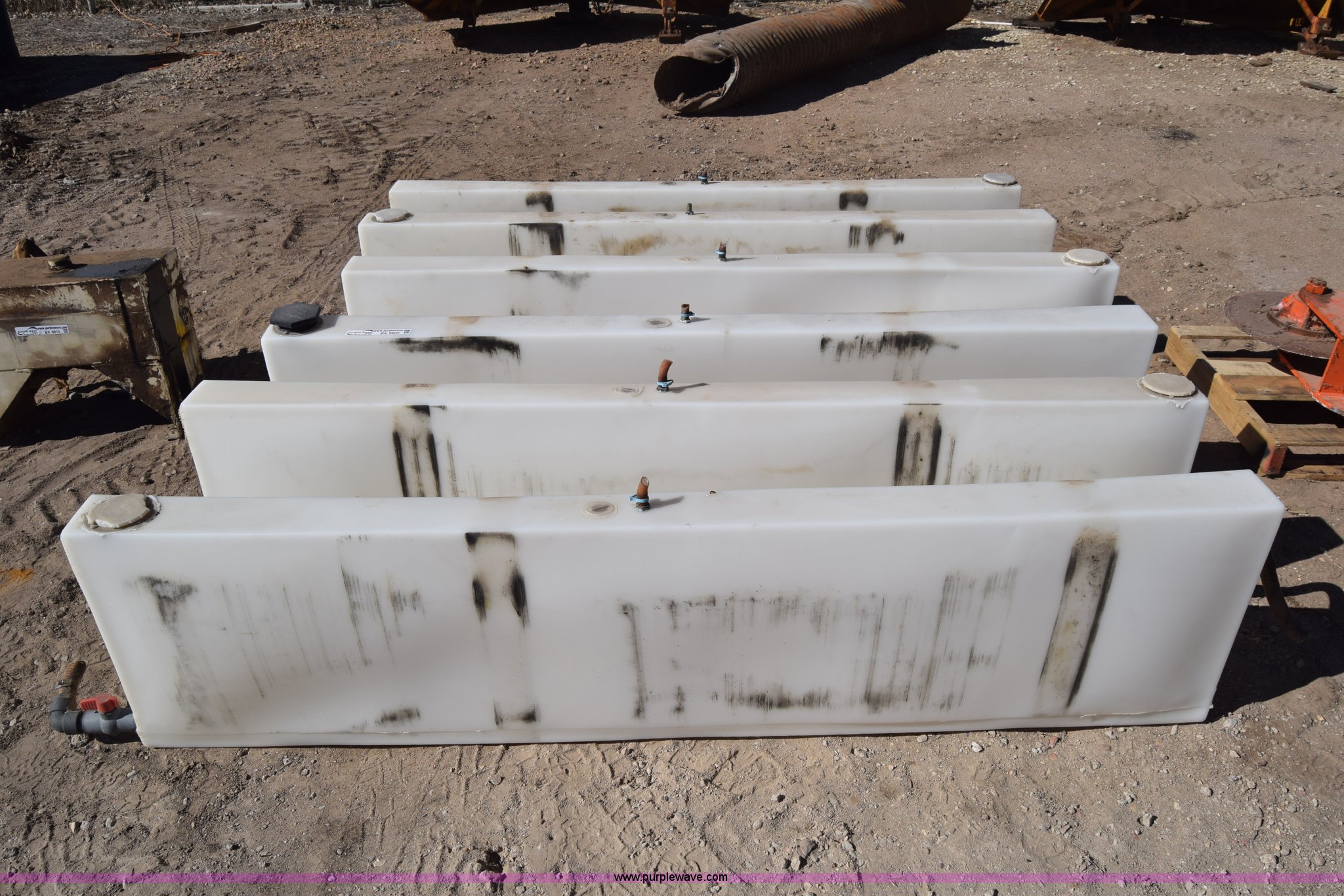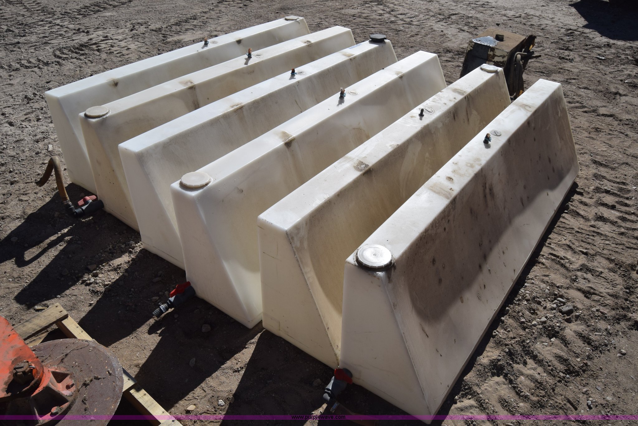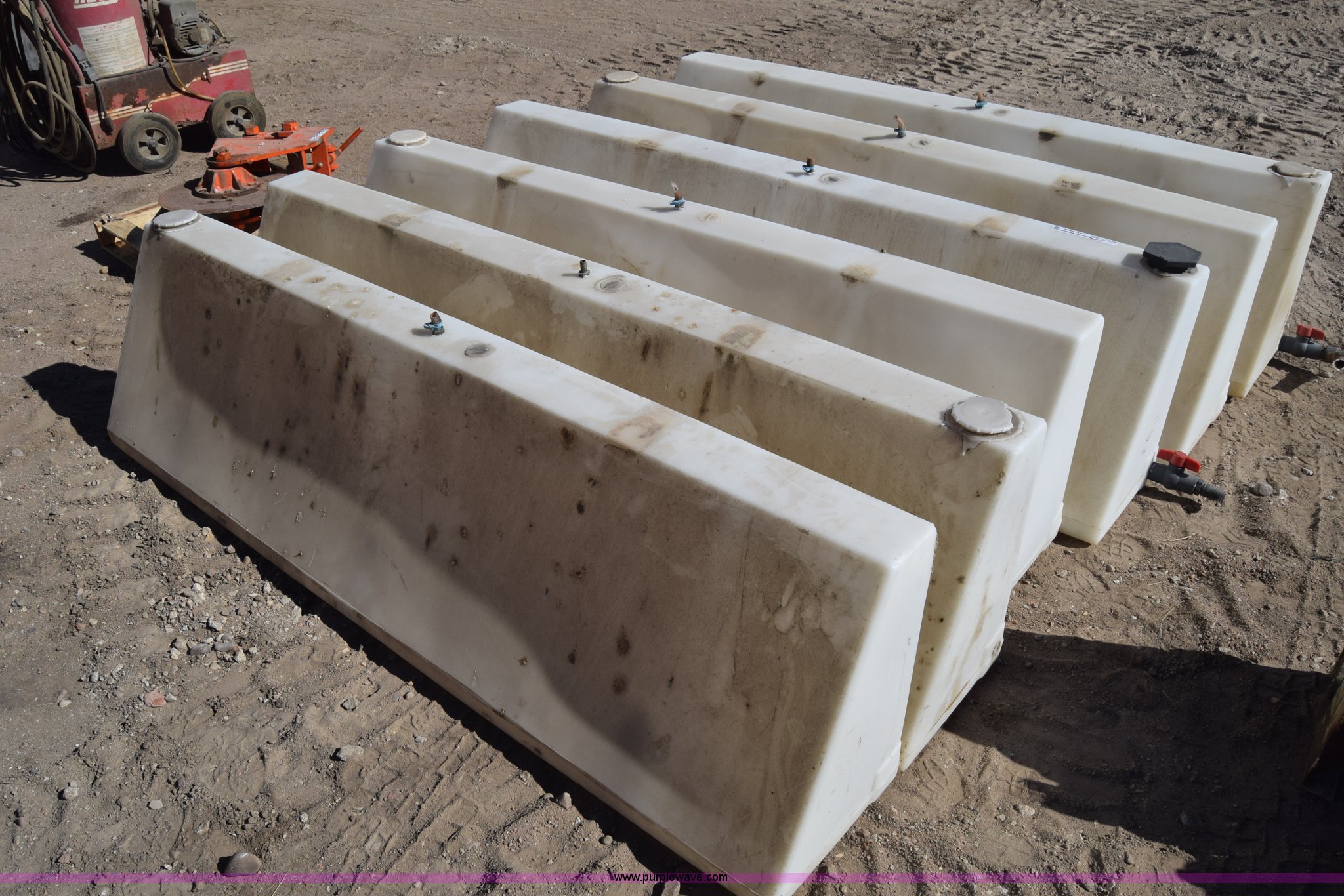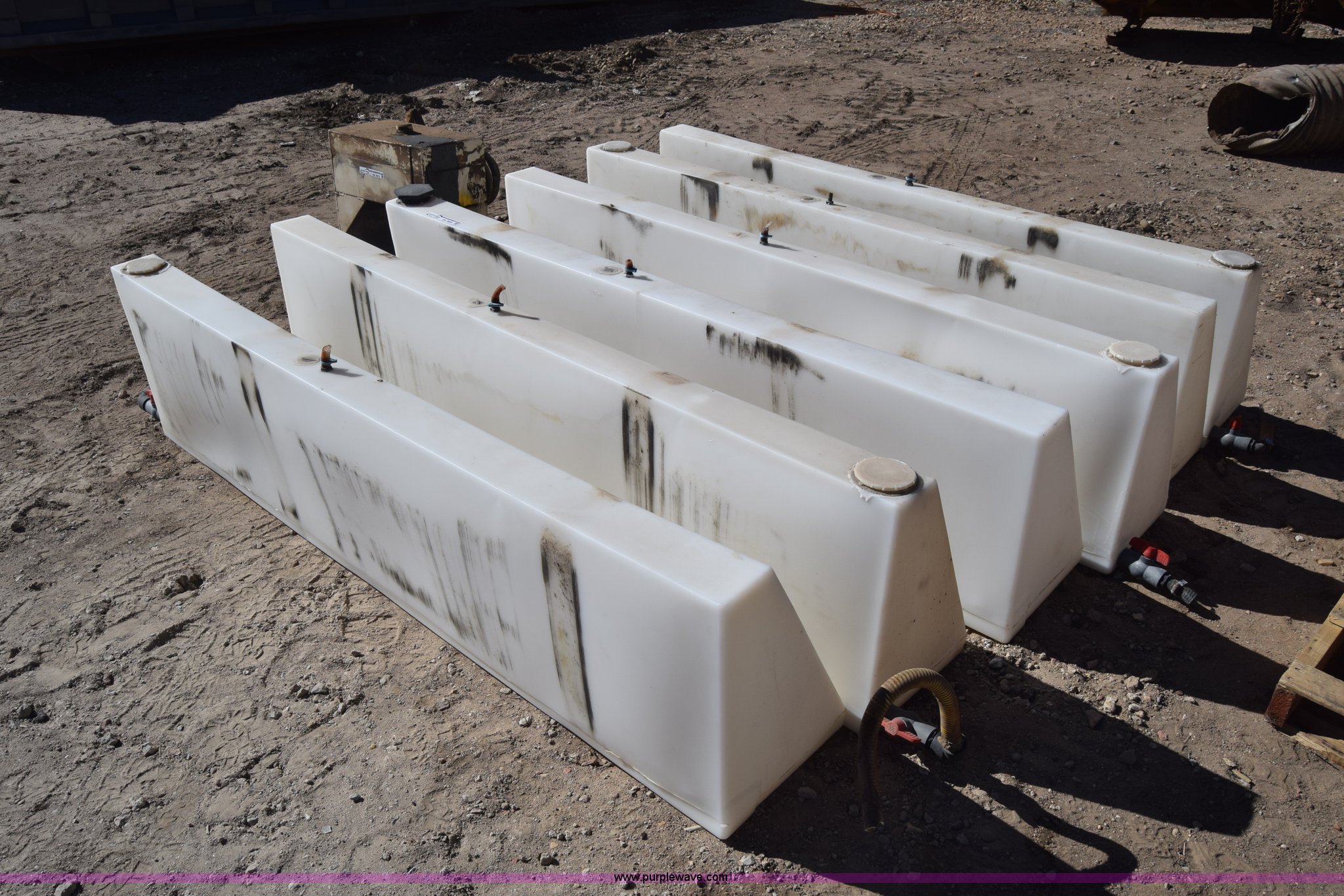 Purple Wave is selling a used Tanks in Kansas. This item is a (6) poly tanks with the following: 80 gallon capacity, 7'L x 16"W x 23"H