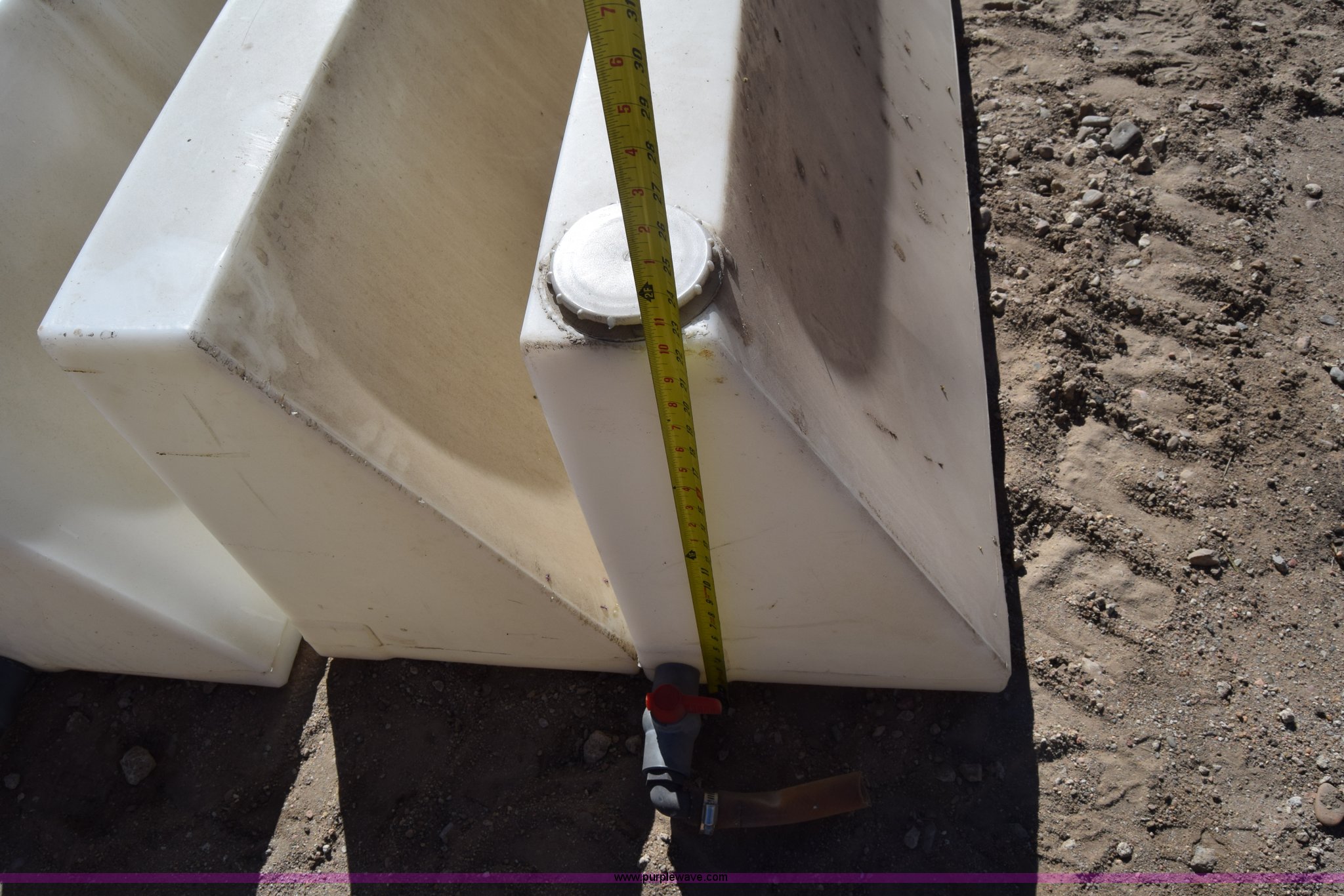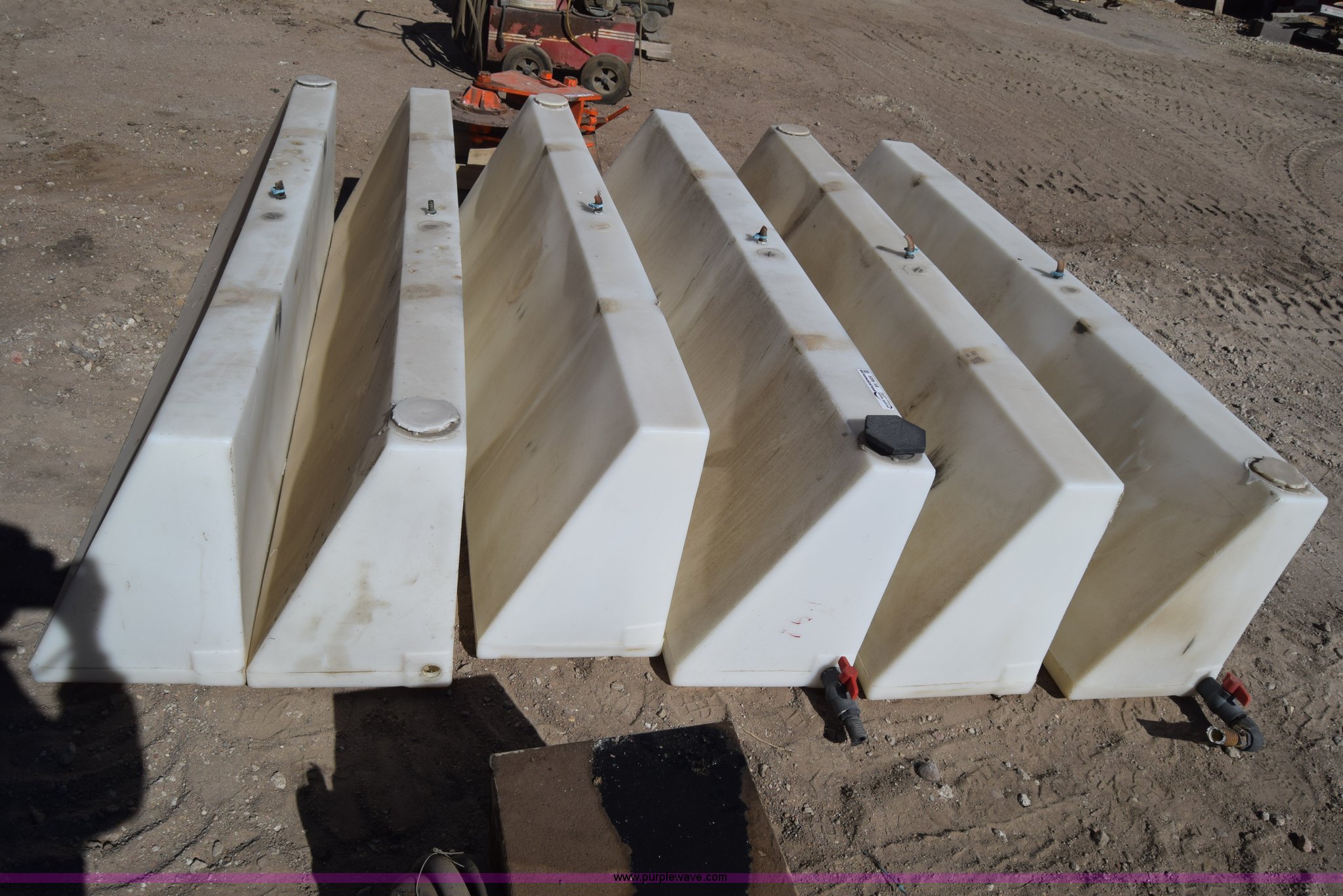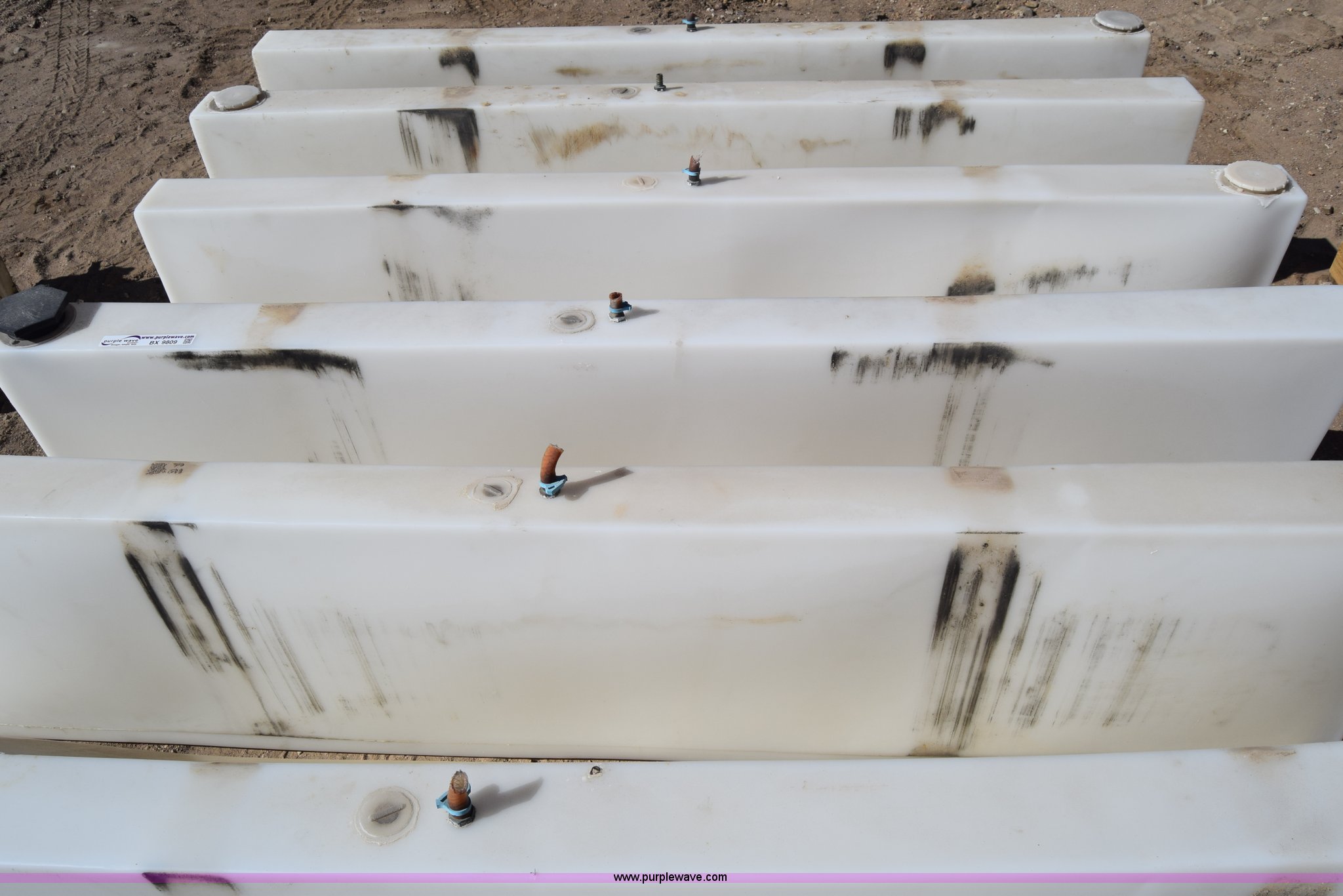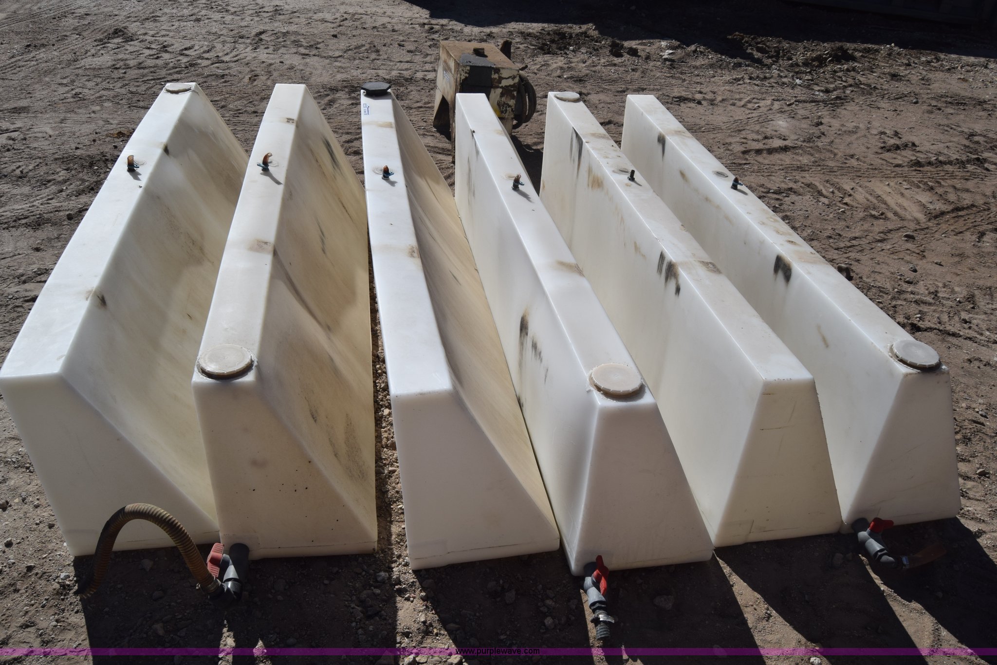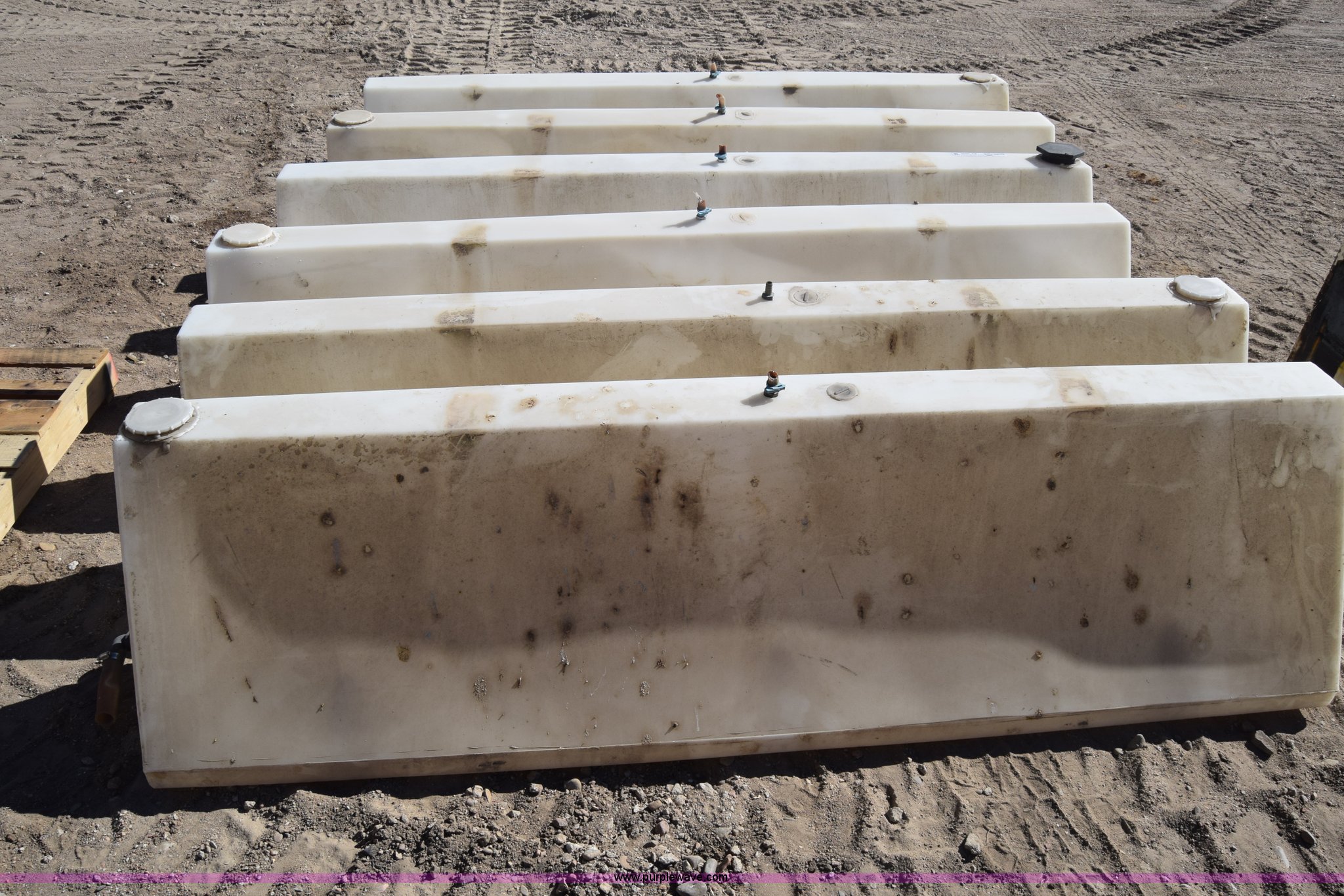 Purple Wave is selling a used Tanks in Kansas. This item is a (6) poly tanks with the following: 80 gallon capacity, 7'L x 16"W x 23"H