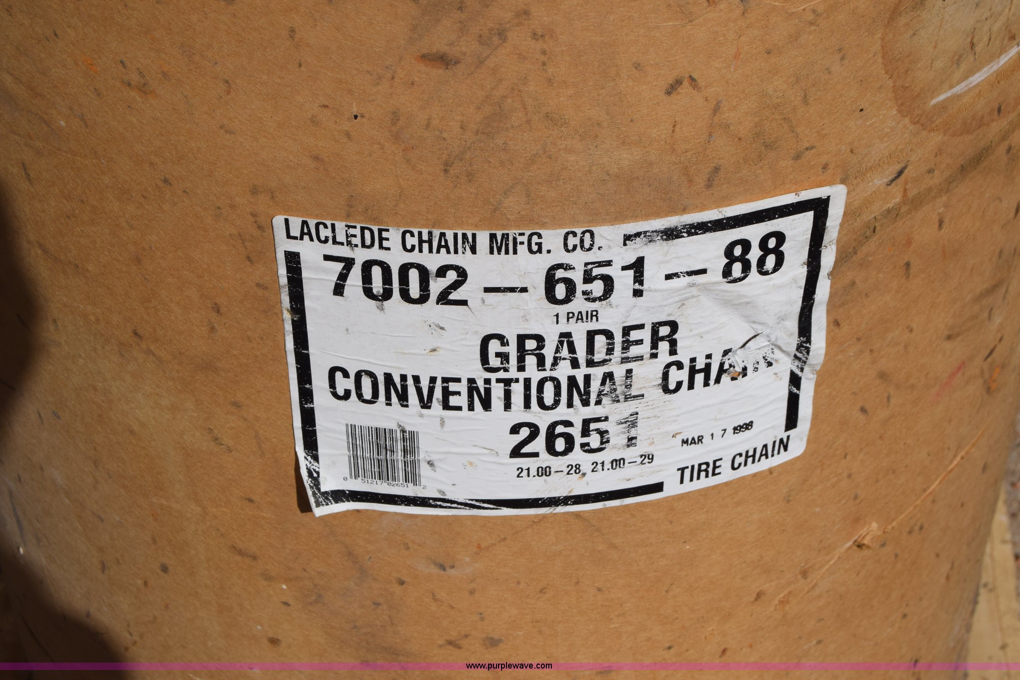 Purple Wave is selling a used Industrial Tires or Tracks in Kansas. This item is a Laclede grader tire chains with the following: 21.00-28, 21.00-29