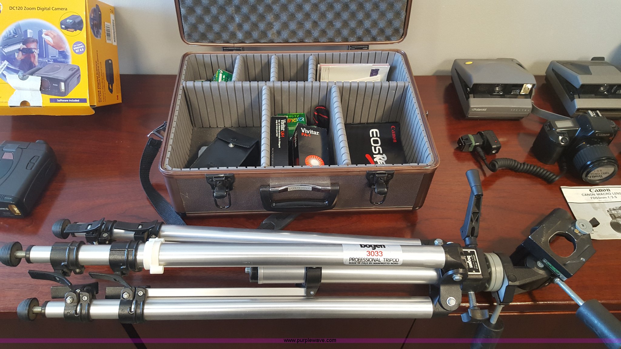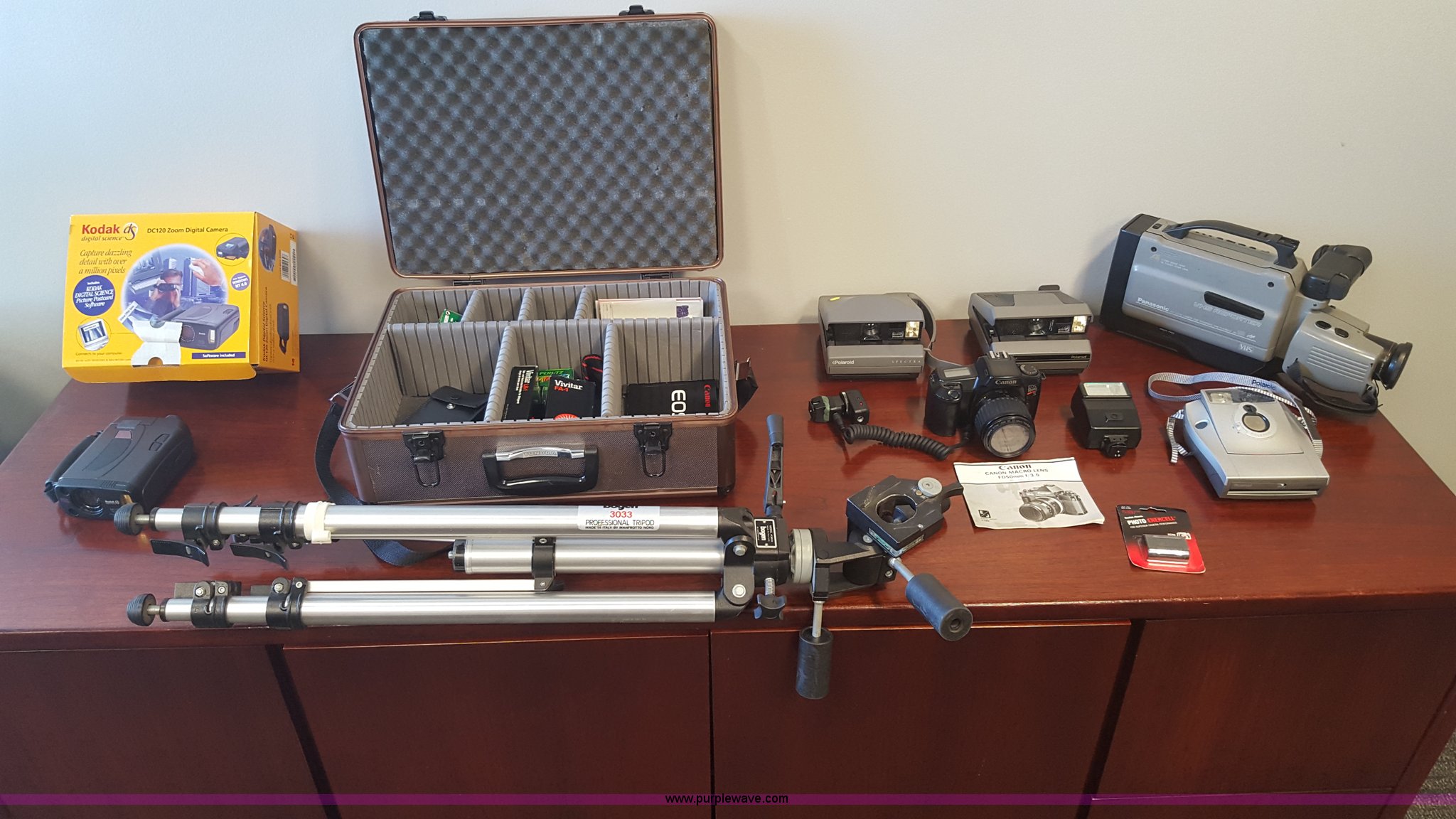 Purple Wave is selling a used Electronics in Kansas. This item is a Assorted electronics with the following: (3) Polaroid cameras, Canon ES Rebel 35mm camera, Panasonic VHS camcorder, Tundra camera case, Kodak DC120 zoom camera, 8mm camcorder, (5) 35mm cameras, SuperSonic television with radio, Glue gun, Batteries and chargers