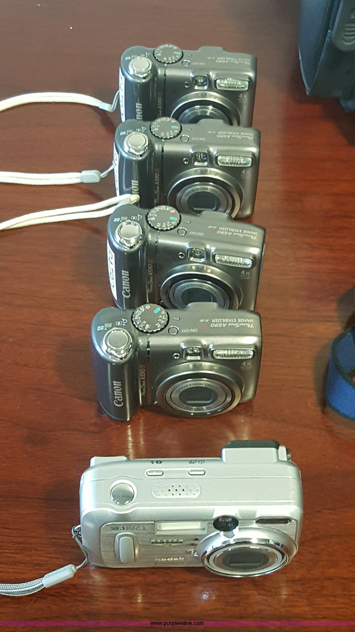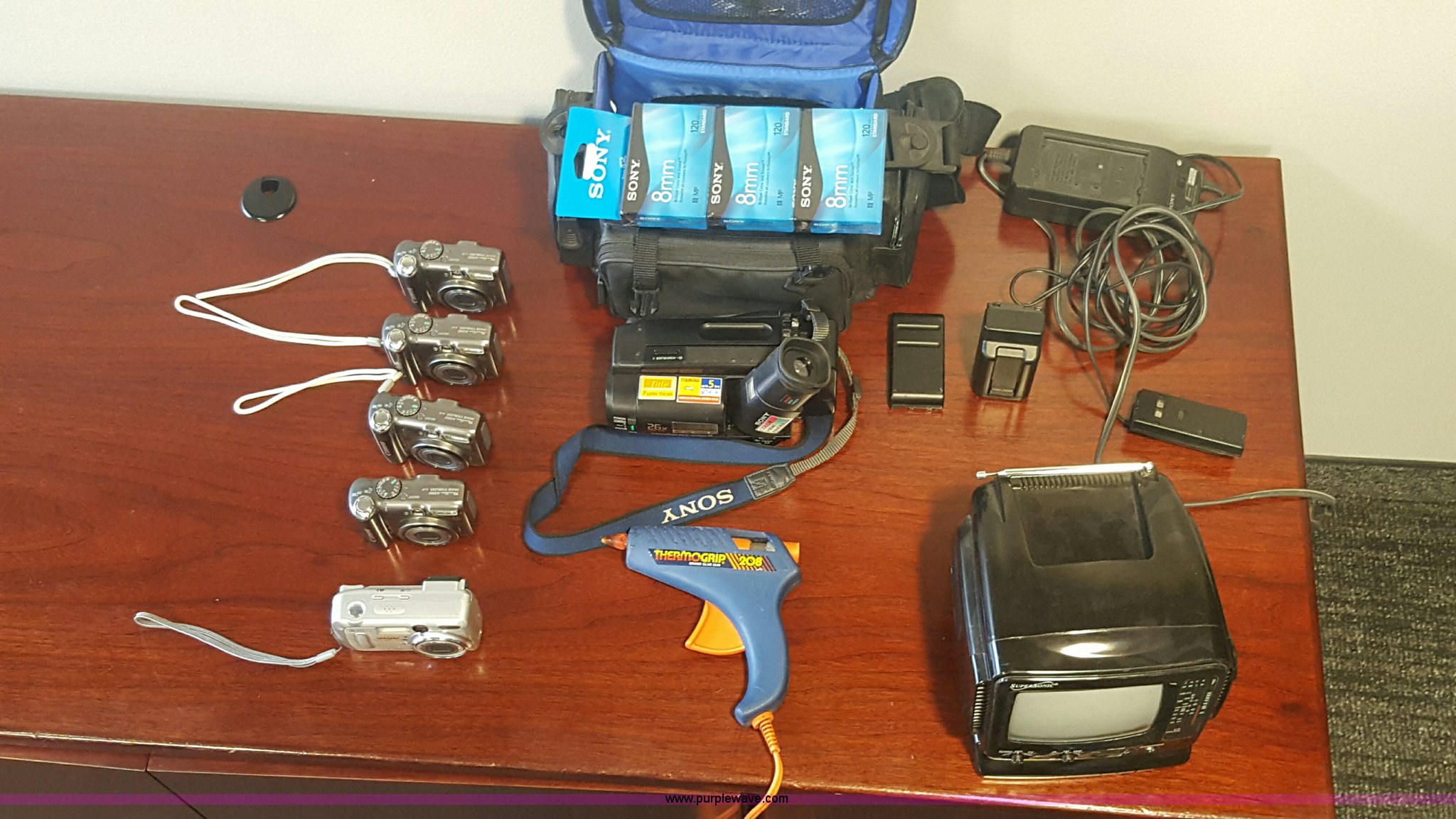 Assorted electronics. (3) Polaroid cameras, Canon ES Rebel 35mm camera, Panasonic VHS camcorder, Tundra camera case, Kodak DC120 zoom camera, 8mm camcorder, (5) 35mm cameras, SuperSonic television with radio, Glue gun, Batteries and chargers. Prairie Village Police Department. 7710 Mission Rd. Prairie Village, KS 66208