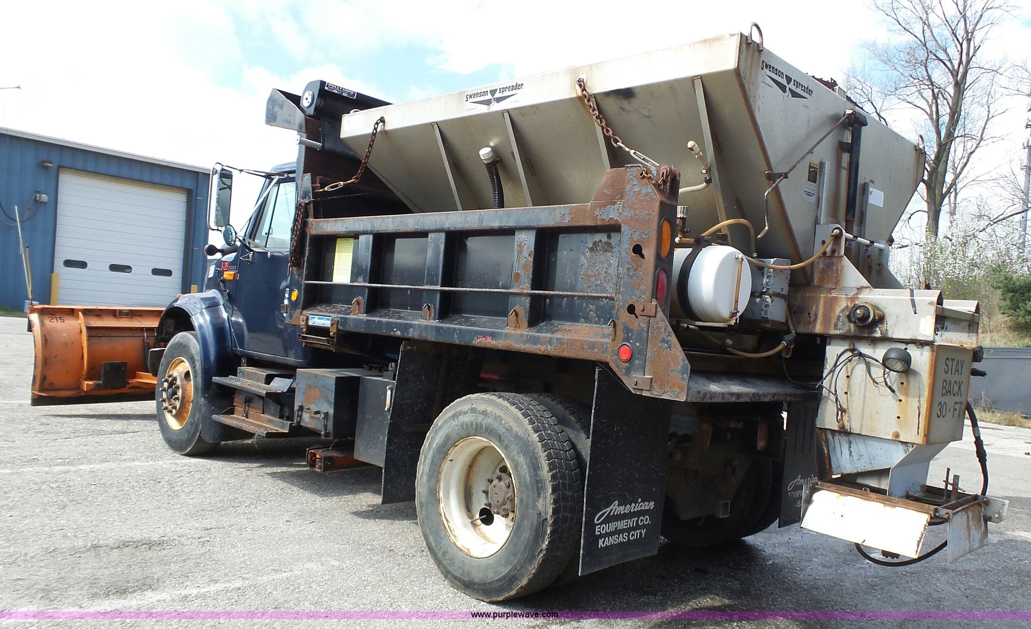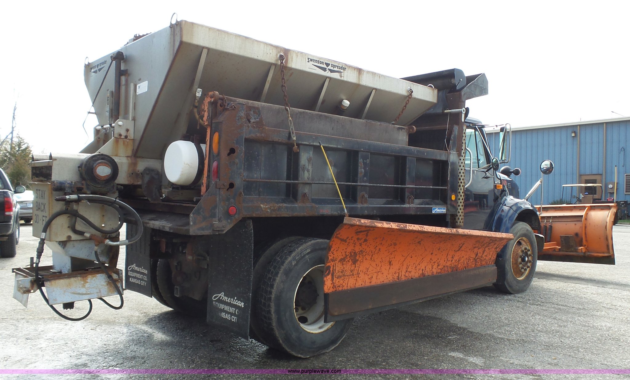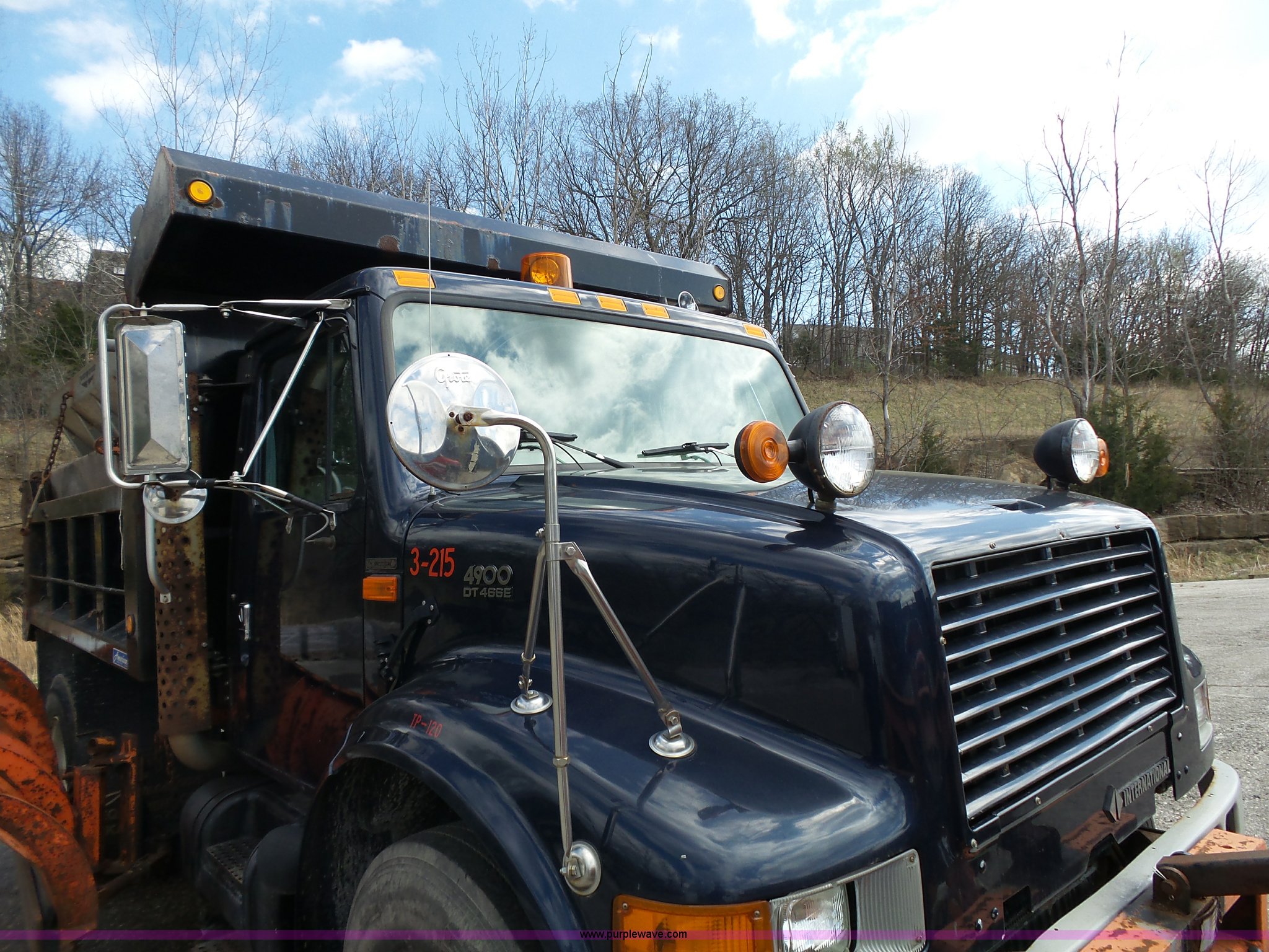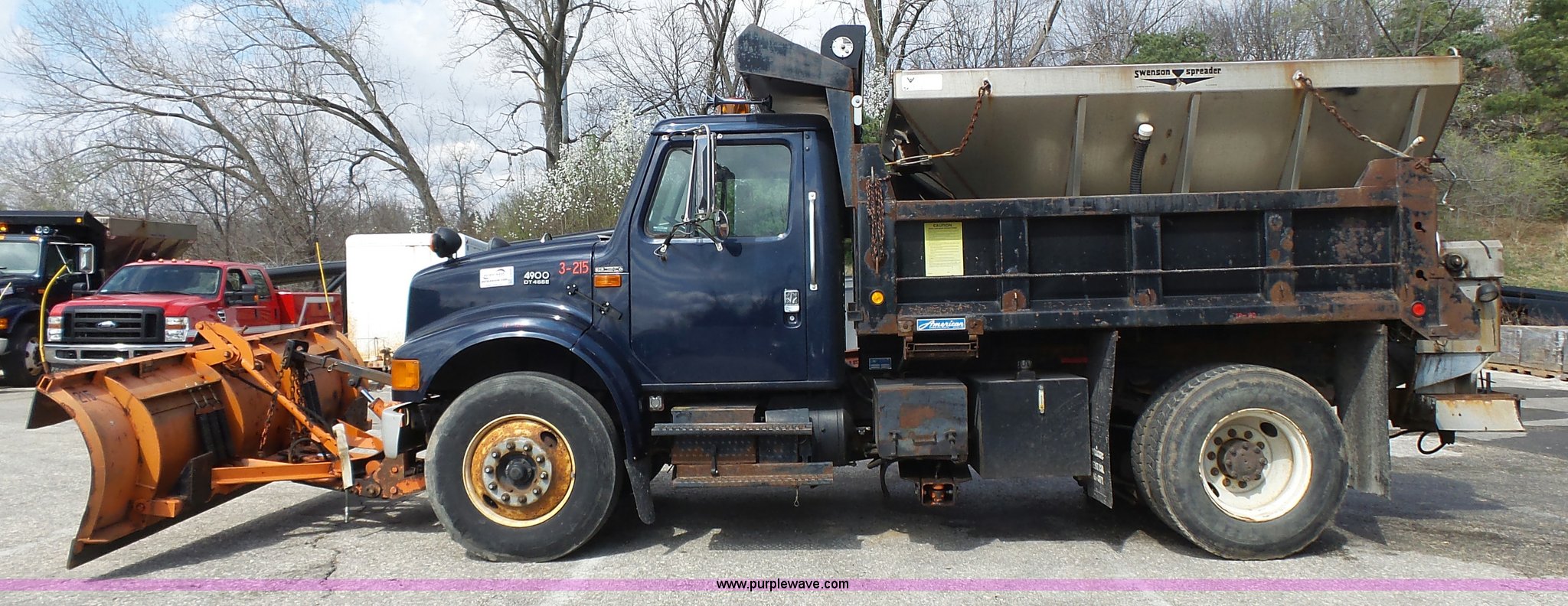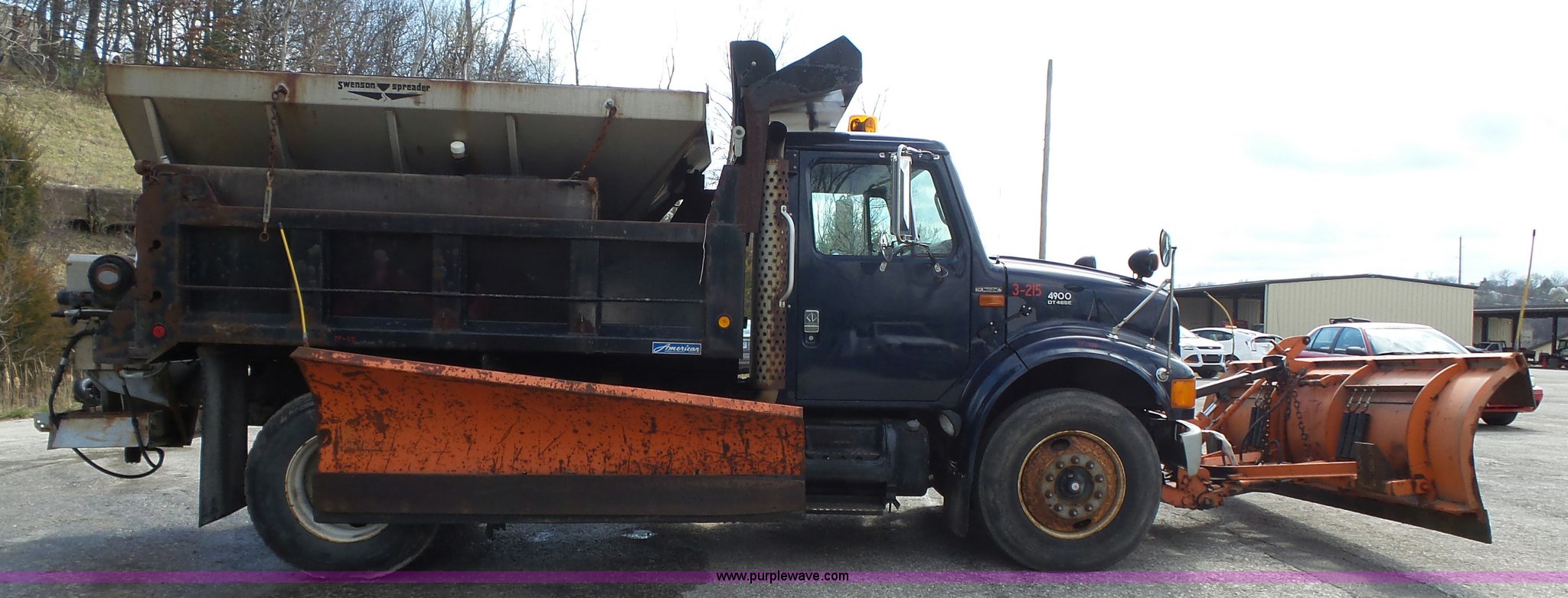 Purple Wave is selling a used Construction Dump Truck in Kansas. This item is a 2001 International 4900 dump truck with the following: 40,669 miles on odometer, 4,561 hours on meter, International DT466E 7.6L L6 turbo diesel engine, Automatic transmission, Single axle, Heat, Cruise, AM/FM/weatherband, Air suspension seat, Heated mirrors, Force SSC2100 spreader control, Strobe light, Backup alarm, Work lights, Chelsea PTO, American steel dump bed, 10'L x 8'W, 27" side height, 5 to 6 yd capacity, Roll over tarp, Single ram hoist, Coats PRB36II 11' plow, 8' side plow, Side markers, Monroe V-Box spreader, Stainless steel, Anti-Ice tanks, Pintle and receiver hitches, Trailer wiring, Single fuel tank, Spring suspension, Air brakes, 152" wheelbase, 11R22.5 tires, GVWR 35,000 lbs, FAWR 12,000 lbs, RWAR 23,000 lbs, Rust, Tailgate included, Unit# 3215