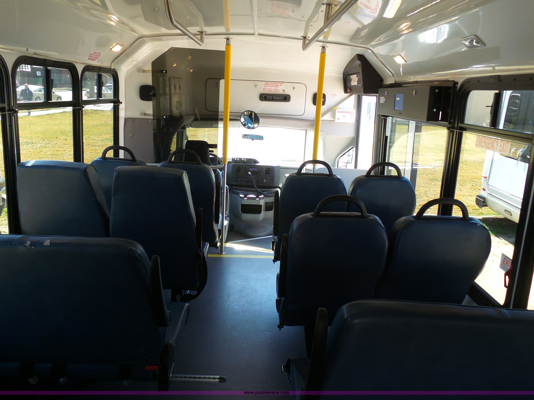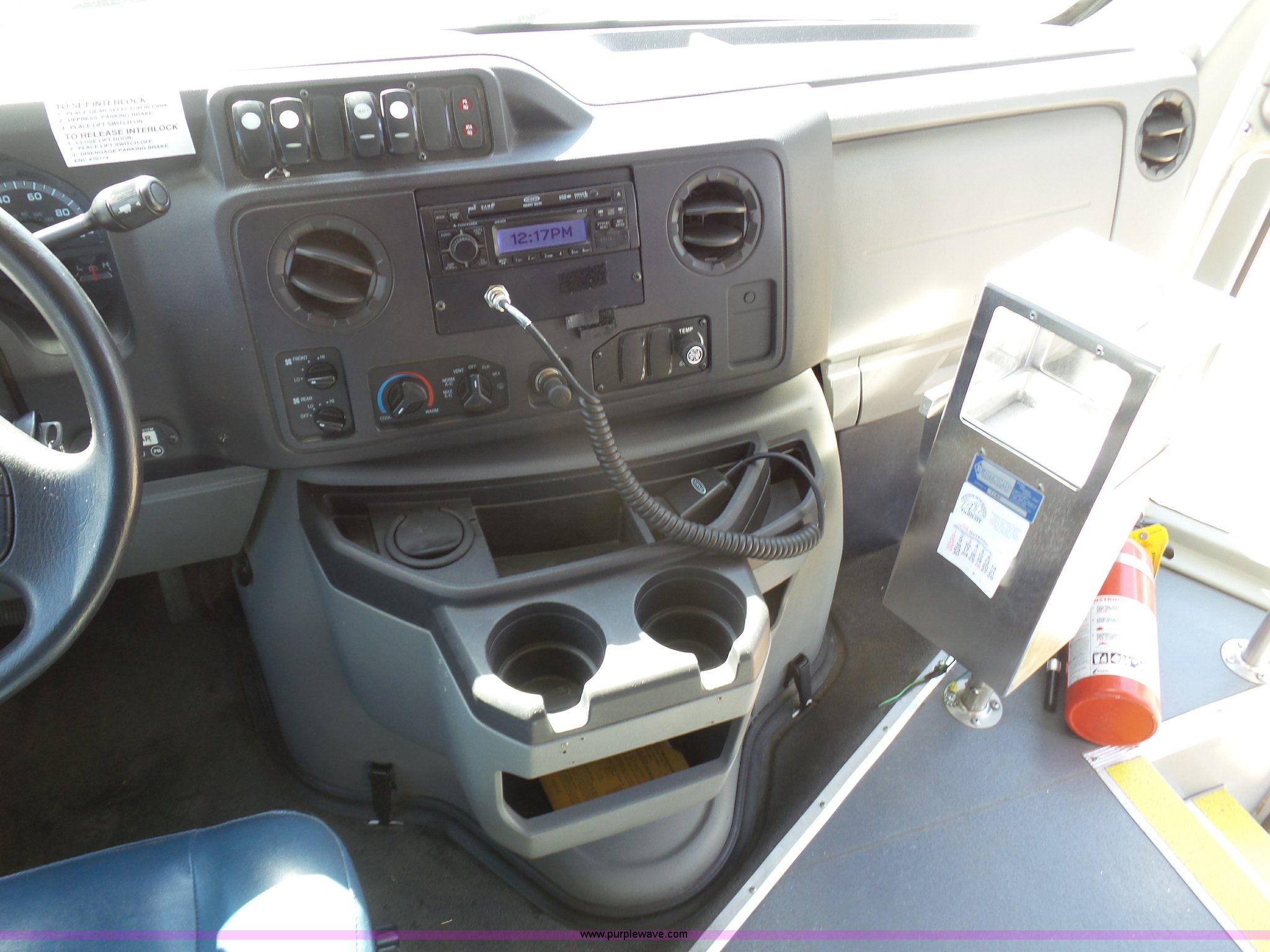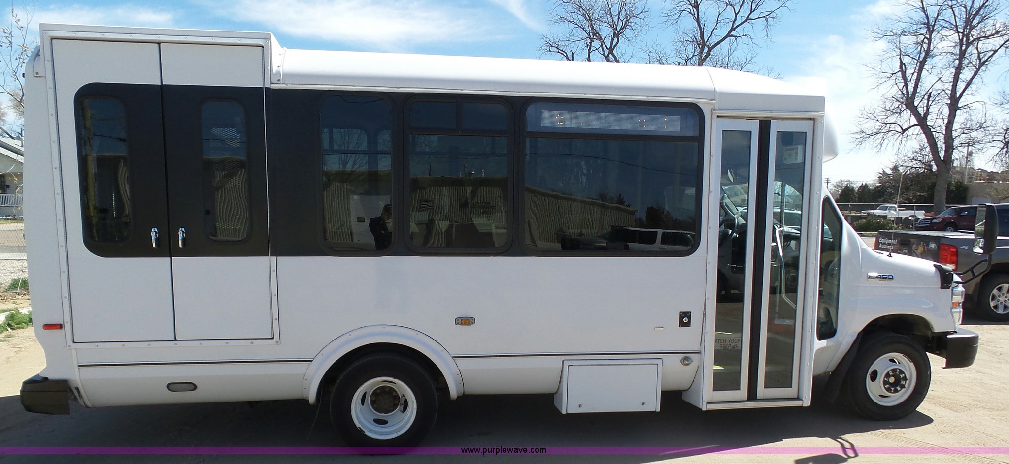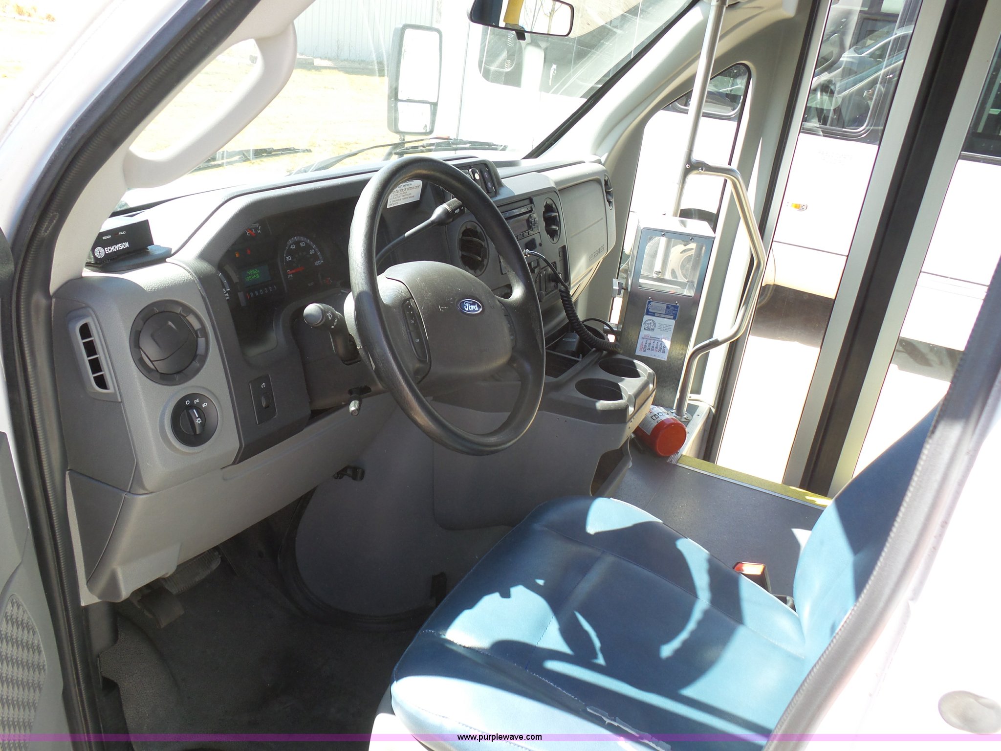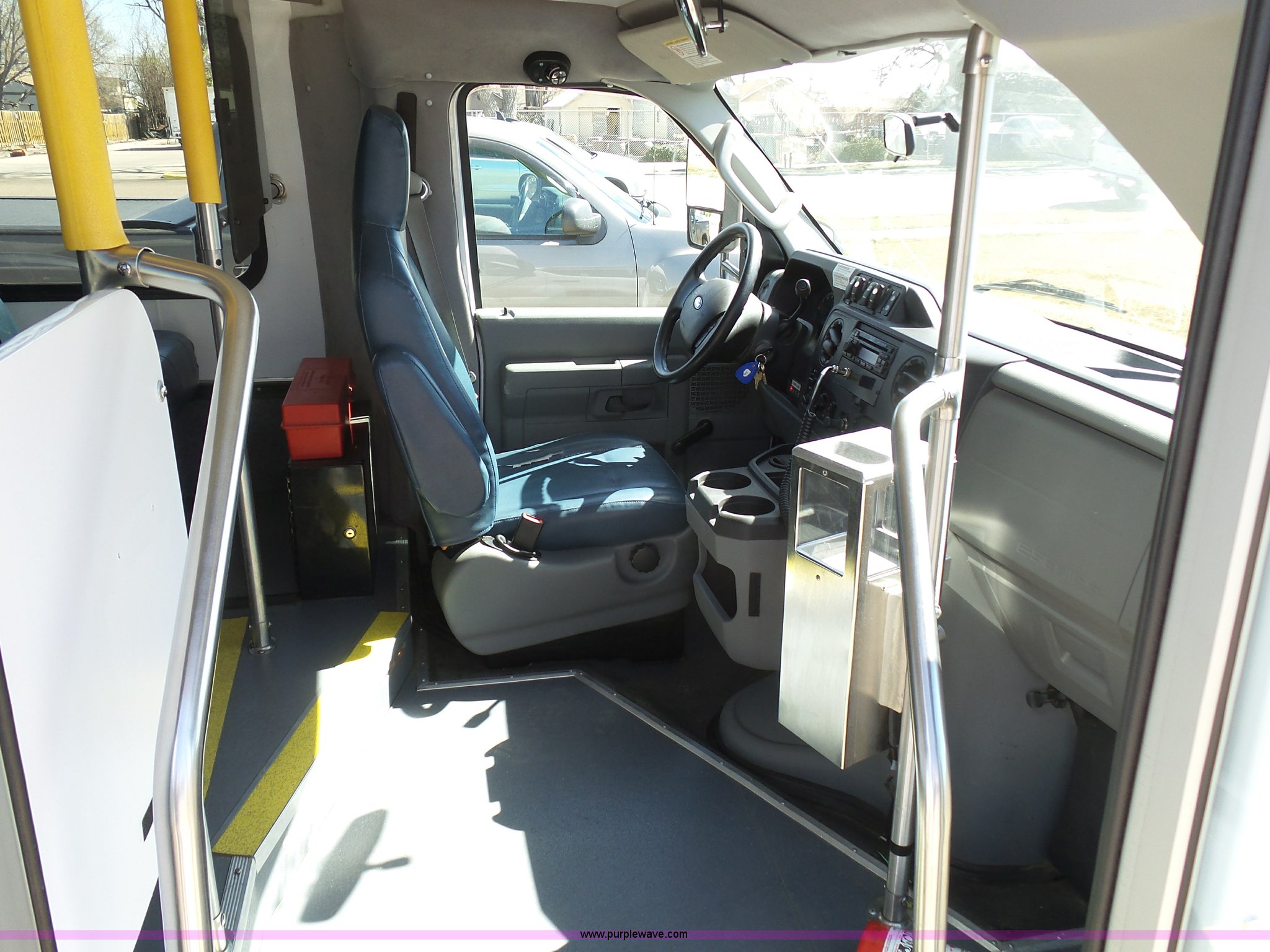 Purple Wave is selling a used Bus in Kansas. This item is a 2010 Ford Econoline E450 shuttle bus with the following: 109,458 miles on odometer, 6.8L V10 SOHC 20V gas engine, Automatic transmission, Single axle, AC and heat, Heated and power mirrors, Suspension seat, Block heater, Ceiling handrail, 14 passenger capacity, Extra length seat belts, Integrated child restraints, (2) child safety seats, Ricon S5510 wheelchair lift, (3) wheelchair tie-down areas, Retractable wheelchair fastners, Serial 00259765, Ceiling, rear, and side emergency egress, Emergency door alarm, Backup alarm, Fare box, Rear strobe lights, Public address systems, Pull cord systems, 158" wheelbase, Hydraulic suspension, Hydraulic brakes, LT225/75R16 tires, GVWR 14,500 lbs, Driver's seat damaged, Unit# 26