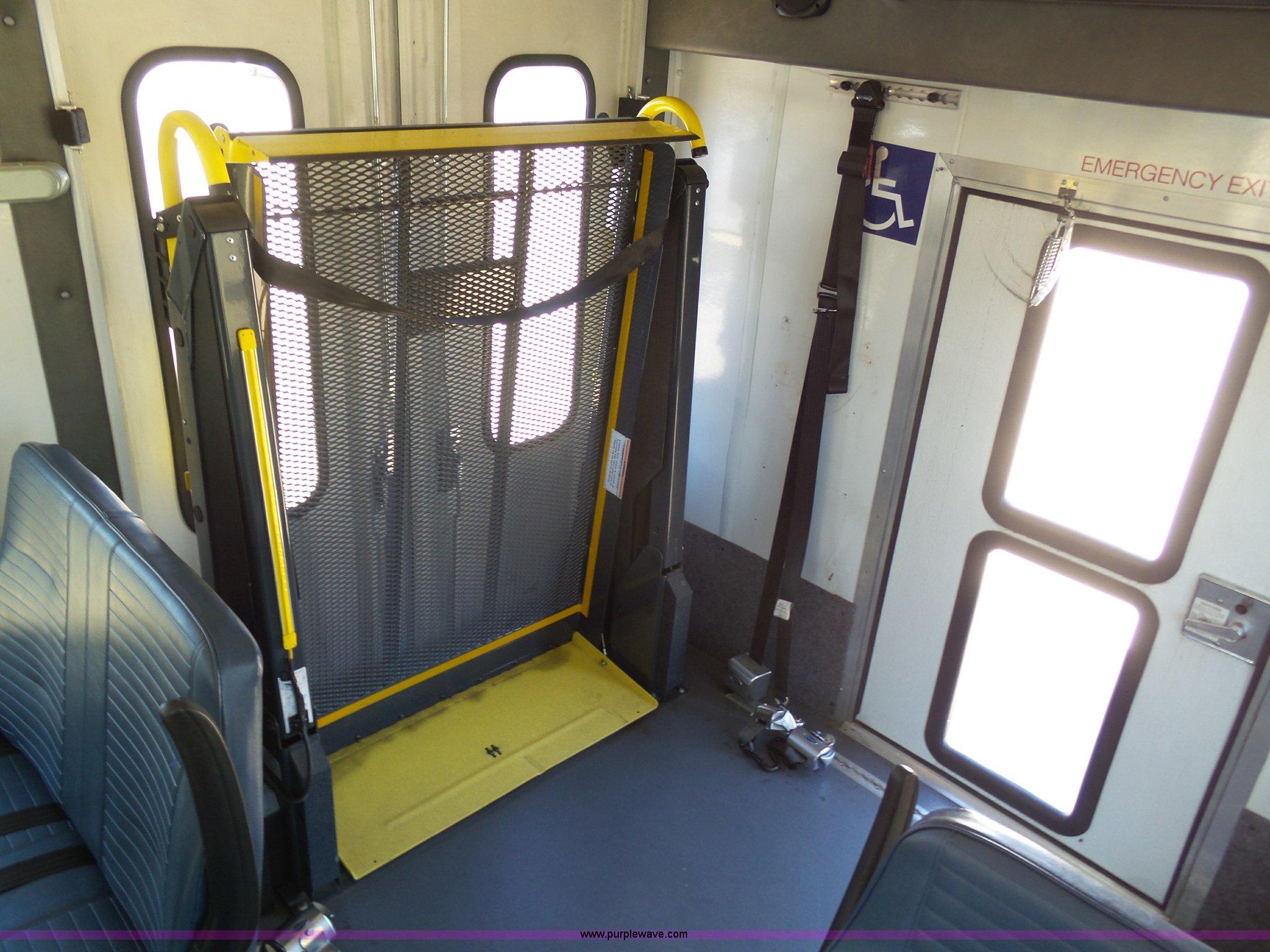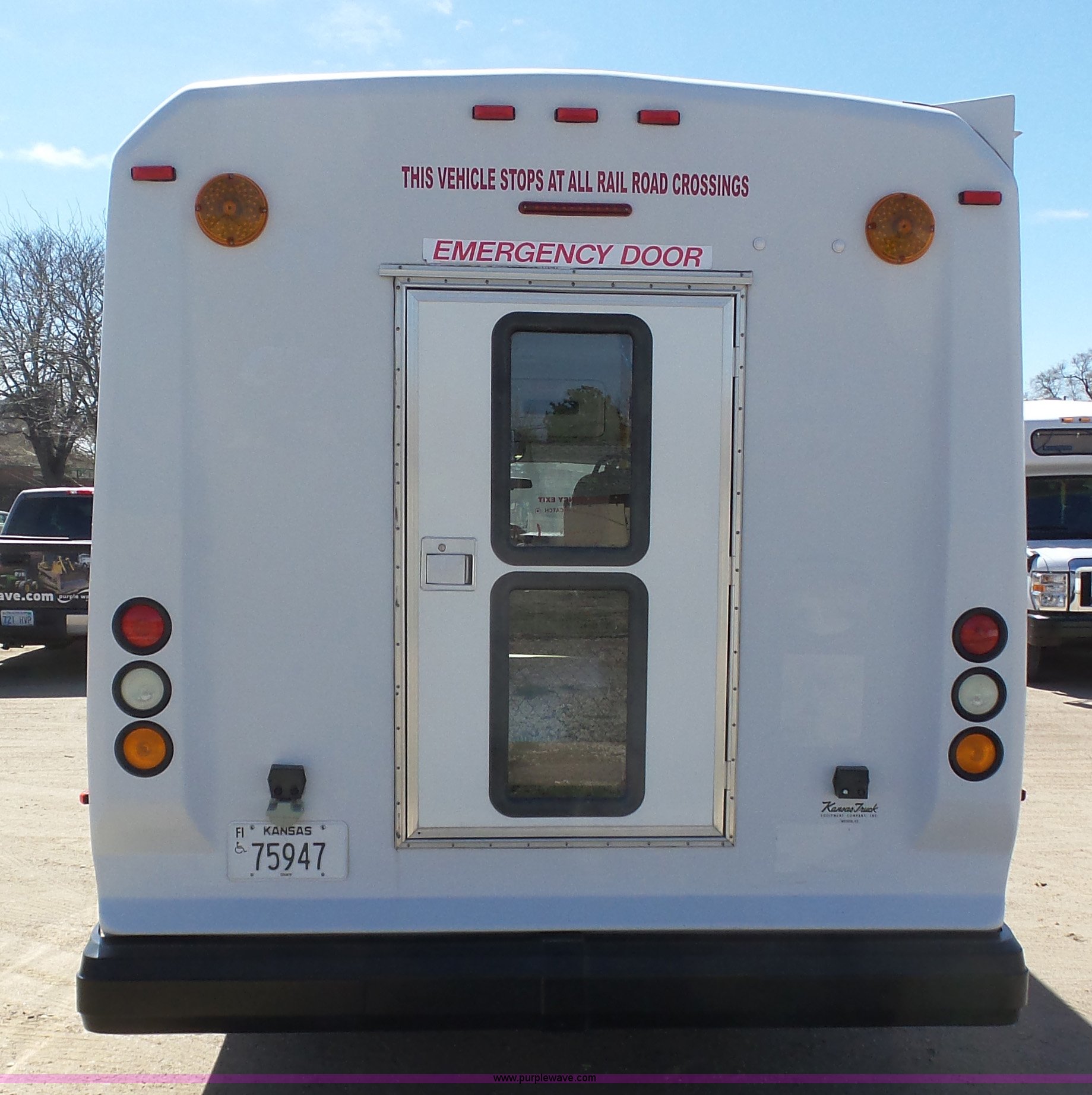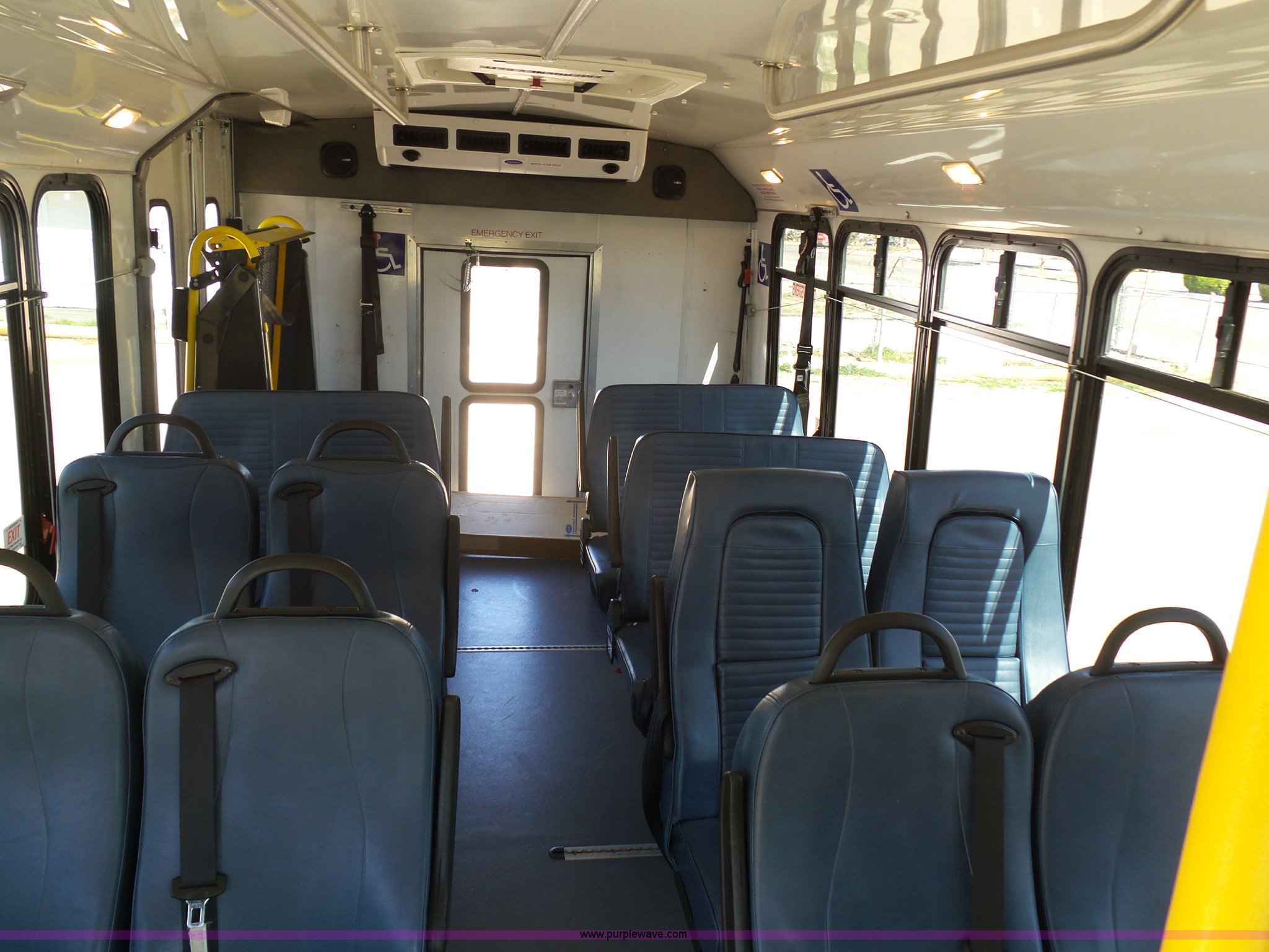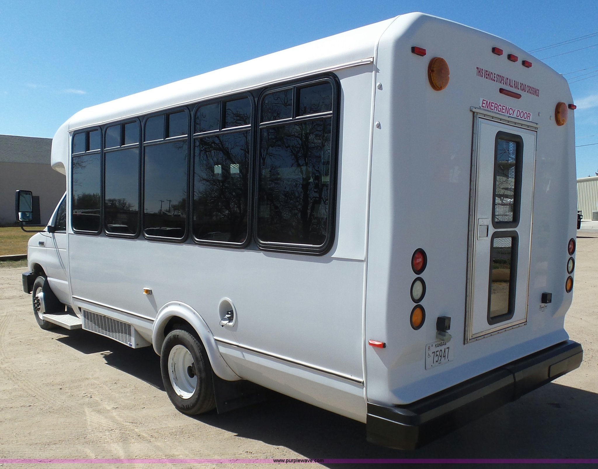 Purple Wave is selling a used Bus in Kansas. This item is a 2010 Ford Econoline E450 shuttle bus with the following: 109,458 miles on odometer, 6.8L V10 SOHC 20V gas engine, Automatic transmission, Single axle, AC and heat, Heated and power mirrors, Suspension seat, Block heater, Ceiling handrail, 14 passenger capacity, Extra length seat belts, Integrated child restraints, (2) child safety seats, Ricon S5510 wheelchair lift, (3) wheelchair tie-down areas, Retractable wheelchair fastners, Serial 00259765, Ceiling, rear, and side emergency egress, Emergency door alarm, Backup alarm, Fare box, Rear strobe lights, Public address systems, Pull cord systems, 158" wheelbase, Hydraulic suspension, Hydraulic brakes, LT225/75R16 tires, GVWR 14,500 lbs, Driver's seat damaged, Unit# 26