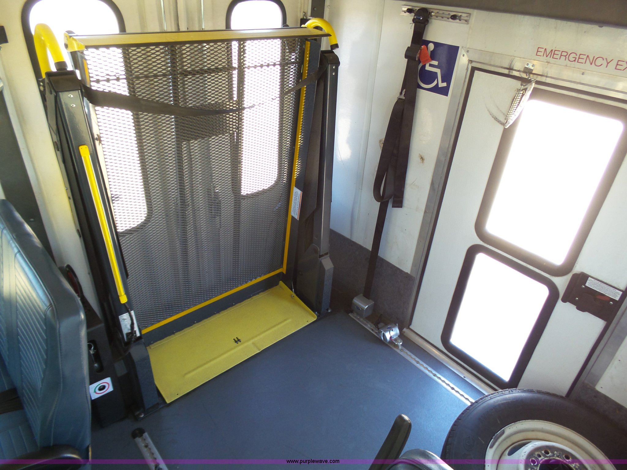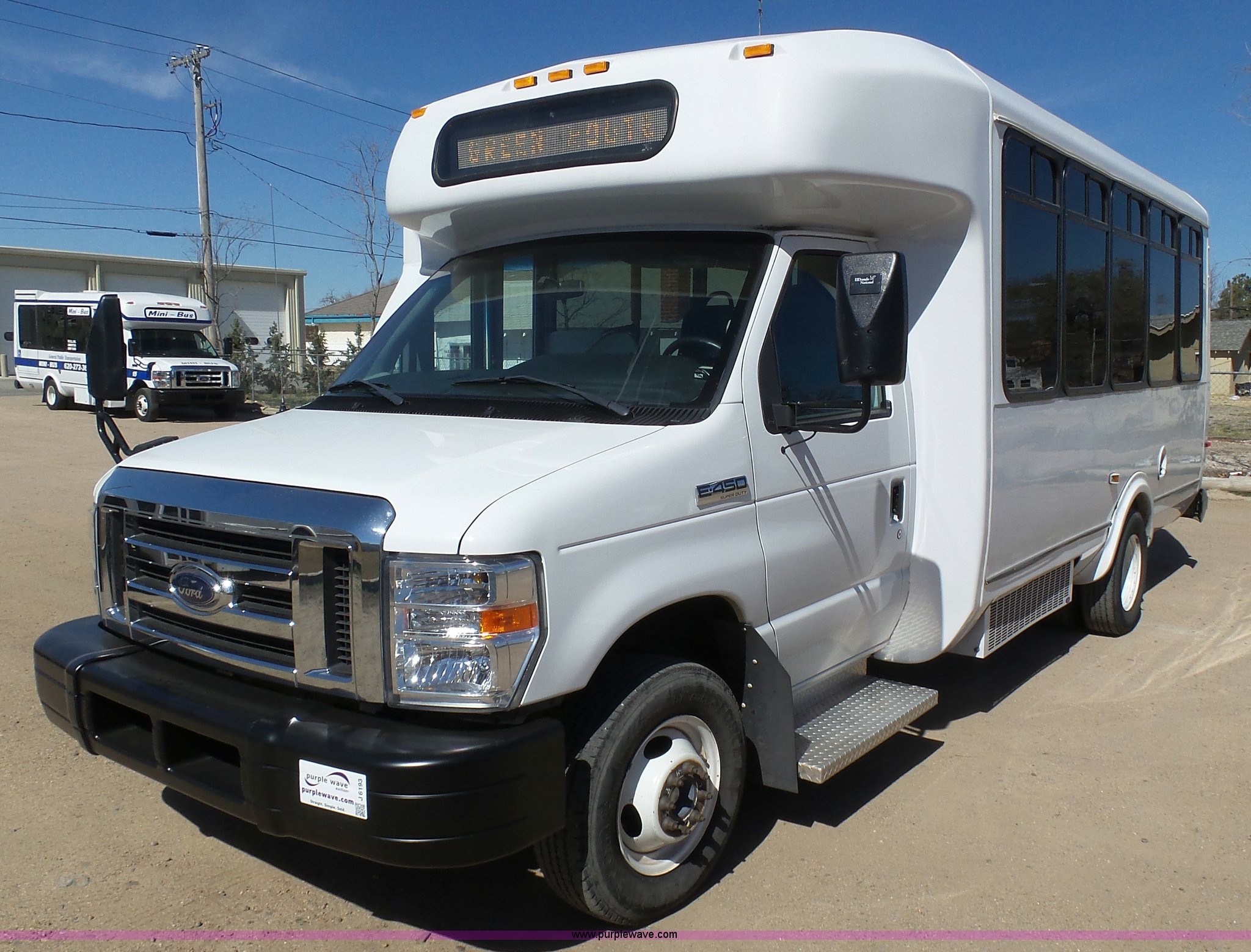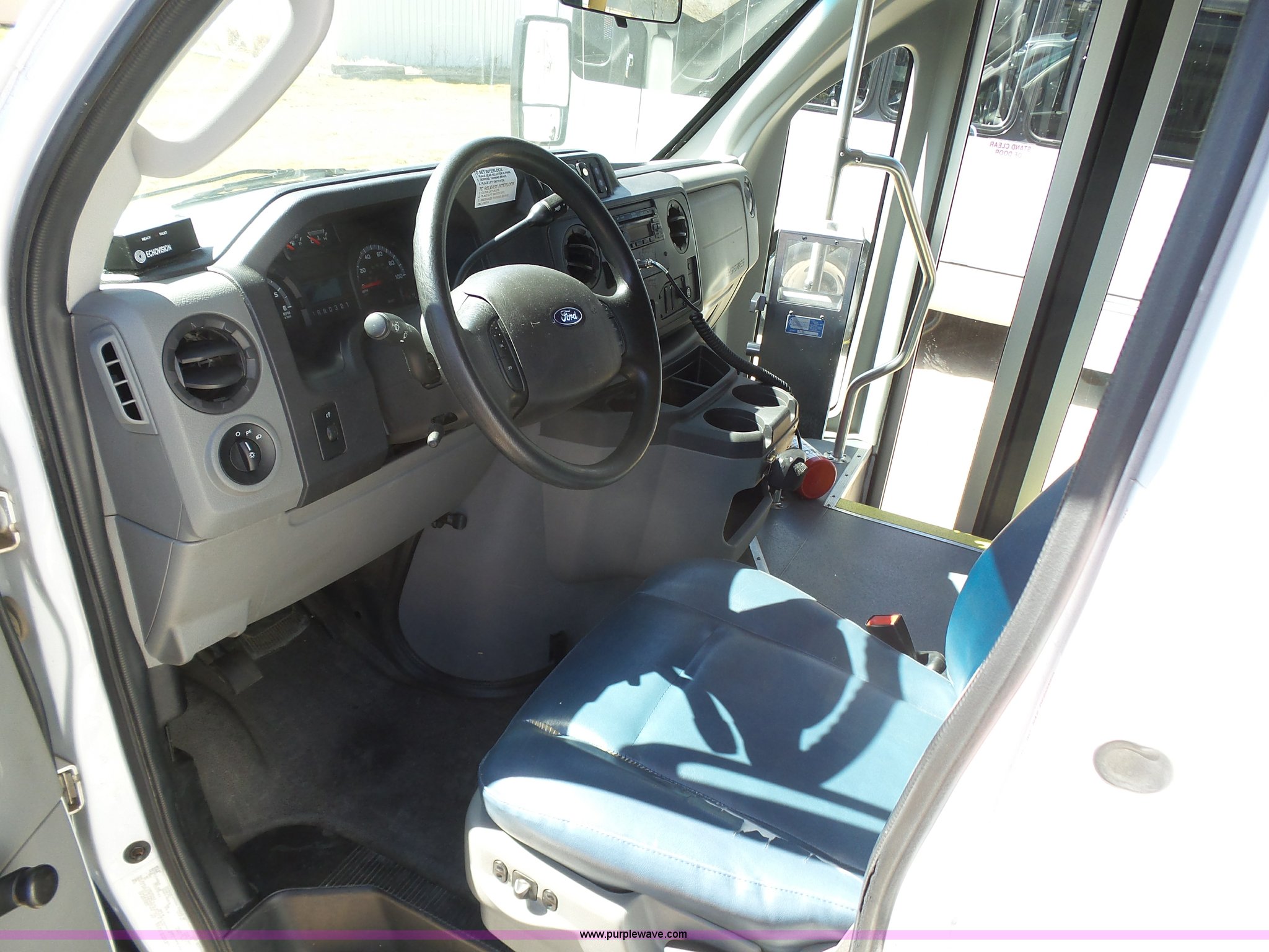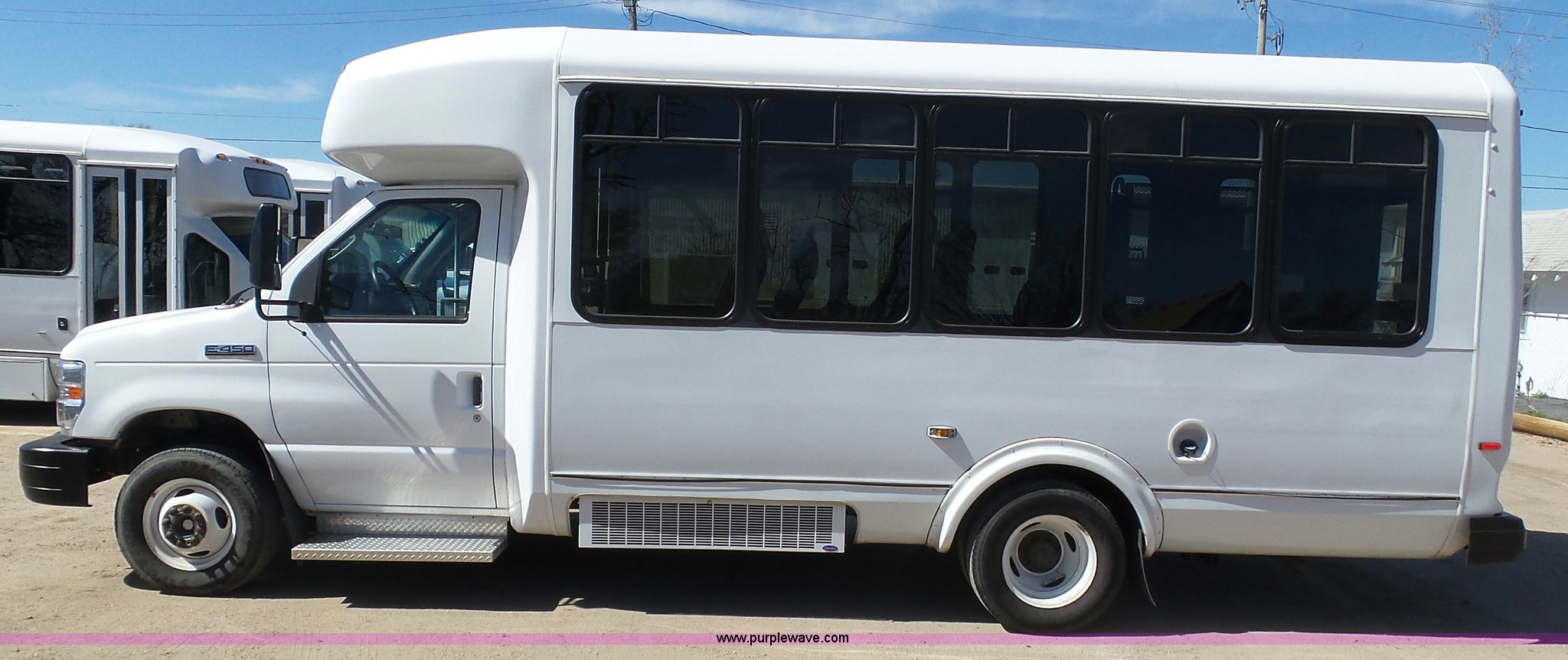 Purple Wave is selling a used Bus in Kansas. This item is a 2010 Ford Econoline E450 shuttle bus with the following: 106,676 miles on odometer, 6.8L V10 SOHC 20V gas engine, Automatic transmission, Single axle, AC and heat, AM/FM/CD, Heated and power mirrors, Suspension seat, Block heater, Ceiling handrail, 14 passenger capacity, Extra length seat belts, Integrated child restraints, (4) child safety seats, Ricon S5510 wheelchair lift, (3) wheelchair tie-downs, Retractable wheelchair fastners, Ceiling, rear, and side emergency egress, Emergency door alarms, Backup alarm, Fare boxes, Public address systems, Pull cord systems, Rear strobe light, 158" wheelbase, Hydraulic suspension, Hydraulic brakes, LT225/75R16 tires, GVWR 14,500 lbs, Unit# 24