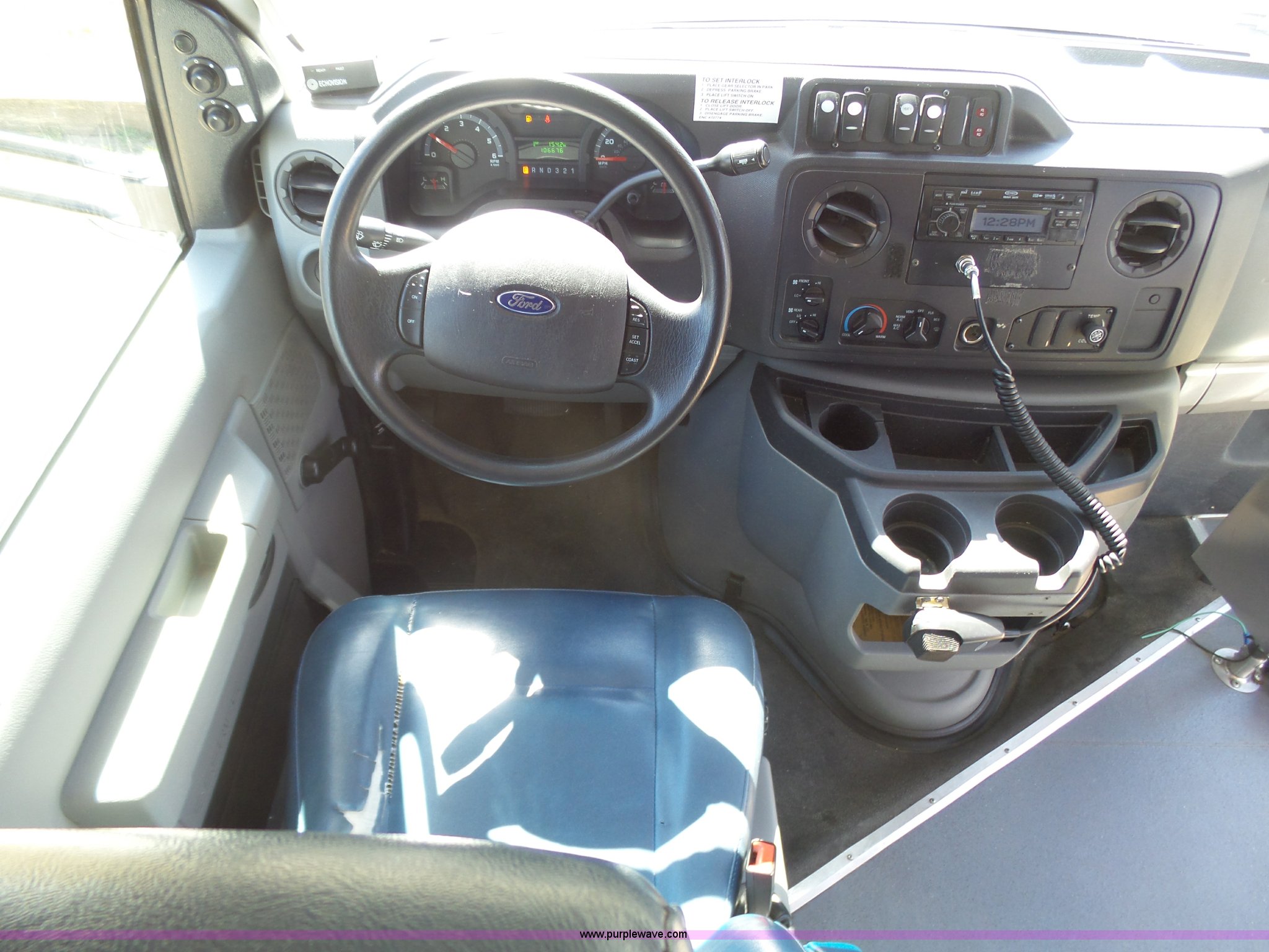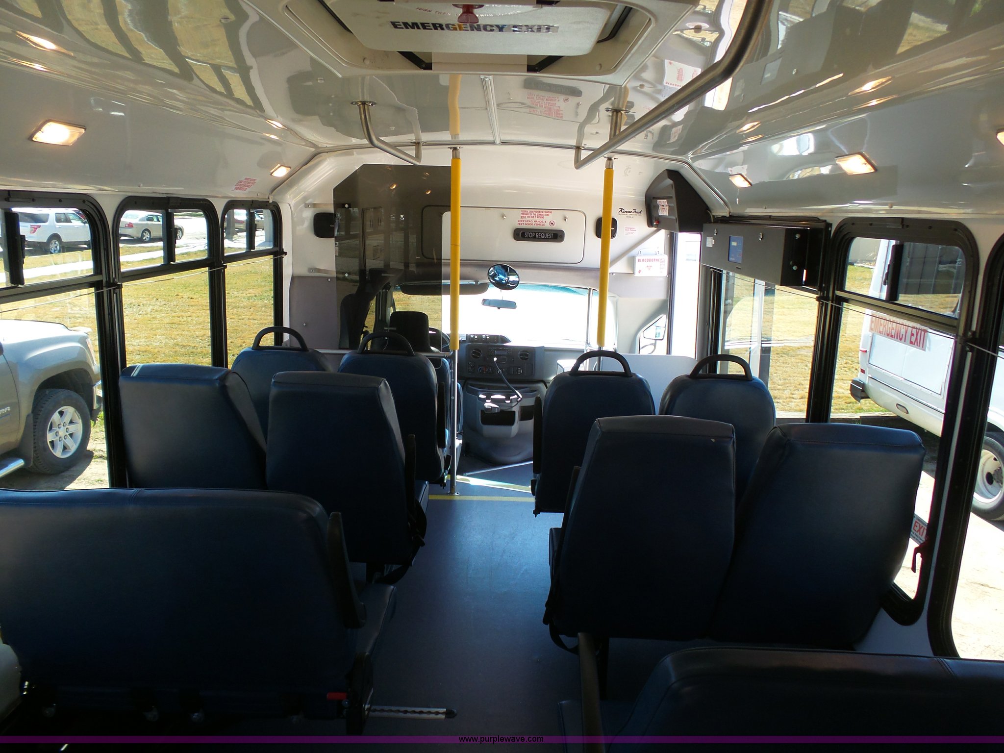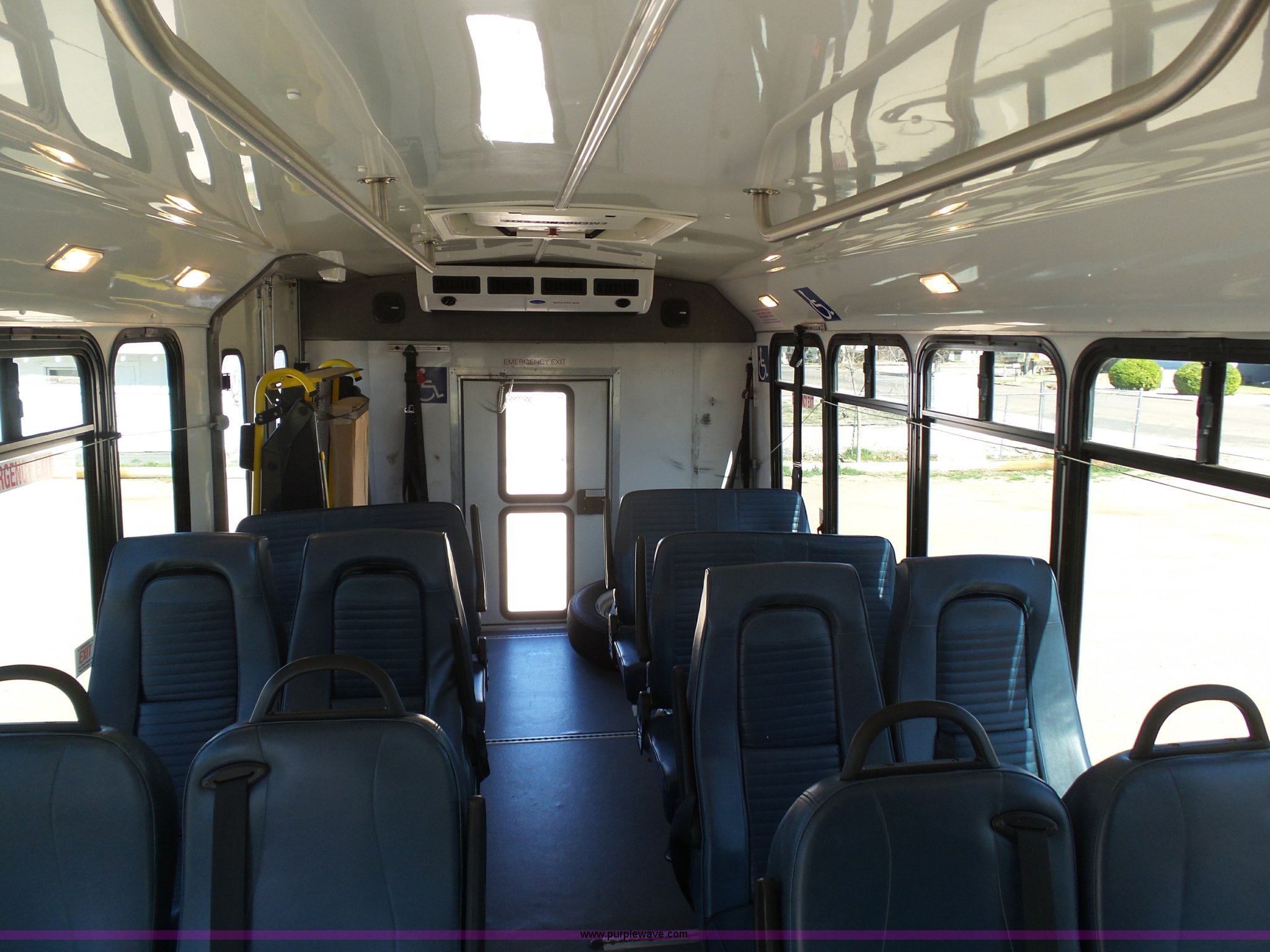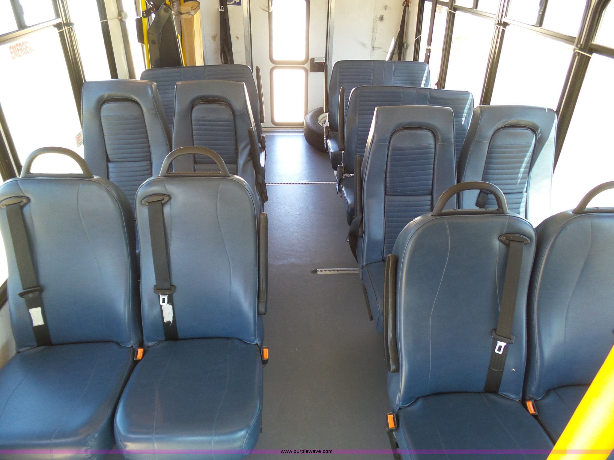 Purple Wave is selling a used Bus in Kansas. This item is a 2010 Ford Econoline E450 shuttle bus with the following: 106,676 miles on odometer, 6.8L V10 SOHC 20V gas engine, Automatic transmission, Single axle, AC and heat, AM/FM/CD, Heated and power mirrors, Suspension seat, Block heater, Ceiling handrail, 14 passenger capacity, Extra length seat belts, Integrated child restraints, (4) child safety seats, Ricon S5510 wheelchair lift, (3) wheelchair tie-downs, Retractable wheelchair fastners, Ceiling, rear, and side emergency egress, Emergency door alarms, Backup alarm, Fare boxes, Public address systems, Pull cord systems, Rear strobe light, 158" wheelbase, Hydraulic suspension, Hydraulic brakes, LT225/75R16 tires, GVWR 14,500 lbs, Unit# 24