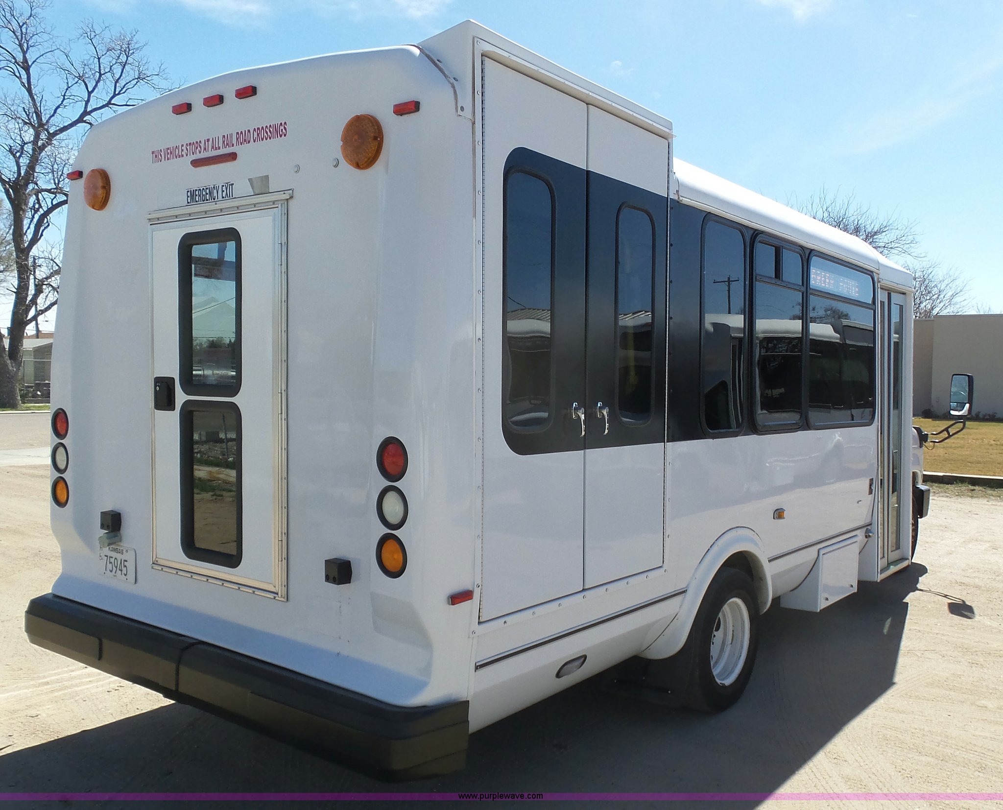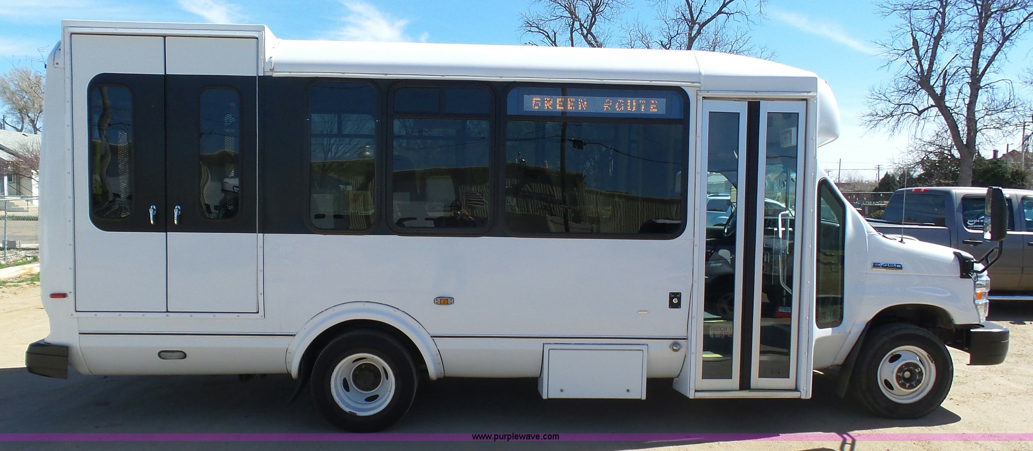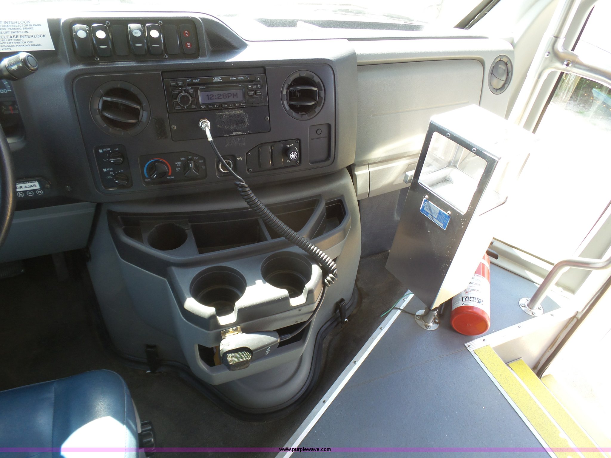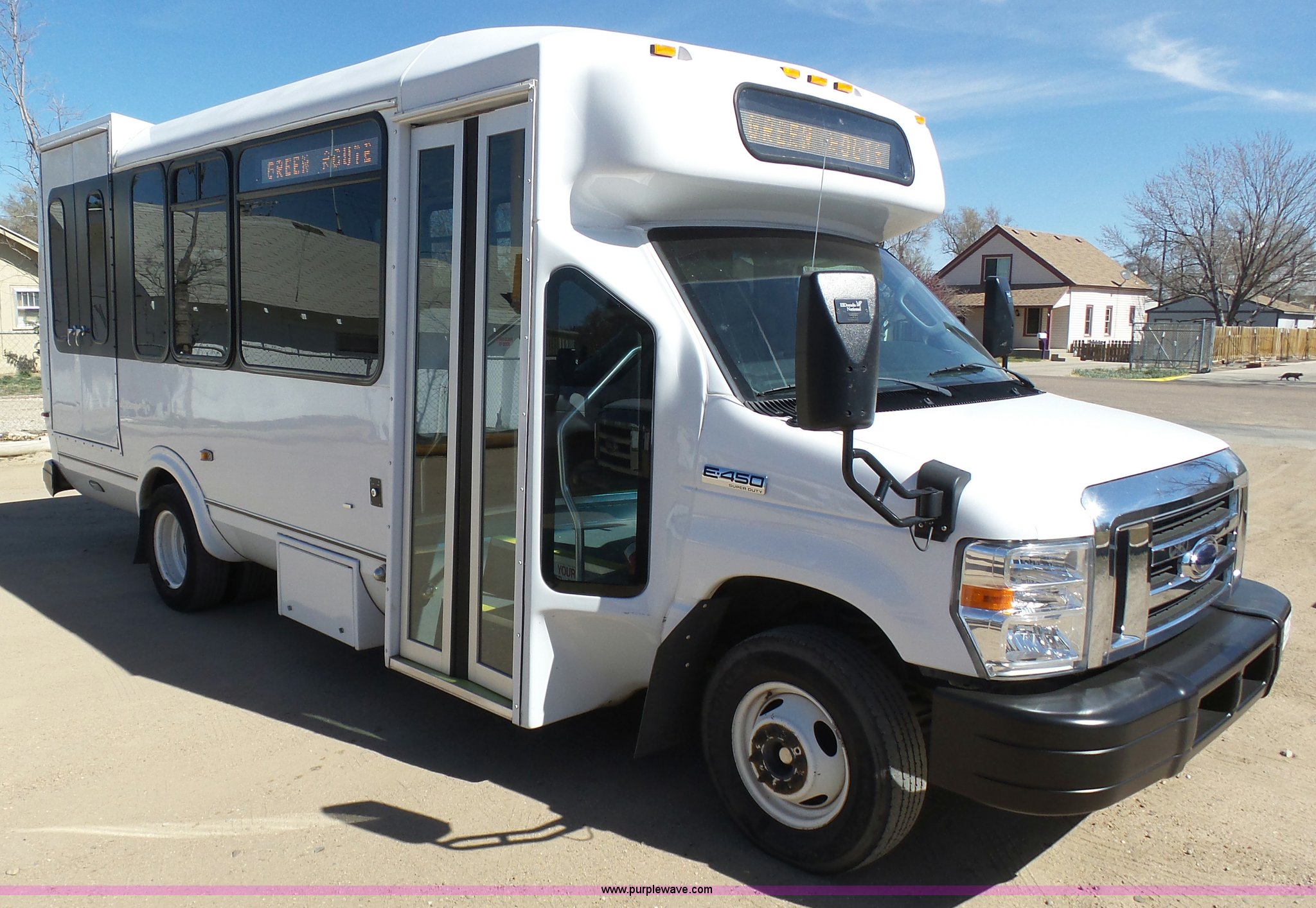 Purple Wave is selling a used Bus in Kansas. This item is a 2010 Ford Econoline E450 shuttle bus with the following: 106,676 miles on odometer, 6.8L V10 SOHC 20V gas engine, Automatic transmission, Single axle, AC and heat, AM/FM/CD, Heated and power mirrors, Suspension seat, Block heater, Ceiling handrail, 14 passenger capacity, Extra length seat belts, Integrated child restraints, (4) child safety seats, Ricon S5510 wheelchair lift, (3) wheelchair tie-downs, Retractable wheelchair fastners, Ceiling, rear, and side emergency egress, Emergency door alarms, Backup alarm, Fare boxes, Public address systems, Pull cord systems, Rear strobe light, 158" wheelbase, Hydraulic suspension, Hydraulic brakes, LT225/75R16 tires, GVWR 14,500 lbs, Unit# 24