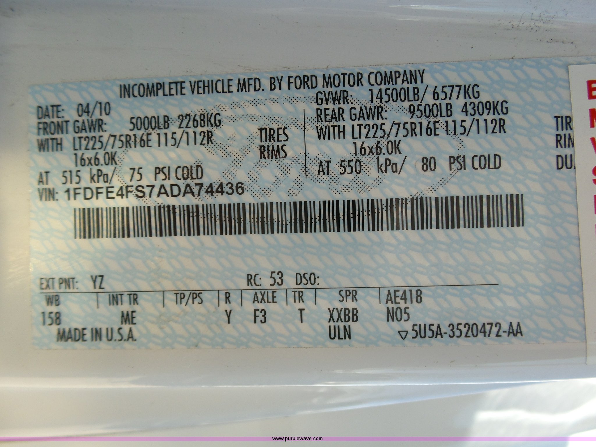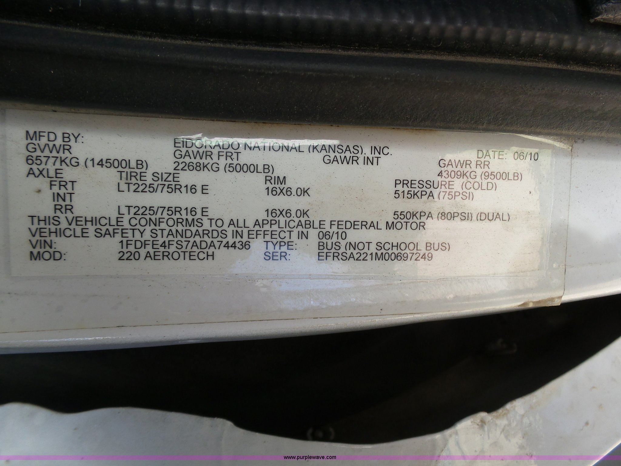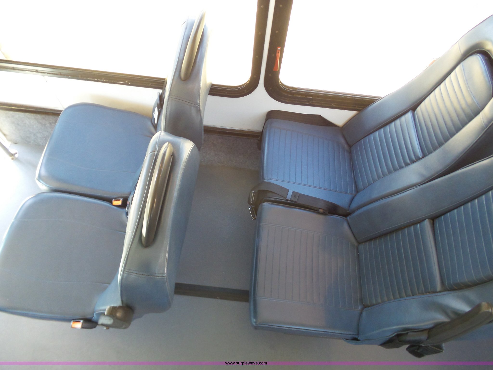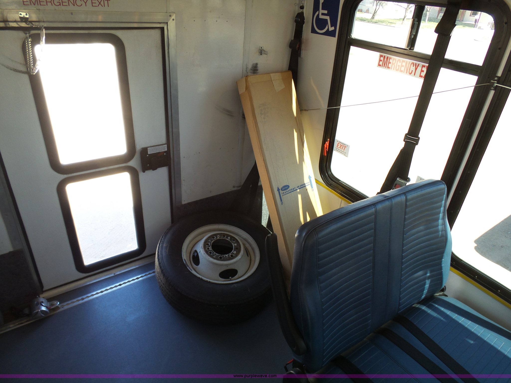 Purple Wave is selling a used Bus in Kansas. This item is a 2010 Ford Econoline E450 shuttle bus with the following: 106,676 miles on odometer, 6.8L V10 SOHC 20V gas engine, Automatic transmission, Single axle, AC and heat, AM/FM/CD, Heated and power mirrors, Suspension seat, Block heater, Ceiling handrail, 14 passenger capacity, Extra length seat belts, Integrated child restraints, (4) child safety seats, Ricon S5510 wheelchair lift, (3) wheelchair tie-downs, Retractable wheelchair fastners, Ceiling, rear, and side emergency egress, Emergency door alarms, Backup alarm, Fare boxes, Public address systems, Pull cord systems, Rear strobe light, 158" wheelbase, Hydraulic suspension, Hydraulic brakes, LT225/75R16 tires, GVWR 14,500 lbs, Unit# 24