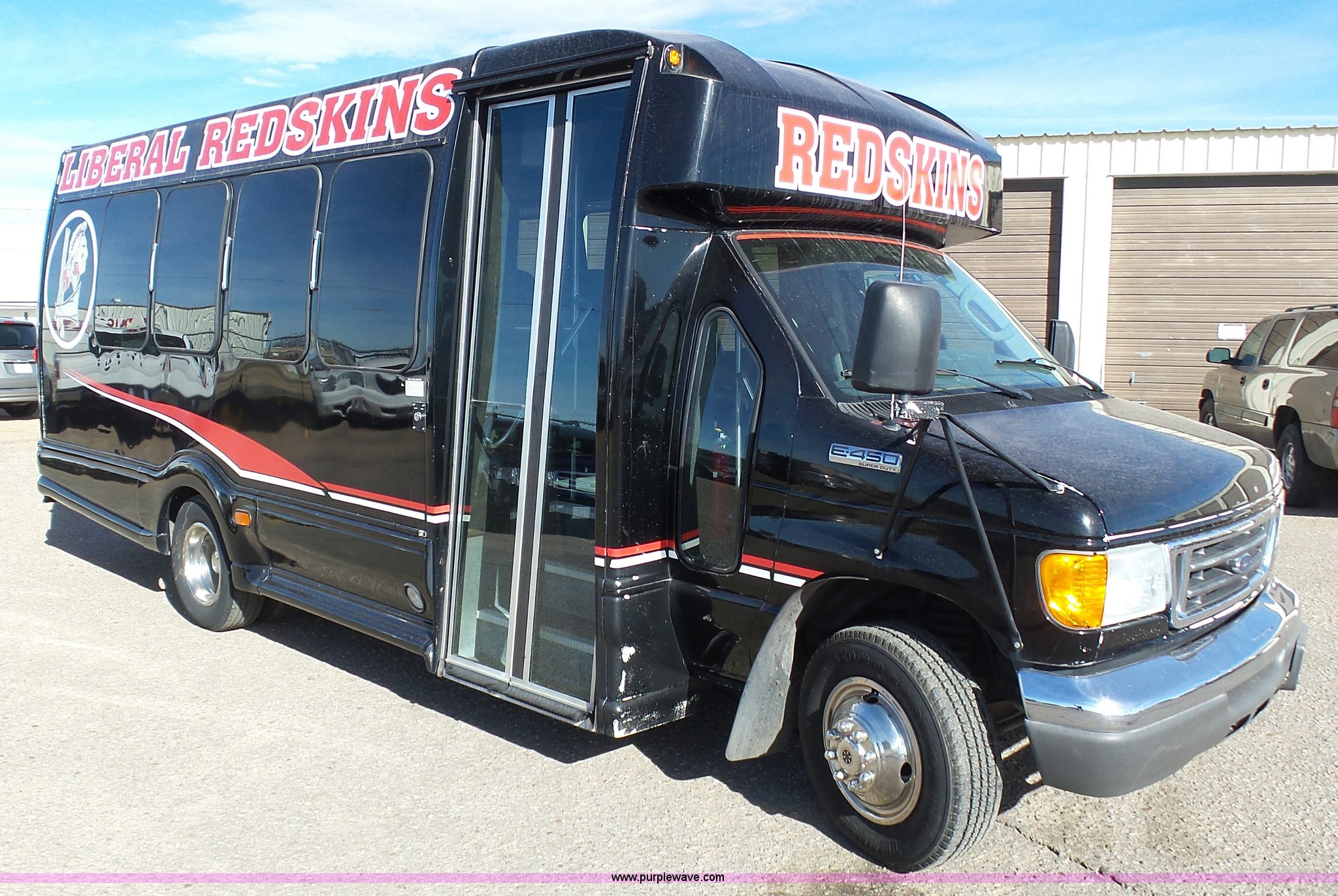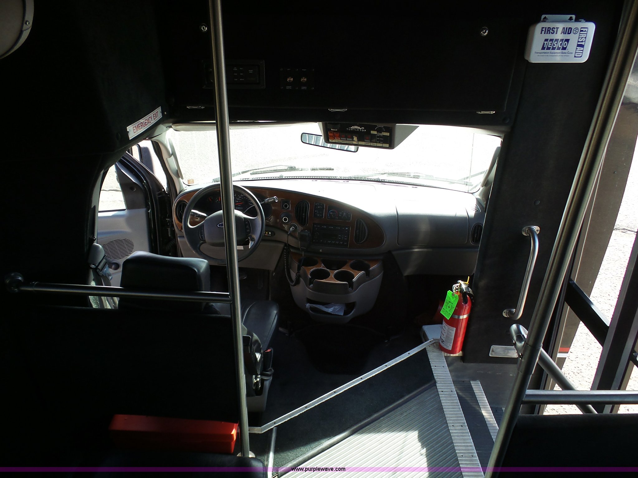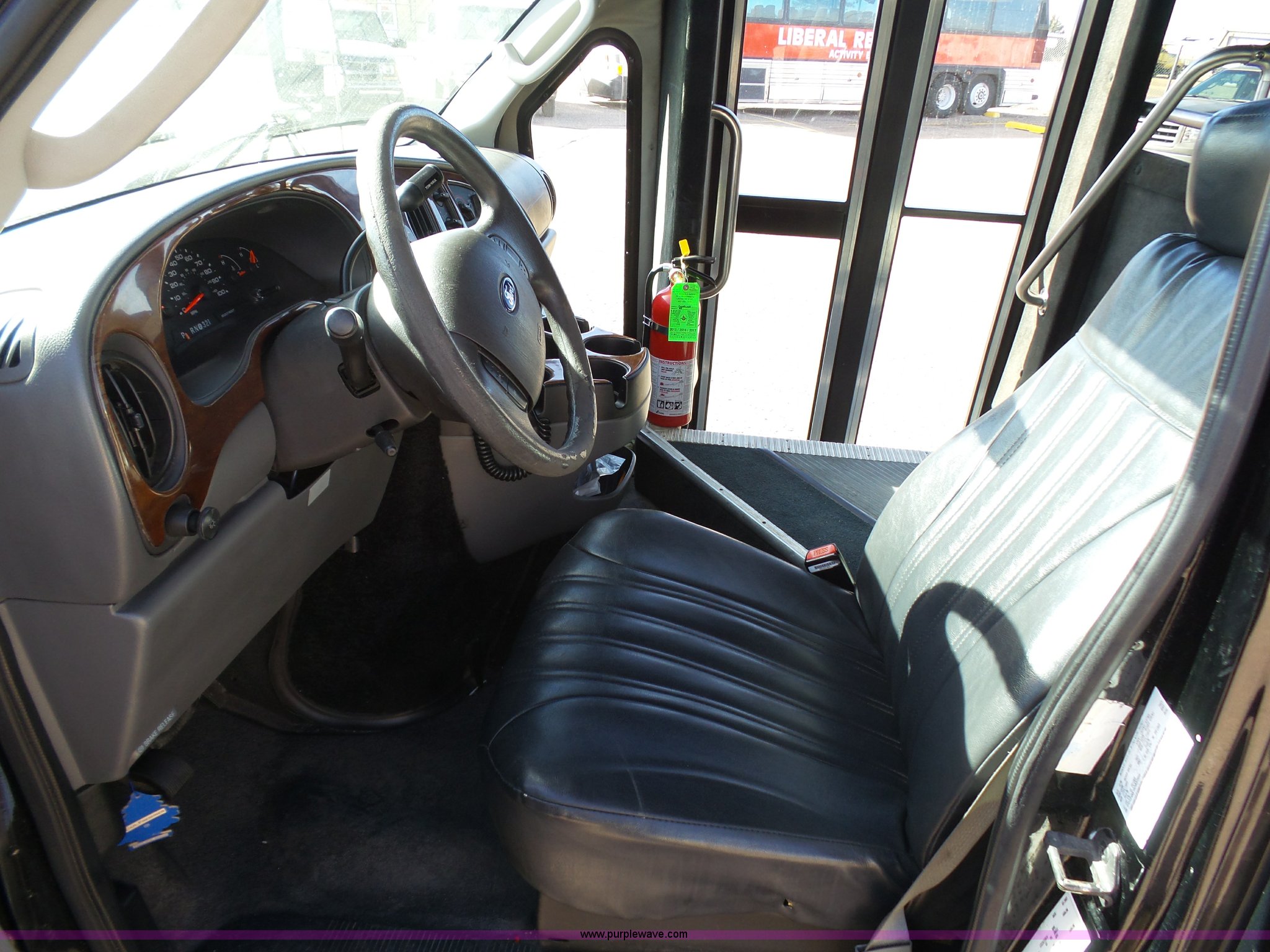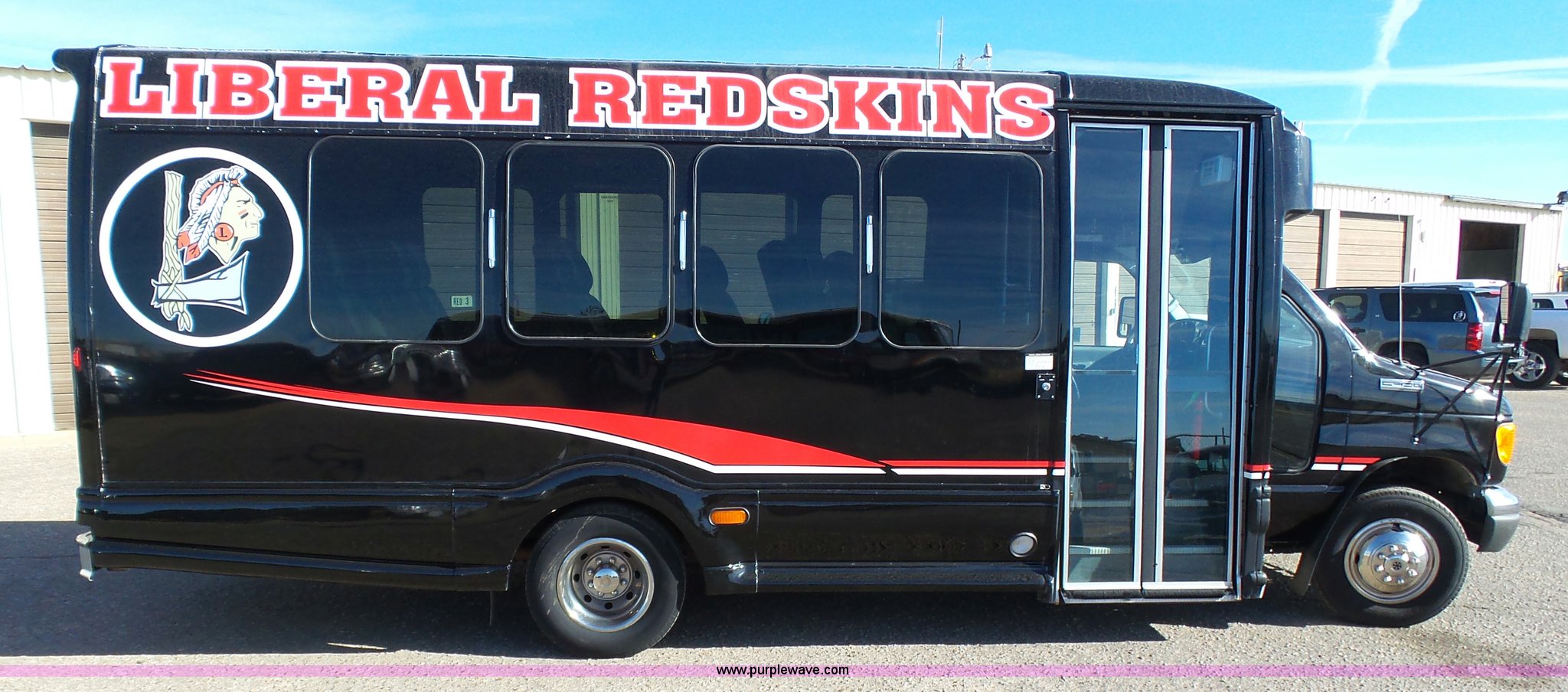 Purple Wave is selling a used Bus in Kansas. This item is a 2006 Ford Econoline E450 shuttle bus with the following: 133,771 miles on odometer, 6.8L V10 SOHC 20V gas engine, Serial 6FMXH06.86H5, Automatic transmission, Single axle, AC and heat, Tilt, Cruise, AM/FM/CD, Suspension seat, Power and heated mirrors, Electric passenger sliding door, Overhead storage, 14 passenger capacity, Ceiling, front, and side emergency egress, Block heater, Rear entry closest/storage, 92"W x 82"H x 31"D, Intercom system, Rear AC and heat, Overhead lighting, Overhead TV/CD/DVD/MP3 player, Turtle top leather bucket seats, Spring suspension, Hydraulic brakes, 158" wheelbase, LT225/75R16 tires, Interior/exterior cosmetic damage, Removable vinyl decals