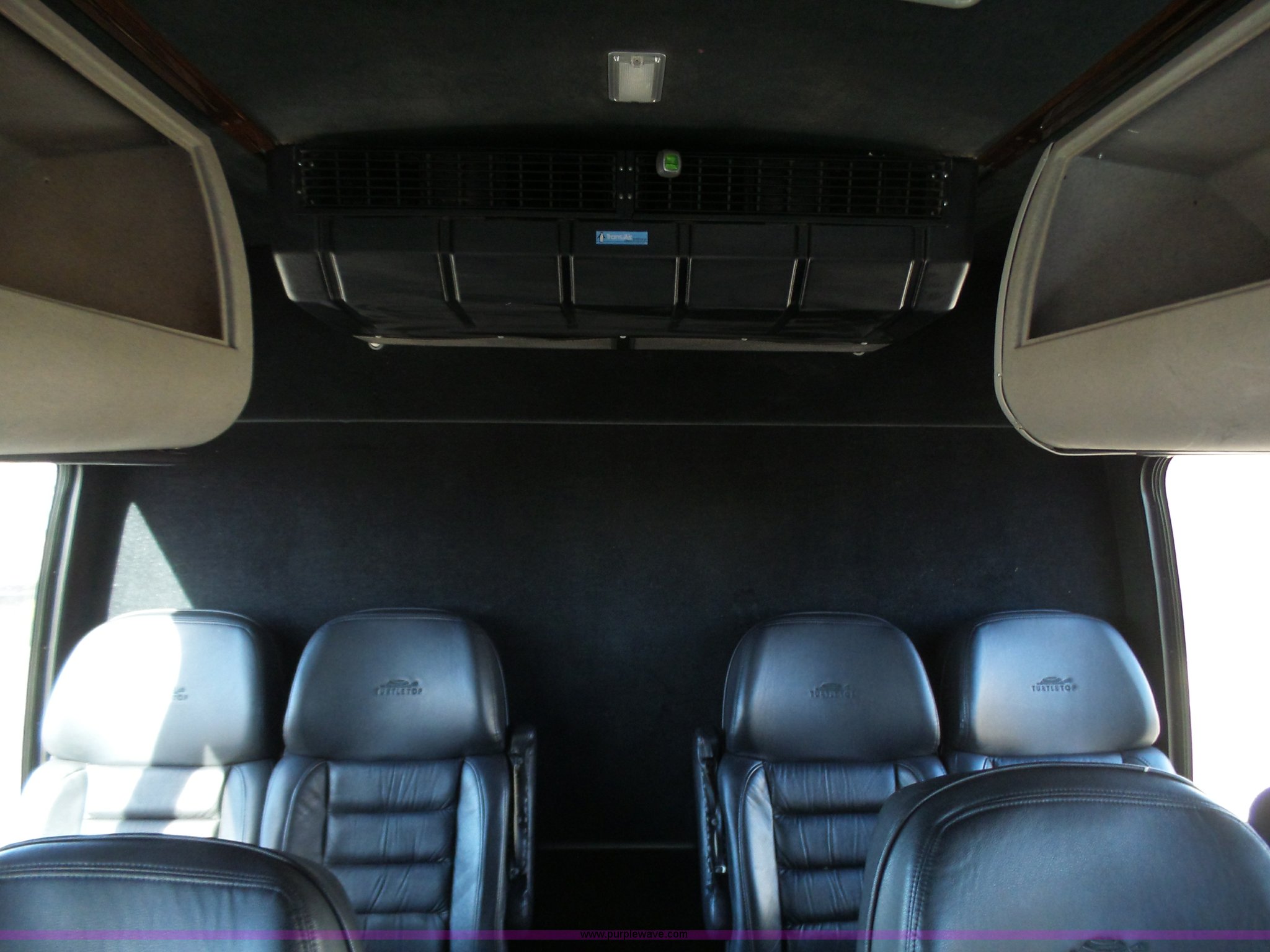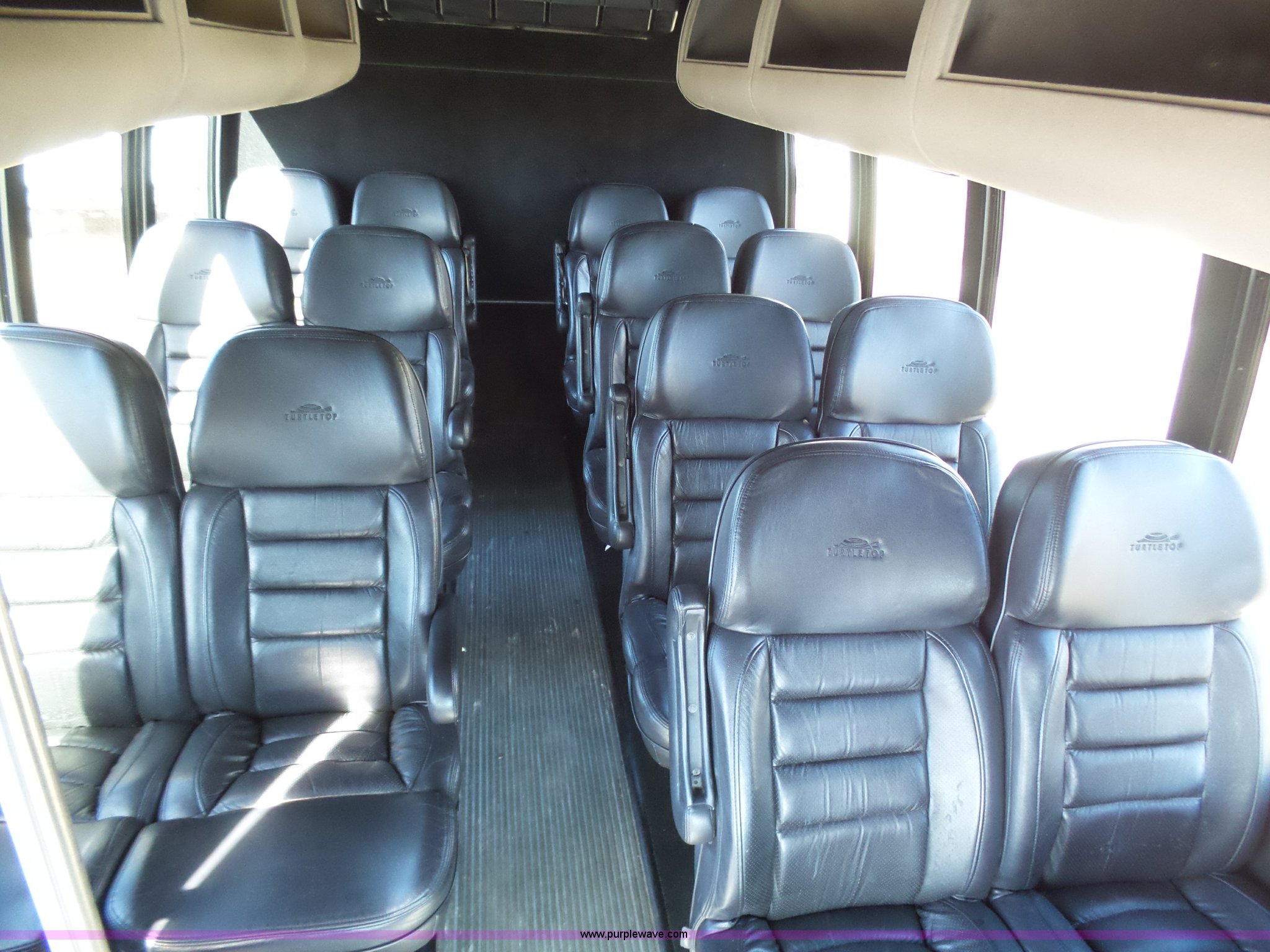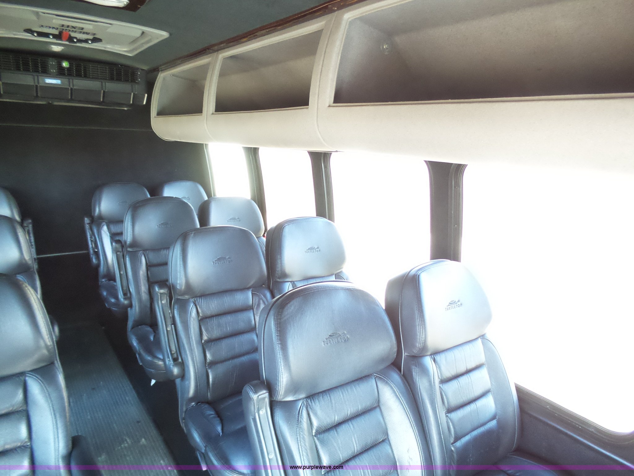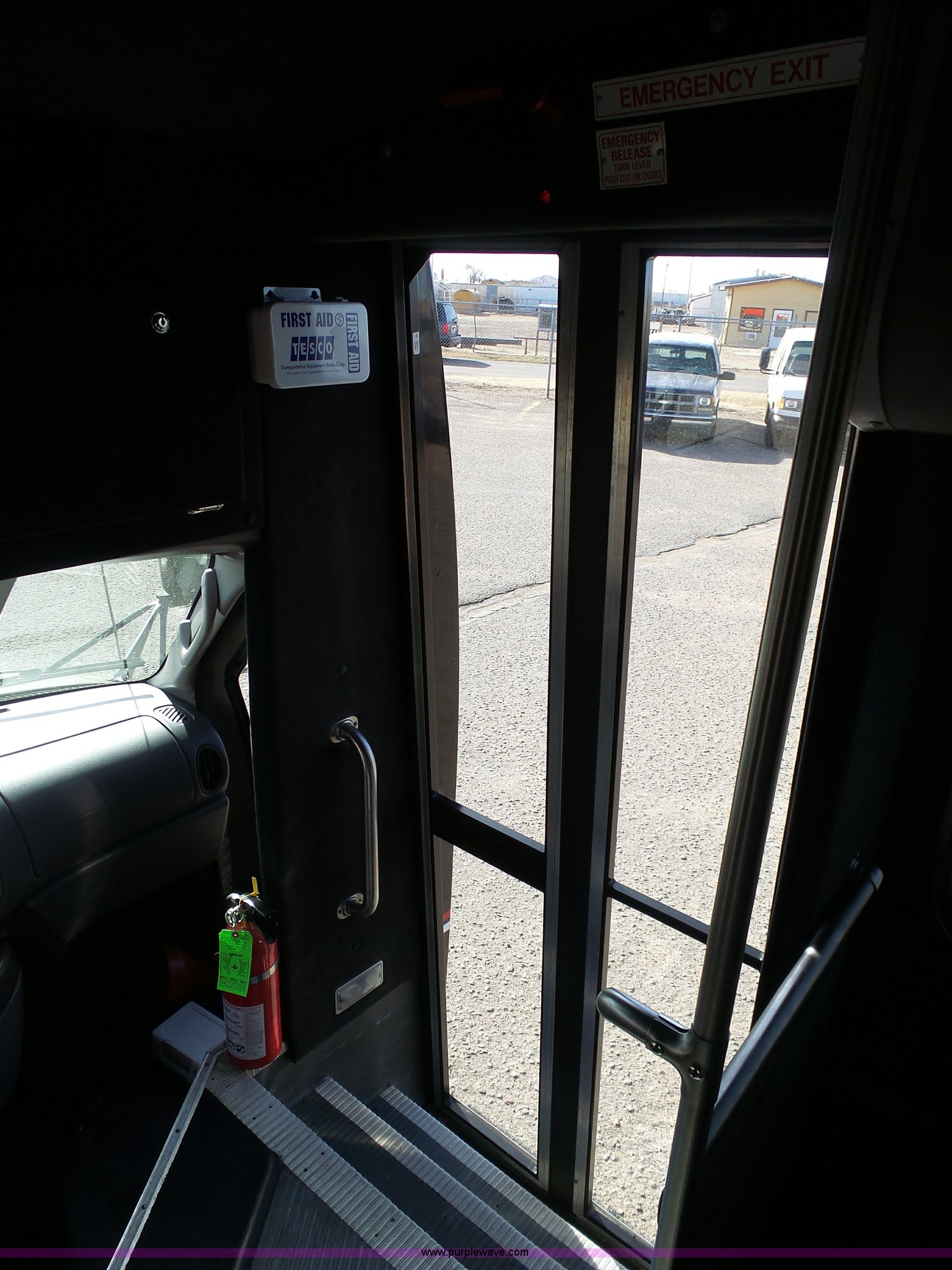 Purple Wave is selling a used Bus in Kansas. This item is a 2006 Ford Econoline E450 shuttle bus with the following: 133,771 miles on odometer, 6.8L V10 SOHC 20V gas engine, Serial 6FMXH06.86H5, Automatic transmission, Single axle, AC and heat, Tilt, Cruise, AM/FM/CD, Suspension seat, Power and heated mirrors, Electric passenger sliding door, Overhead storage, 14 passenger capacity, Ceiling, front, and side emergency egress, Block heater, Rear entry closest/storage, 92"W x 82"H x 31"D, Intercom system, Rear AC and heat, Overhead lighting, Overhead TV/CD/DVD/MP3 player, Turtle top leather bucket seats, Spring suspension, Hydraulic brakes, 158" wheelbase, LT225/75R16 tires, Interior/exterior cosmetic damage, Removable vinyl decals