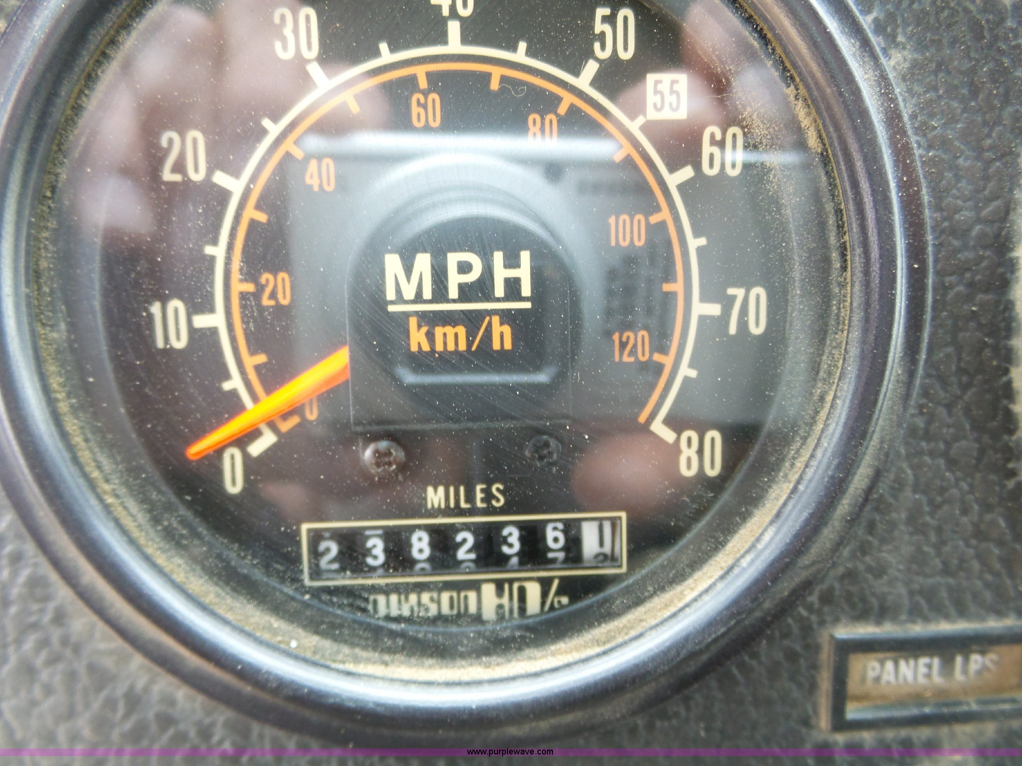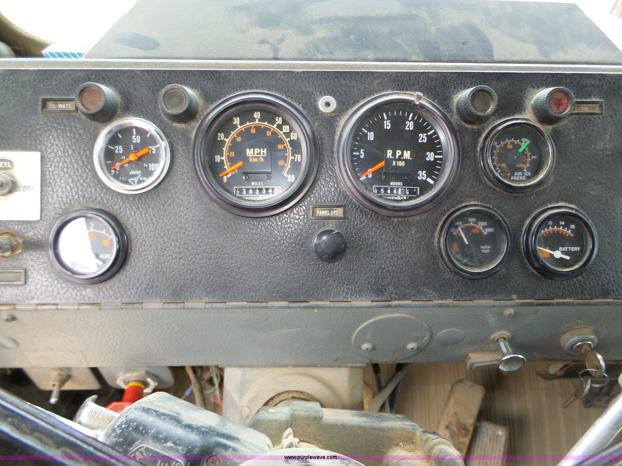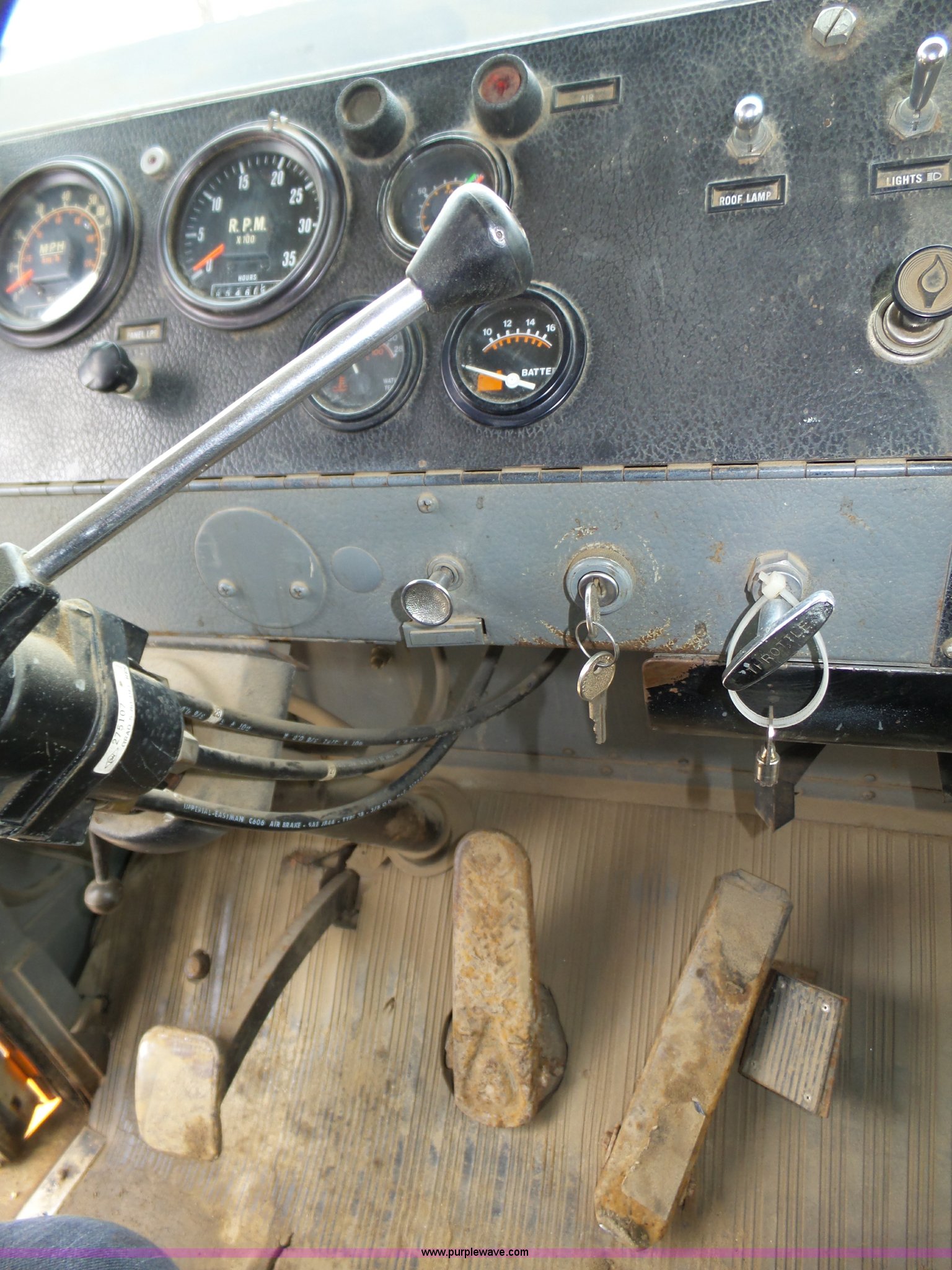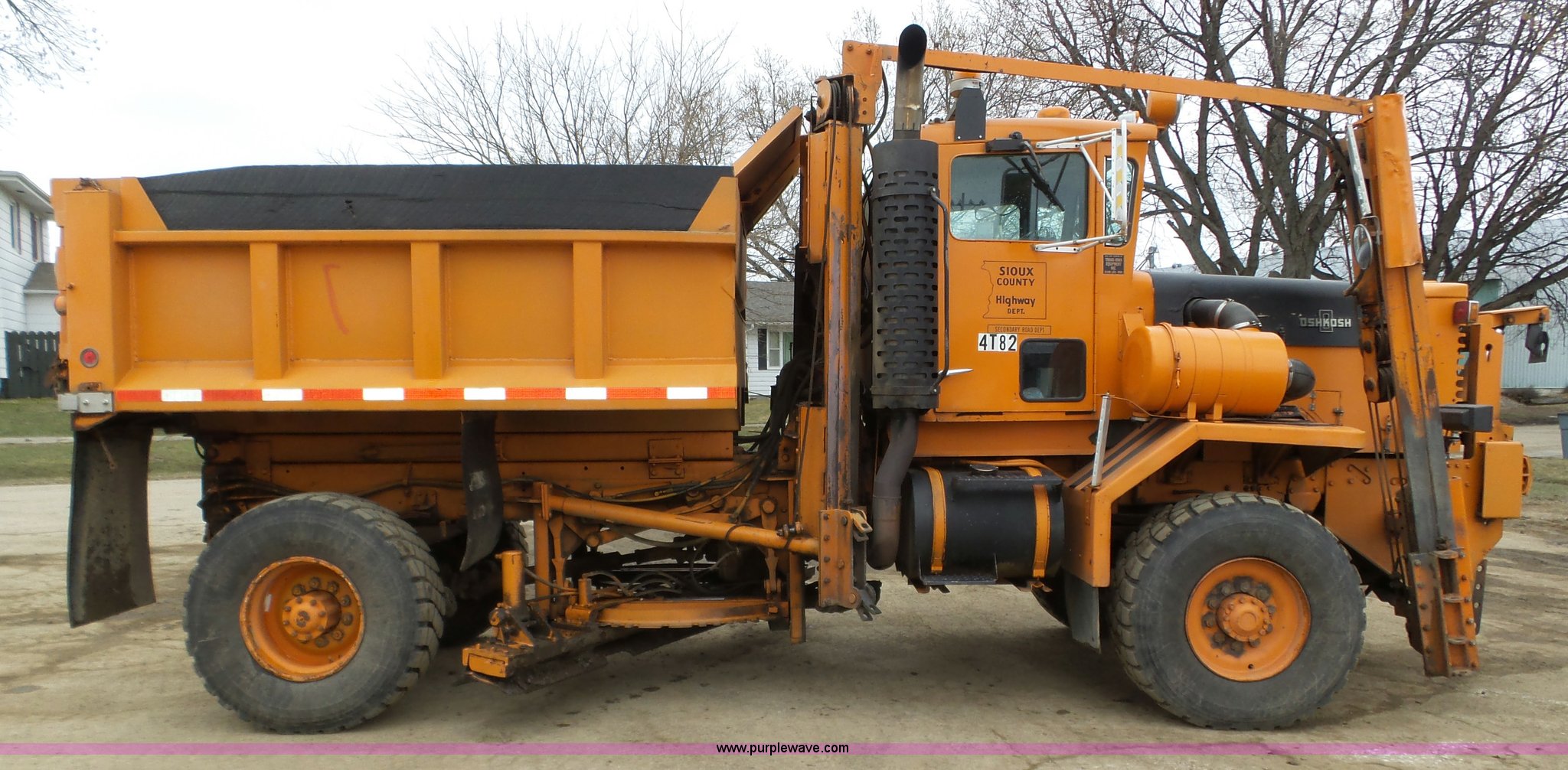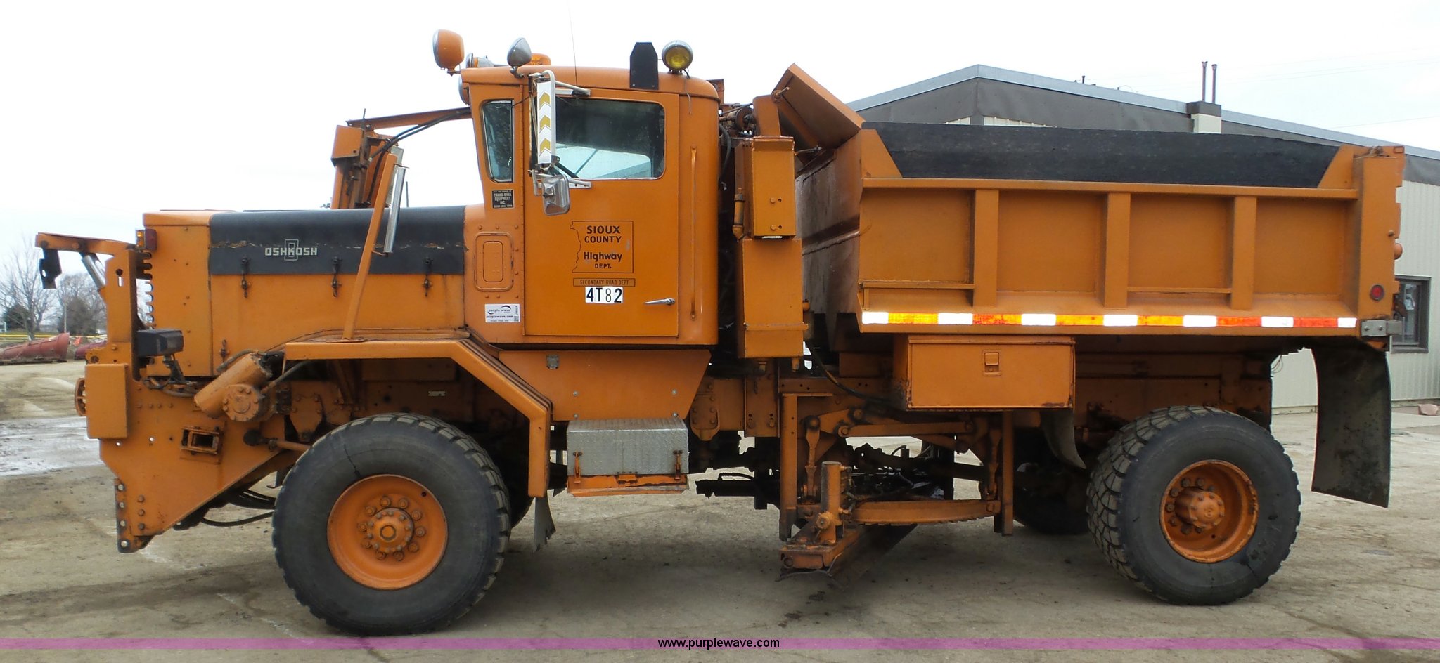 Purple Wave is selling a used Construction Dump Truck in Iowa. This item is a 1982 Oshkosh P23236 dump truck with the following: 238,237 miles on odometer, Cummins six cylinder turbo diesel engine, 4T82 transmission, Five gears with splitter, Three speed auxiliary transmission, Four wheel drive, Single axle, Heat, AM/FM/cassette, Air suspension seat, Motorola two way radio, Block heater, PTO, Steel dump bed, 10'L x 95"W, 36" side height, 106" from ground to top of sides, Liner, Single ram single stage hoist, Toolboxes, 10'W x 15"H grader blade, Bolt-on cutting edge, Plumbed for plow and side blade, Single fuel tank, Single rear exhaust stack, Spring suspension, Pintle hitch, Air brakes, 174" wheelbase, 445/65R22.5 tires, GVWR 59,160 lbs, FAWR 19,720 lbs, RAWR 19,720 lbs, Passenger door will not open, Contents are not included, Unit# 4T82