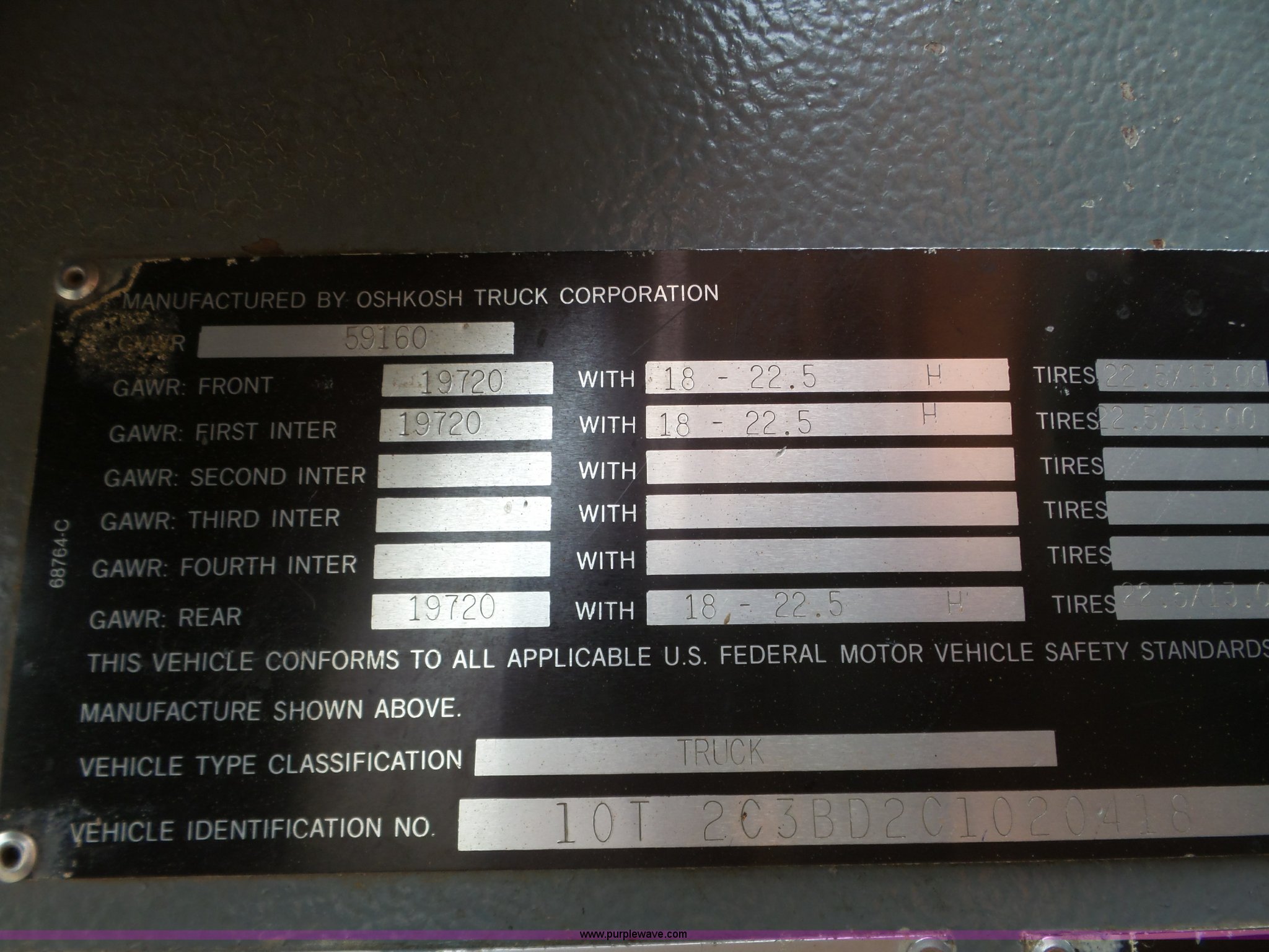 1982 Oshkosh P23236 dump truck. 238,237 miles on odometer, Cummins six cylinder turbo diesel engine, 4T82 transmission Five gears with splitter, Three speed auxiliary transmission, Four wheel drive, Single axle, Heat, AM/FM/cassette, Air suspension seat, Motorola two way radio, Block heater, PTO, Steel dump bed 10'L x 95"W , 36" side height, 106" from ground to top of sides, Liner, Single ram single stage hoist, Toolboxes, 10'W x 15"H grader blade Bolt-on cutting edge, Plumbed for plow and side blade, Single fuel tank, Single rear exhaust stack, Spring suspension, Pintle hitch, Air brakes, 174" wheelbase, 445/65R22.5 tires, GVWR 59,160 lbs, FAWR 19,720 lbs, RAWR 19,720 lbs, Passenger door will not open, Contents are not included, Unit# 4T82. View repairs. Seller is a government entity who will be assigning and distributing the title. Please contact the seller for distribution questions. 10T2C3BD2C1020418. Sioux County. 204 N. Sherman Street. Boyden, IA 51234
