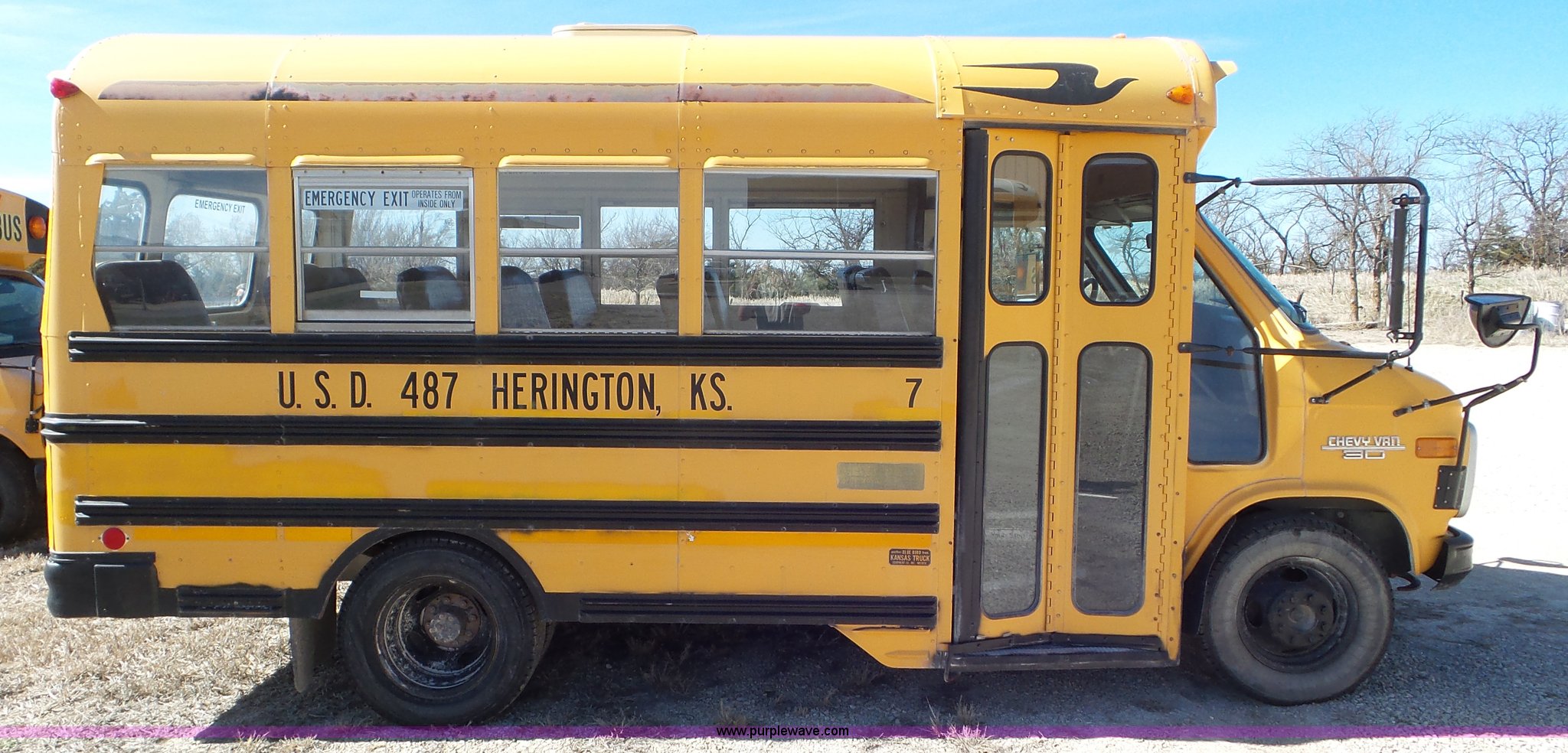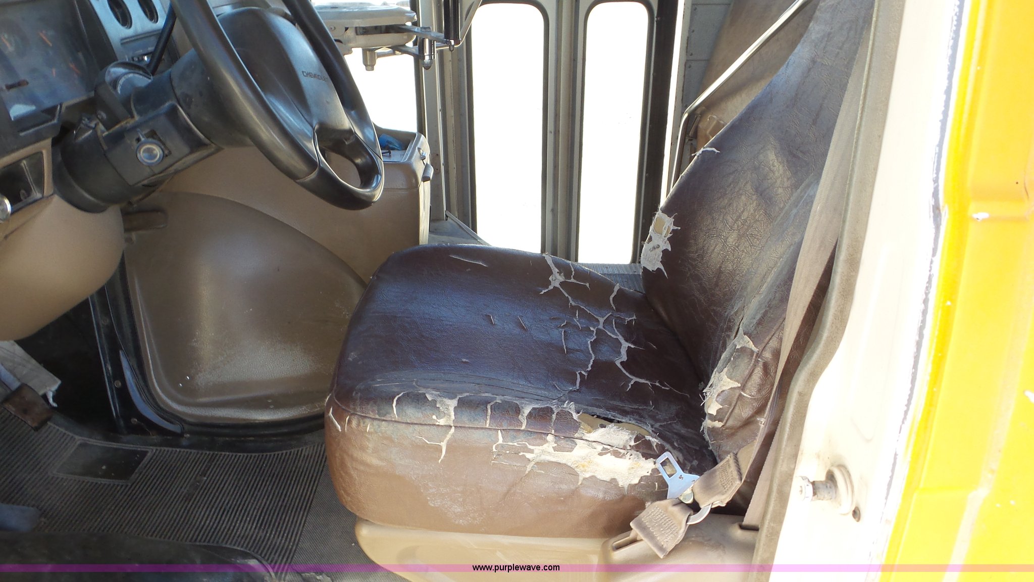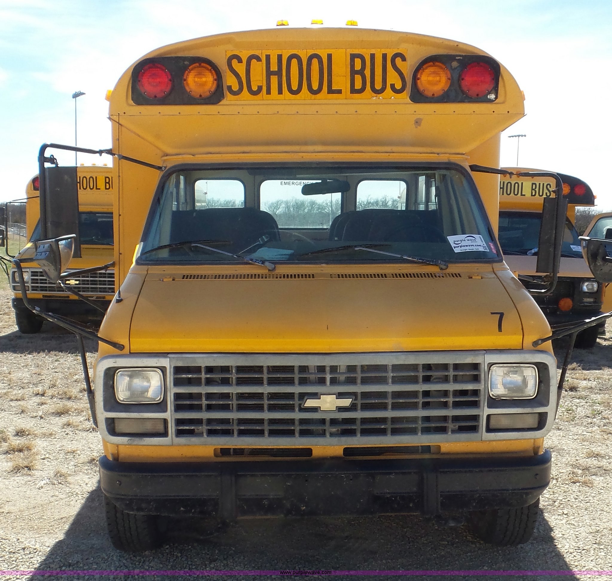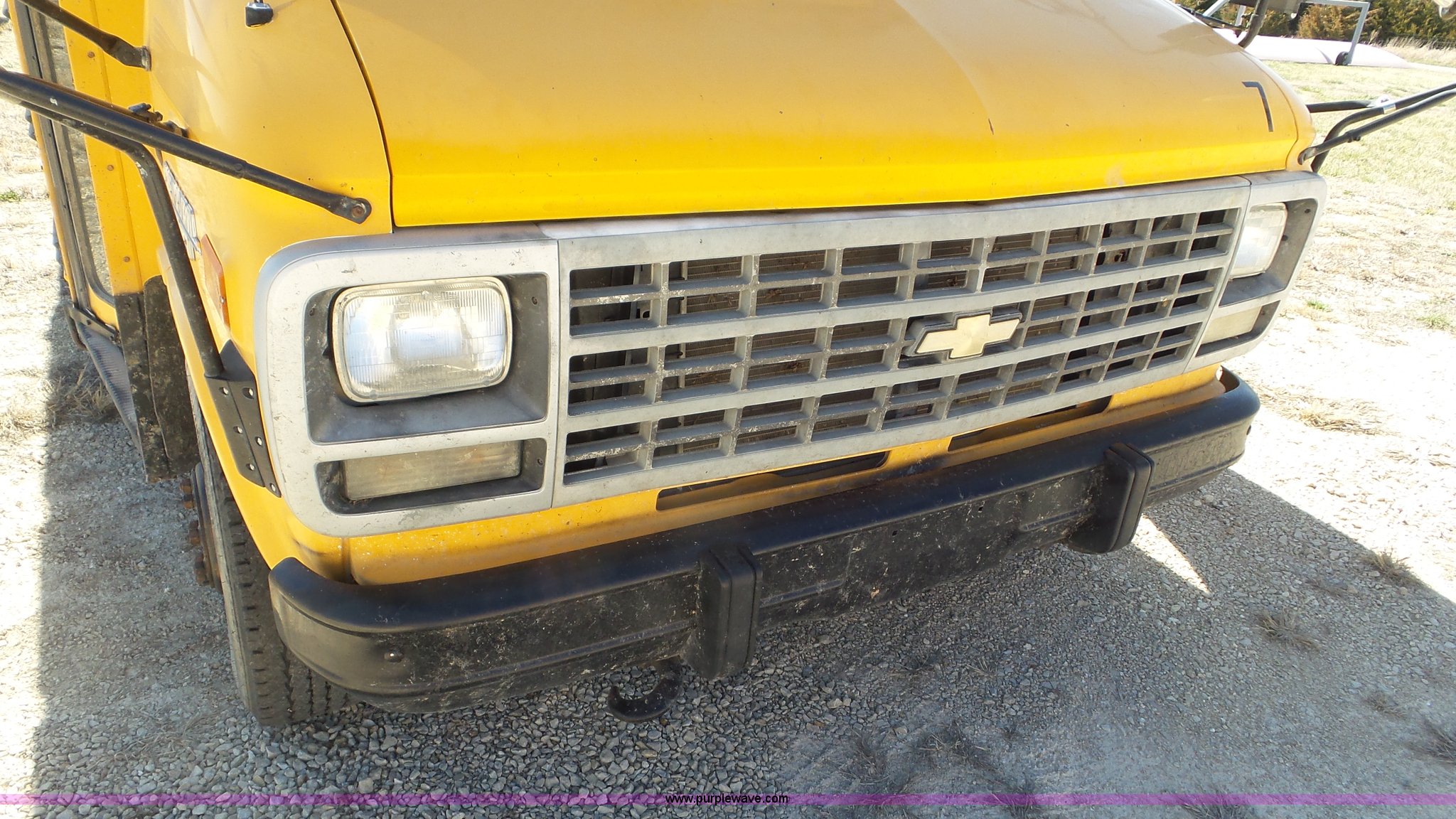 Purple Wave is selling a used Bus in Kansas. This item is a 1993 Chevrolet G30 school bus with the following: 216,890 miles on odometer, 5.7L V8 OHV 16V gas engine, Automatic transmission, Single axle, Heat, AM/FM, Auxiliary controls, 21 passenger capacity, Seat belts, Ceiling, rear, and side window emergency, Front and rear tow hooks, Lighted stop sign, Spring suspension, Hydraulic brakes, 225/75R16 tires, GVWR 10,000 lbs, Rear end is going out
