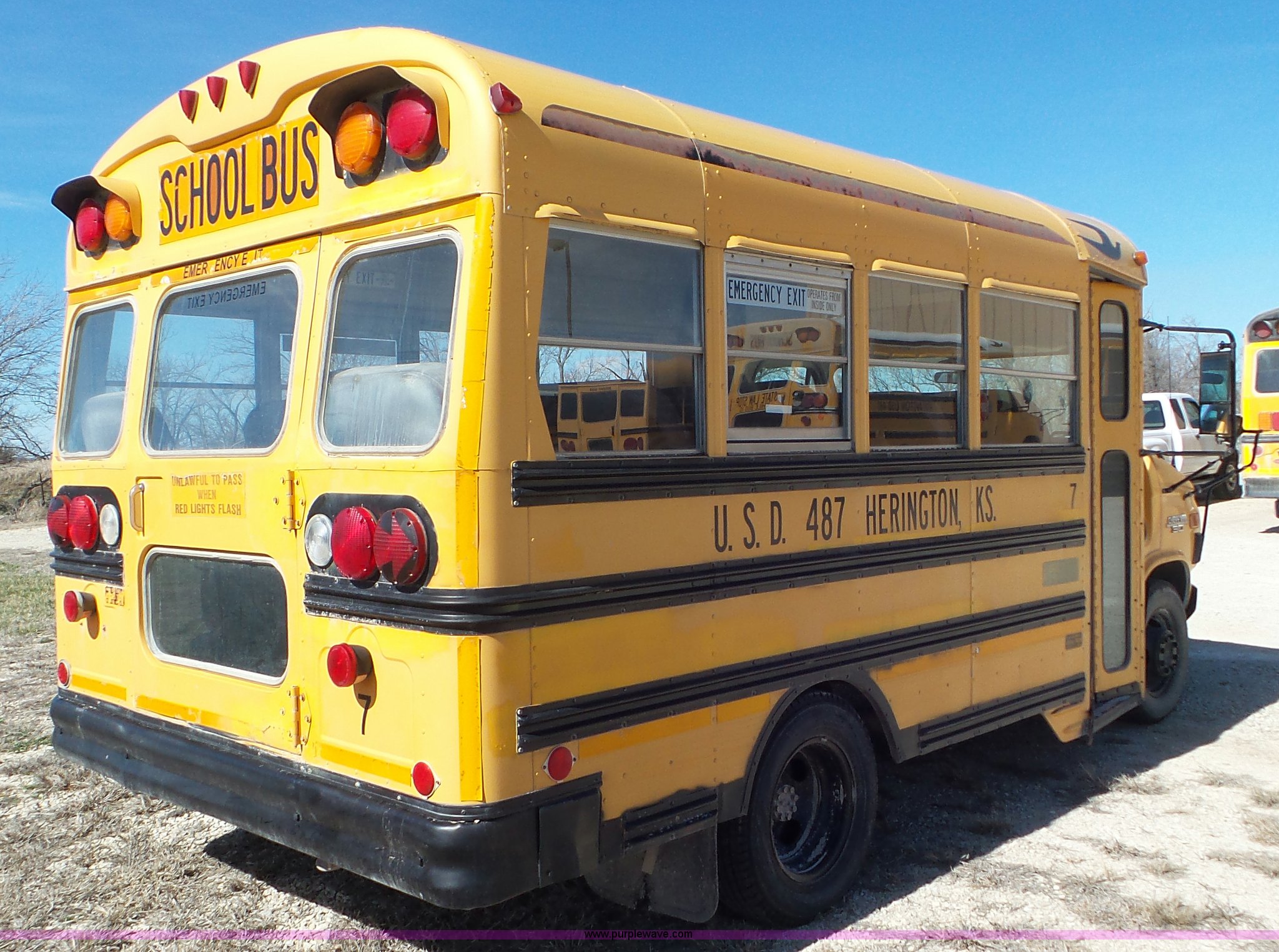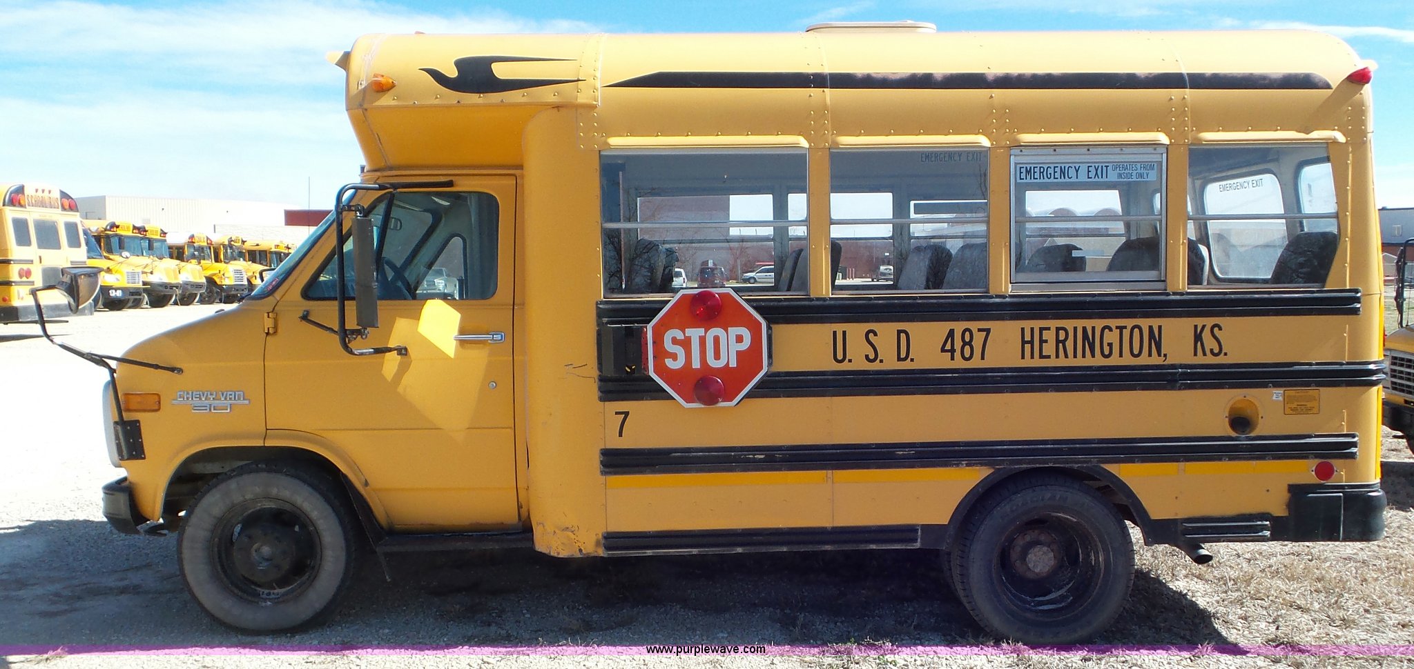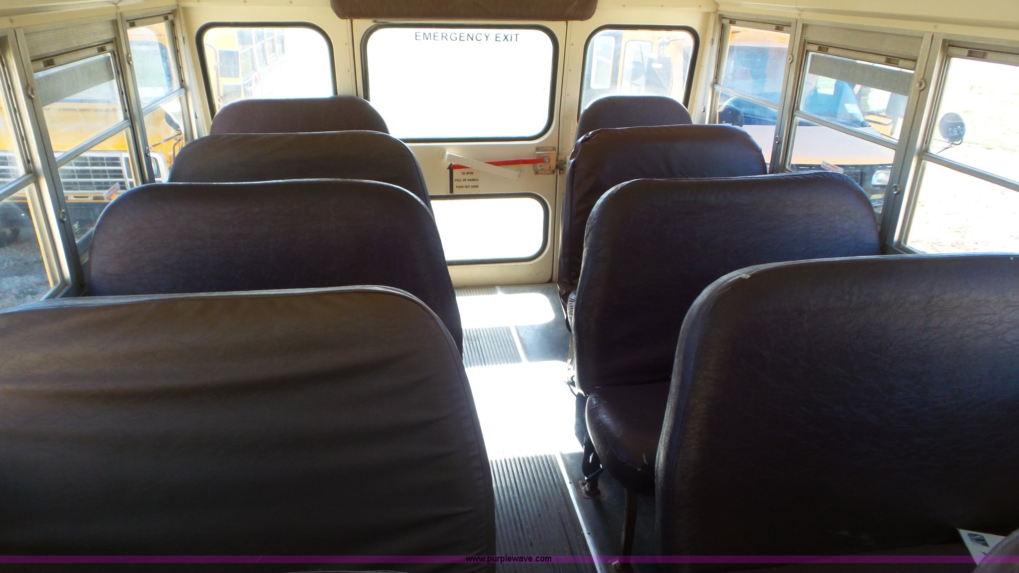 Purple Wave is selling a used Bus in Kansas. This item is a 1993 Chevrolet G30 school bus with the following: 216,890 miles on odometer, 5.7L V8 OHV 16V gas engine, Automatic transmission, Single axle, Heat, AM/FM, Auxiliary controls, 21 passenger capacity, Seat belts, Ceiling, rear, and side window emergency, Front and rear tow hooks, Lighted stop sign, Spring suspension, Hydraulic brakes, 225/75R16 tires, GVWR 10,000 lbs, Rear end is going out