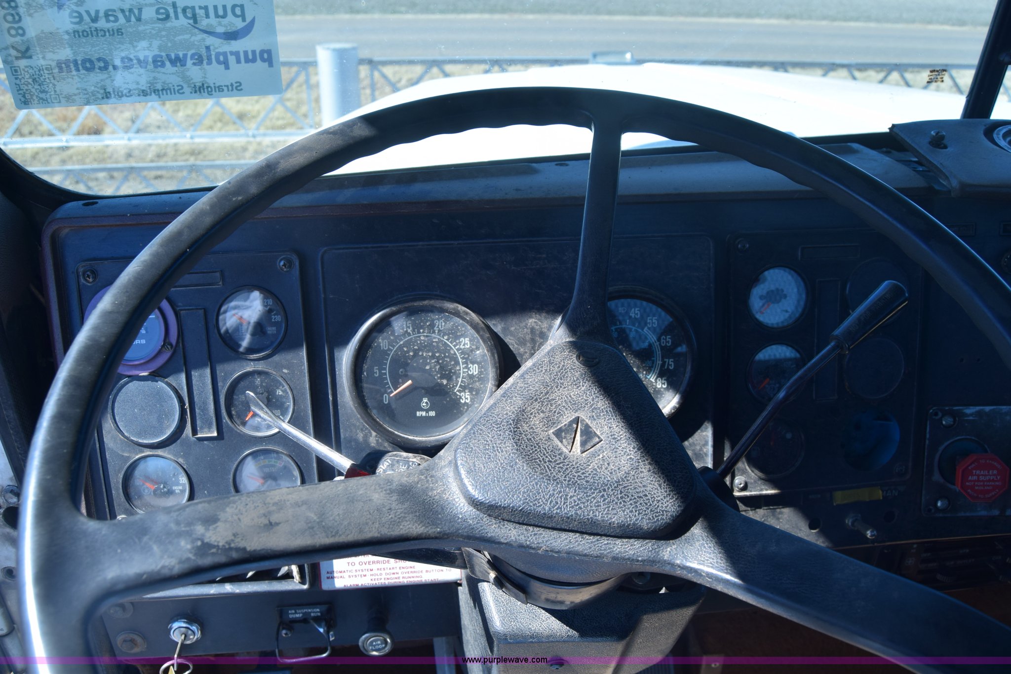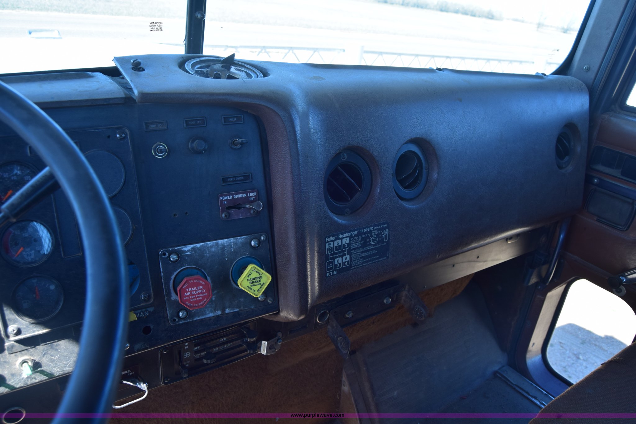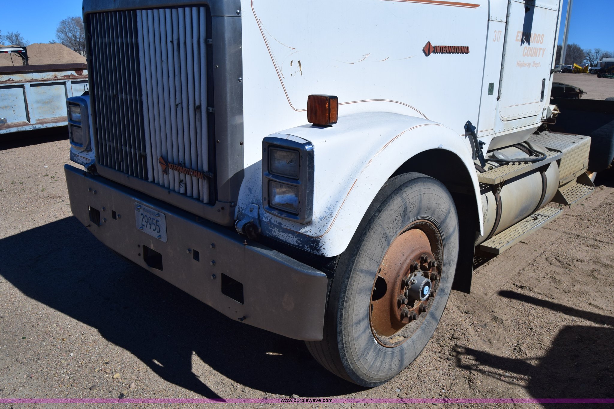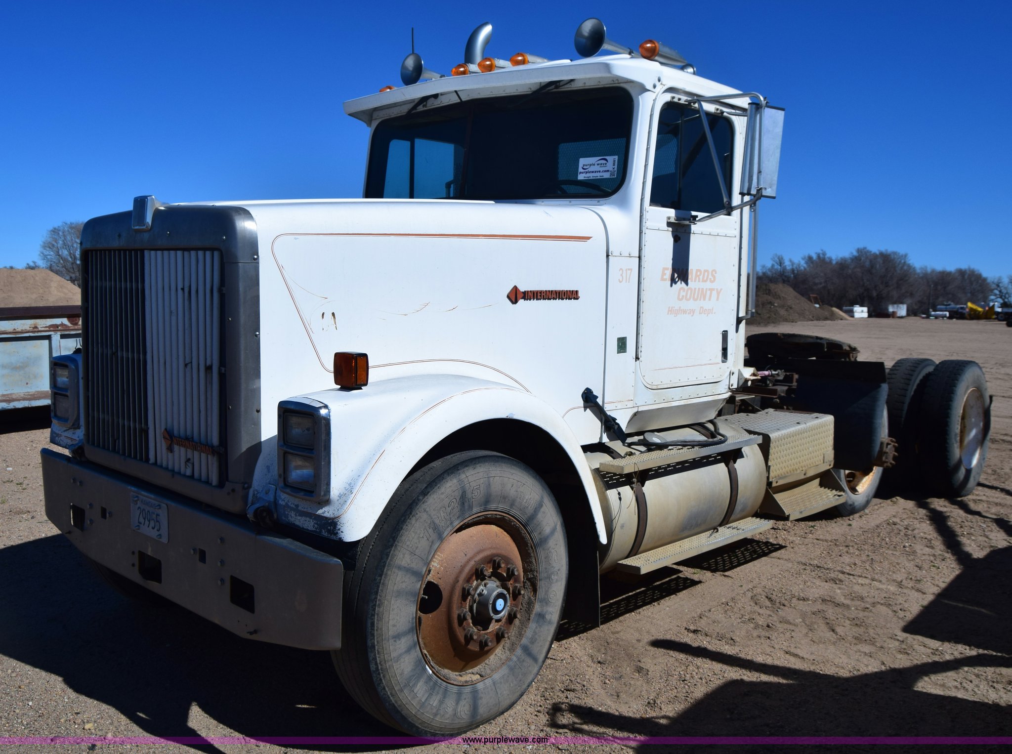 Purple Wave is selling a used Truck Tractor in Kansas. This item is a 1988 International F9370 semi truck with the following: 906,419 miles on odometer, Cummins NTC diesel engine, 400 HP, Engine is bad, Eaton Fuller 13 speed manual transmission, Tandem axle, AC and heat, Manual windows and locks, Air suspension seat, Single exhaust stack, Dual fuel tanks, Air suspension, 191" wheelbase, 11R24.5 tires