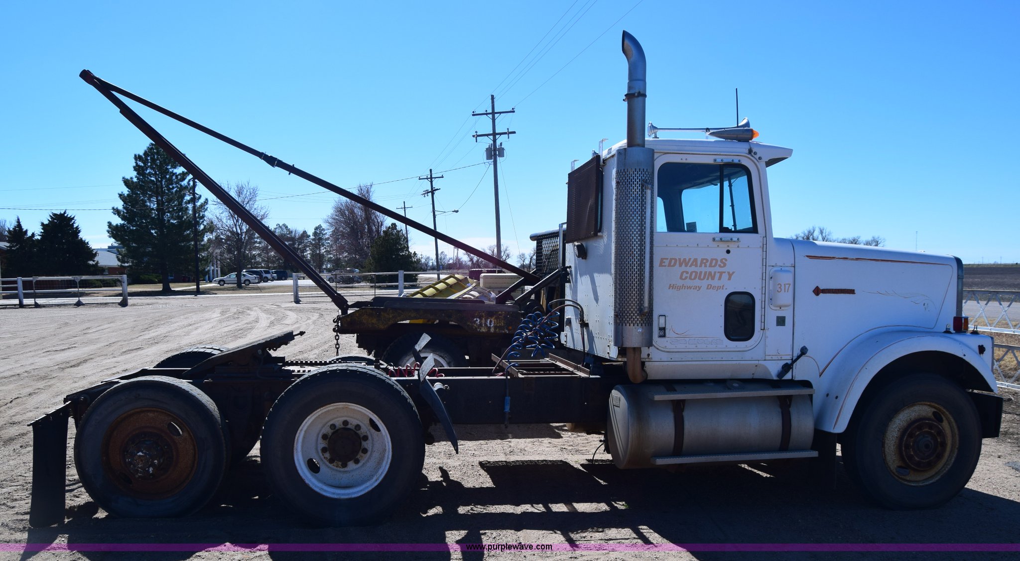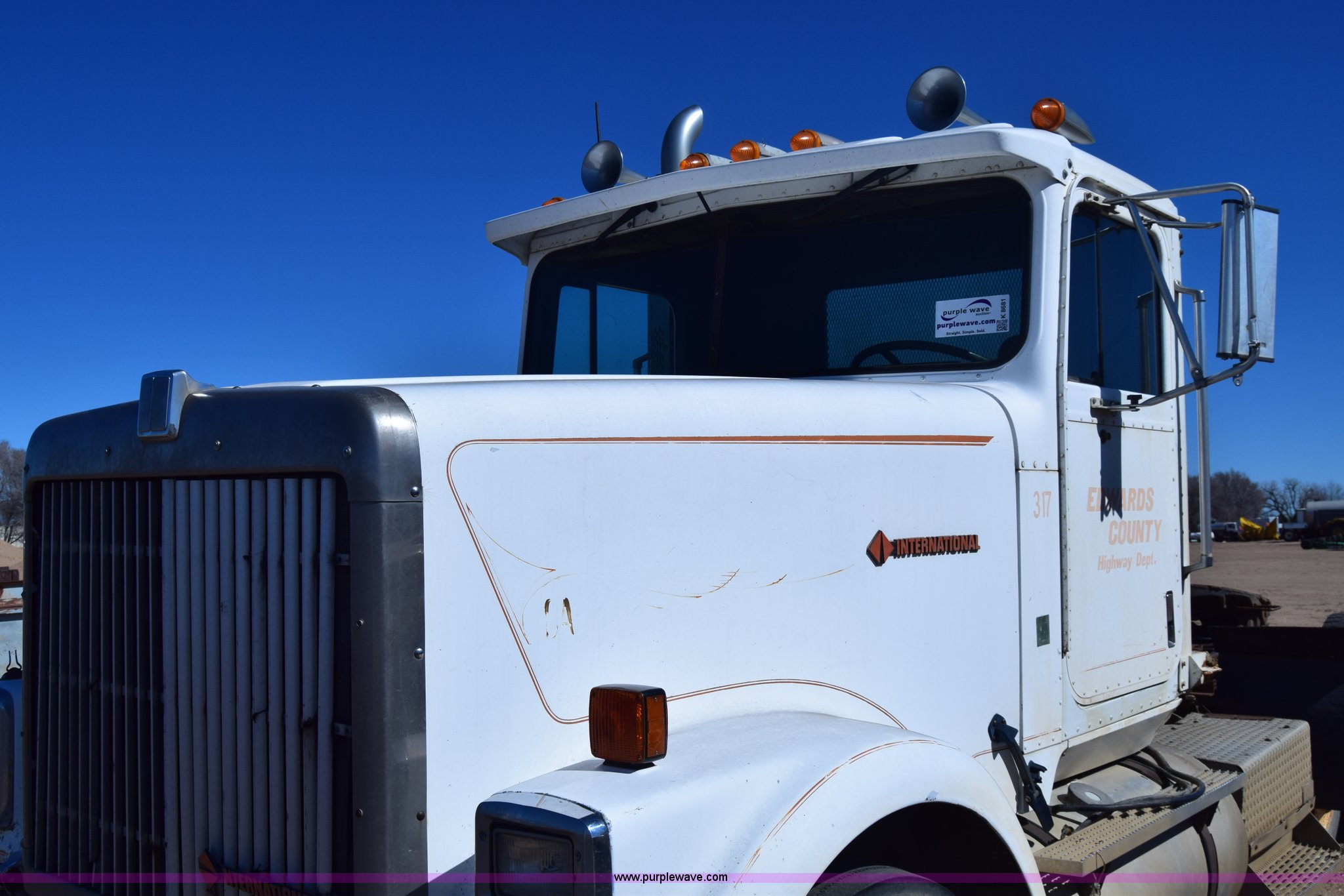 1988 International F9370 semi truck. 906,419 miles on odometer, Cummins NTC diesel engine 400 HP, Engine is bad, Eaton Fuller 13 speed manual transmission, Tandem axle, AC and heat, Manual windows and locks, Air suspension seat, Single exhaust stack, Dual fuel tanks, Air suspension, 191" wheelbase, 11R24.5 tires. 2HSFBGSR6JC006475. Edwards County Public Works. 730 W 6th. Kinsley, KS 67547