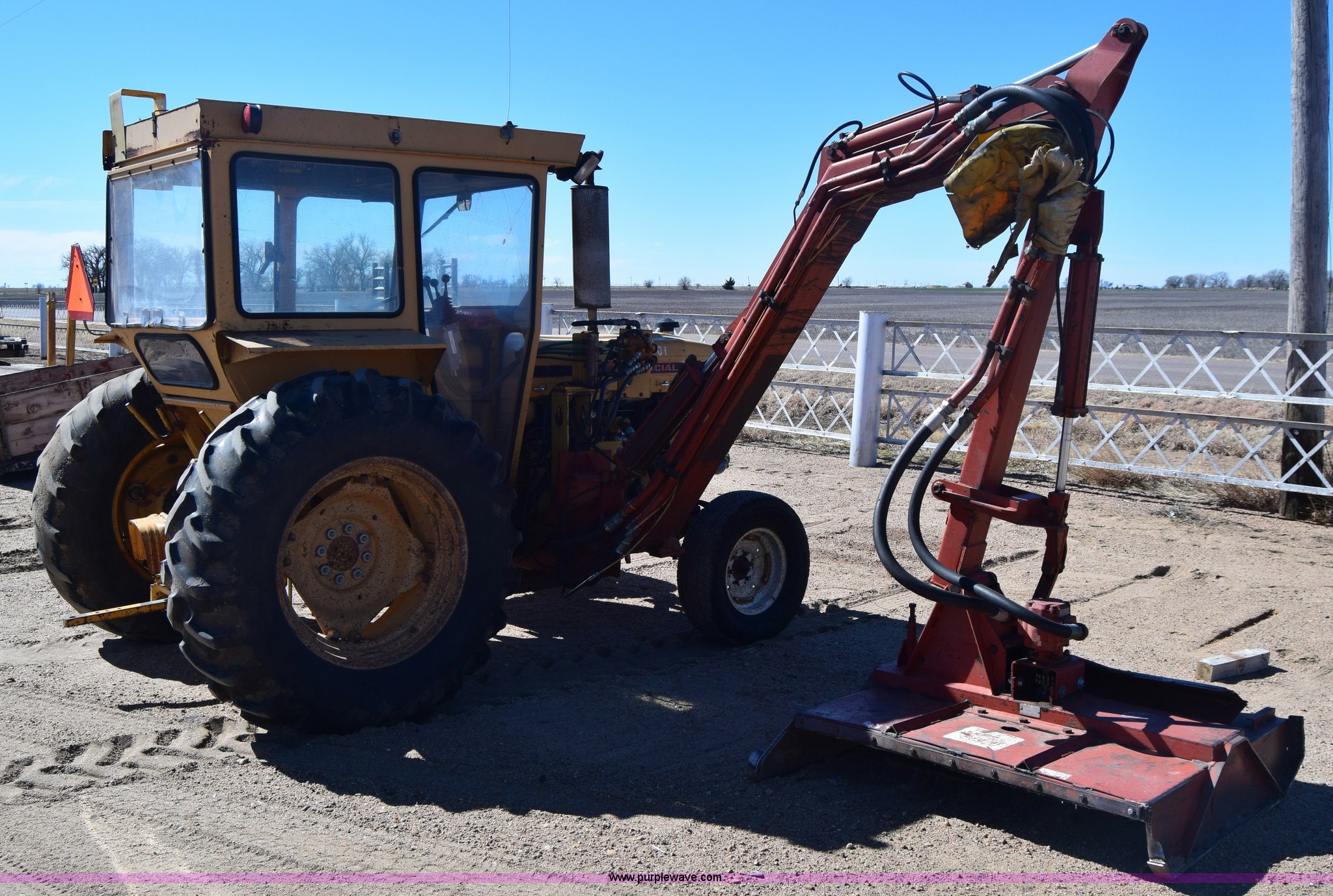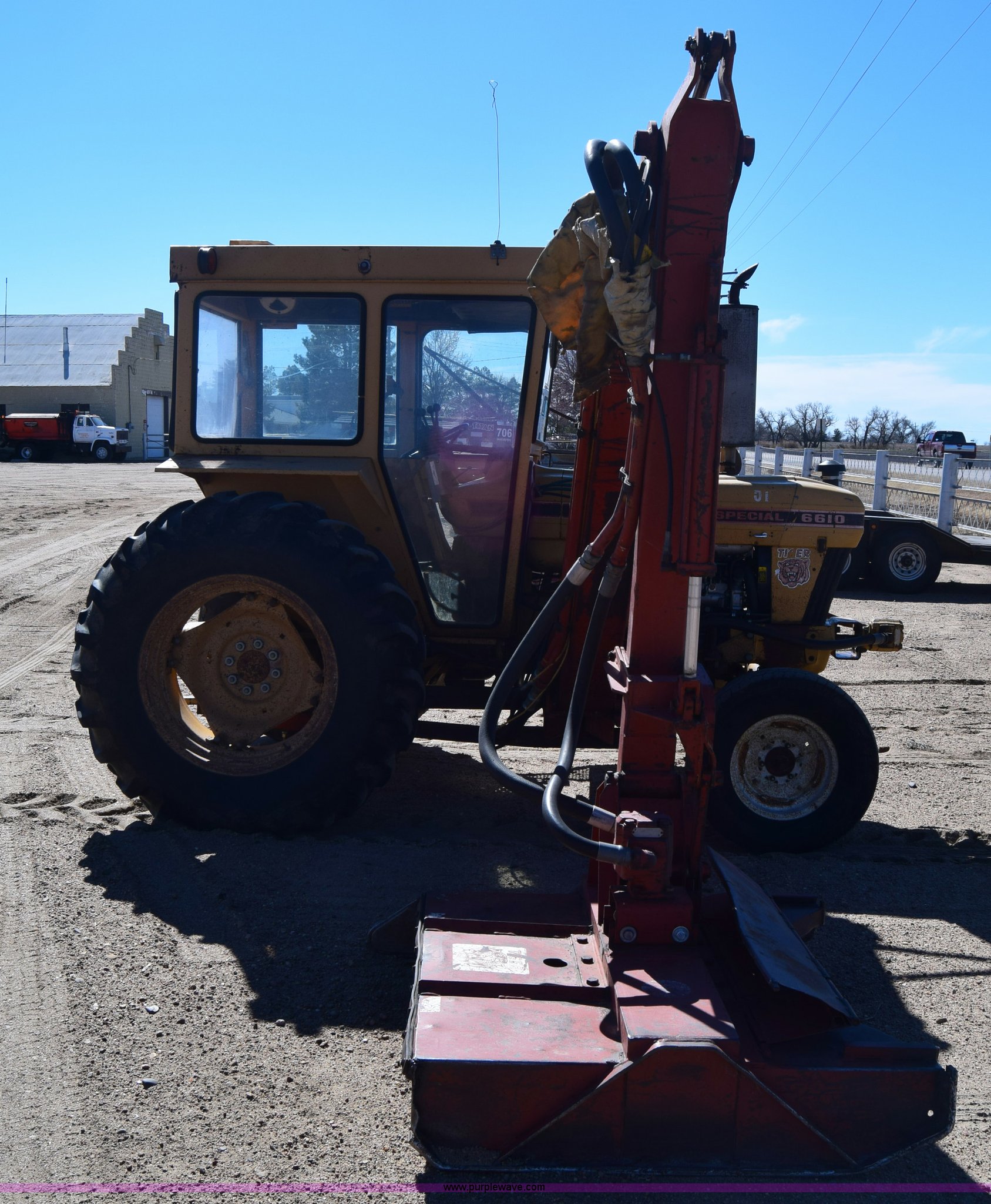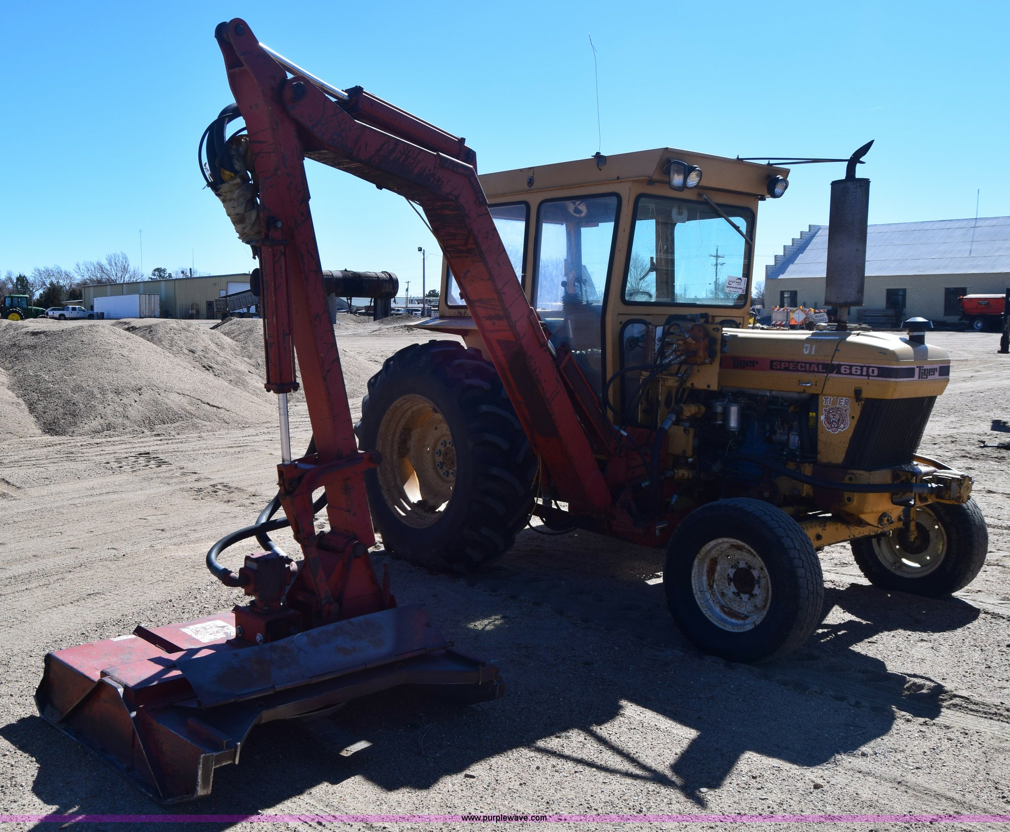 Ford Tiger Special 6610 tractor. 4,065 hours on meter, Ford four cylinder diesel engine, Manual transmission 8F-2R gears, Enclosed cab AC and heat, AM/FM, Work lights, Hydraulic boom mower 4'W, 14' reach, Wheel weights, LT265/75R16 front tires, 16.3-30 rear tires, Glass cracked, Power steering is weak Leaks hydraulic fluid. Edwards County Public Works. 730 W 6th. Kinsley, KS 67547