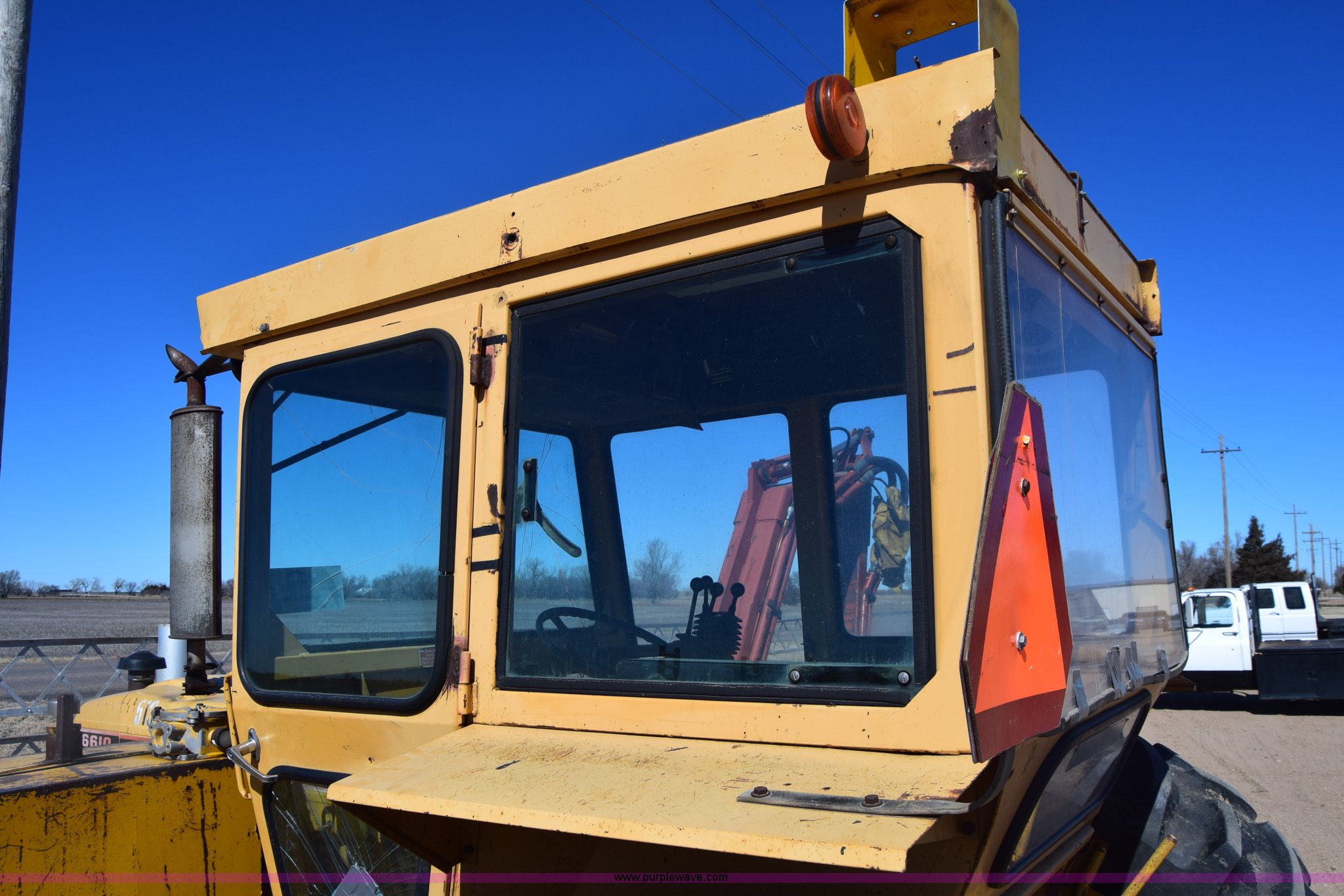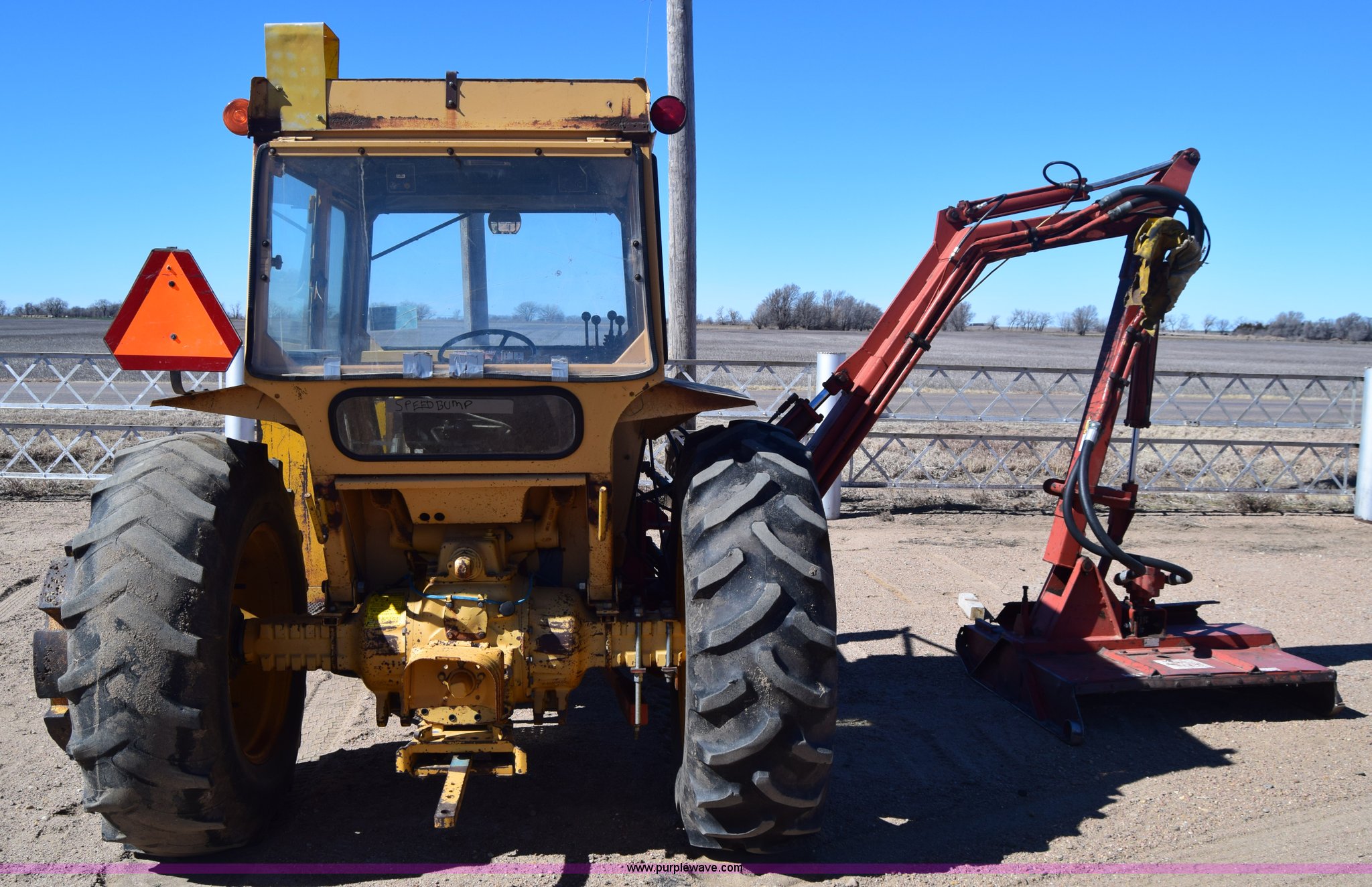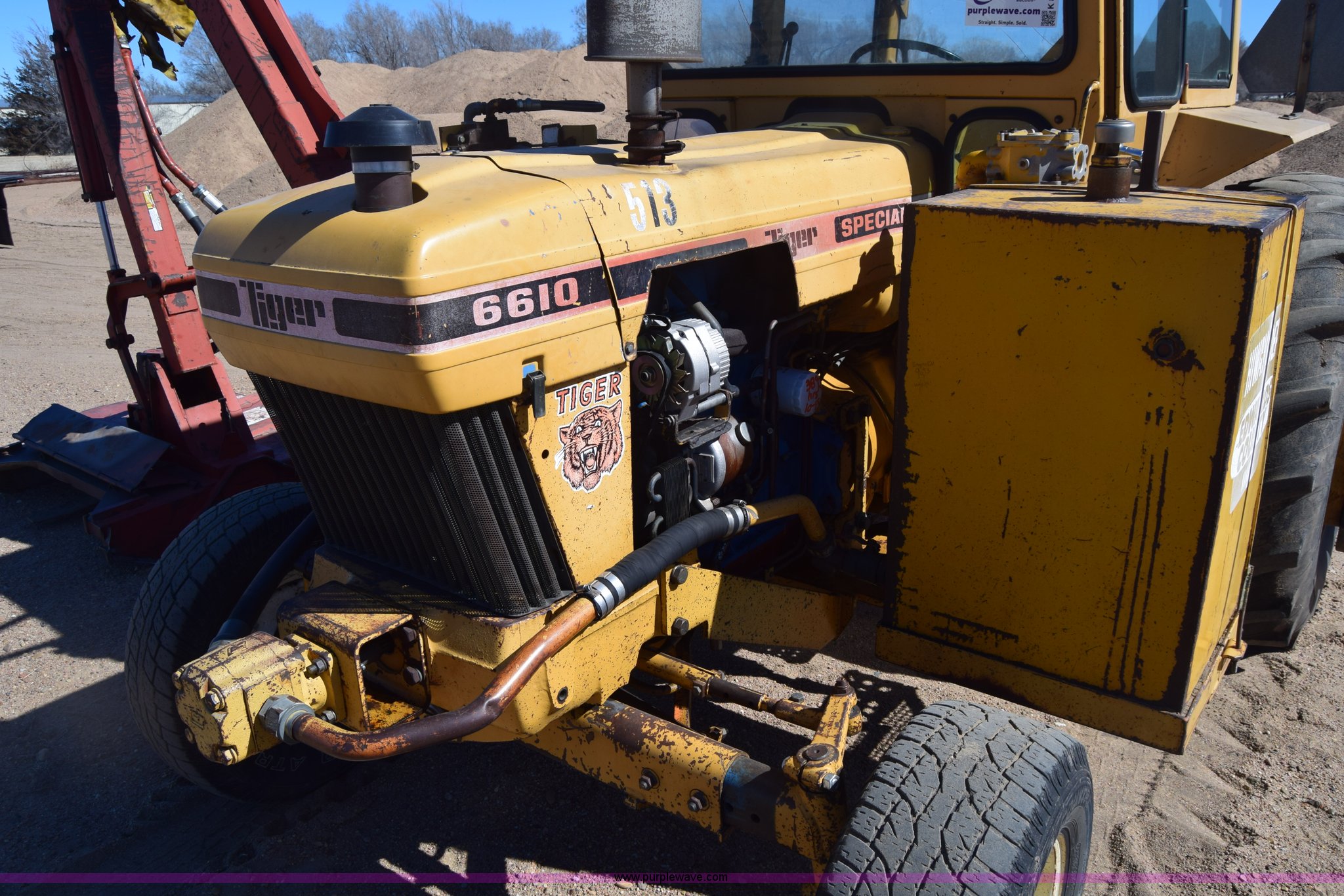 Purple Wave is selling a used Tractor in Kansas. This item is a Ford Tiger Special 6610 tractor with the following: 4,065 hours on meter, Ford four cylinder diesel engine, Manual transmission, 8F-2R gears, Enclosed cab, AC and heat, AM/FM, Work lights, Hydraulic boom mower, 4'W, 14' reach, Wheel weights, LT265/75R16 front tires, 16.3-30 rear tires, Glass cracked, Power steering is weak, Leaks hydraulic fluid