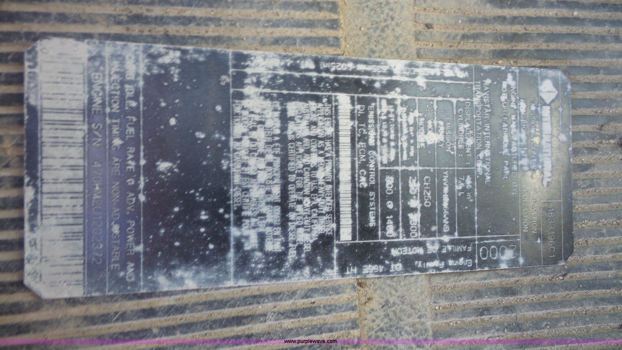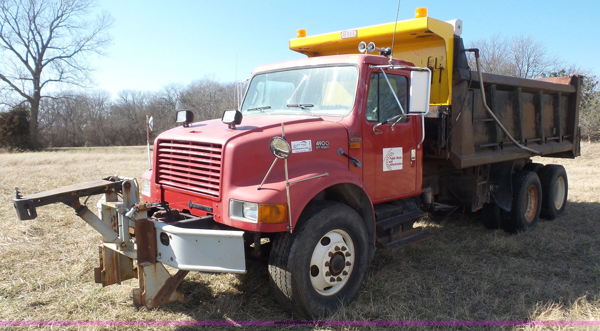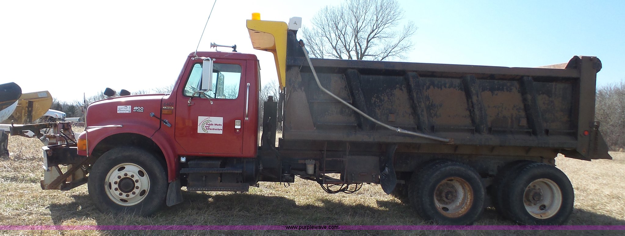 Purple Wave is selling a used Construction Dump Truck in Kansas. This item is a 2000 International F4900 dump truck with the following: 152,635 miles on odometer, 7,645 hours on meter, International DT466E 7.6L L6 turbo diesel engine, 250 HP, Serial 470HM2U1202372, Automatic transmission, Tandem axle, Inter-axle differential lock, AC and heat, Cruise, AM/FM/weatherband, Heated mirrors, Vinyl interior, Block heater, Command All plow control, Force SSC5100 spreader controls, Front mounted PTO with plow bracket, Heil steel dump bed, 15'L x 8'W, 45" side height, Rollover tarp, Single ram hoist, Air operated end gate, Spreader hookups, Trailer wiring, Spring suspension, Air brakes, 210" wheelbase, 315/80R22.5 front tires, 11R22.5 tires, PDL light is on, Paint faded, Rust, Unit# PWK4401