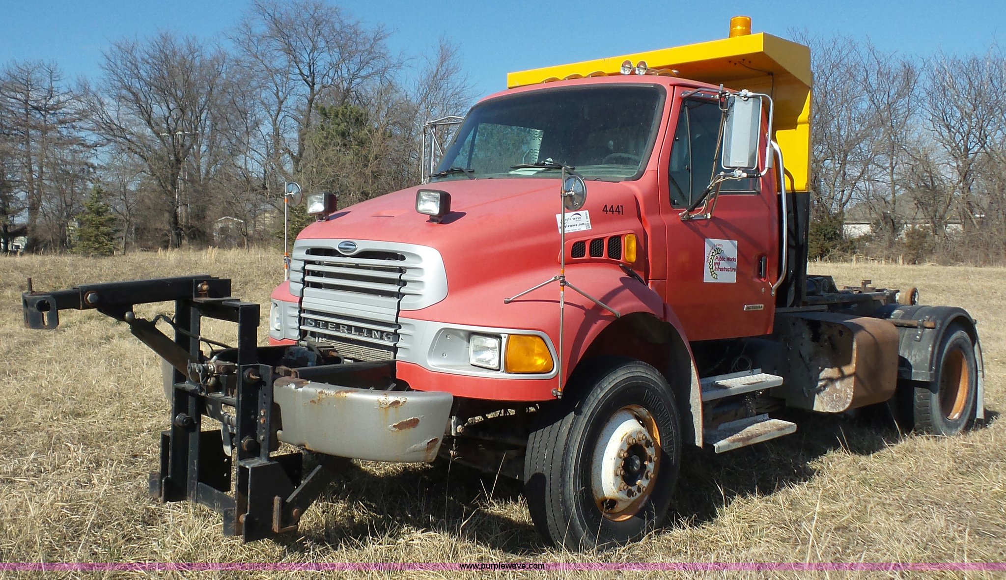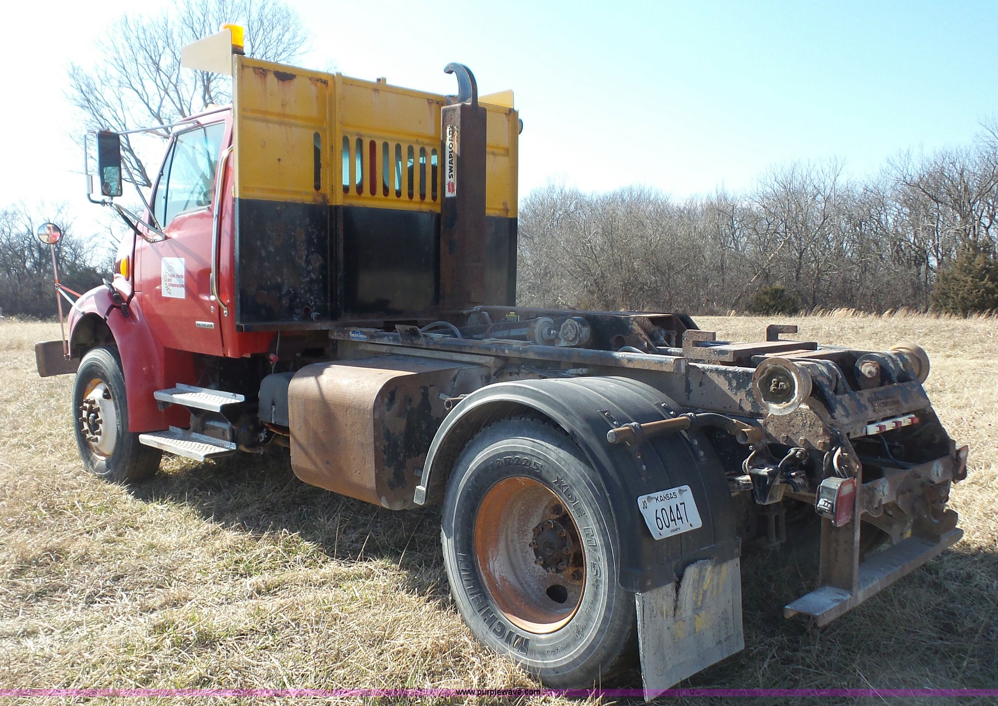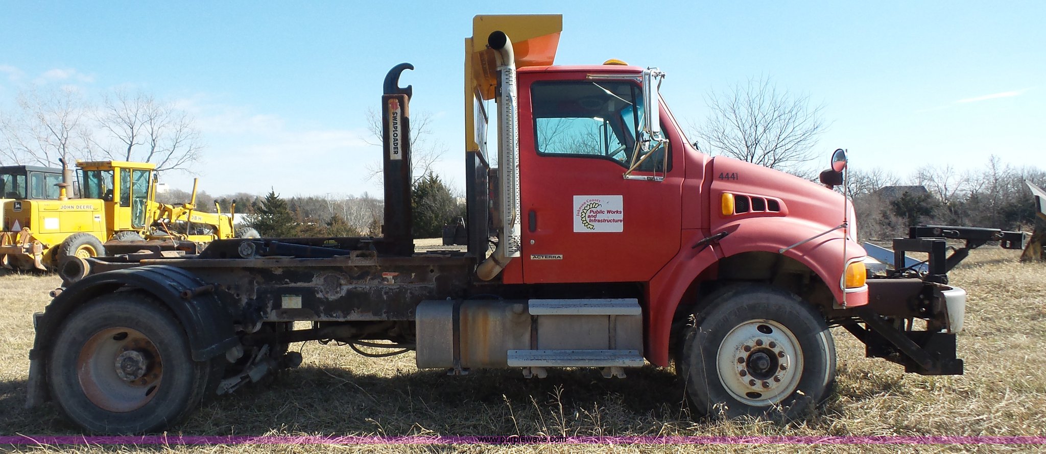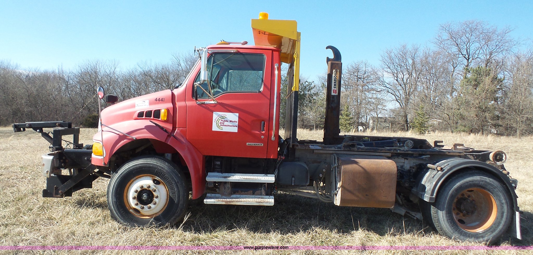 Purple Wave is selling a used Rollback or Tow Truck in Kansas. This item is a 2004 Sterling Acterra roll off container truck with the following: 54,782 miles on odometer, Caterpillar 3126 7.2L L6 turbo diesel engine, Automatic transmission, Heat, AM/FM, Air suspension seat, Heated mirrors, Block heater, Beacon light, Command All plow control, Force spreader control, Front mounted PTO with plow bracket, Single exhaust stack, Swap loader, Pintle hitch, Trailer wiring, Spring suspension, Air brakes, 172" wheelbase, Michelin 12R22.5 tires, GVWR 37,000 lbs, FAWR 14,000 lbs, RAWR 23,000 lbs, Unit# PWK4441