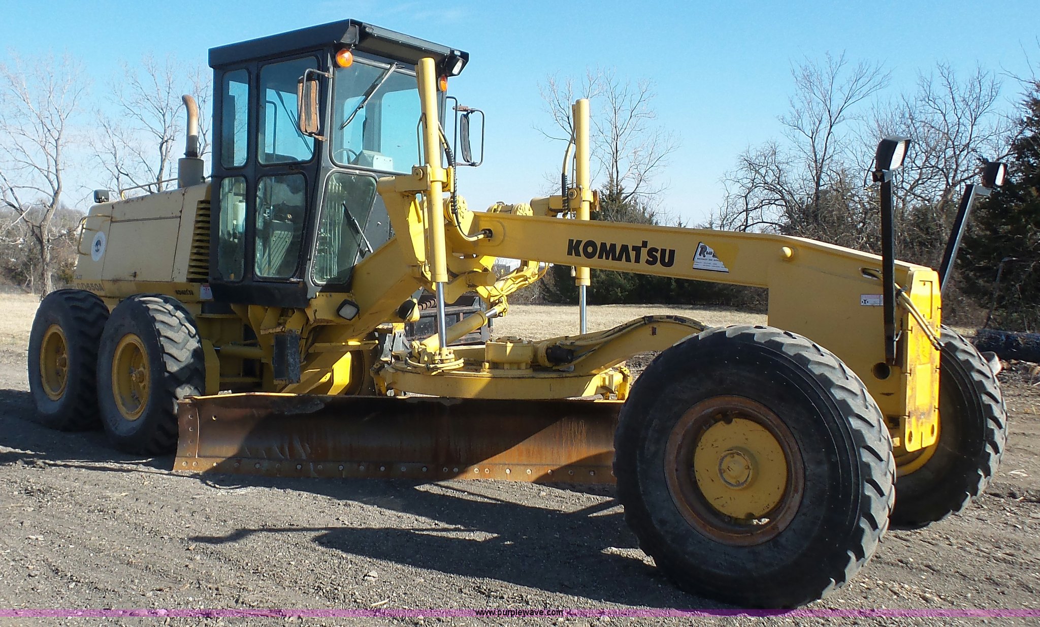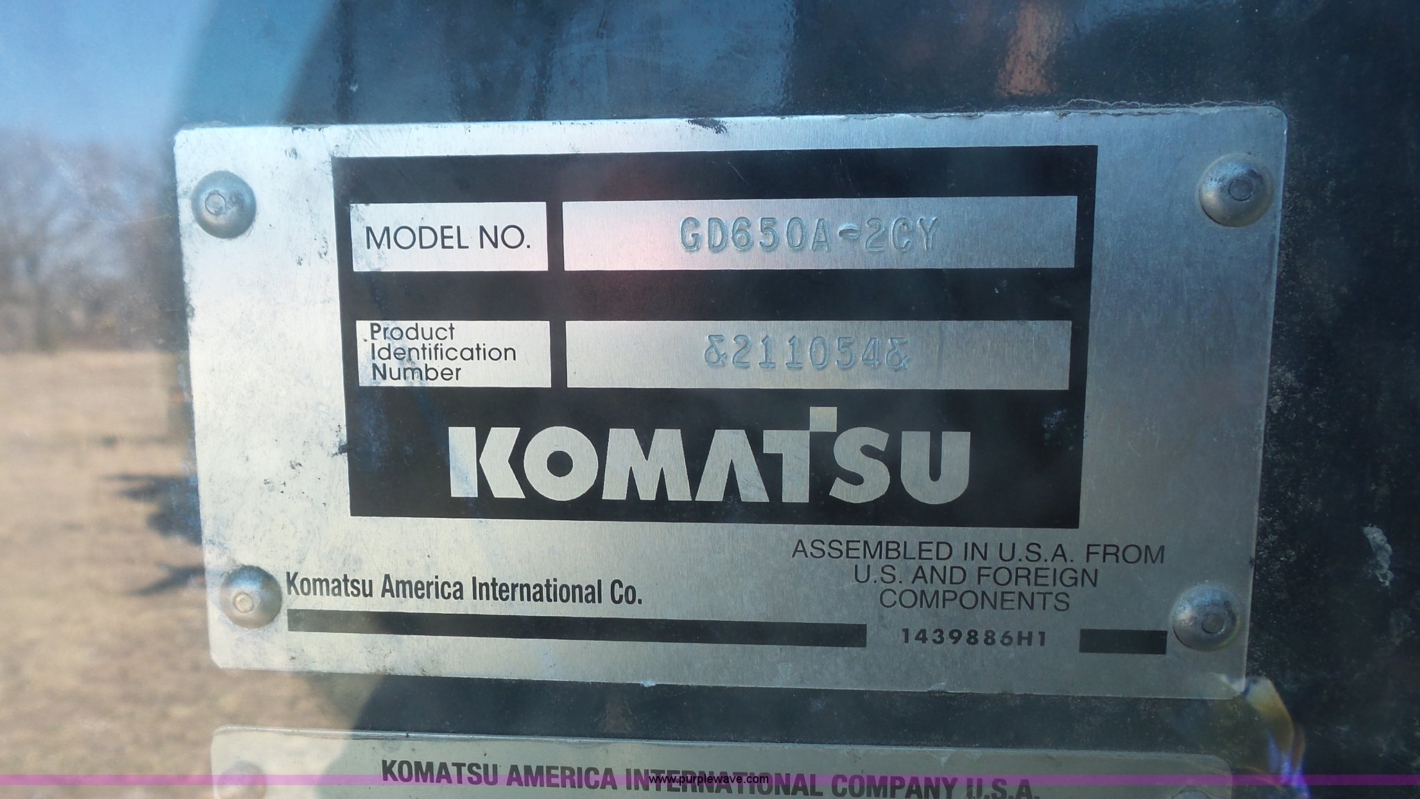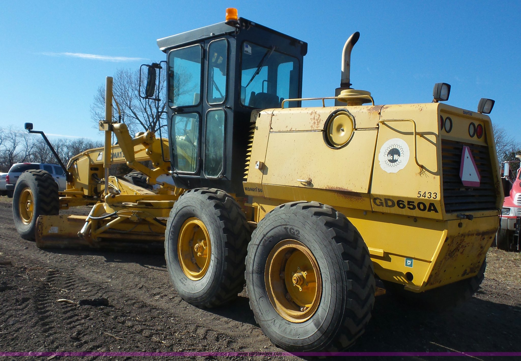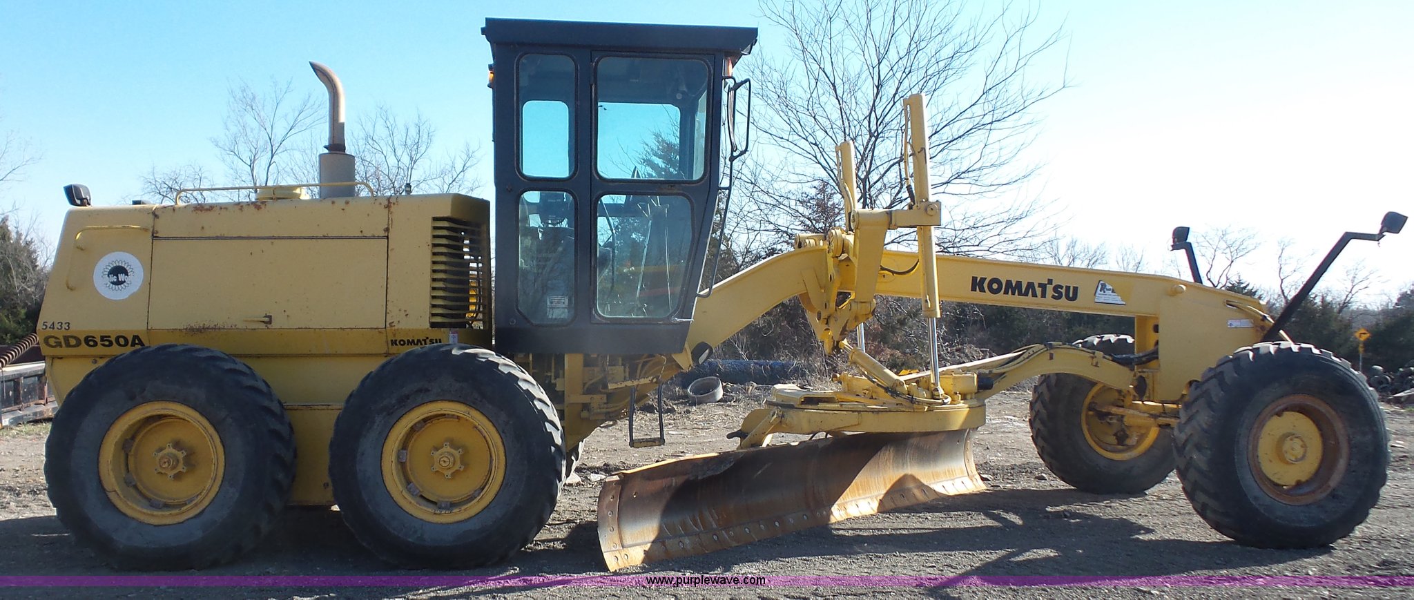 Purple Wave is selling a used Motor Grader in Kansas. This item is a 2003 Komatsu GD650A motor grader with the following: 10,535 hours on meter, Komatsu 8.3L six cylinder turbo diesel engine, 177 HP, Serial 46215885, Powershift transmission, 6F-3R gears, Enclosed cab, AC and heat, Suspension seat, Front and rear work lights, Front and rear wipers, Strobe light, Block heater, 14' moldboard, Tip control, Side shift, Titan 14.00R24 tires, 37,500 lbs. base operating weight, PIN 82110548, Serial 71457, Unit# PWK5433
