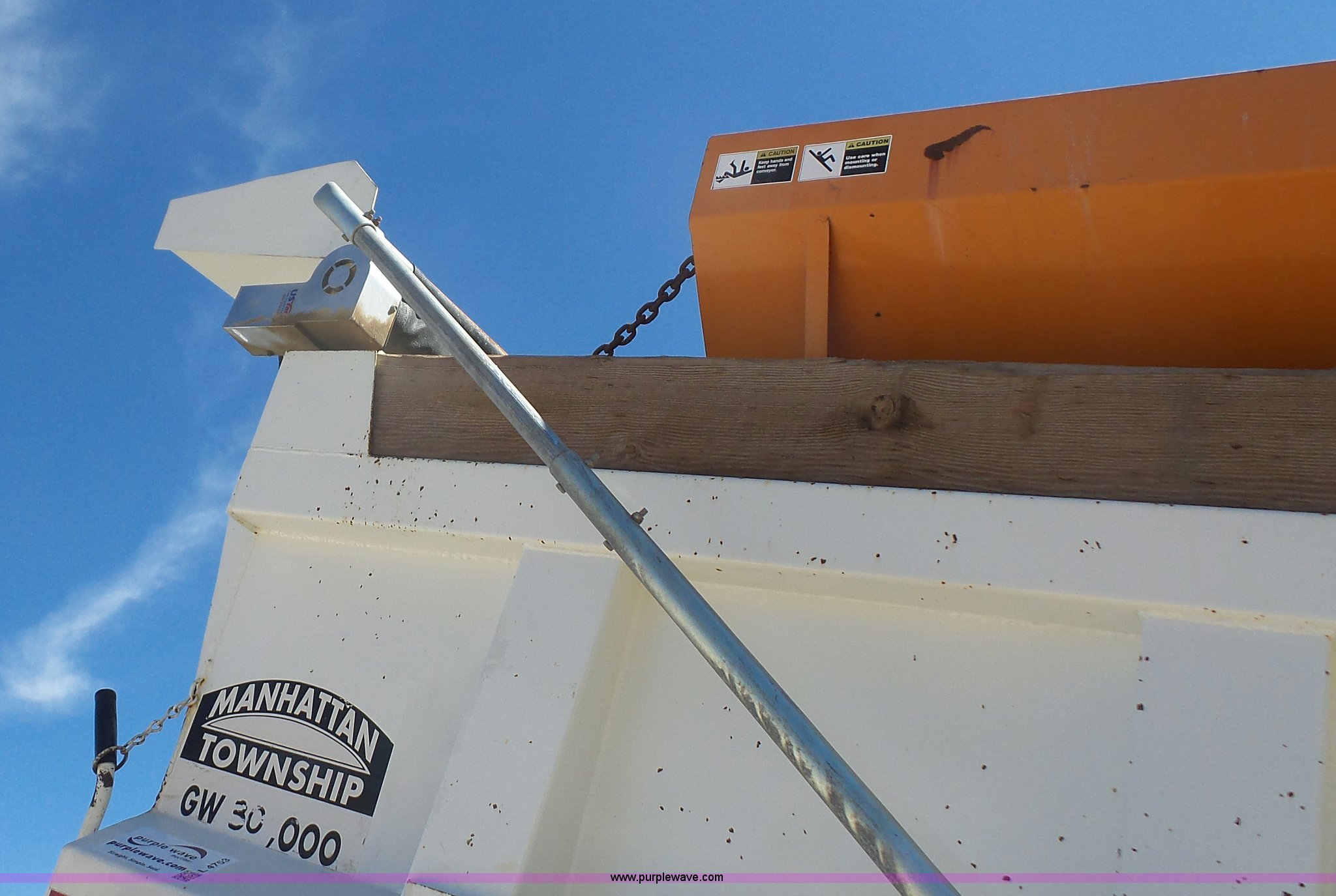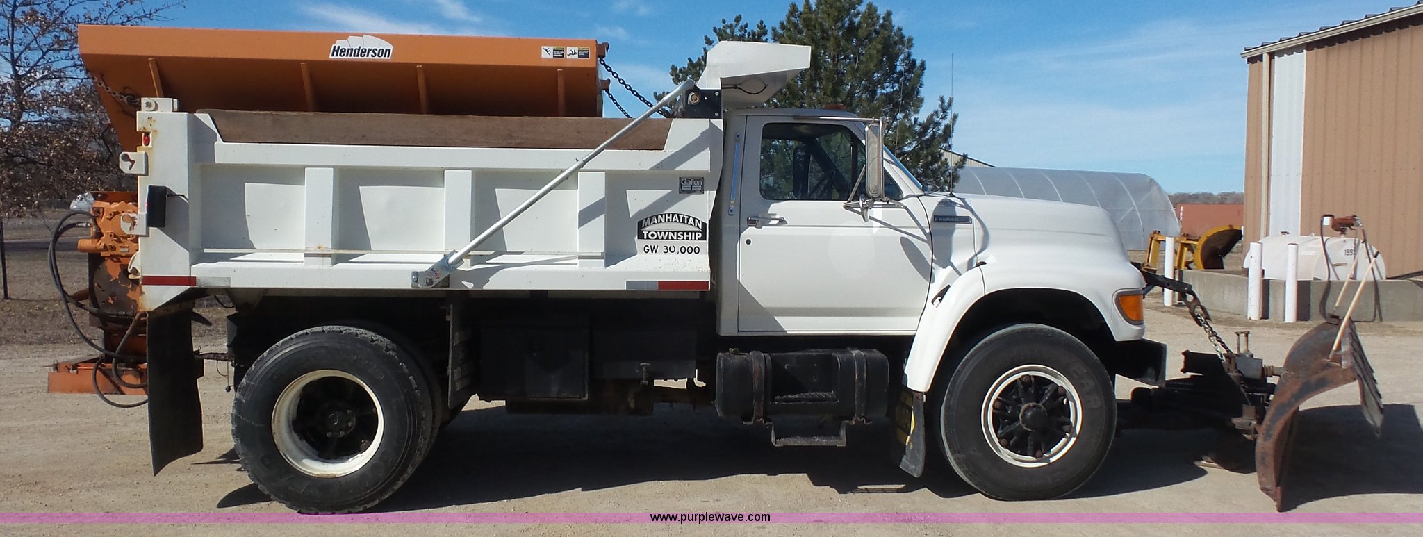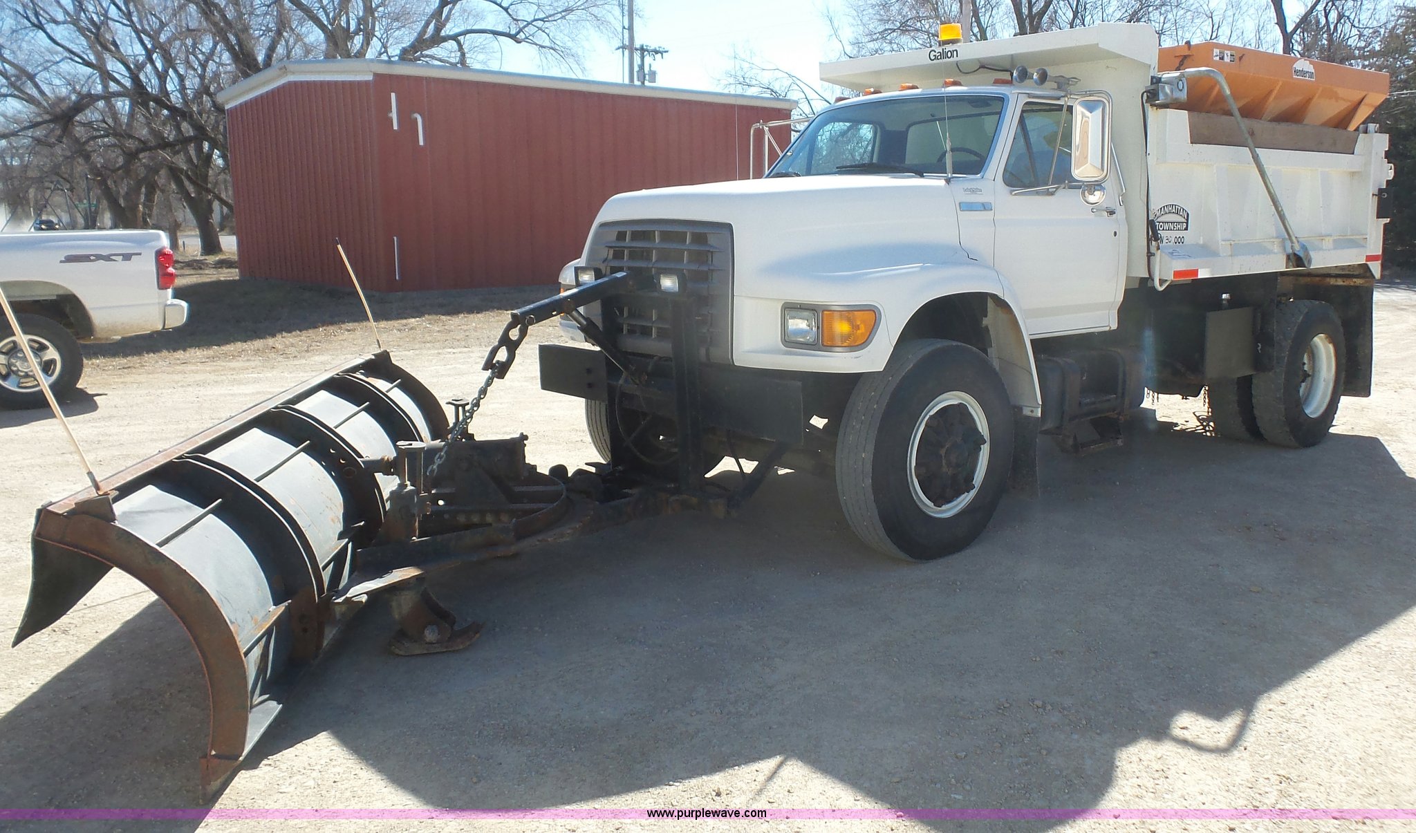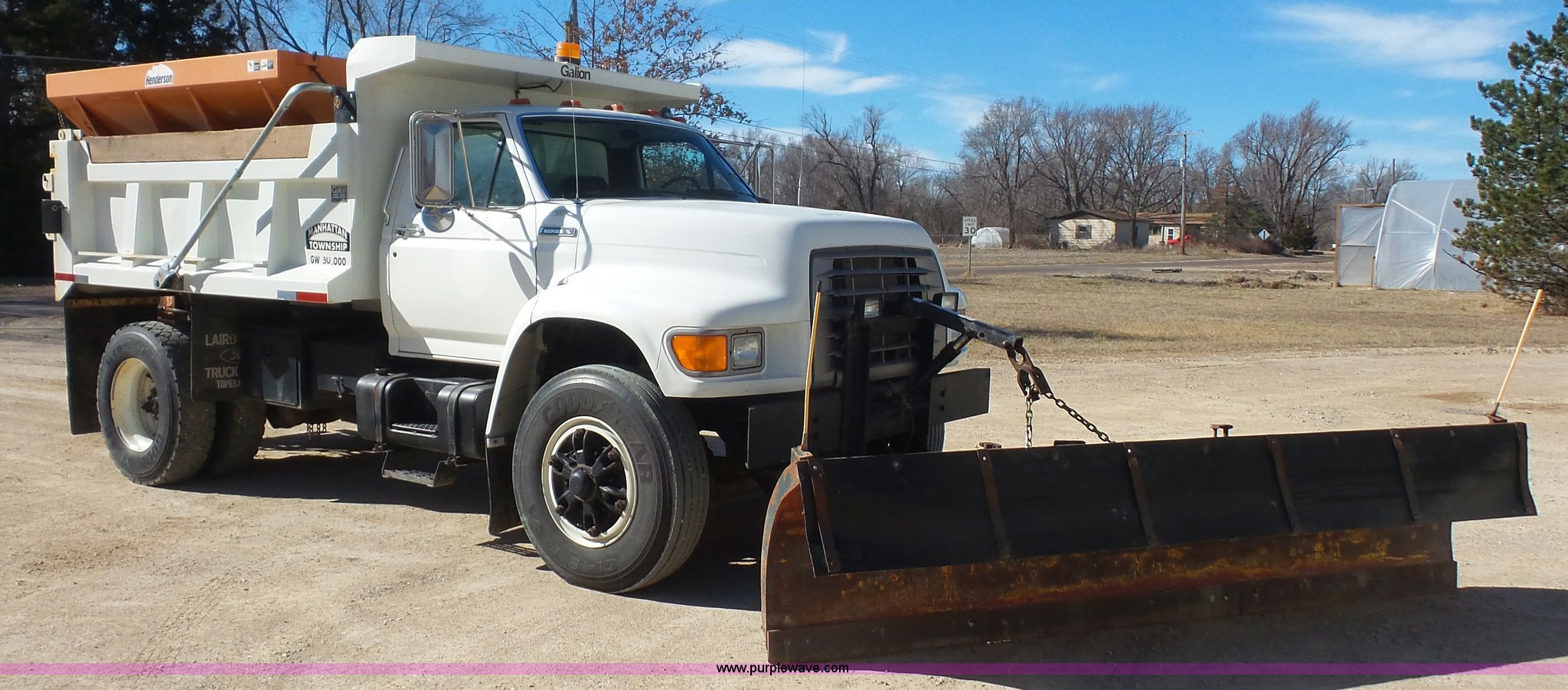 1995 Ford F800 Super Duty dump truck. 75,140 miles on odometer, Cummins ISC 8.3L L6 diesel engine 210 HP, Five speed manual transmission, Two speed rear end, Single axle, AC and heat, AM/FM, Suspension seat, (2) PTOs, Galion 402F-2 steel dump bed 10'L x 96"W, 5 to 6 cu. yd. capacity, 30" side height, 6 3/4"H side boards, Single ram hoist, Electric rollover tarp, Manual end gate, Vaulk 11'W plow Electric over hydraulic plow control, 2005 Henderson WSHX9050 spreader, Chains, Dual fuel tanks, Spring suspension, Air brakes, 11R22.5 tires, GVWR 33,000 lbs, FAWR 12,000 lbs, RAWR 21,000 lbs, Front spring replaced last fall, Stored inside, One owner. 1FDXF80E0SVA01271. Manhattan Township. 1316 Collins Lane. Manhattan, KS 66502