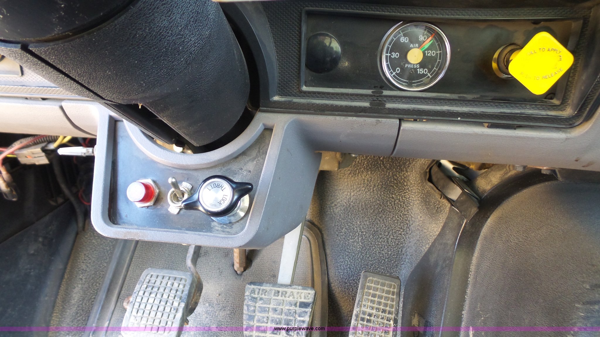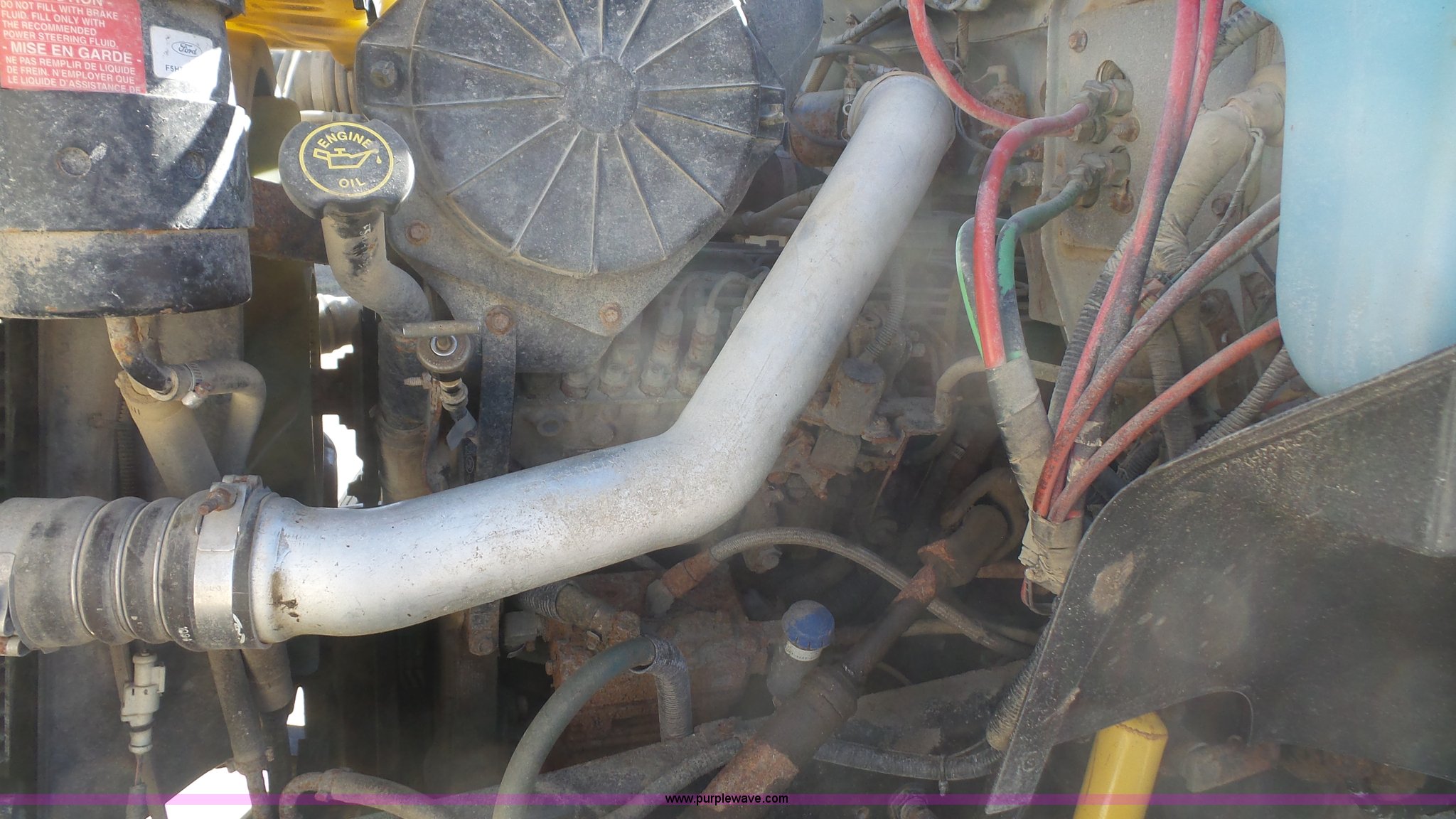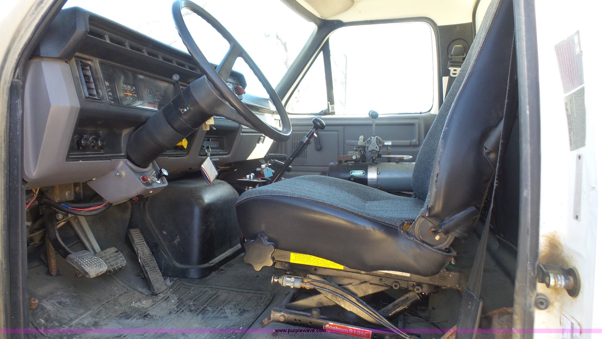 Purple Wave is selling a used Construction Dump Truck in Kansas. This item is a 1995 Ford F800 Super Duty dump truck with the following: 75,140 miles on odometer, Cummins ISC 8.3L L6 diesel engine, 210 HP, Five speed manual transmission, Two speed rear end, Single axle, AC and heat, AM/FM, Suspension seat, (2) PTOs, Galion 402F-2 steel dump bed, 10'L x 96"W, 5 to 6 cu. yd. capacity, 30" side height, 6 3/4"H side boards, Single ram hoist, Electric rollover tarp, Manual end gate, Vaulk 11'W plow, Electric over hydraulic plow control, 2005 Henderson WSHX9050 spreader, Chains, Dual fuel tanks, Spring suspension, Air brakes, 11R22.5 tires, GVWR 33,000 lbs, FAWR 12,000 lbs, RAWR 21,000 lbs, Front spring replaced last fall, Stored inside, One owner