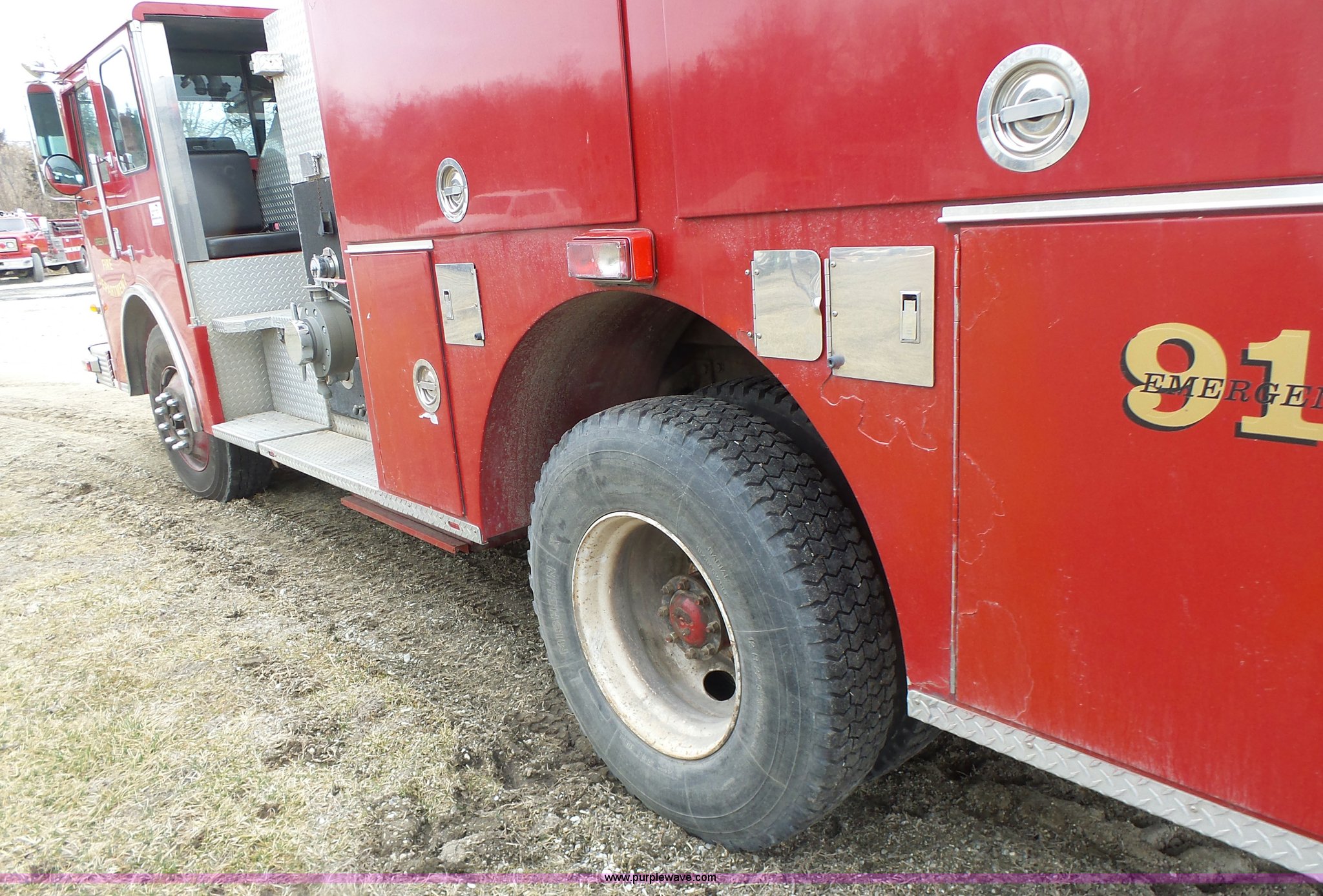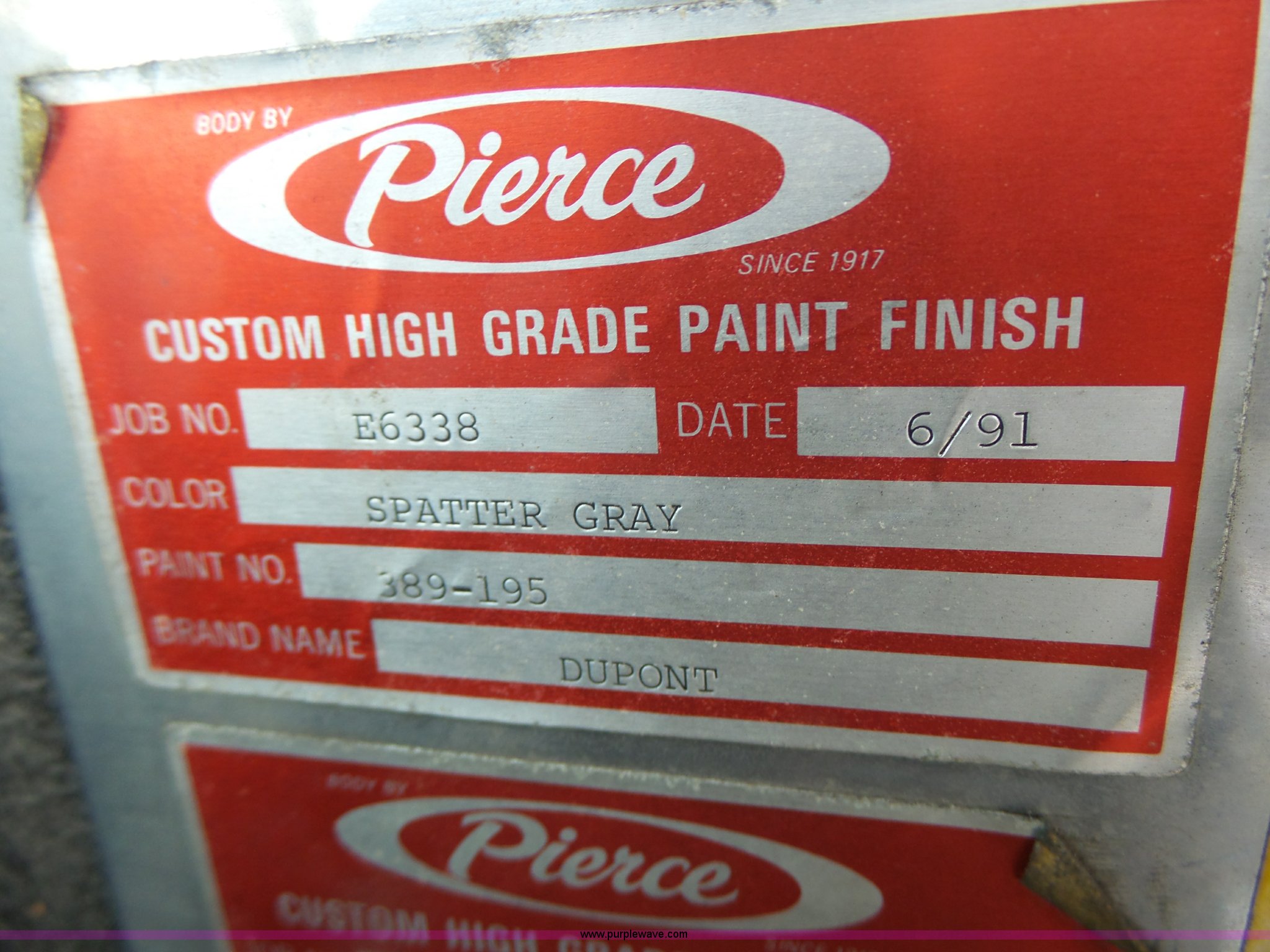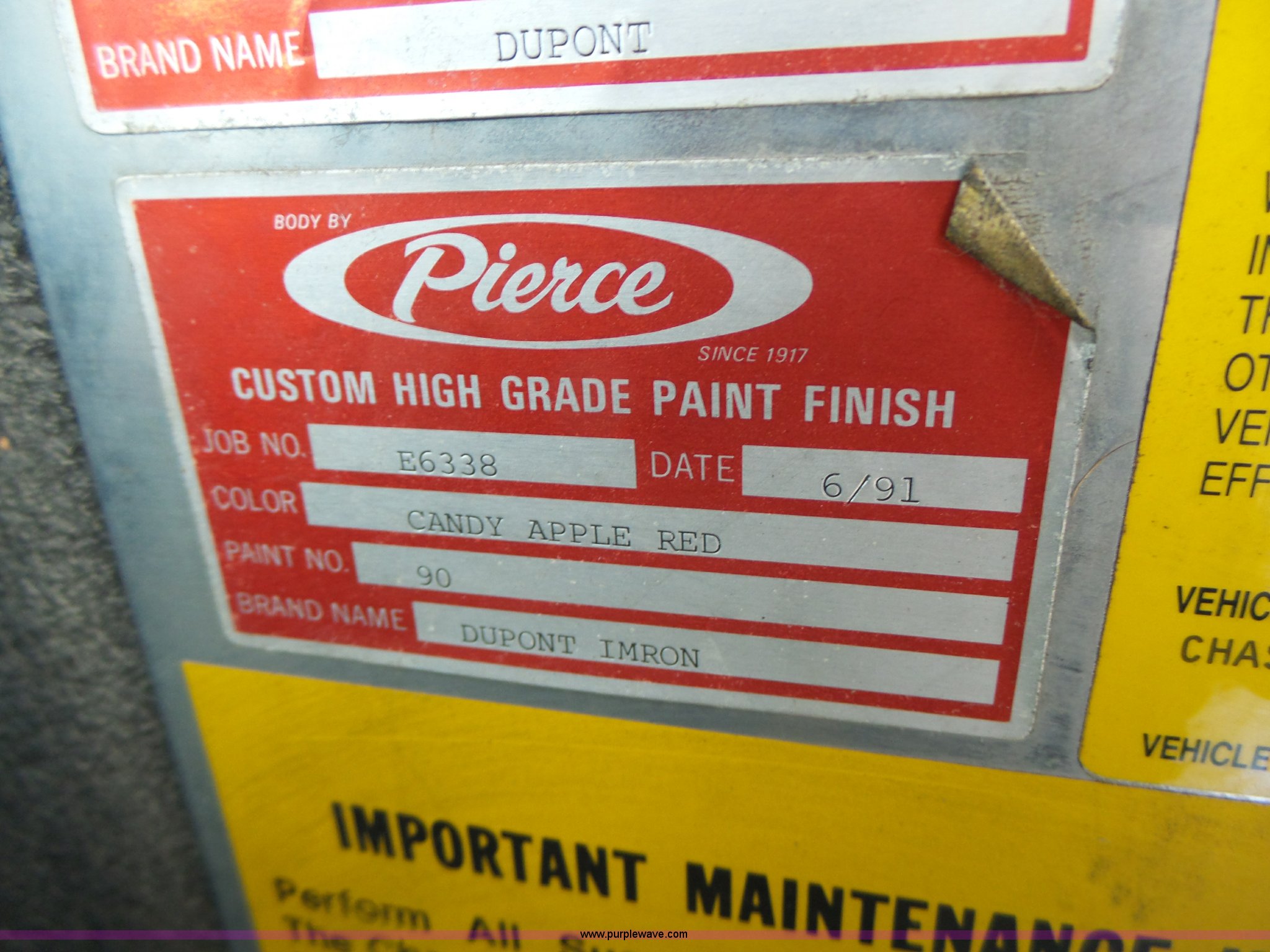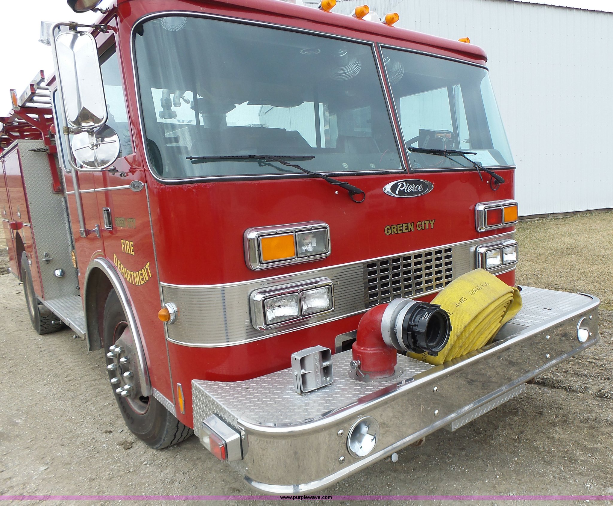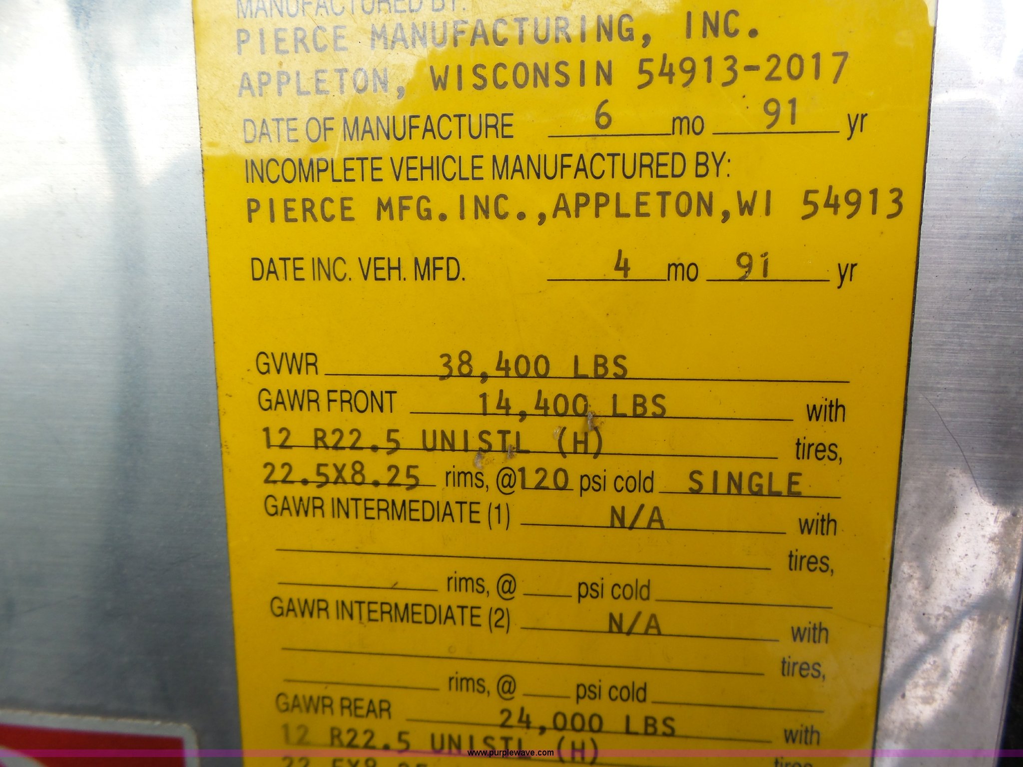 Purple Wave is selling a used Fire Truck or Emergency Vehicle in Missouri. This item is a 1991 Pierce Crew Cab fire truck with the following: 96,350 miles on odometer, Detroit Diesel 6V-92 9.2L six cylinder turbo diesel engine, Automatic transmission, Single axle, Heat, Suspension seat, Pierce E6338 platform, 1,500 gpm pump, Water gun, Work lights, Hose, Ladder, Onan generator, 12R22.5 tires, GVWR 38,400 lbs