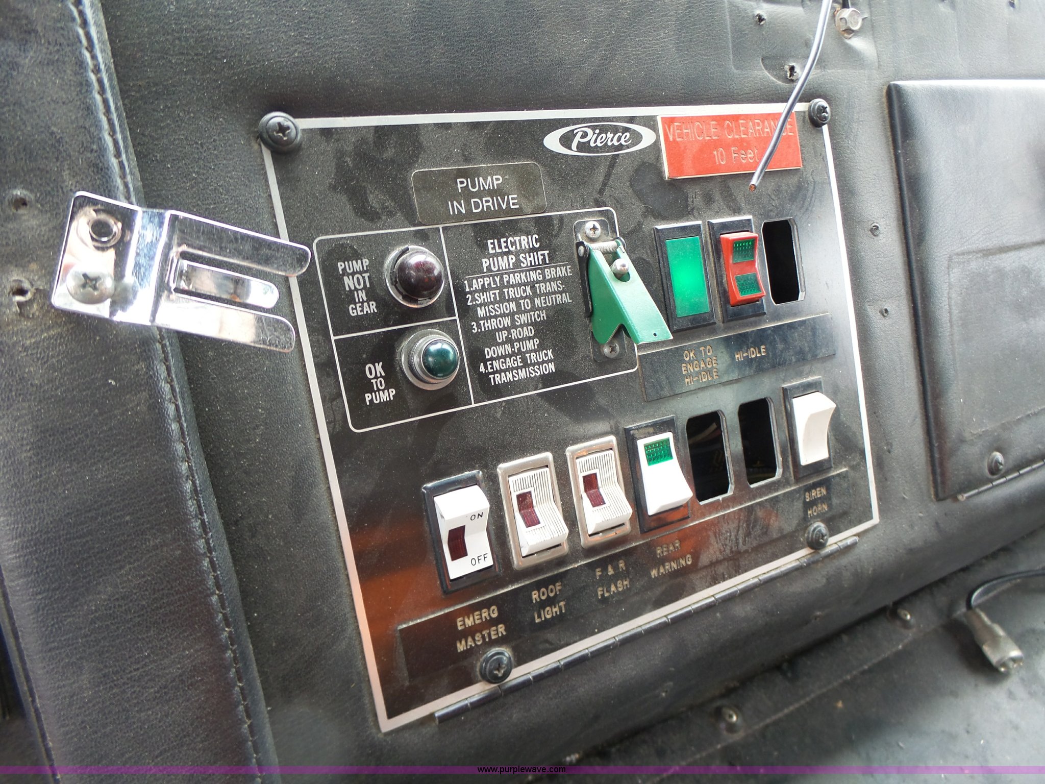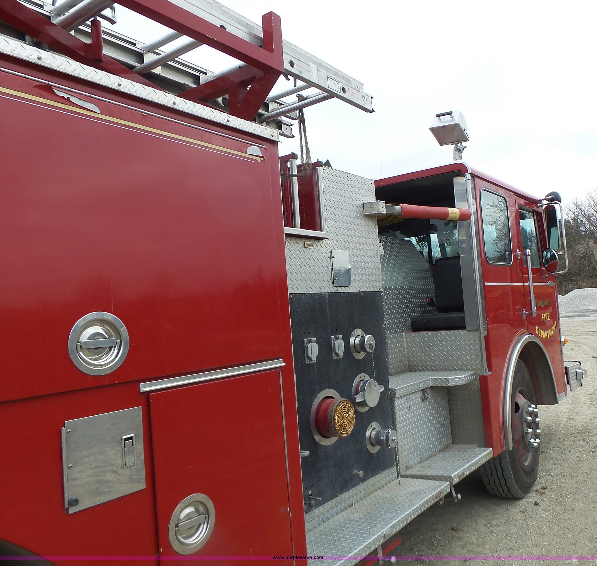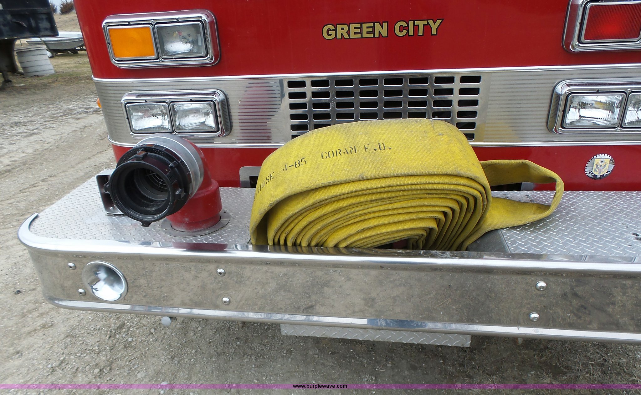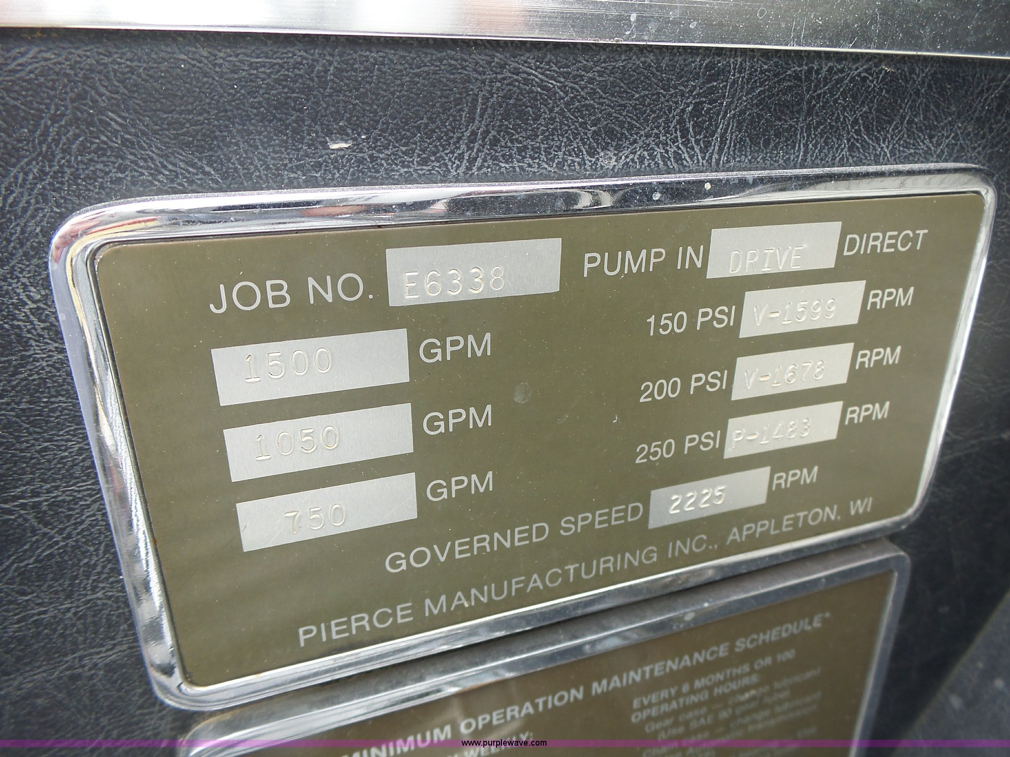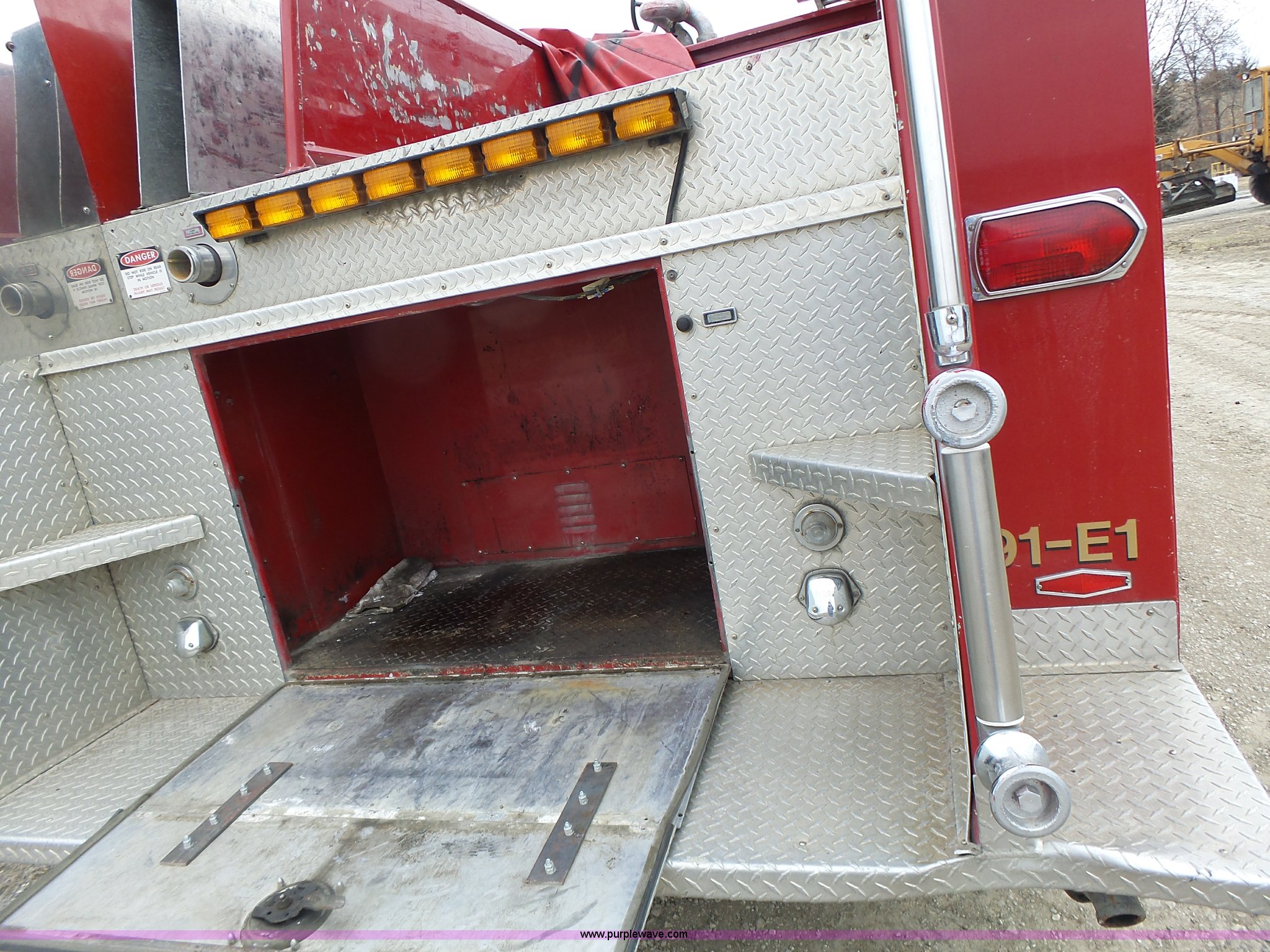 Purple Wave is selling a used Fire Truck or Emergency Vehicle in Missouri. This item is a 1991 Pierce Crew Cab fire truck with the following: 96,350 miles on odometer, Detroit Diesel 6V-92 9.2L six cylinder turbo diesel engine, Automatic transmission, Single axle, Heat, Suspension seat, Pierce E6338 platform, 1,500 gpm pump, Water gun, Work lights, Hose, Ladder, Onan generator, 12R22.5 tires, GVWR 38,400 lbs