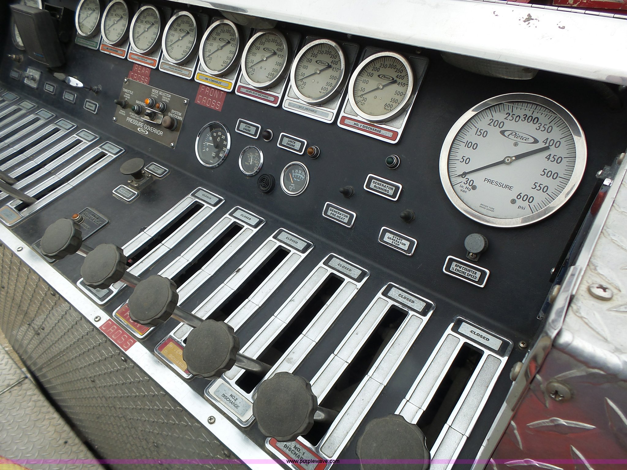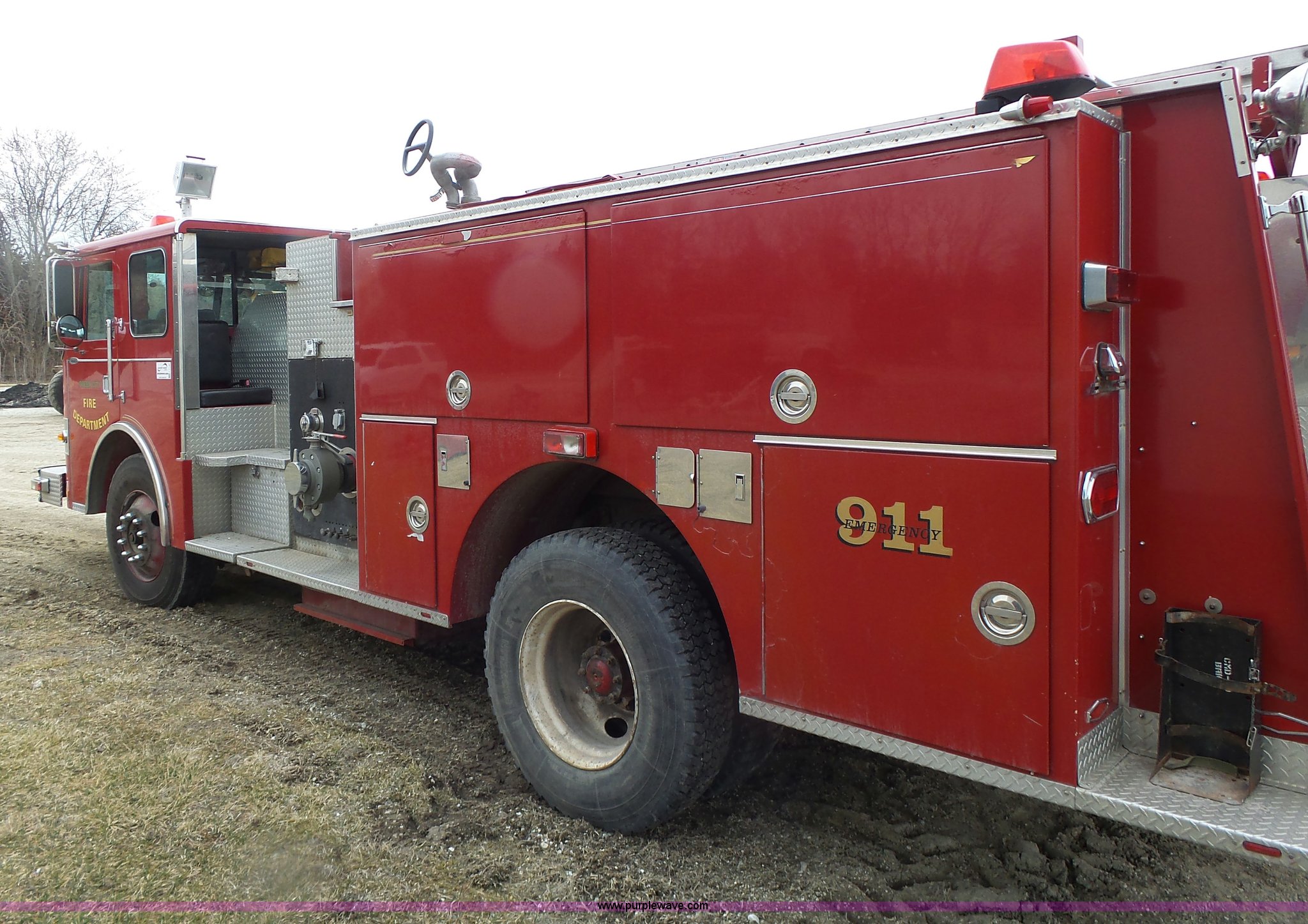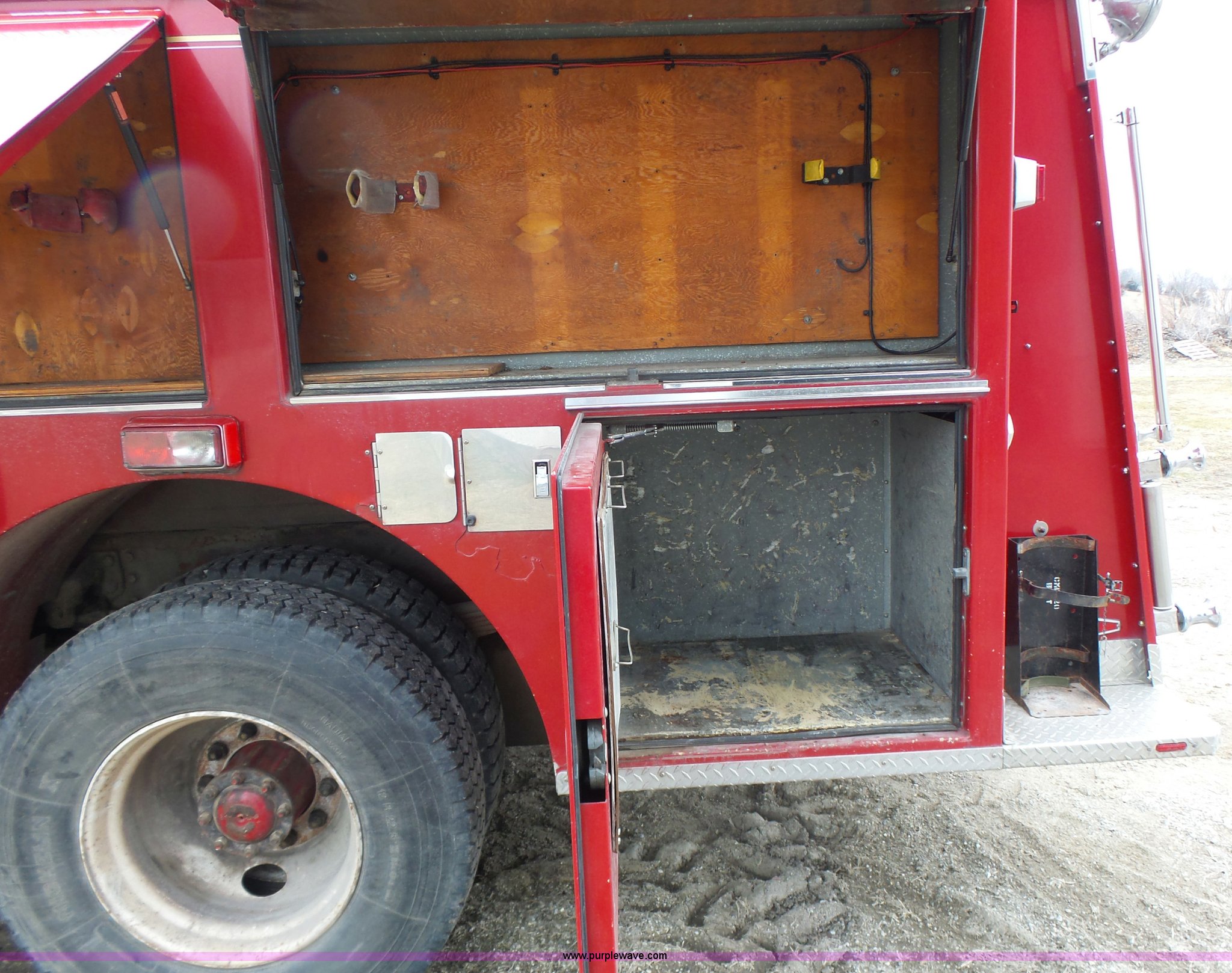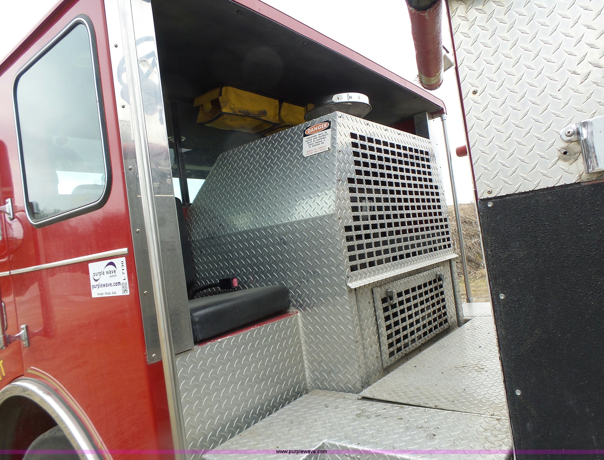 Purple Wave is selling a used Fire Truck or Emergency Vehicle in Missouri. This item is a 1991 Pierce Crew Cab fire truck with the following: 96,350 miles on odometer, Detroit Diesel 6V-92 9.2L six cylinder turbo diesel engine, Automatic transmission, Single axle, Heat, Suspension seat, Pierce E6338 platform, 1,500 gpm pump, Water gun, Work lights, Hose, Ladder, Onan generator, 12R22.5 tires, GVWR 38,400 lbs