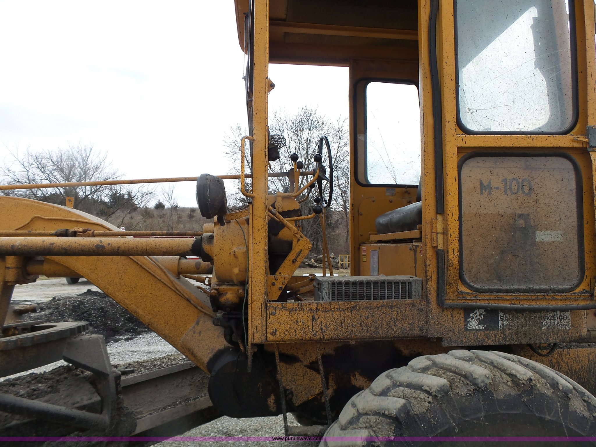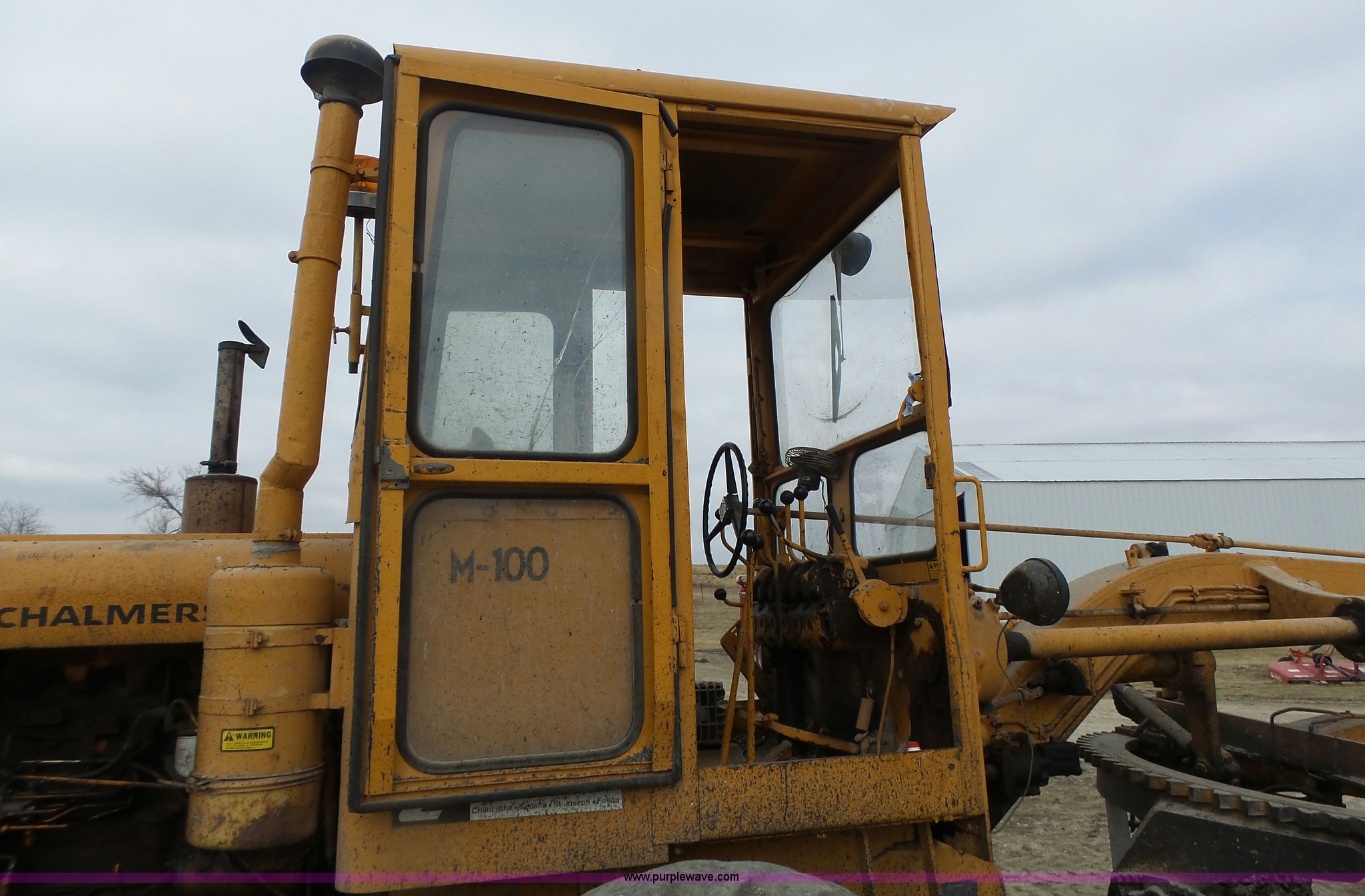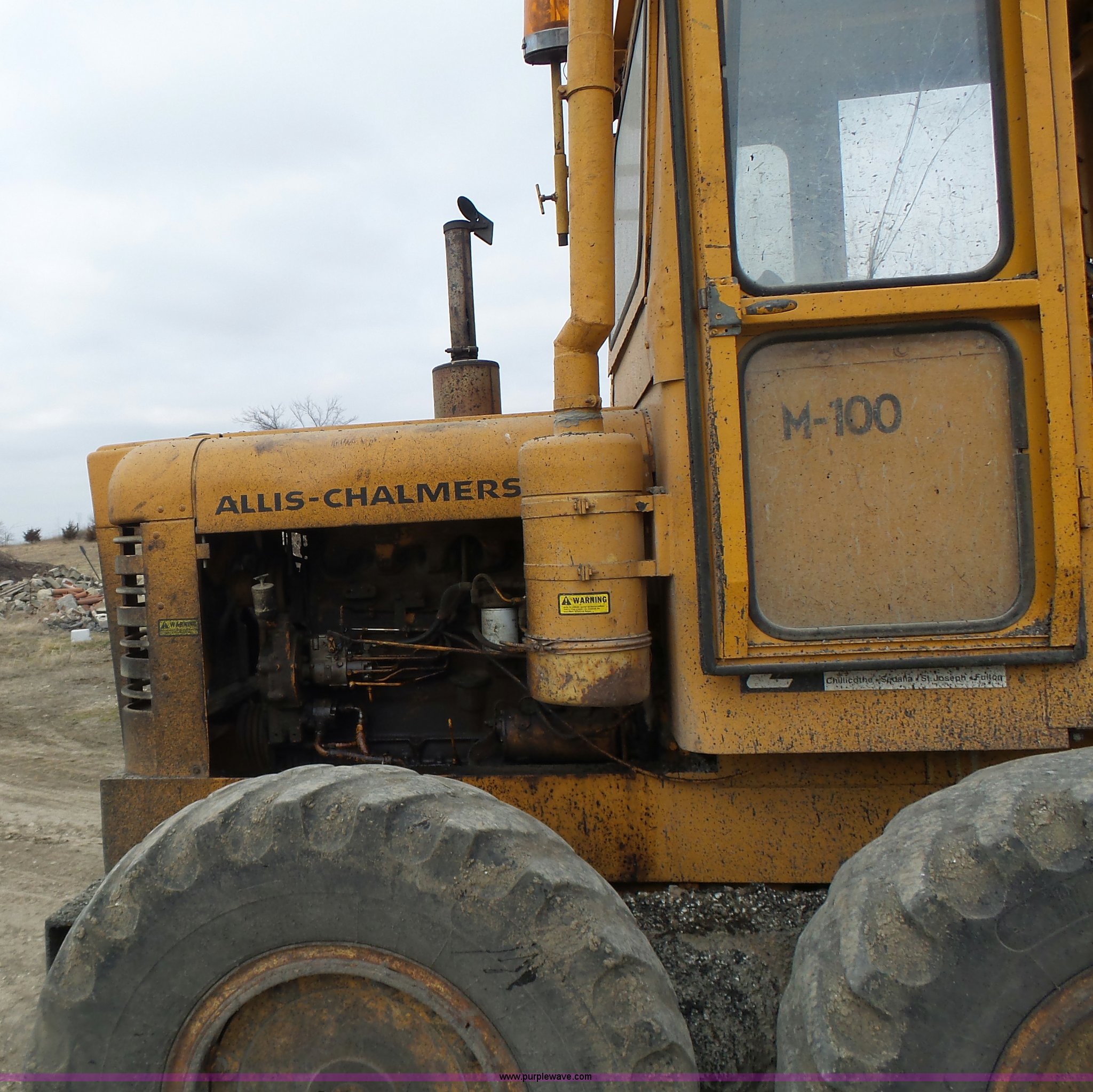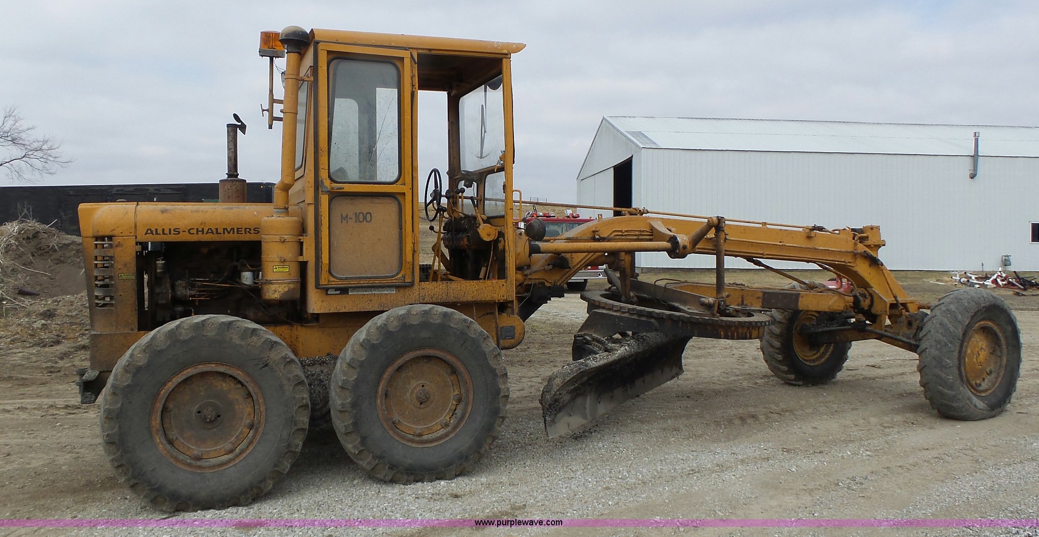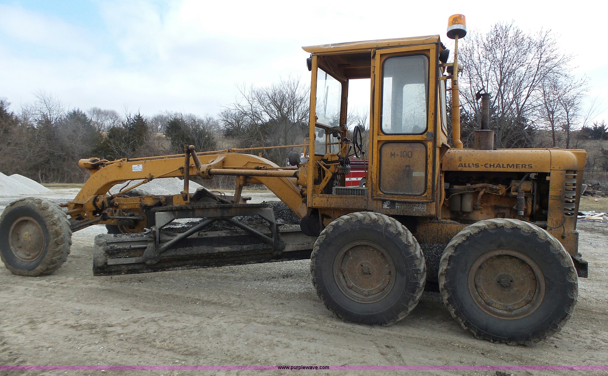 Purple Wave is selling a used Motor Grader in Missouri. This item is a 1966 Allis Chalmers M100 motor grader with the following: 8,359 hours on meter, Allis Chalmers six cylinder diesel engine, 3F-3R gears, Enclosed cab, Heat, Front and rear work lights, 12'W moldboard, Tip control, Side shift, Rigid frame, 13.00-24 tires, Serial M100R1516
